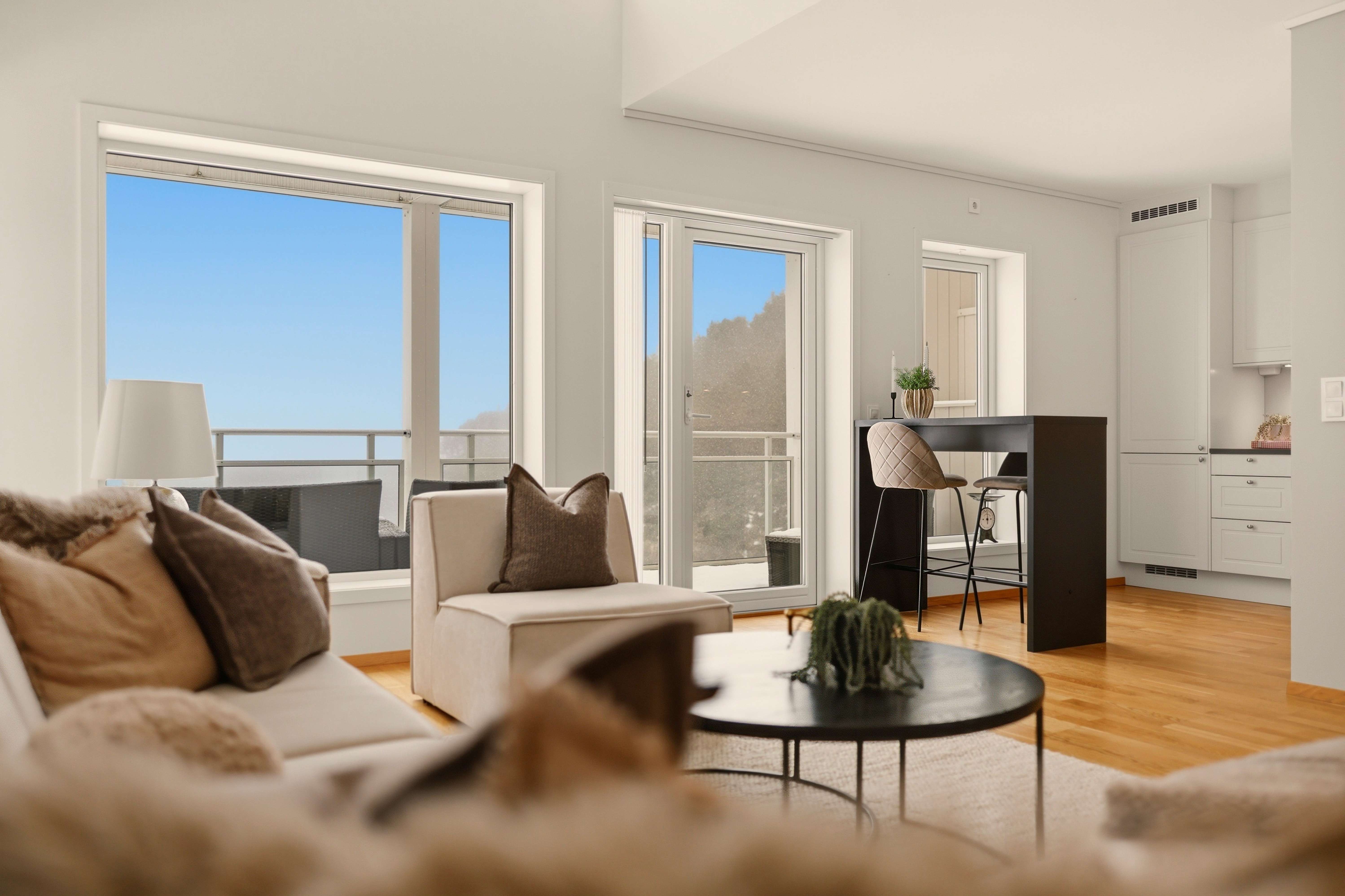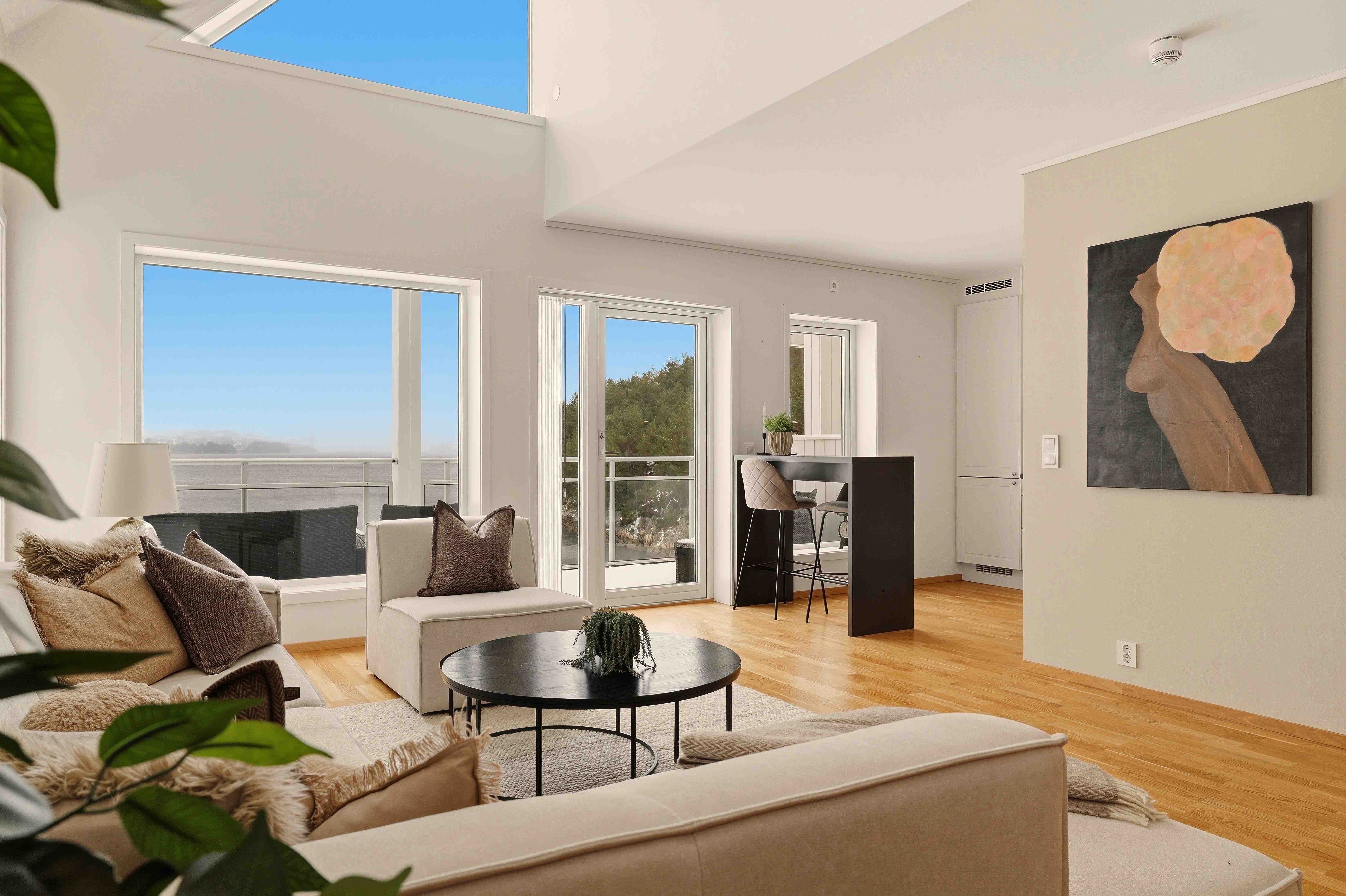 Den romslige stuen har store vindusflater som slipper inn rikelig med naturlig lys, og gir vakkert utsyn mot sjøen Her er det god plass til både sittegruppe og spisestue, og med direkte utgang til en av leilighetens to solrike uteplasser - inviteres det til både avslapning og sosiale sammenkomster. Den sjenerøse takhøyden skaper også en luftig romfølelse.