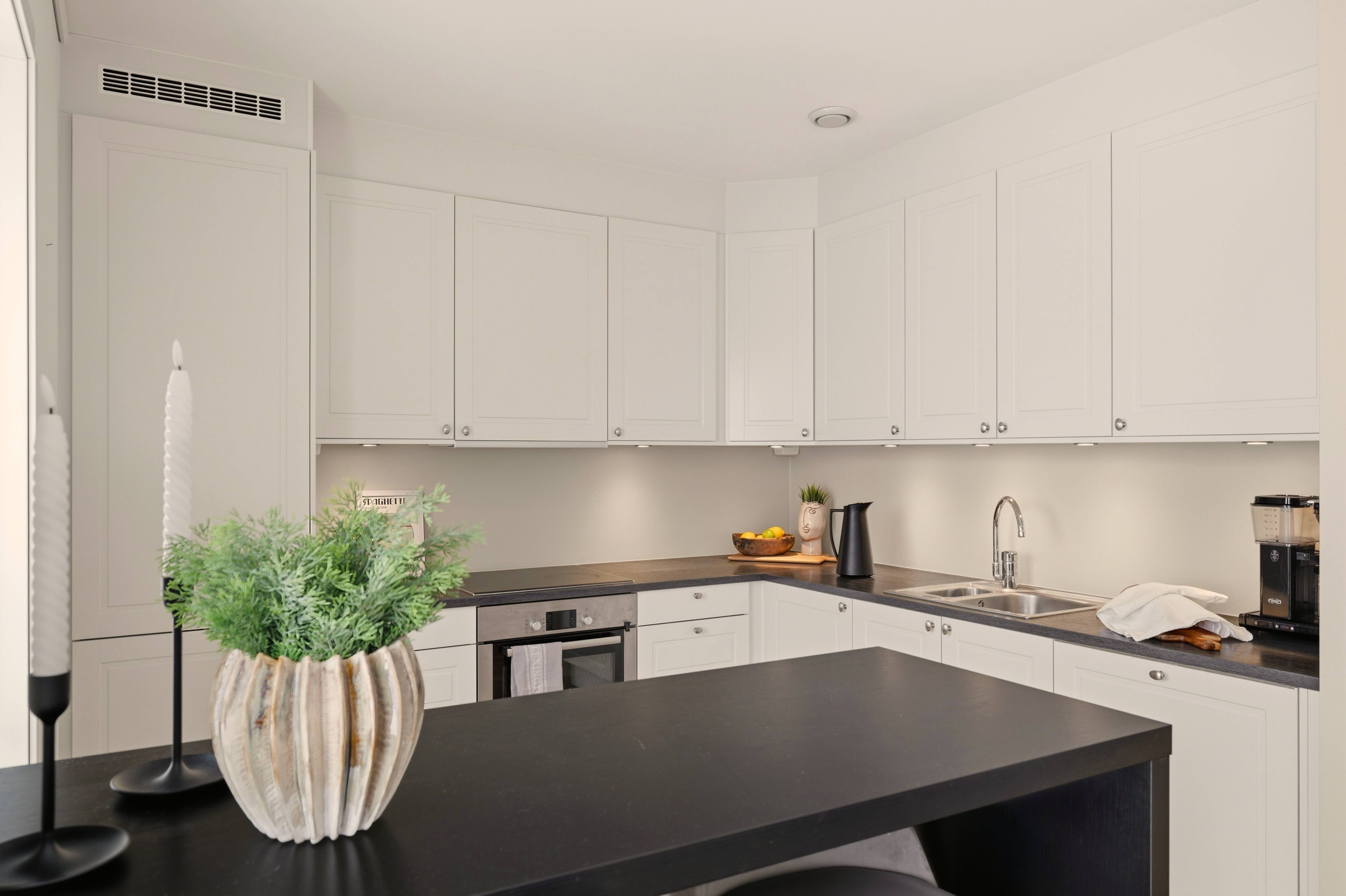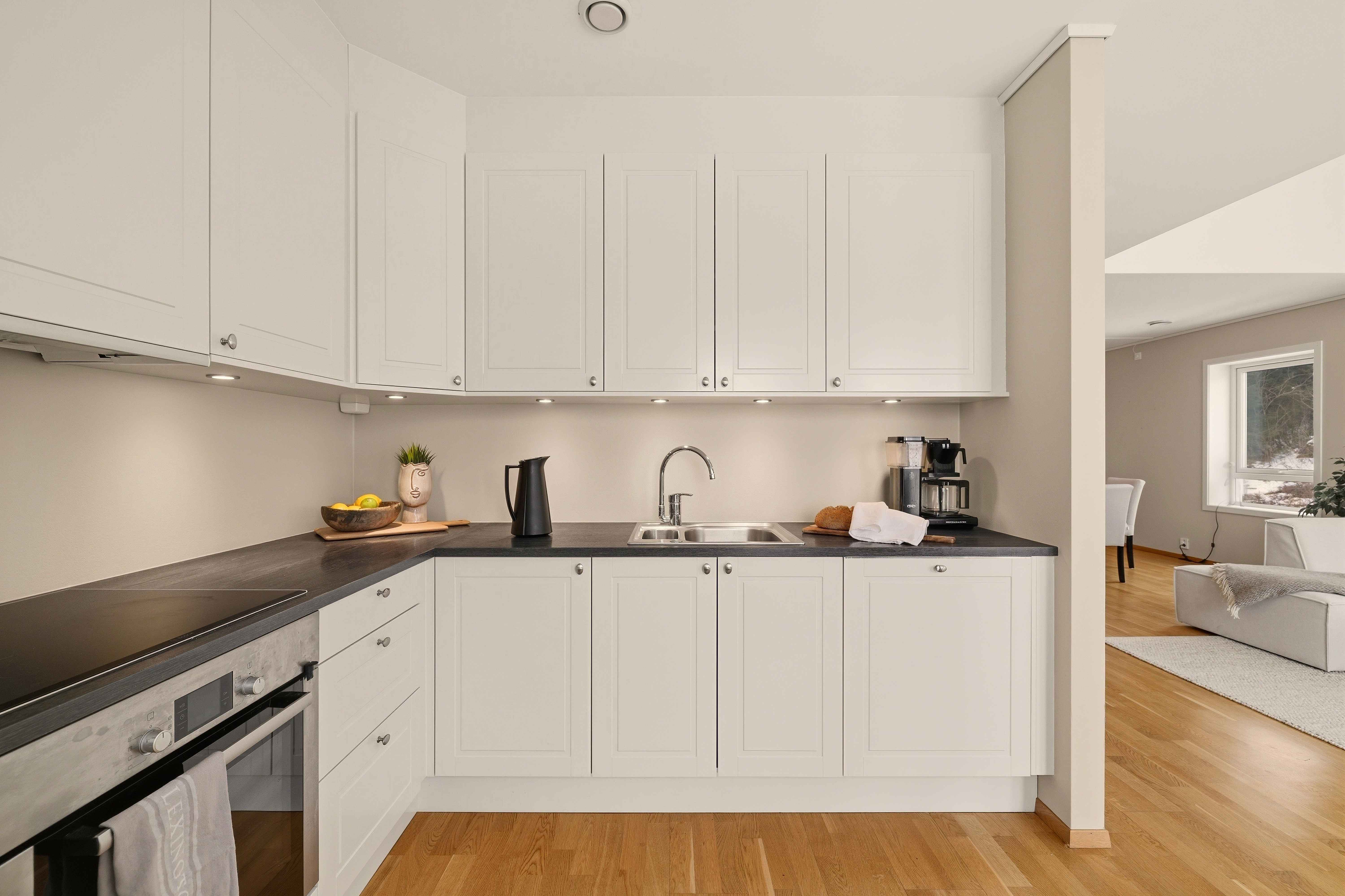 Kjøkkenet er levert av anerkjente Sigdal, og fremstår som moderne og tidløst med integrerte hvitevarer og tilstrekkelig med oppbevarings og arbeidsplass – perfekt for matlaging og hyggelige måltider i godt selskap.