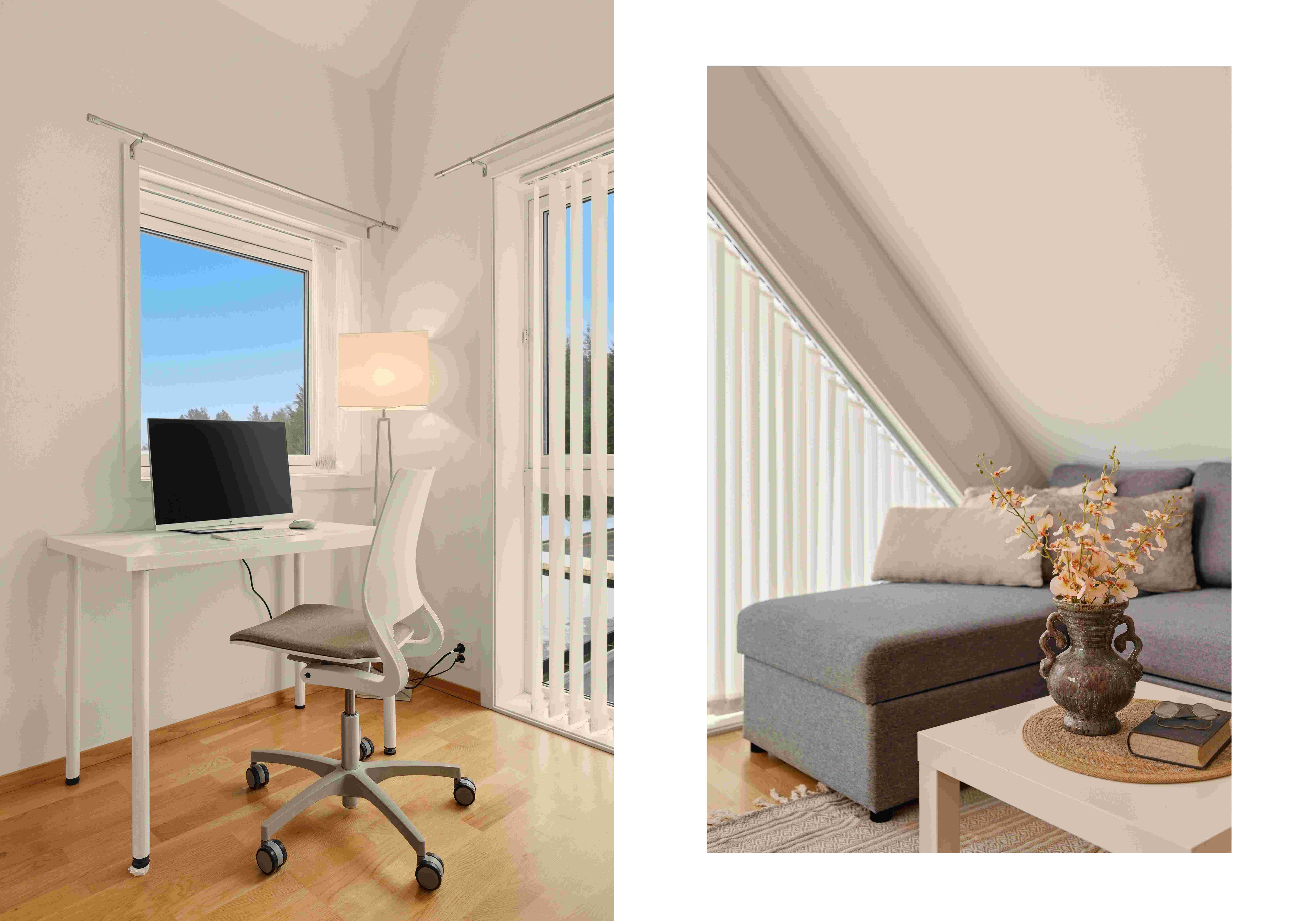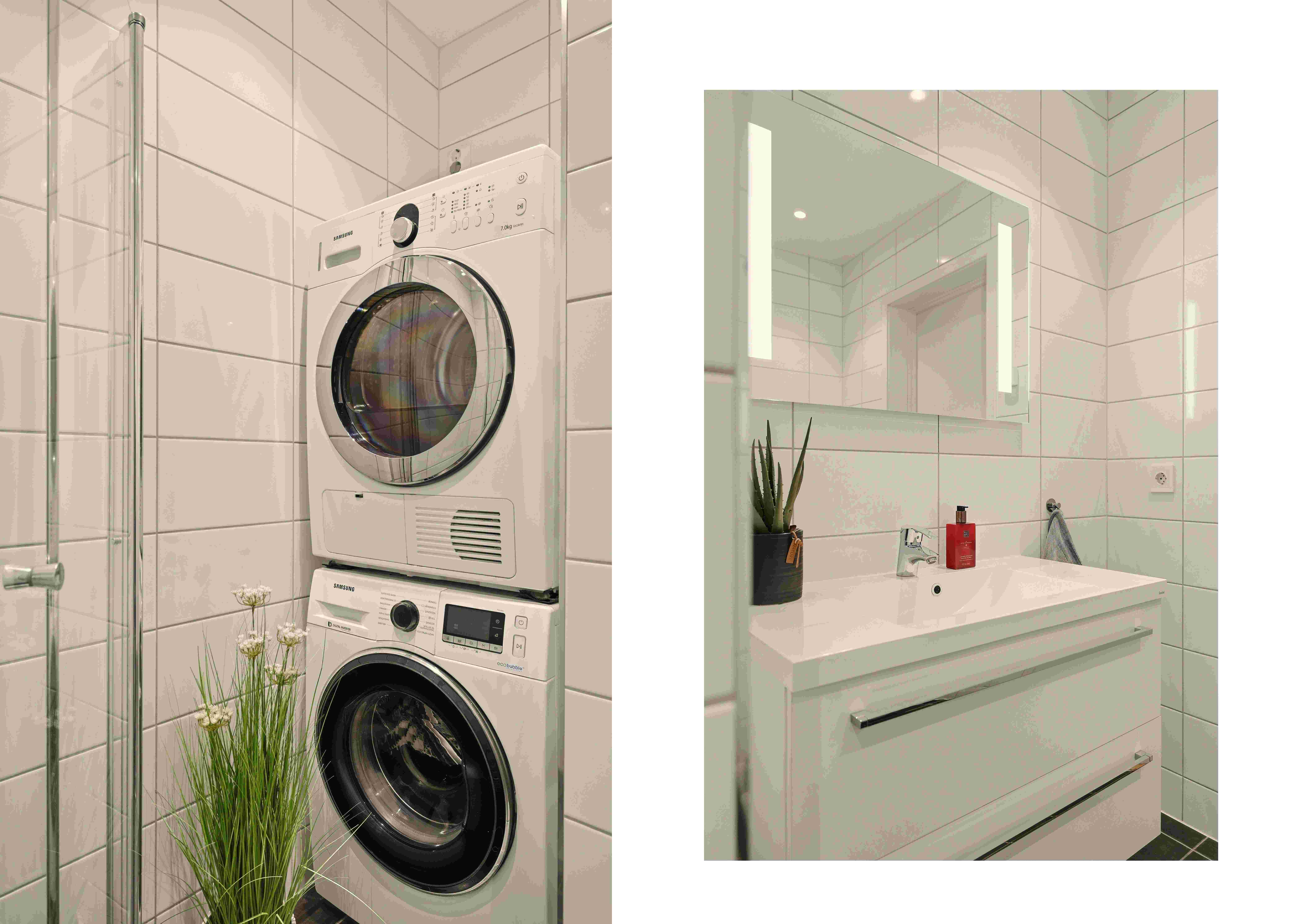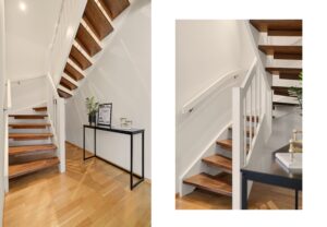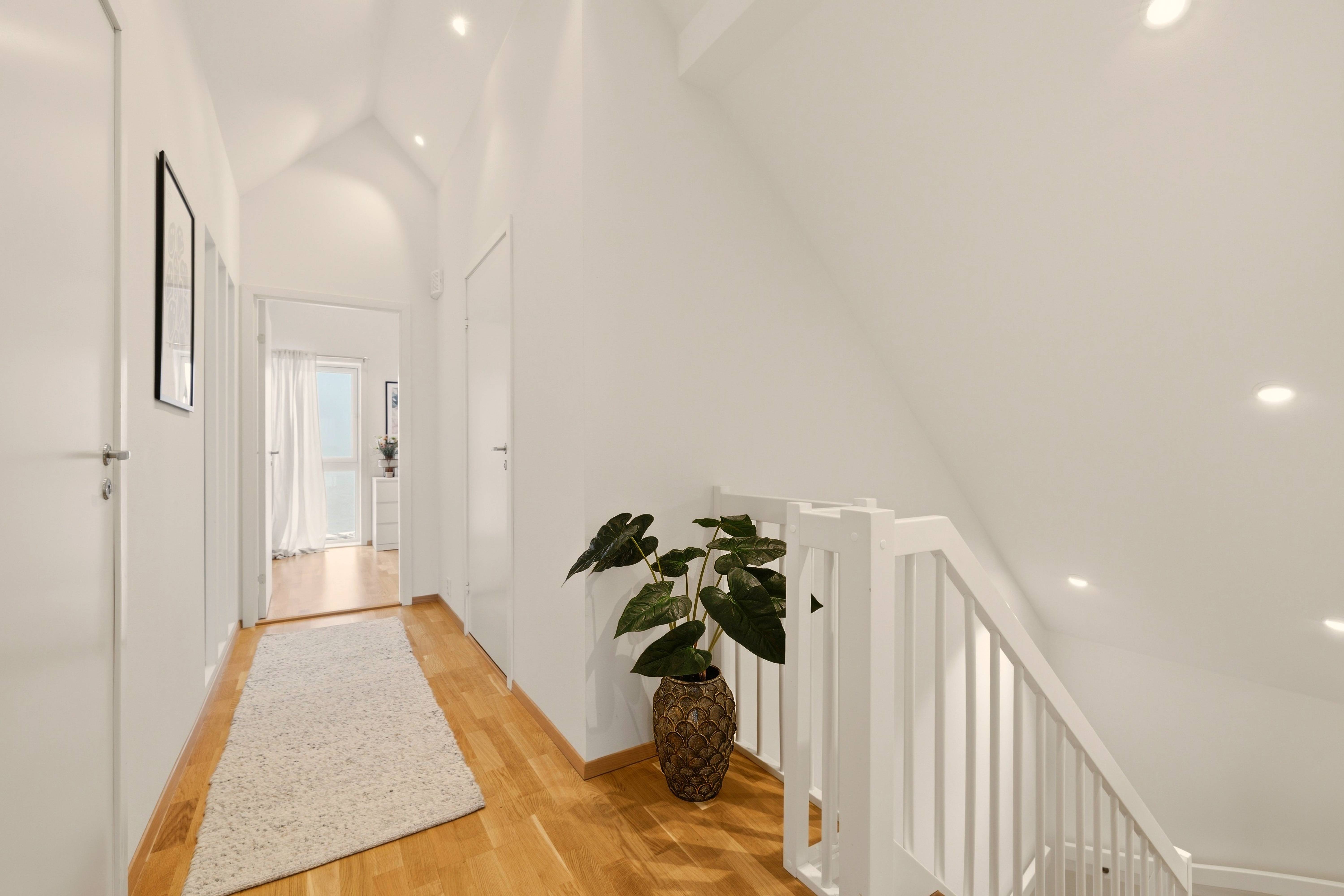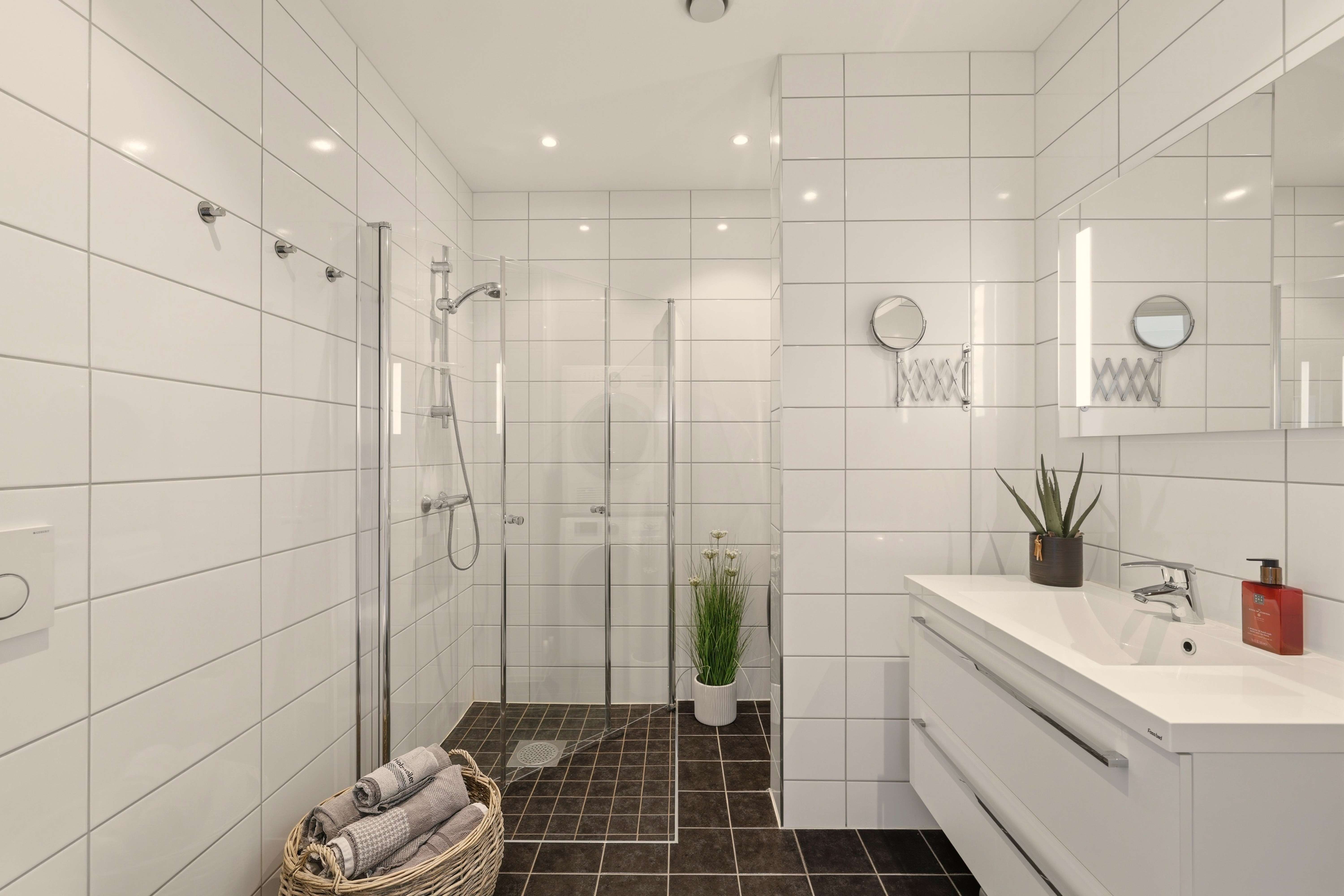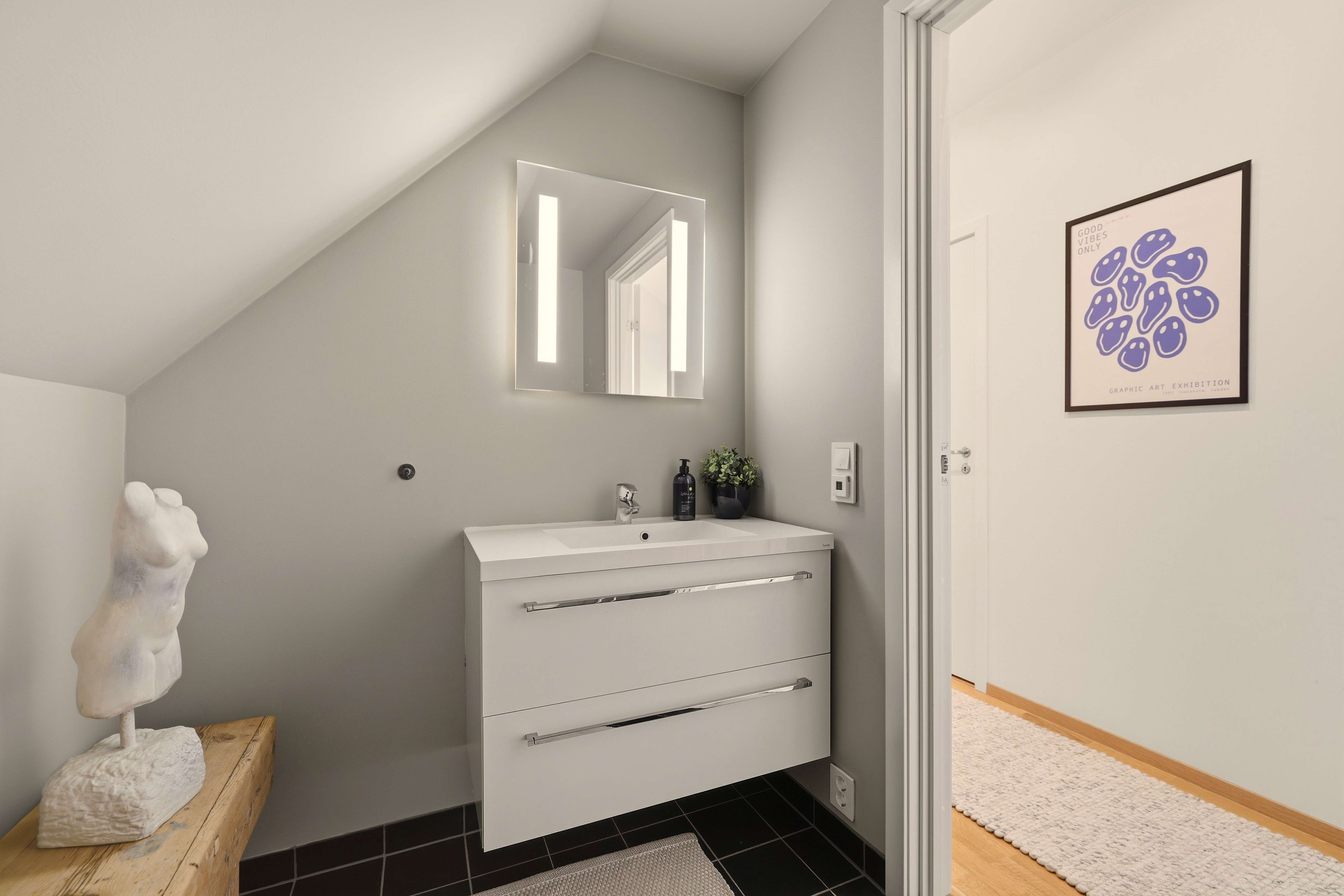 Videre har boligen et moderne bad med gulvvarme, rør-i-rør system og et stilrent uttrykk. I tillegg finnes et separat gjestetoalett på øvre plan – praktisk og komfortabelt for både beboere og gjester.