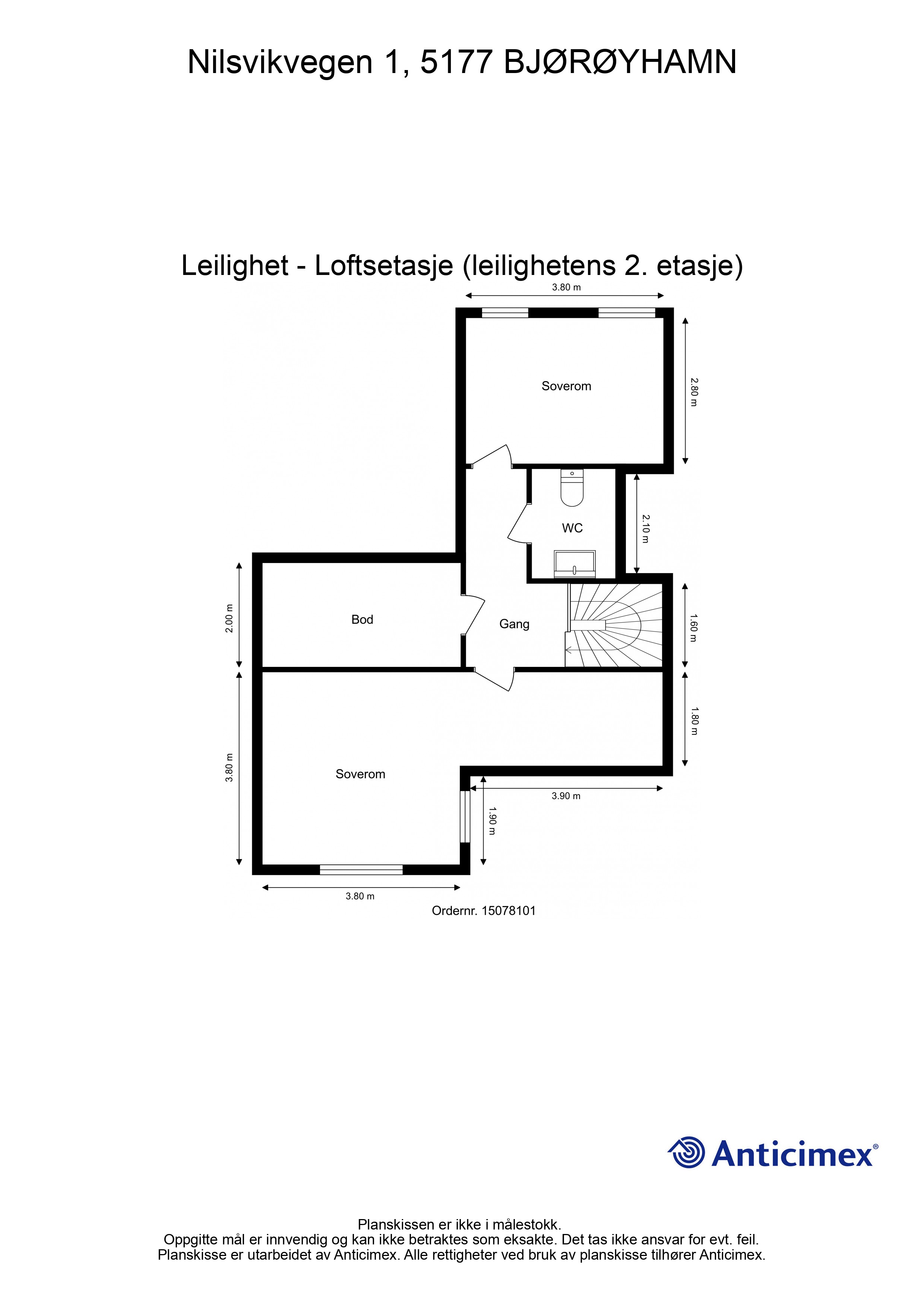 Mellomgang, toalettrom, innvendig bod/teknisk rom, soverom og loftsstue /rom benyttet som soverom.