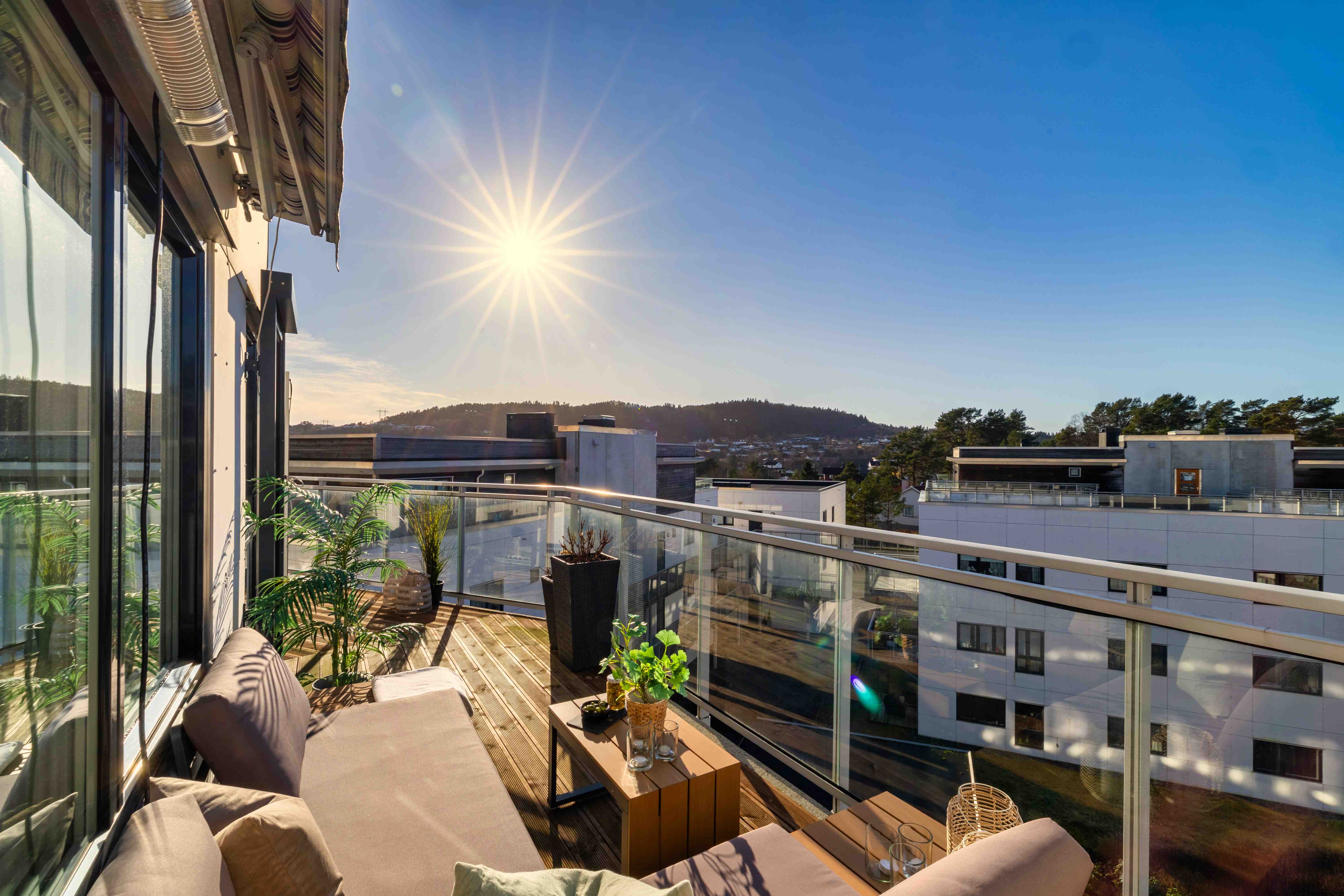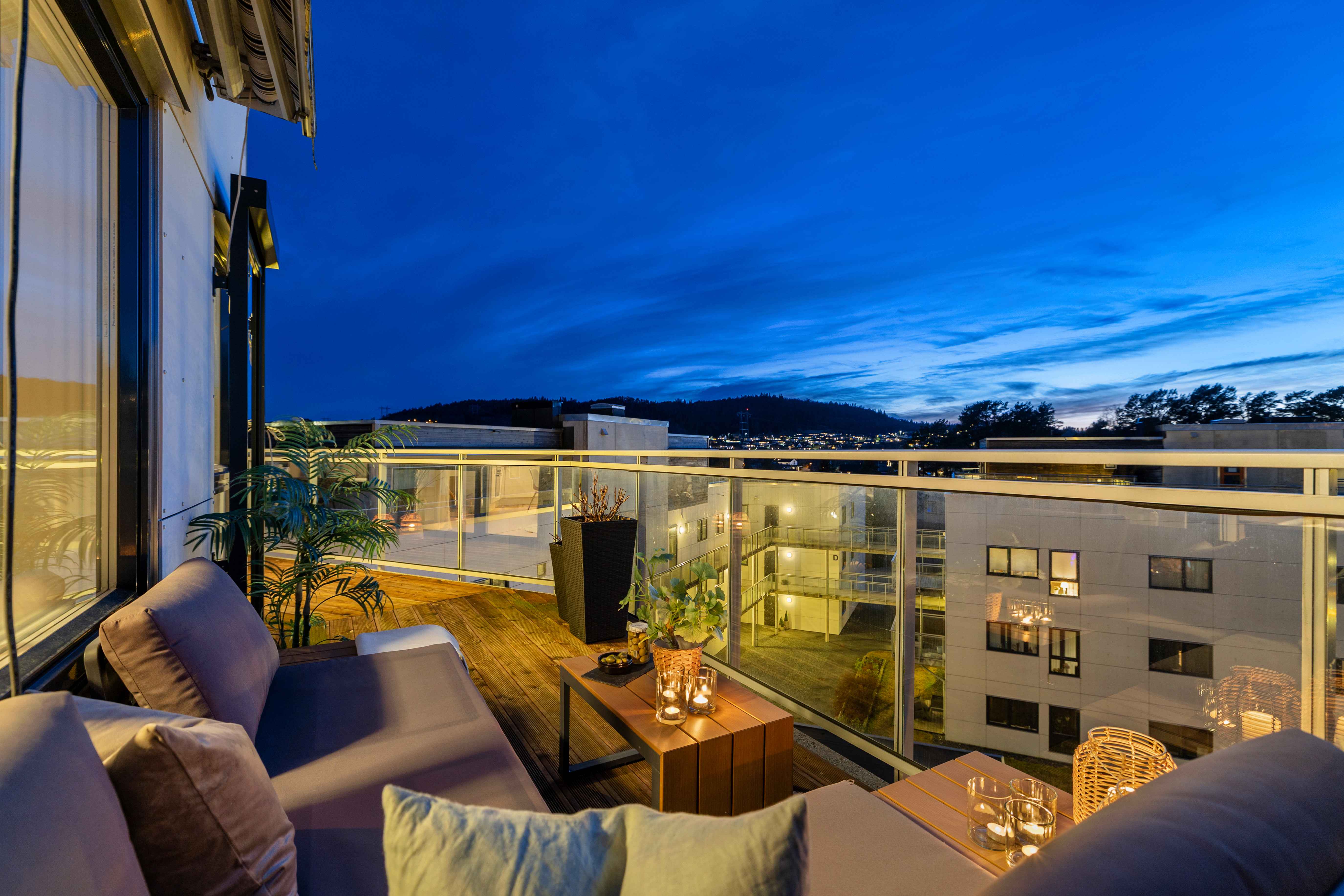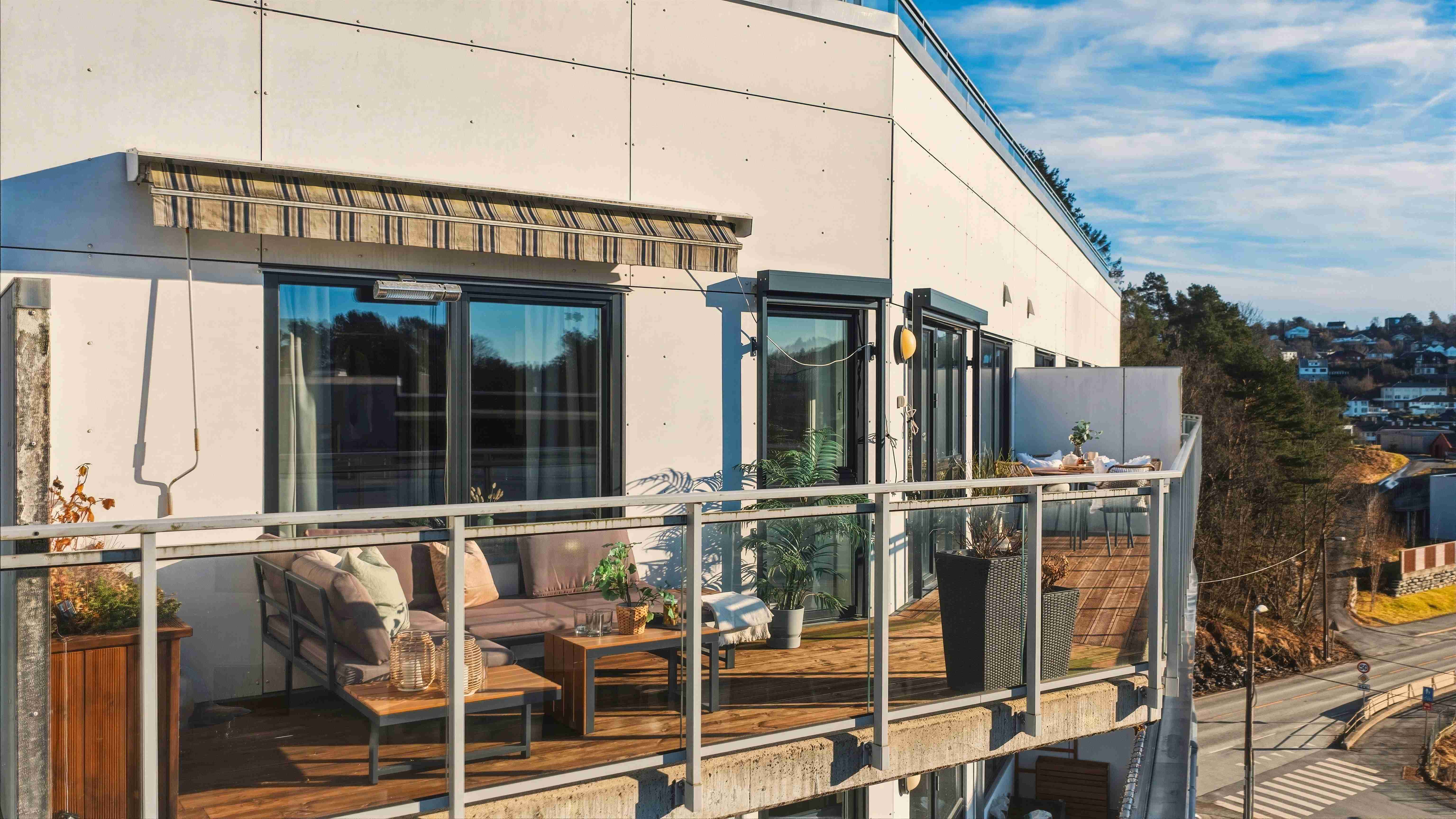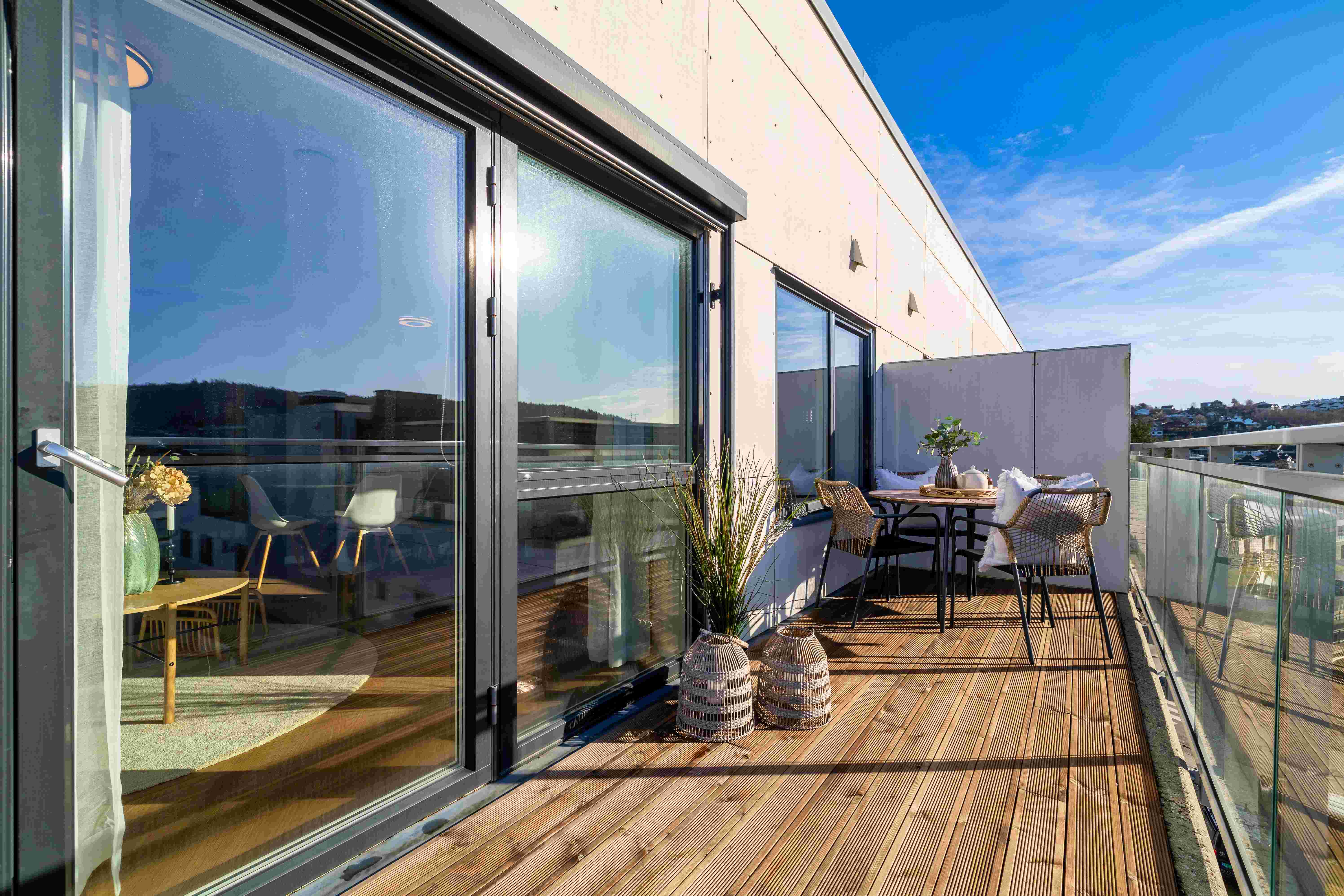 Den romslige balkongen fungerer som en naturlig forlengelse av stuen i sommerhalvåret, med god plass til både spisegruppe og lounge.