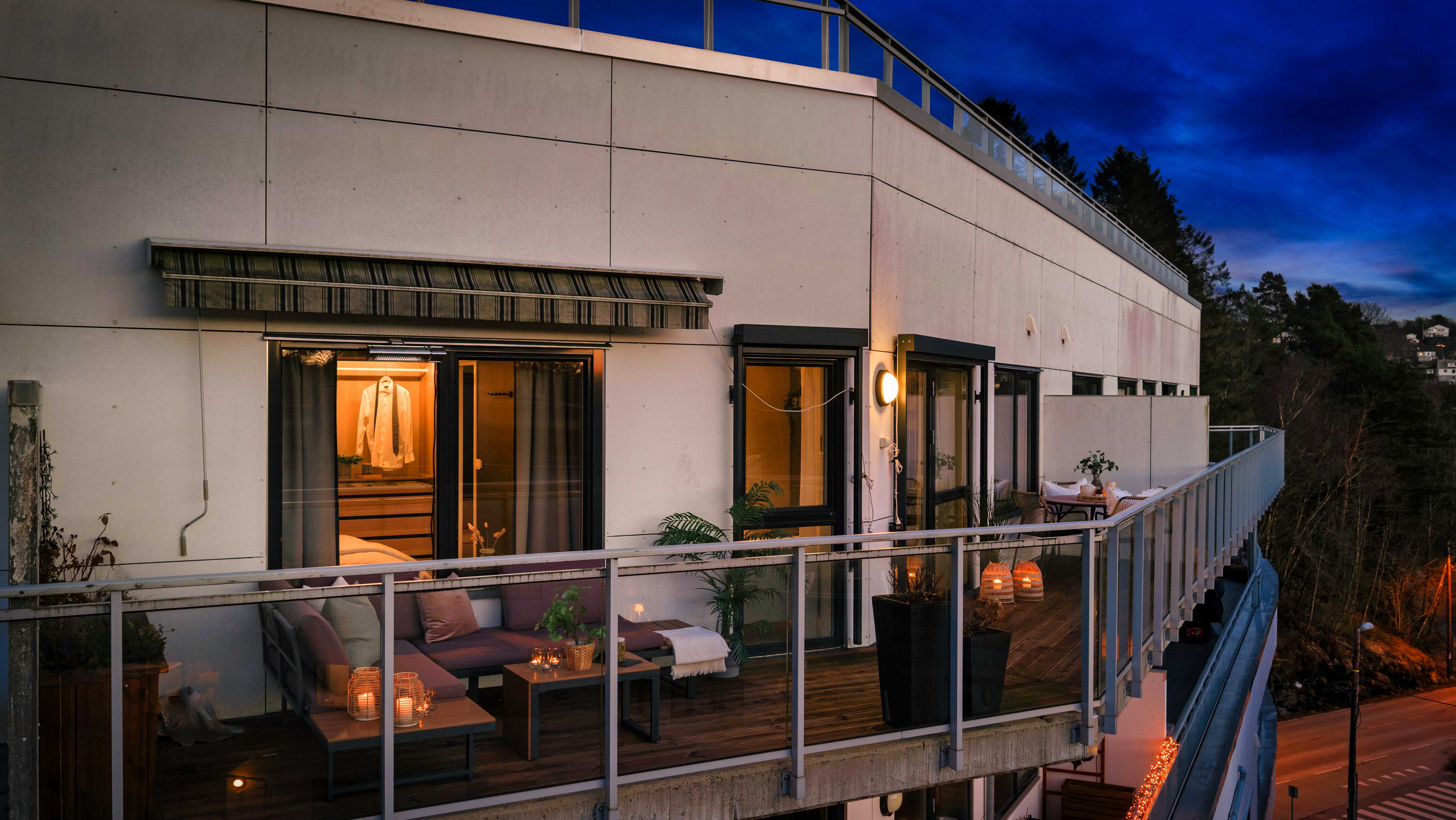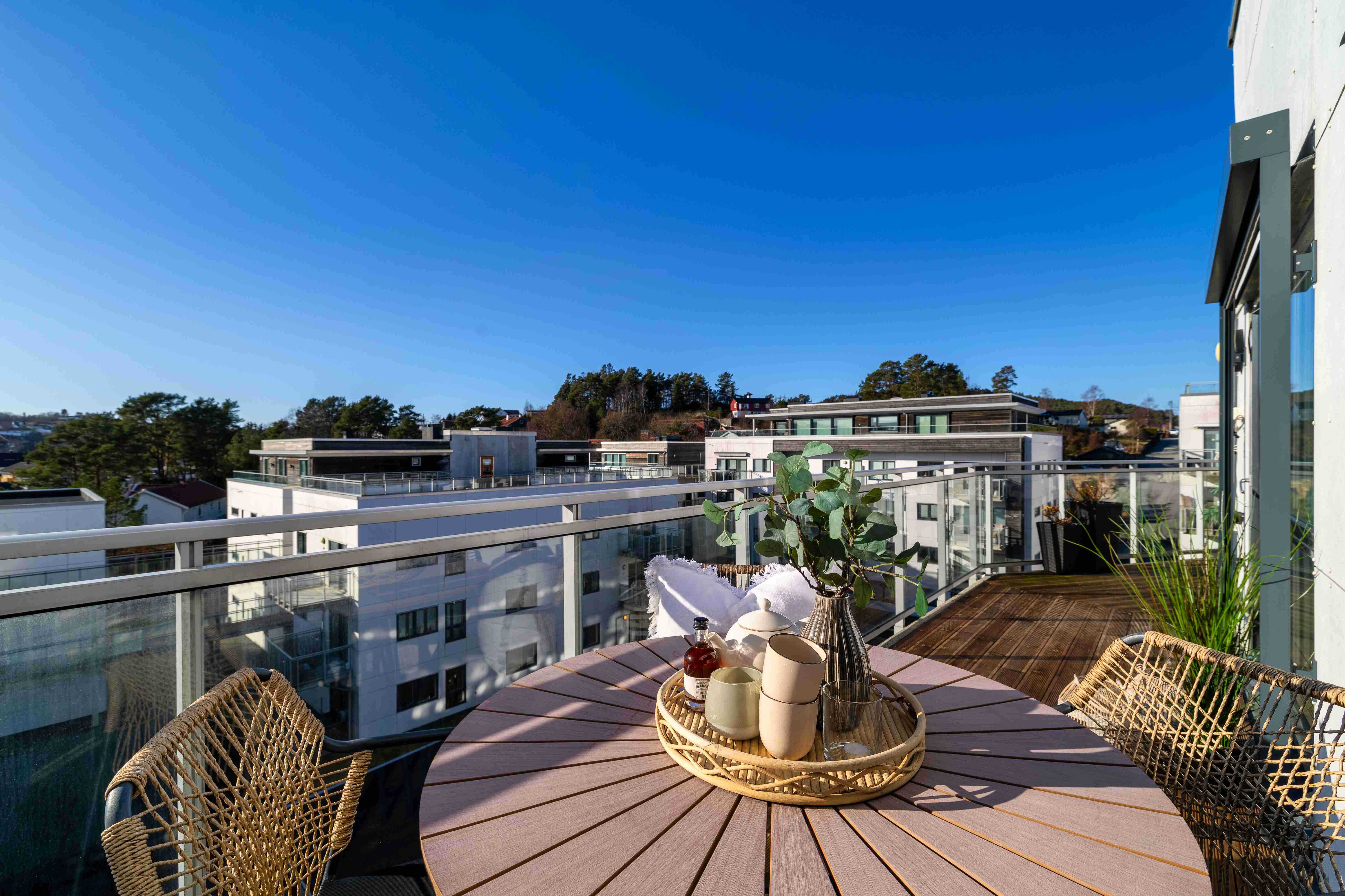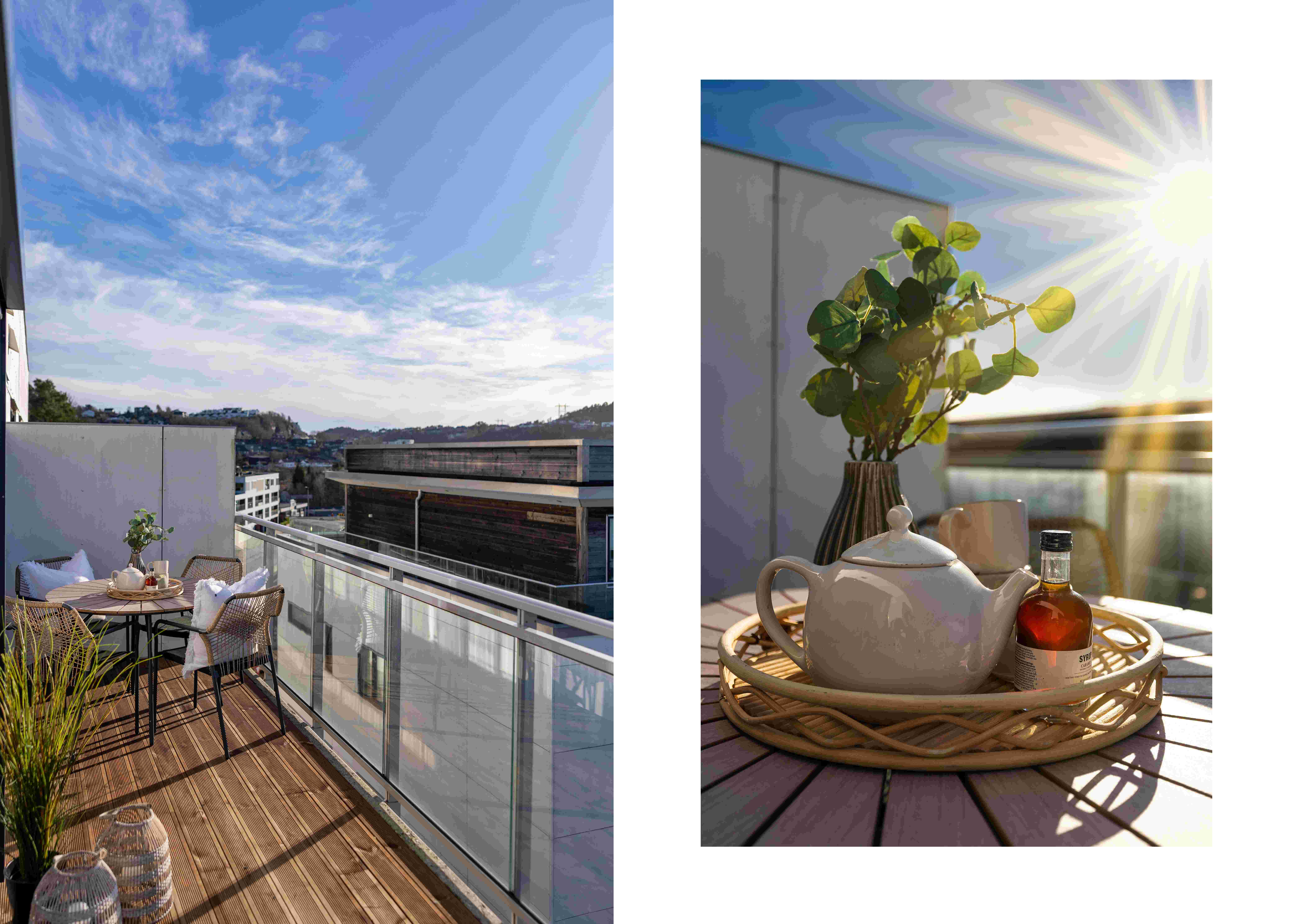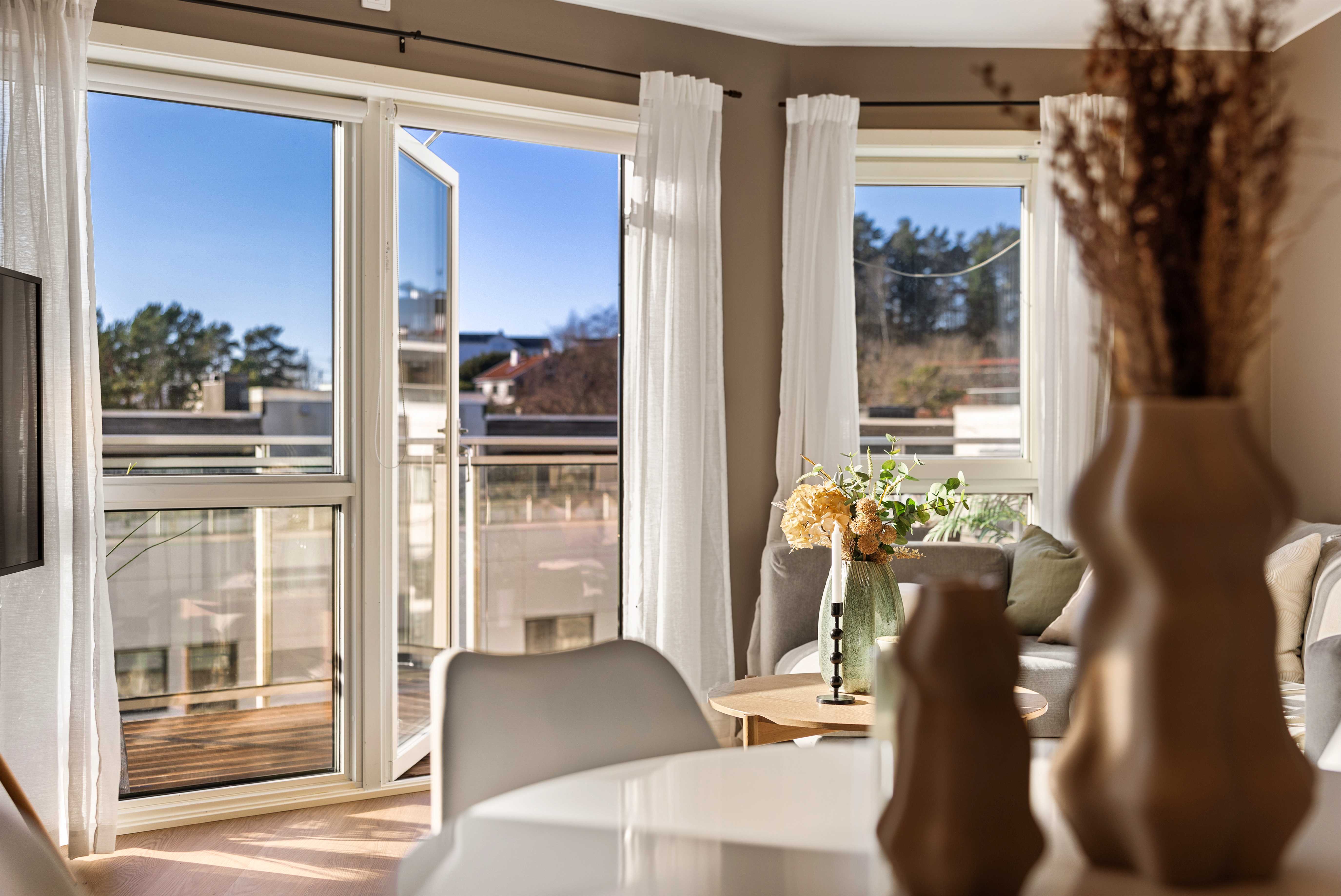 Den romslige balkongen fungerer som en naturlig forlengelse av stuen i sommerhalvåret, med god plass til både spisegruppe og lounge.
