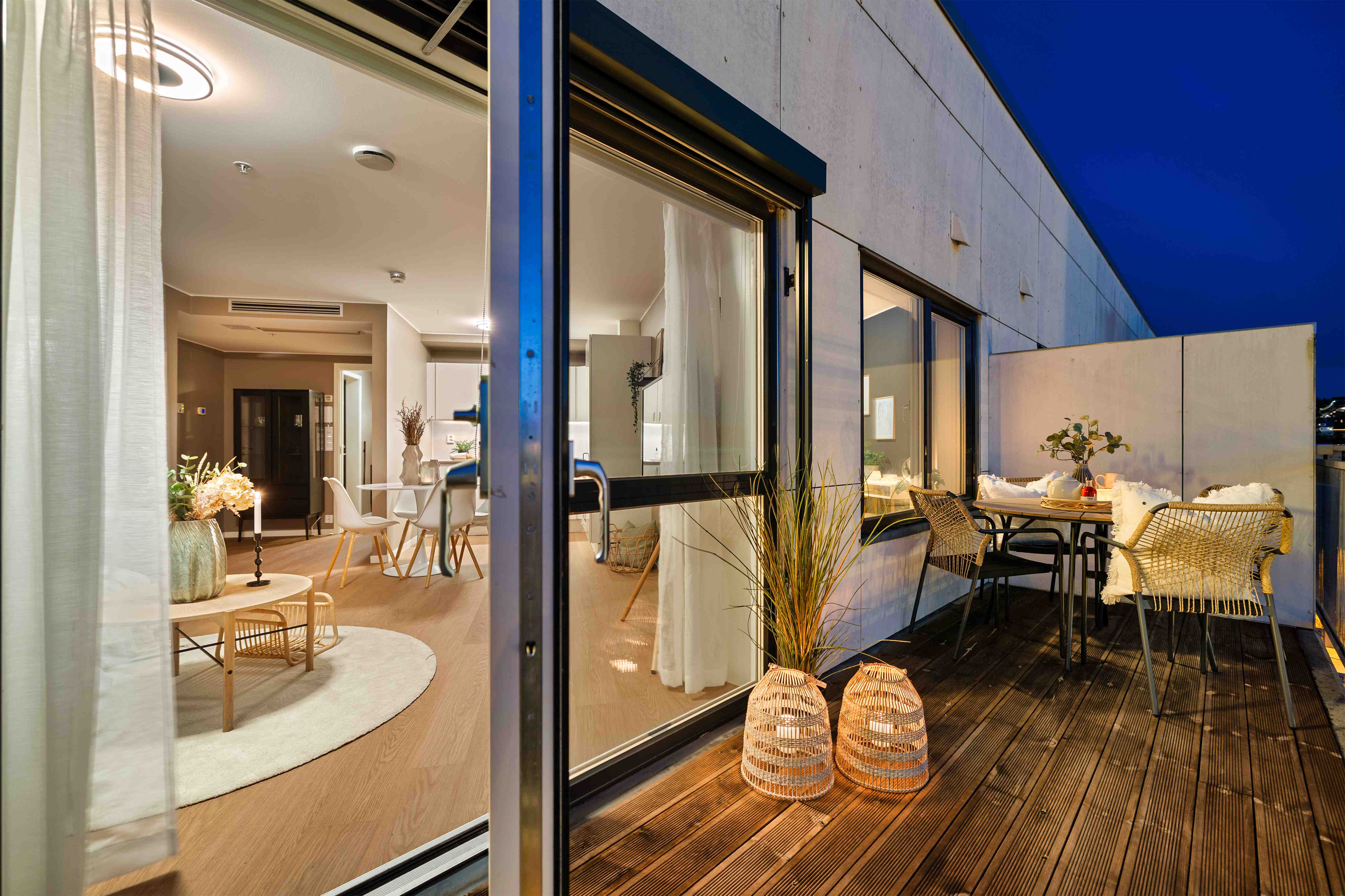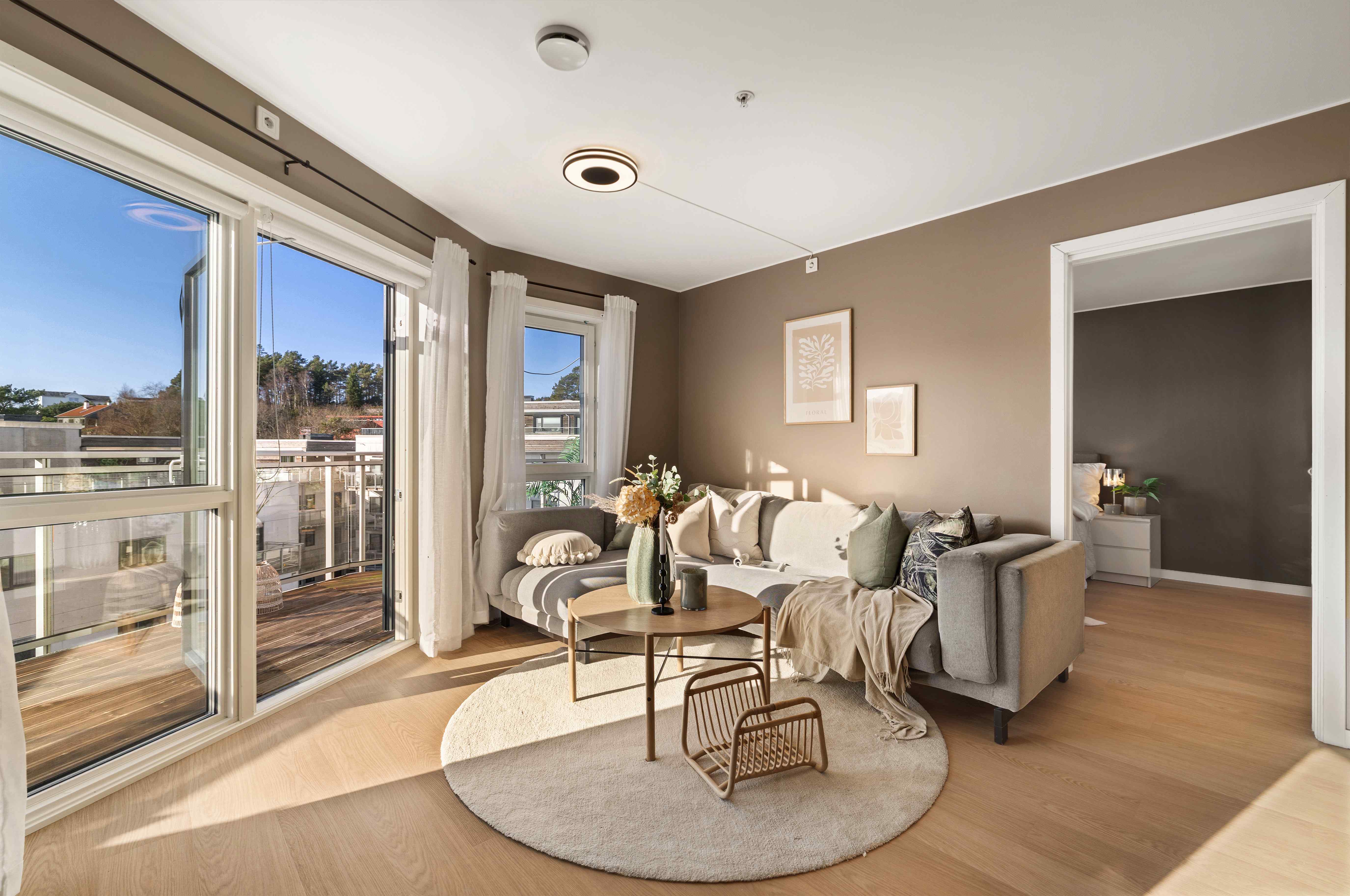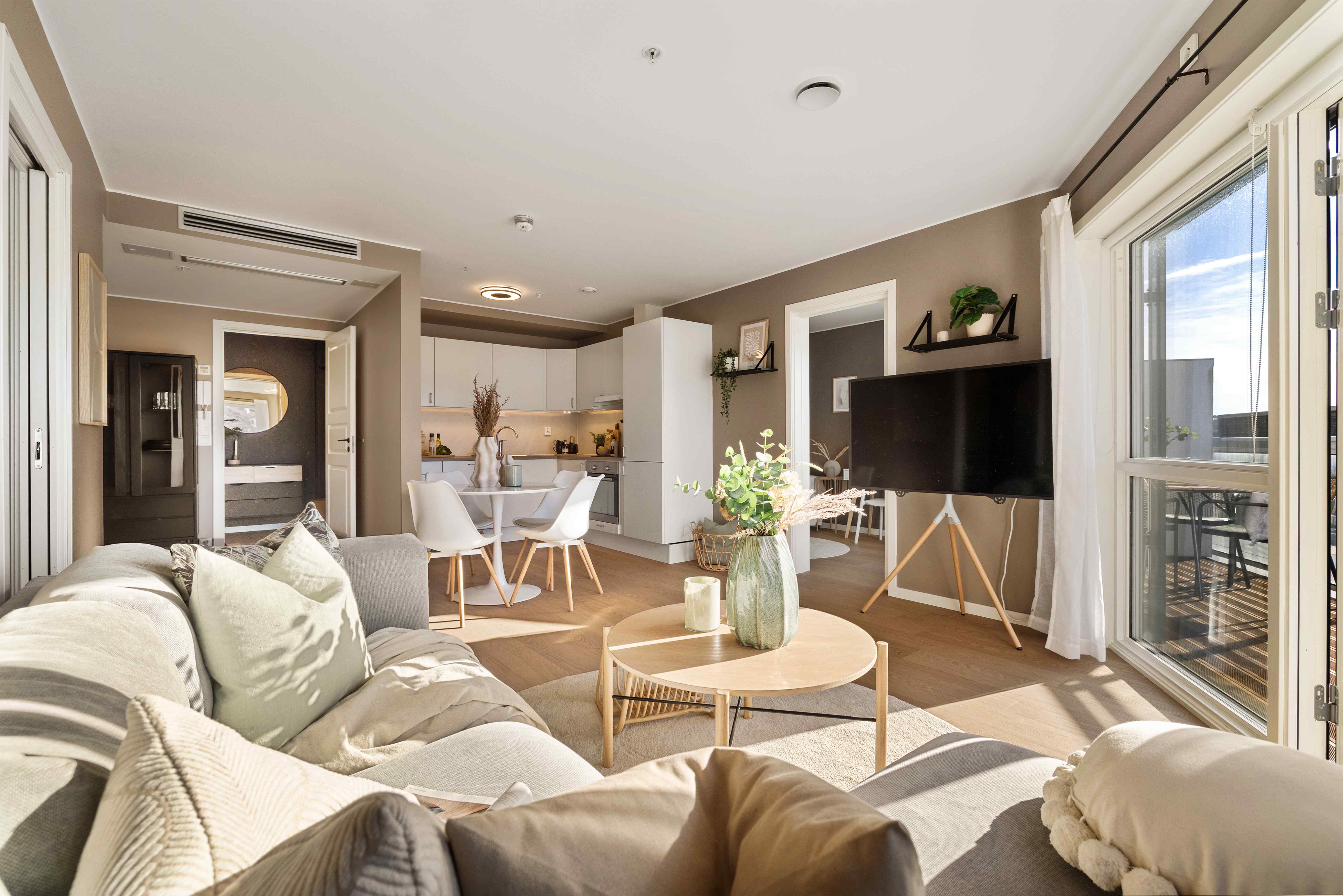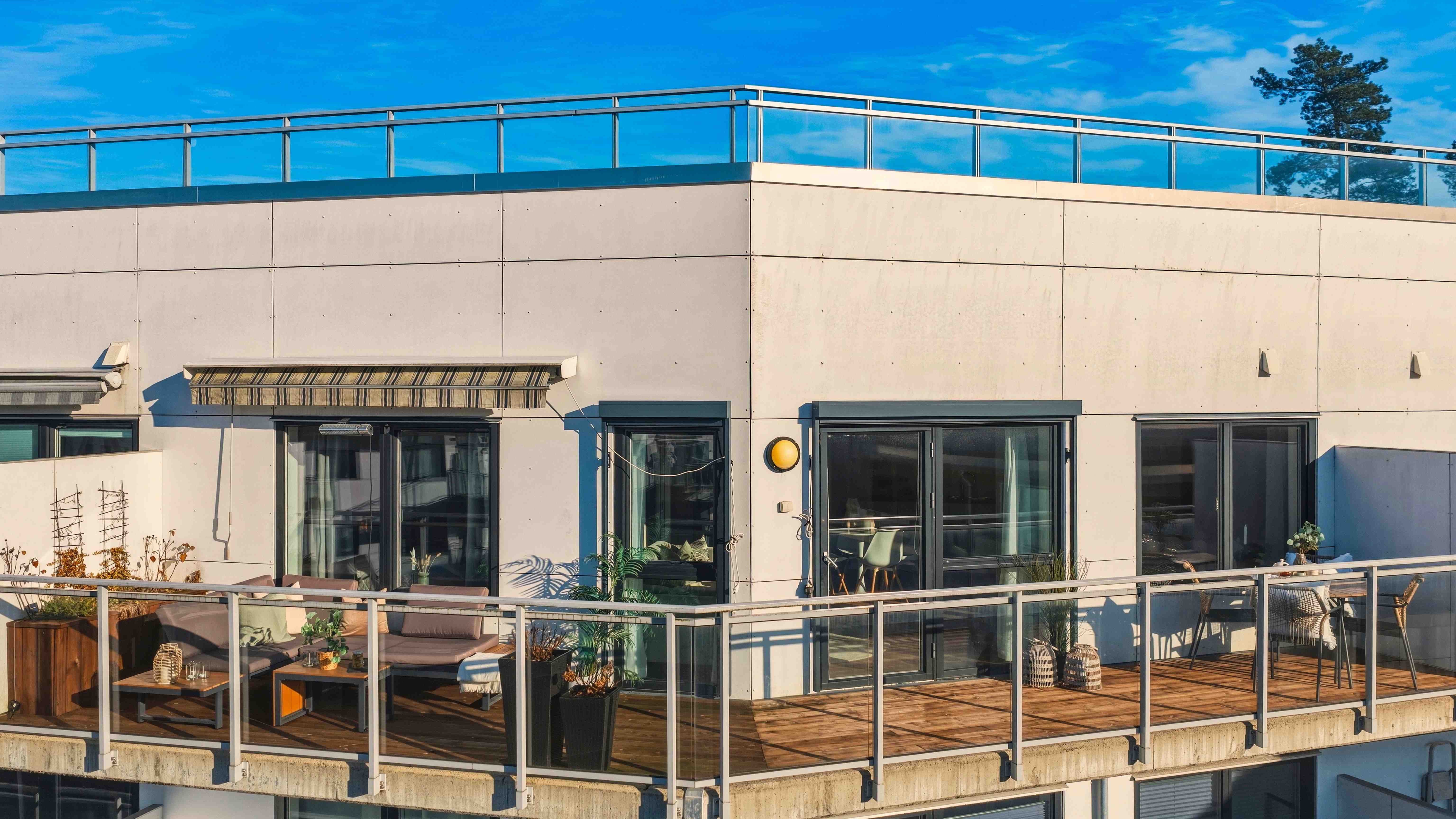 Den romslige balkongen fungerer som en naturlig forlengelse av stuen i sommerhalvåret, med god plass til både spisegruppe og lounge.
