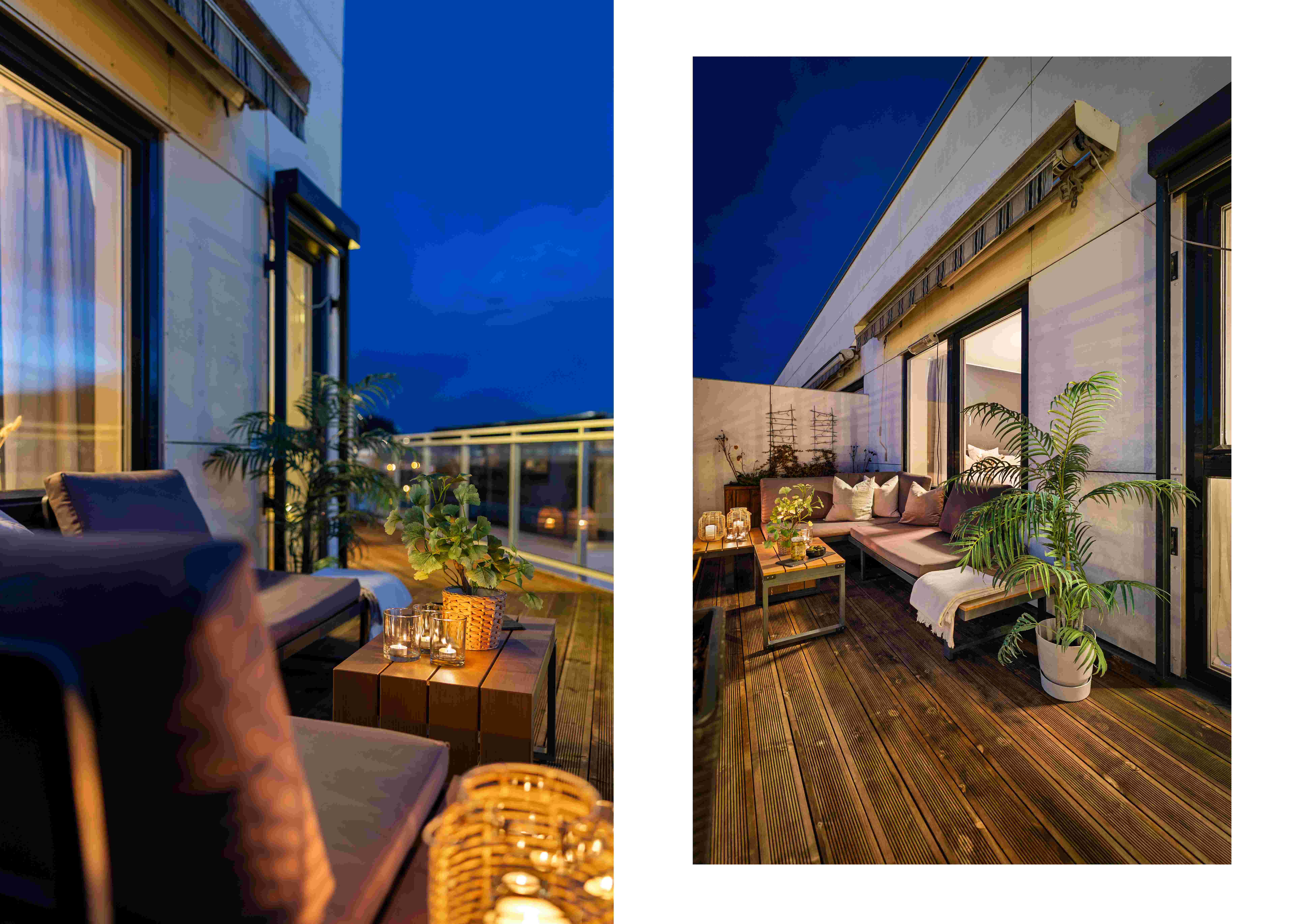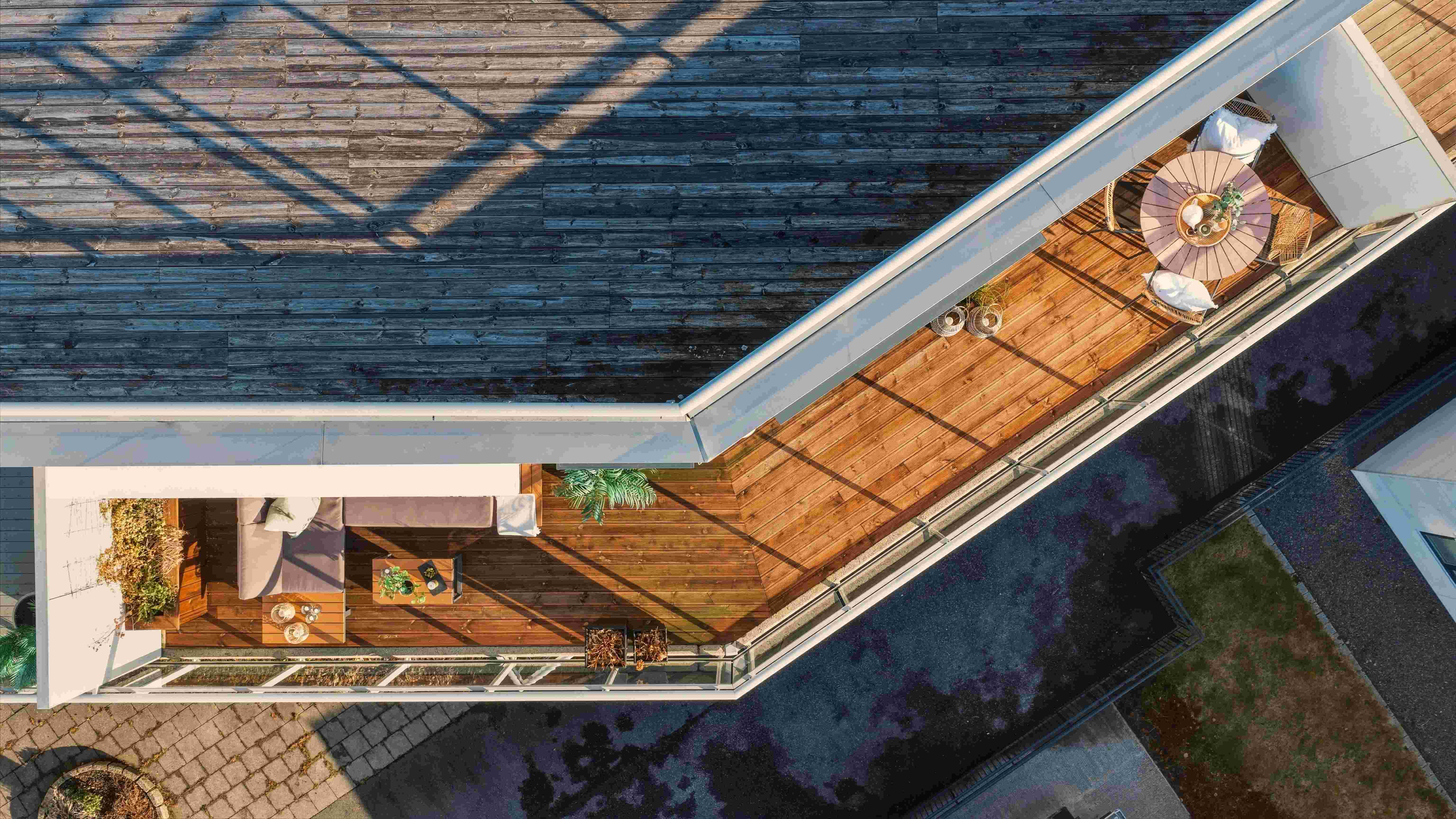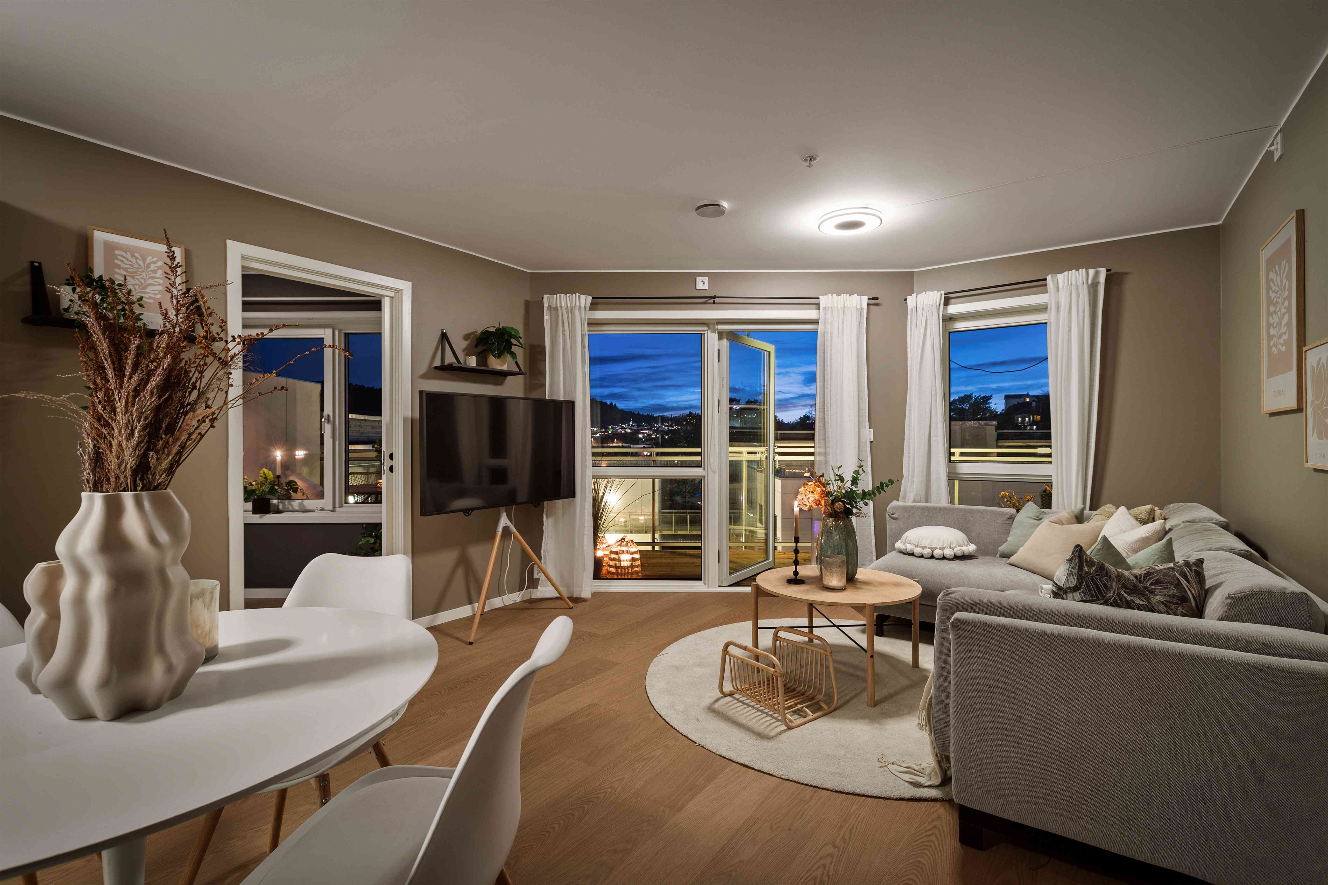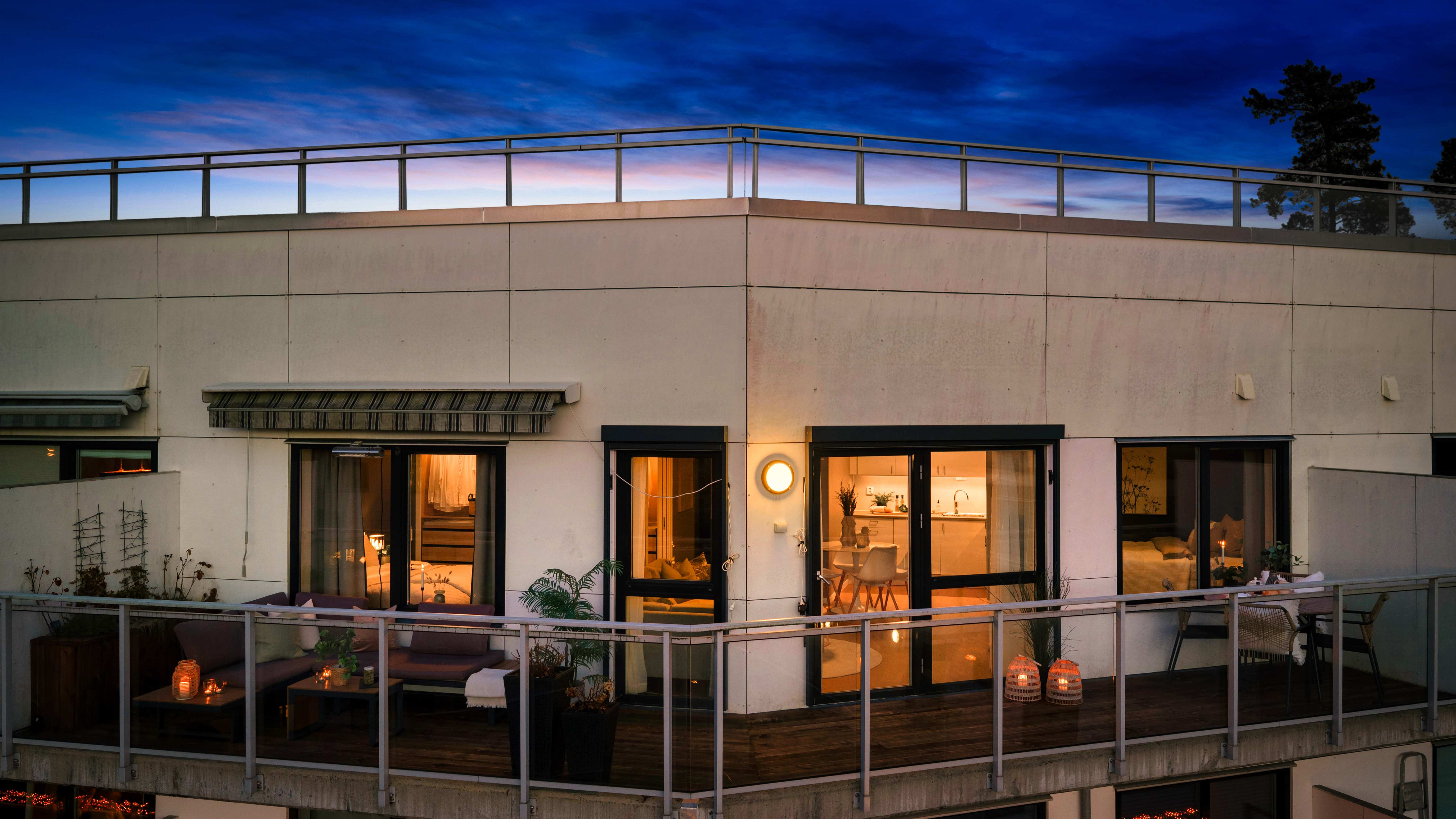 Den romslige balkongen fungerer som en naturlig forlengelse av stuen i sommerhalvåret, med god plass til både spisegruppe og lounge.