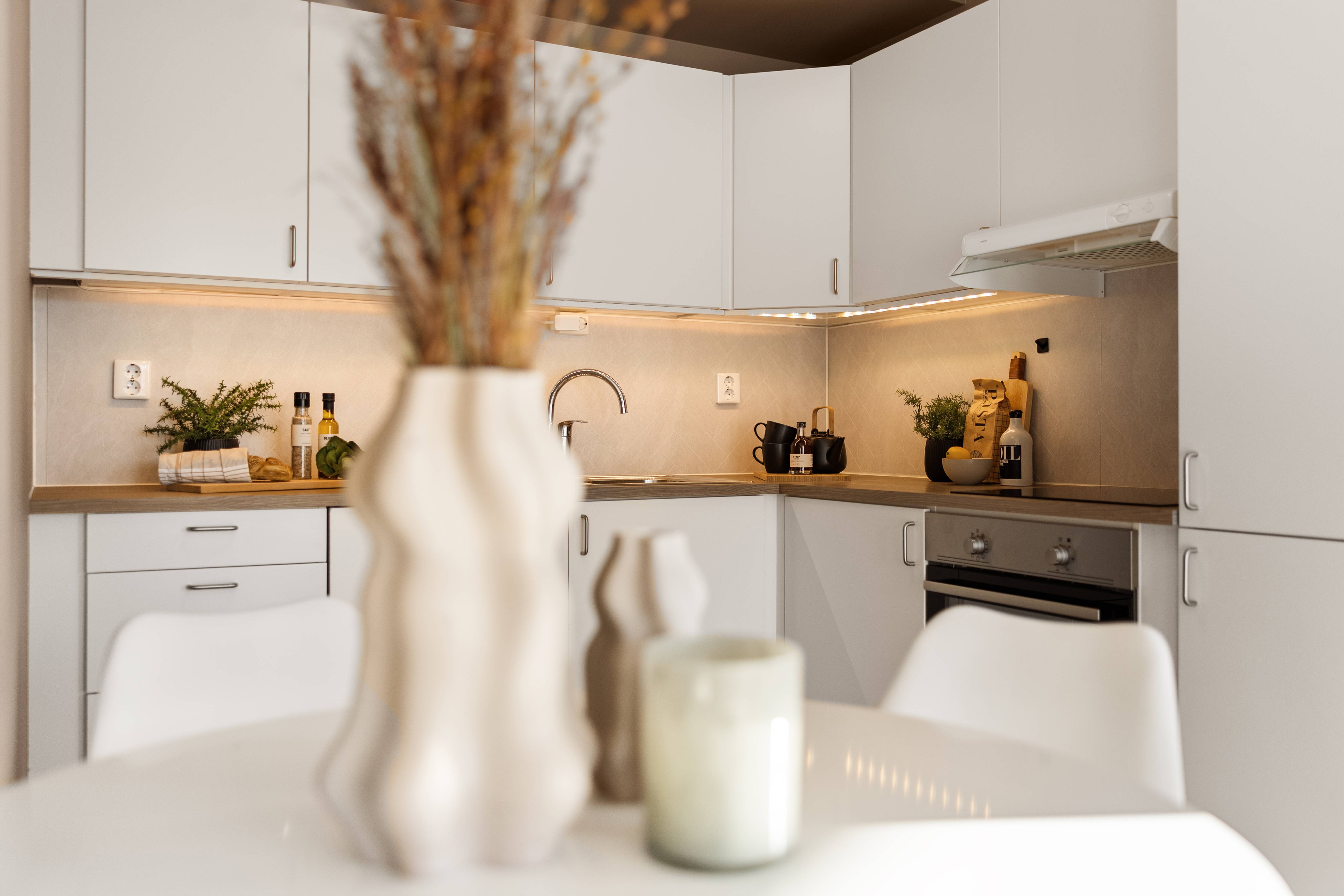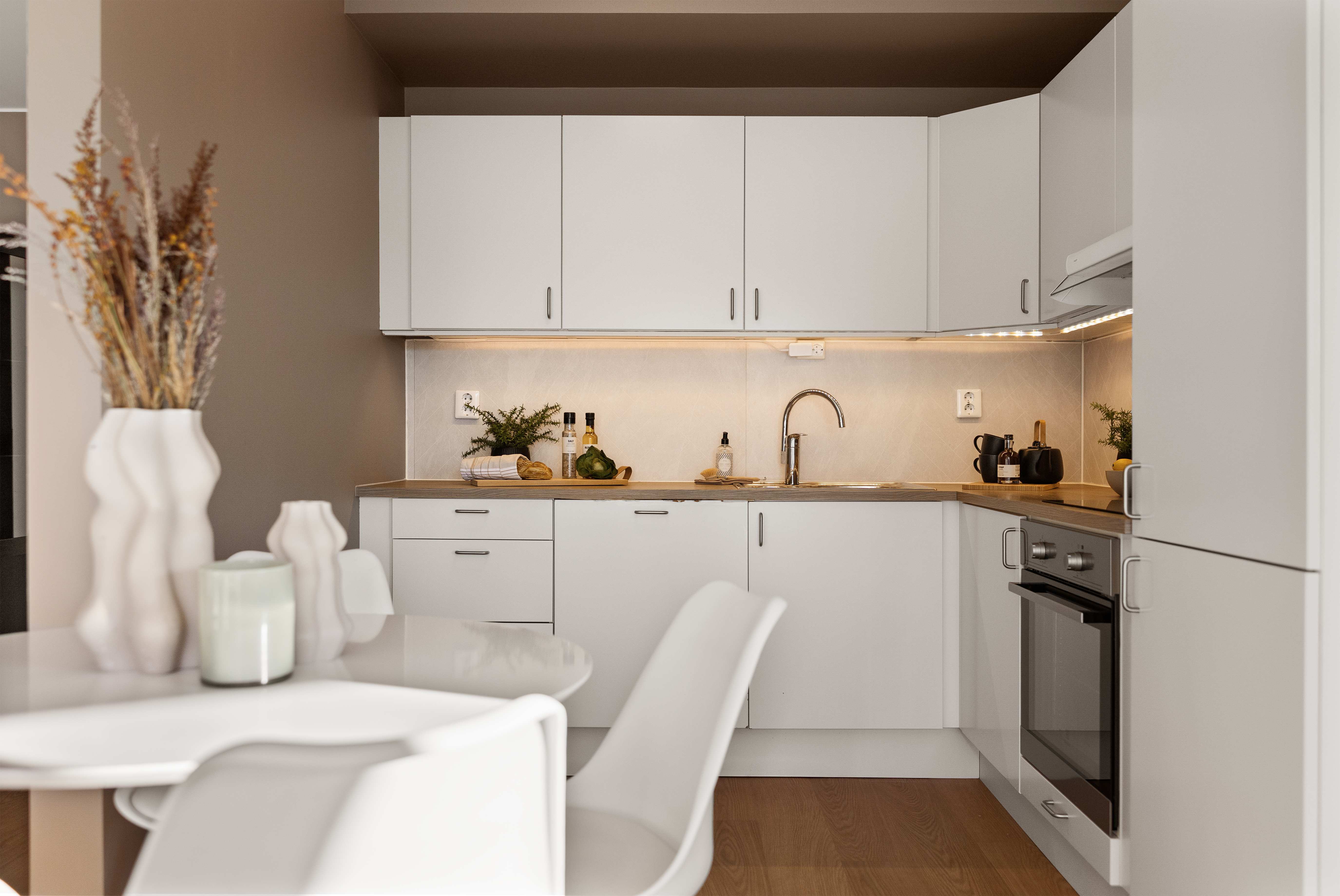 Selger opplyser at integrerte hvitevarer på kjøkken medfølger i salget. Hvitevarene er brukt (uten garanti) og overtas på denne bakgrunn. Ingen øvrige hvitevarer følger med.