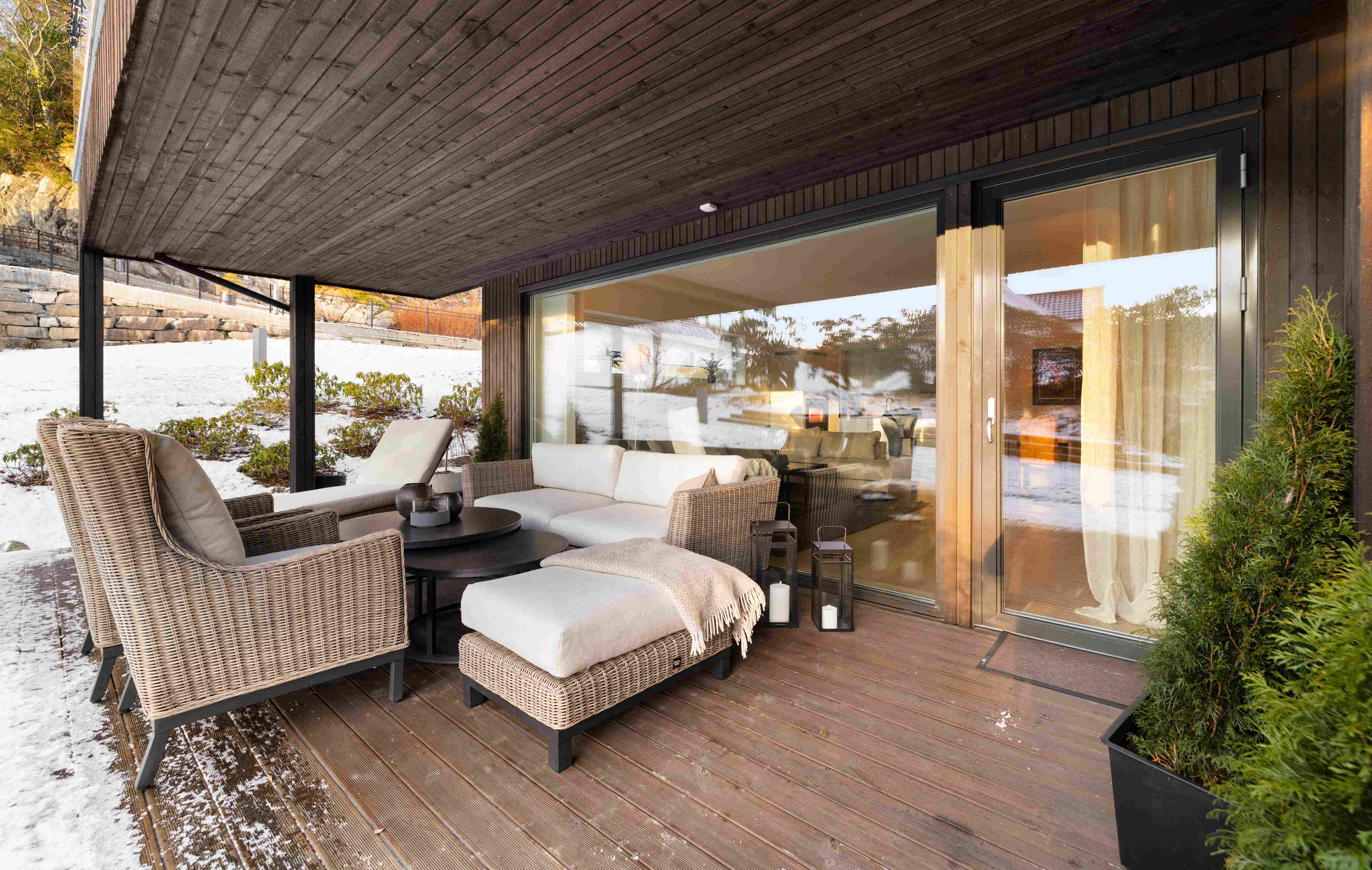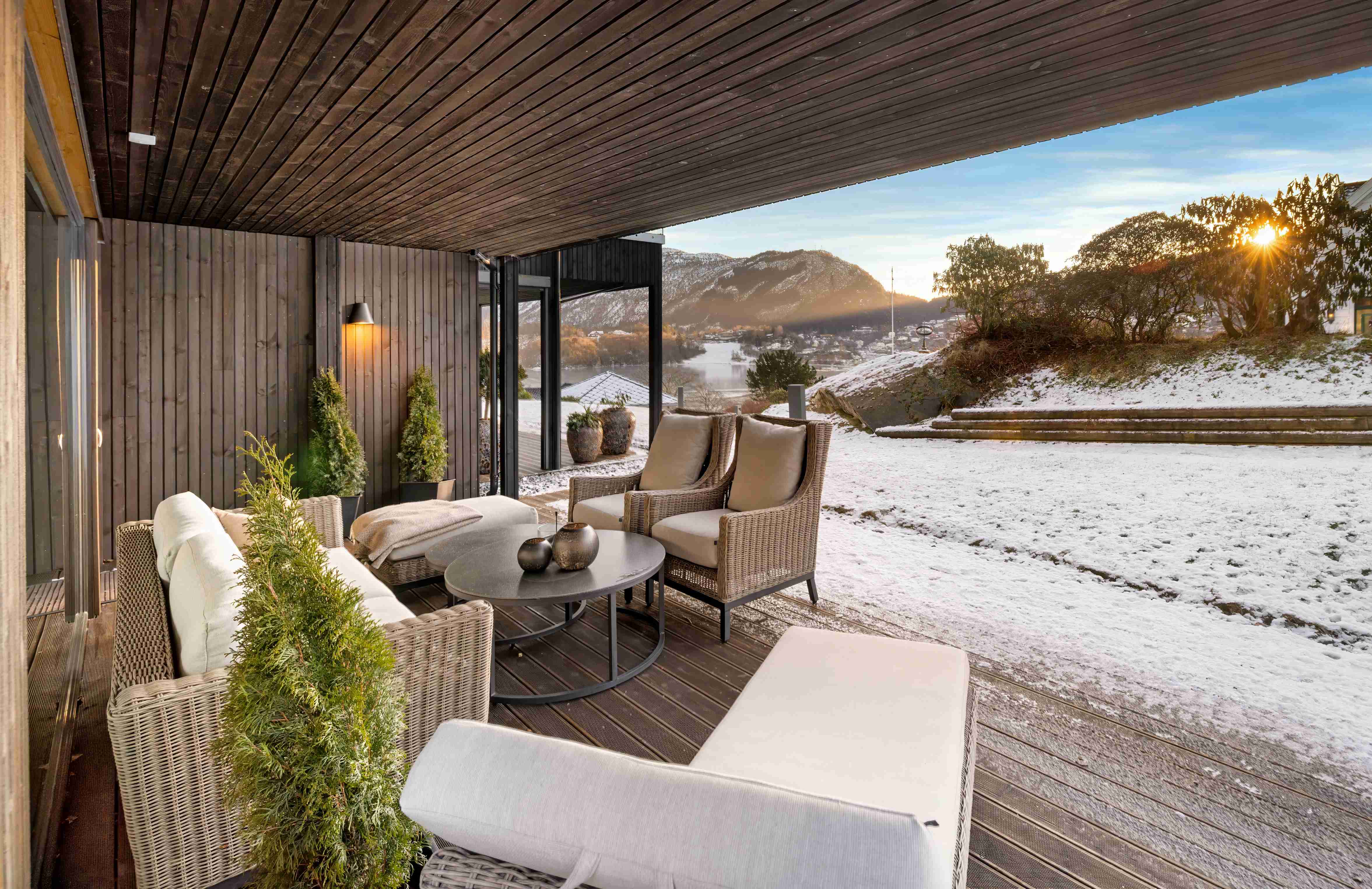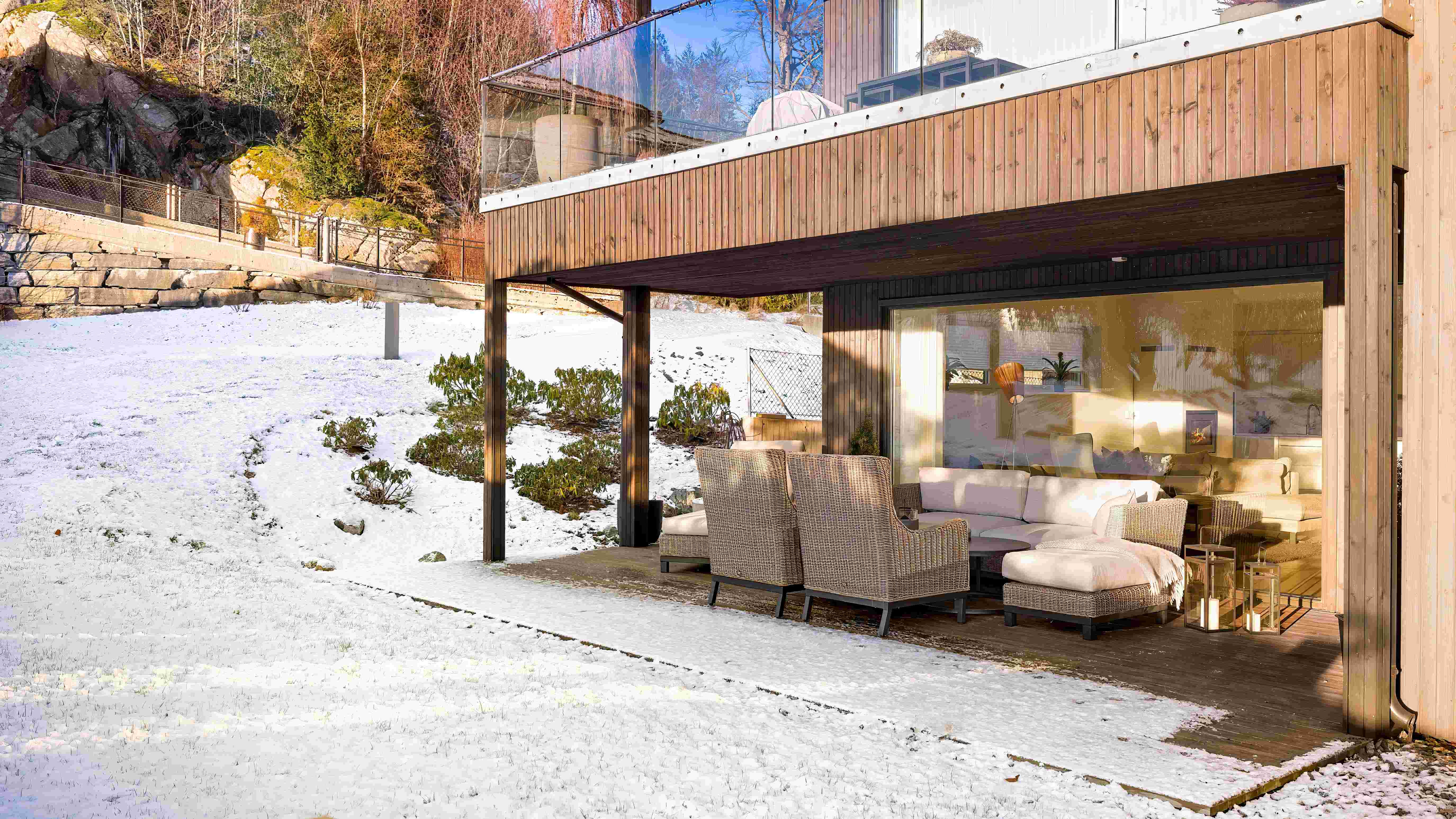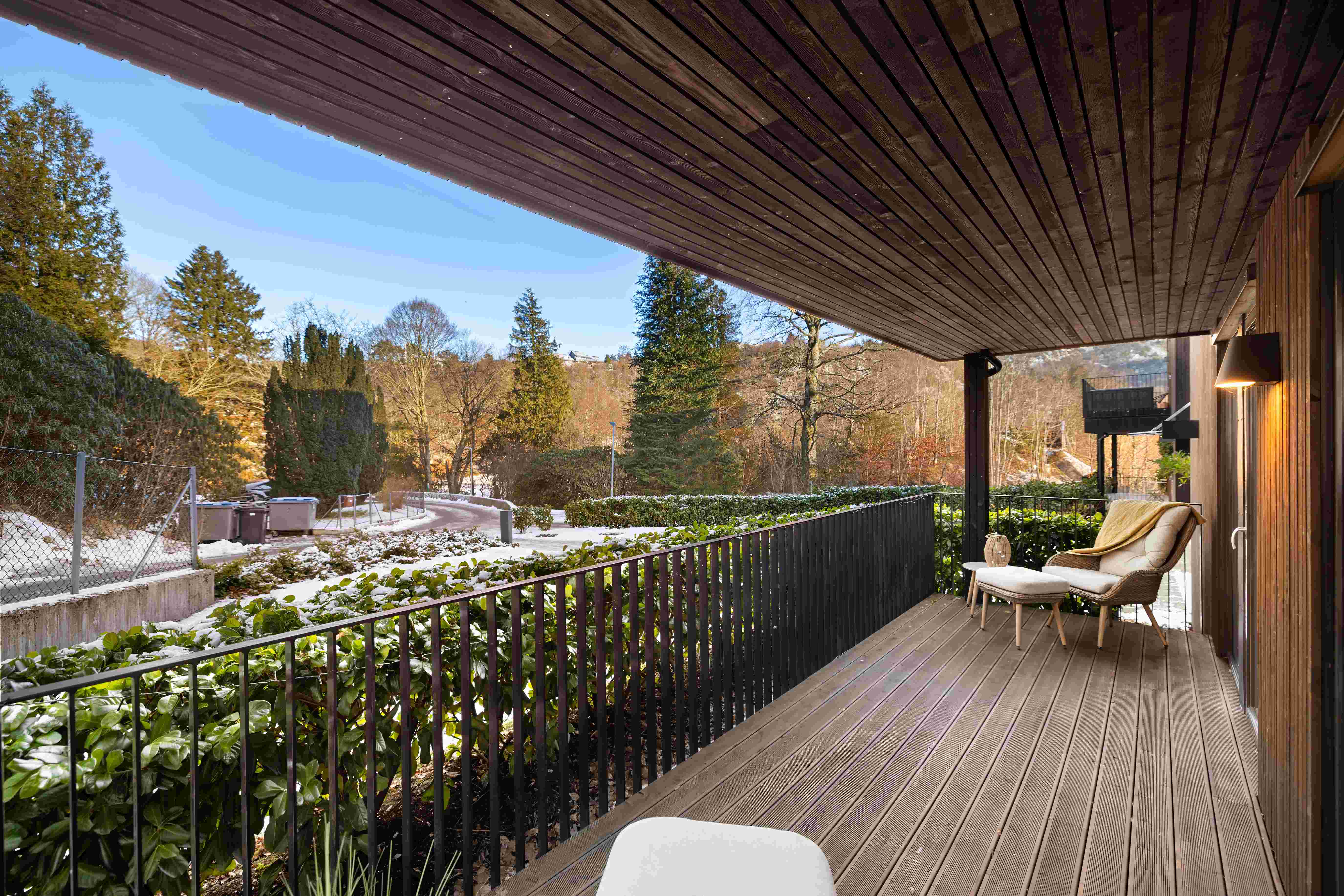 Med utgang fra stue er det adkomst til en delvis overbygget markterrasse med et areal på 27 m². I tillegg er det en nordvendt terrasse på 12,6 m² med adkomst fra to av soverommene.