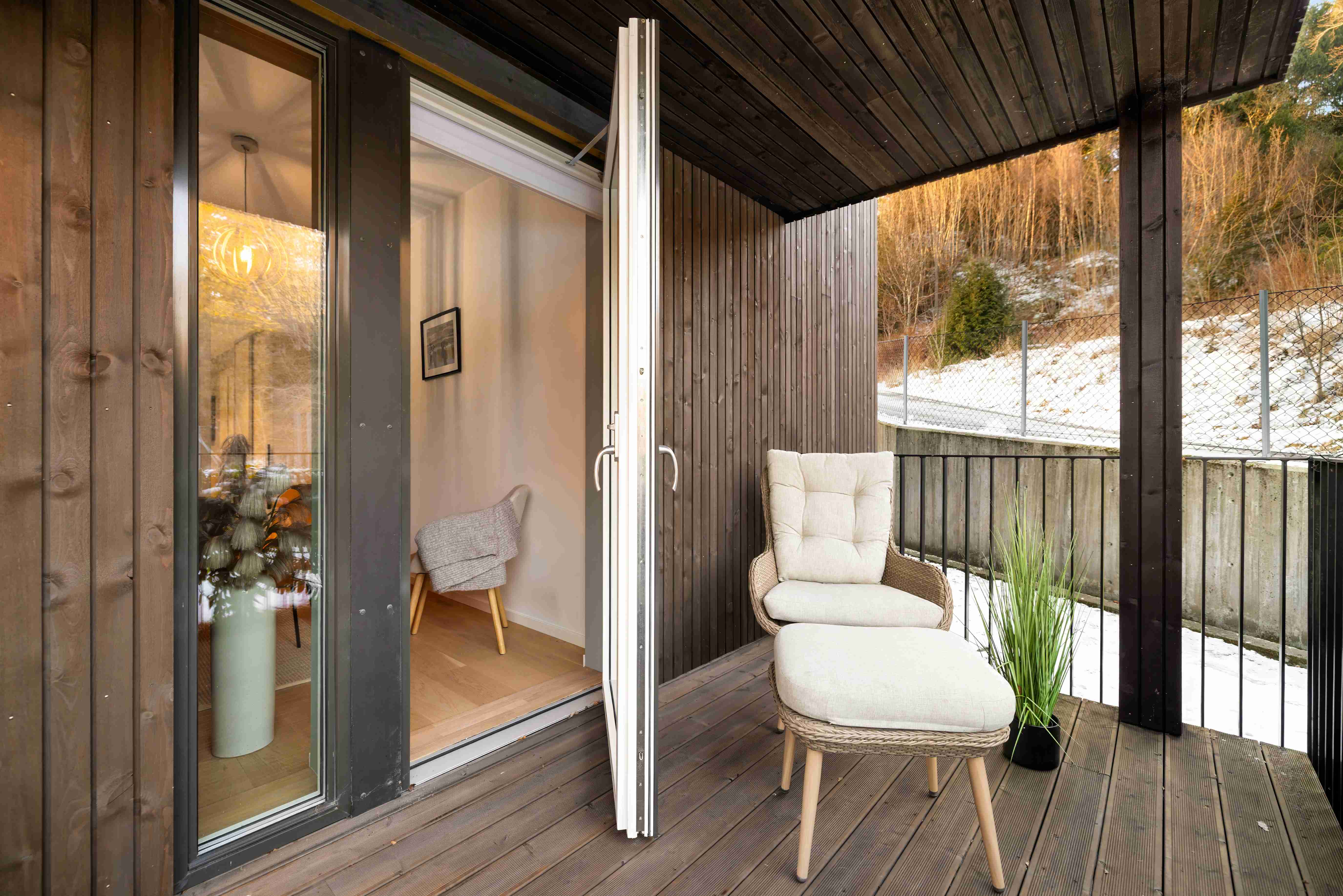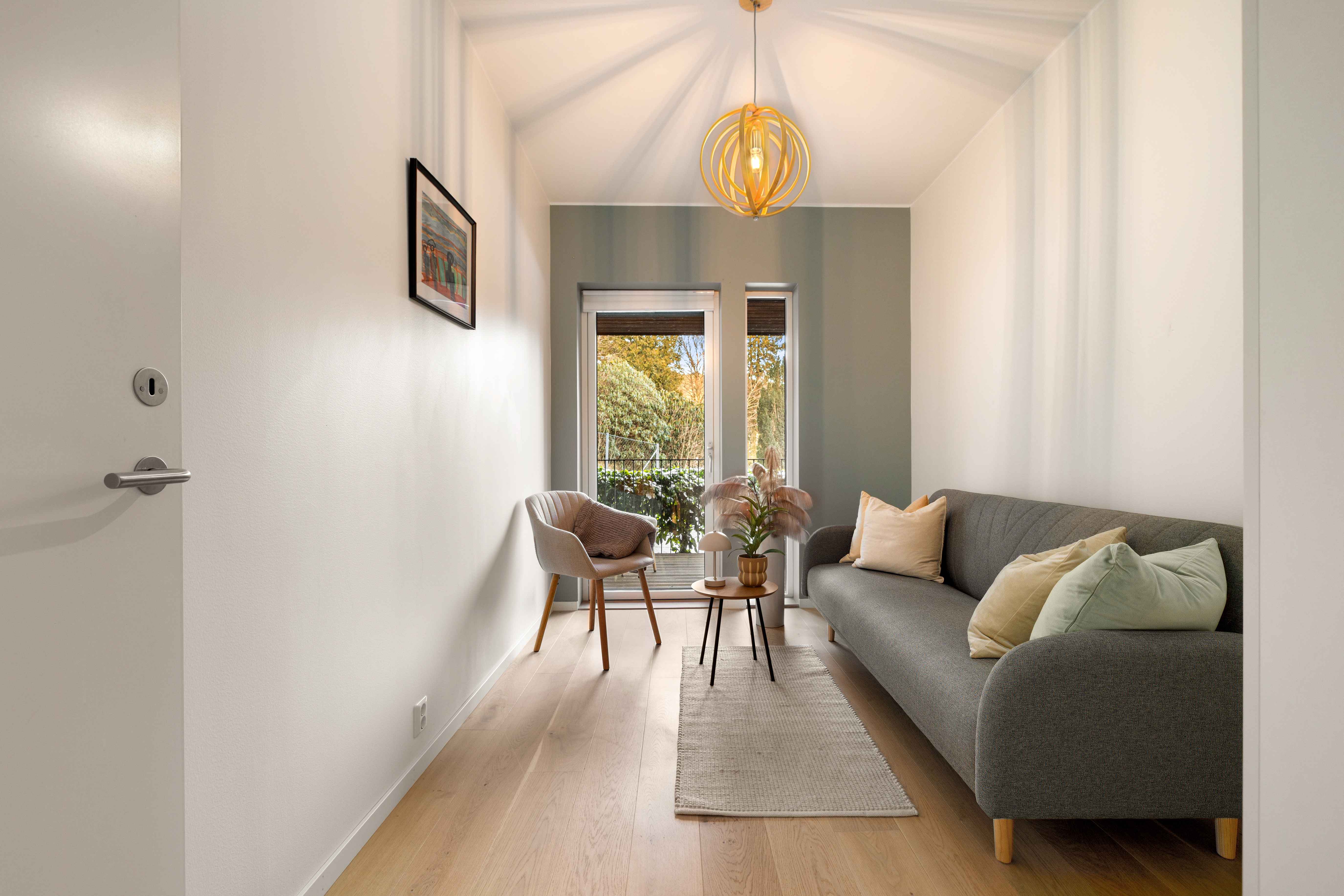 Soverom 2 og 3 har utgang til en egen terrasse på 12,6 m² – perfekt for morgenkaffen i stille og skjermede omgivelser. Det ene soverommet kan eventuelt benyttes til hjemmekontor, eller en kombinert løsning som kontor/gjesterom.