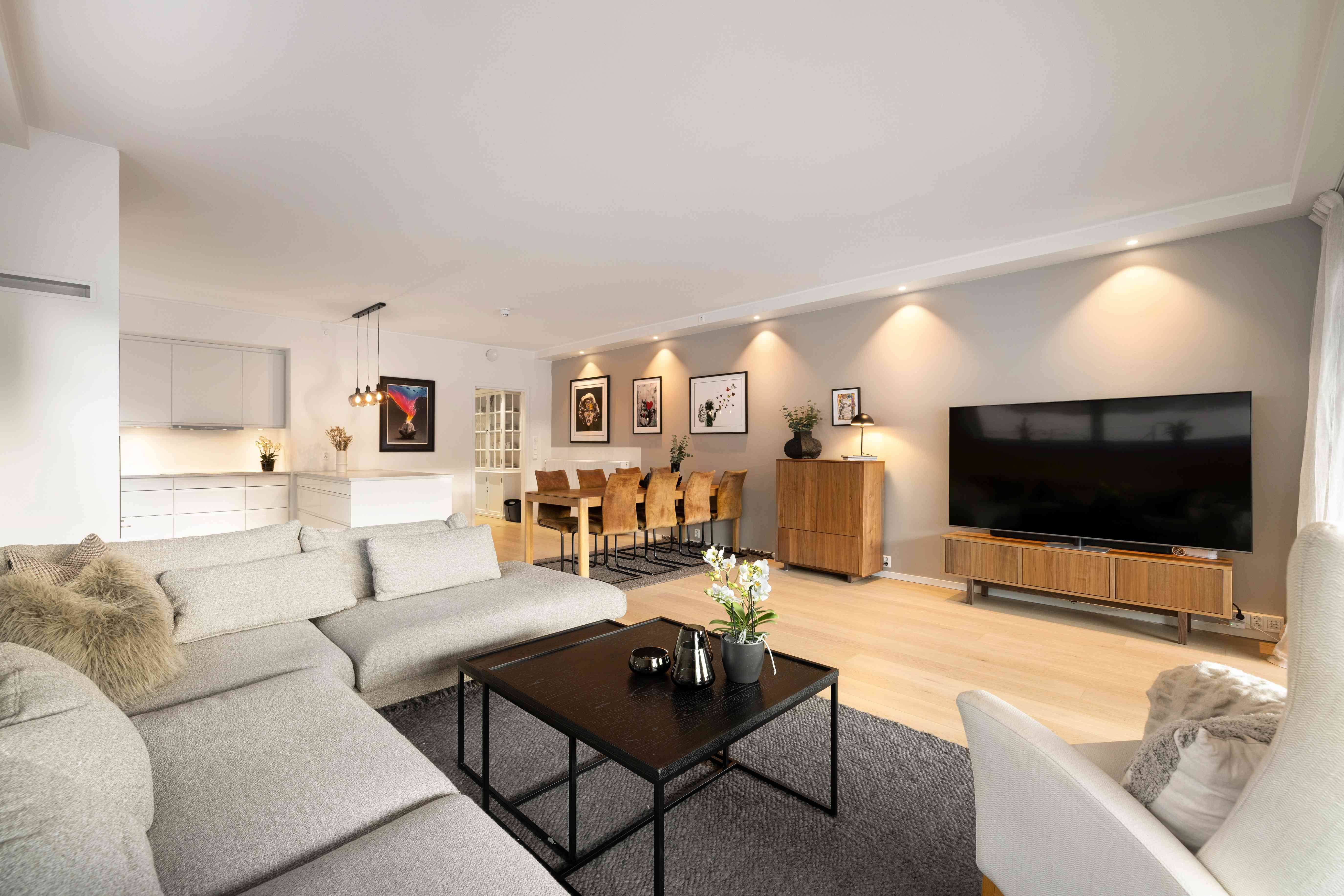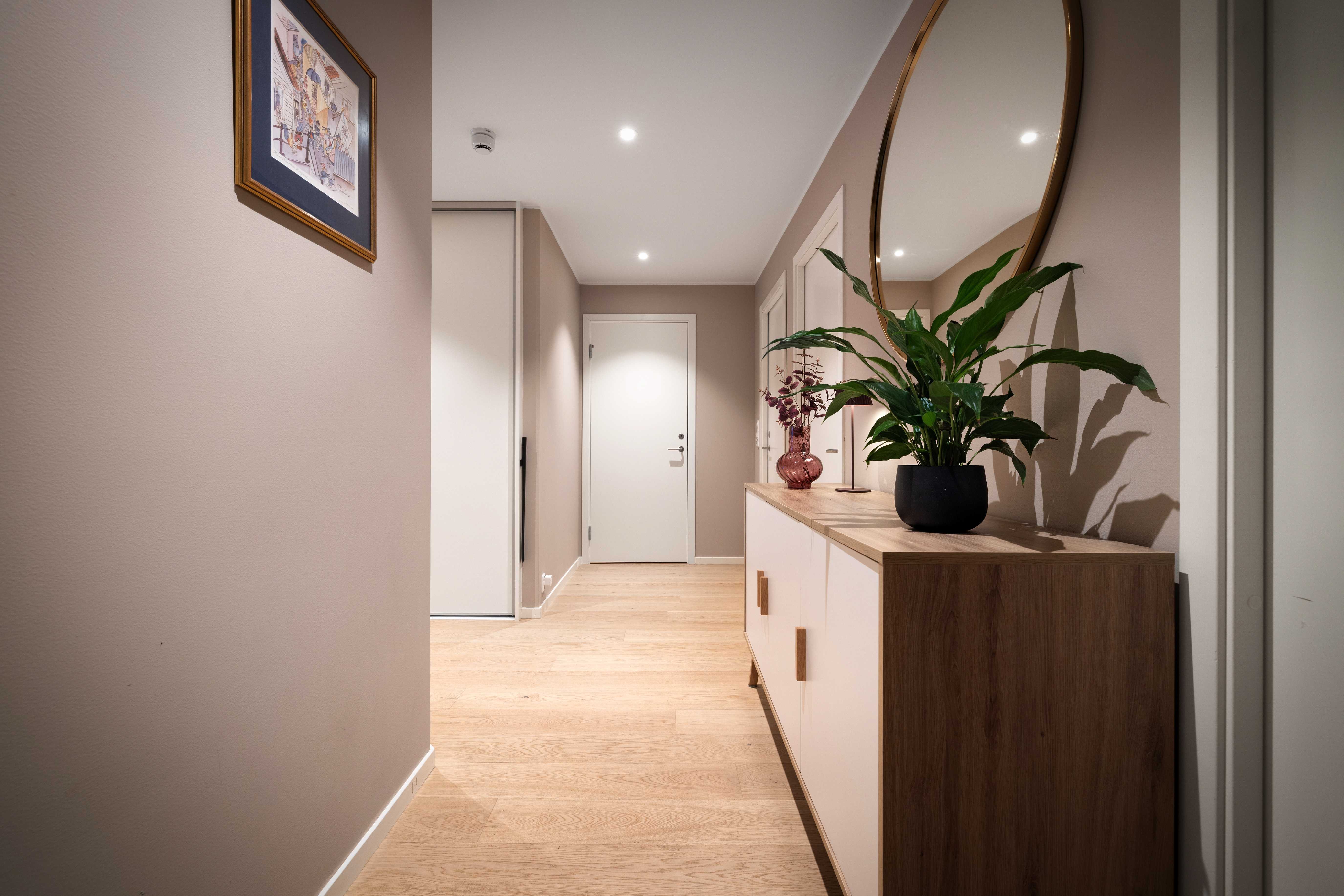 Leiligheten åpner seg med en romslig og stilren entré/gang, utstyrt med skyvedørsgarderobe. Planløsningen er gjennomtenkt og effektiv, med tre gode soverom, to baderom (det ene er dedikert til master-soverom), separat vaskerom/bod og en imponerende stue- og kjøkkenløsning med god takhøyde og store vindusflater.