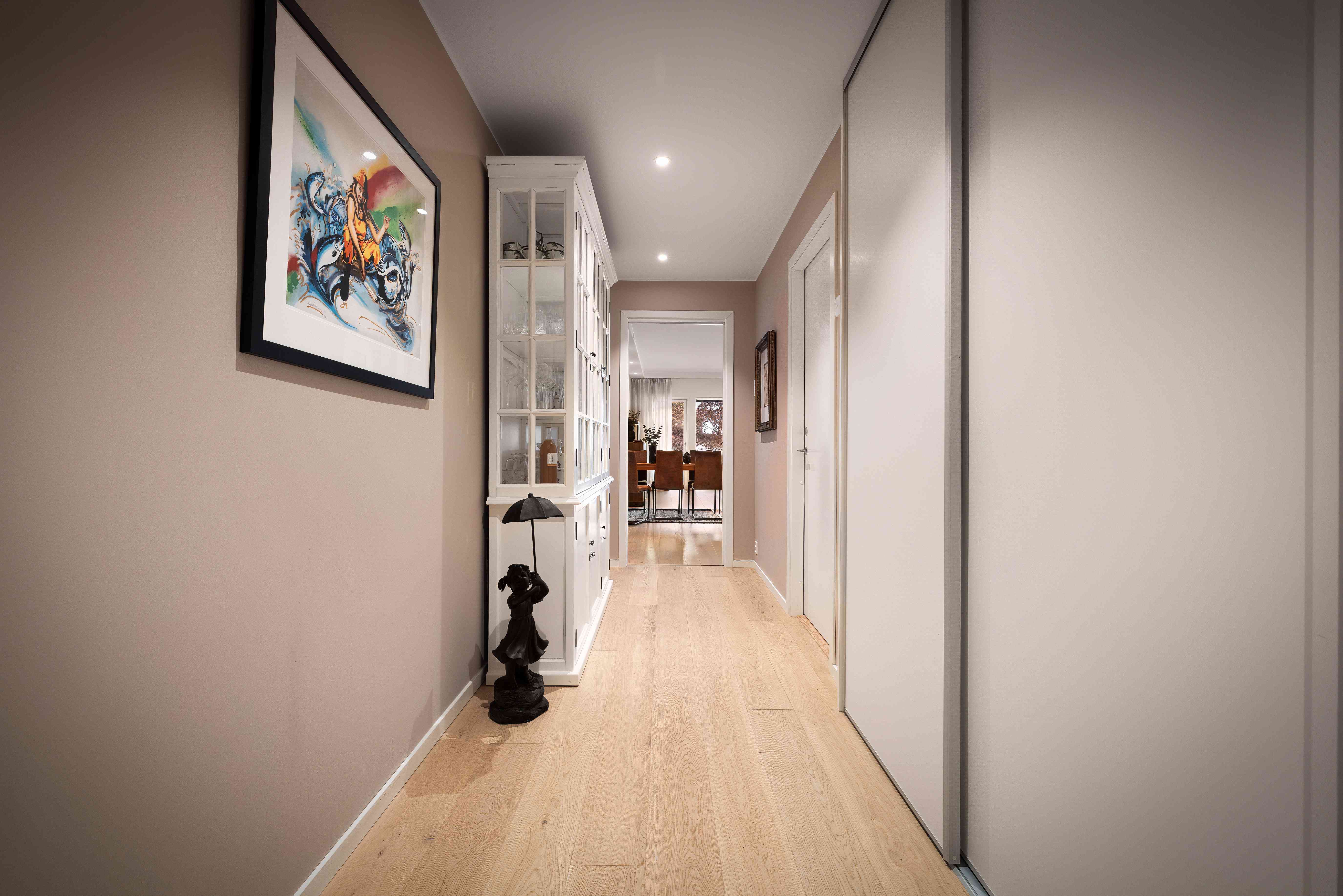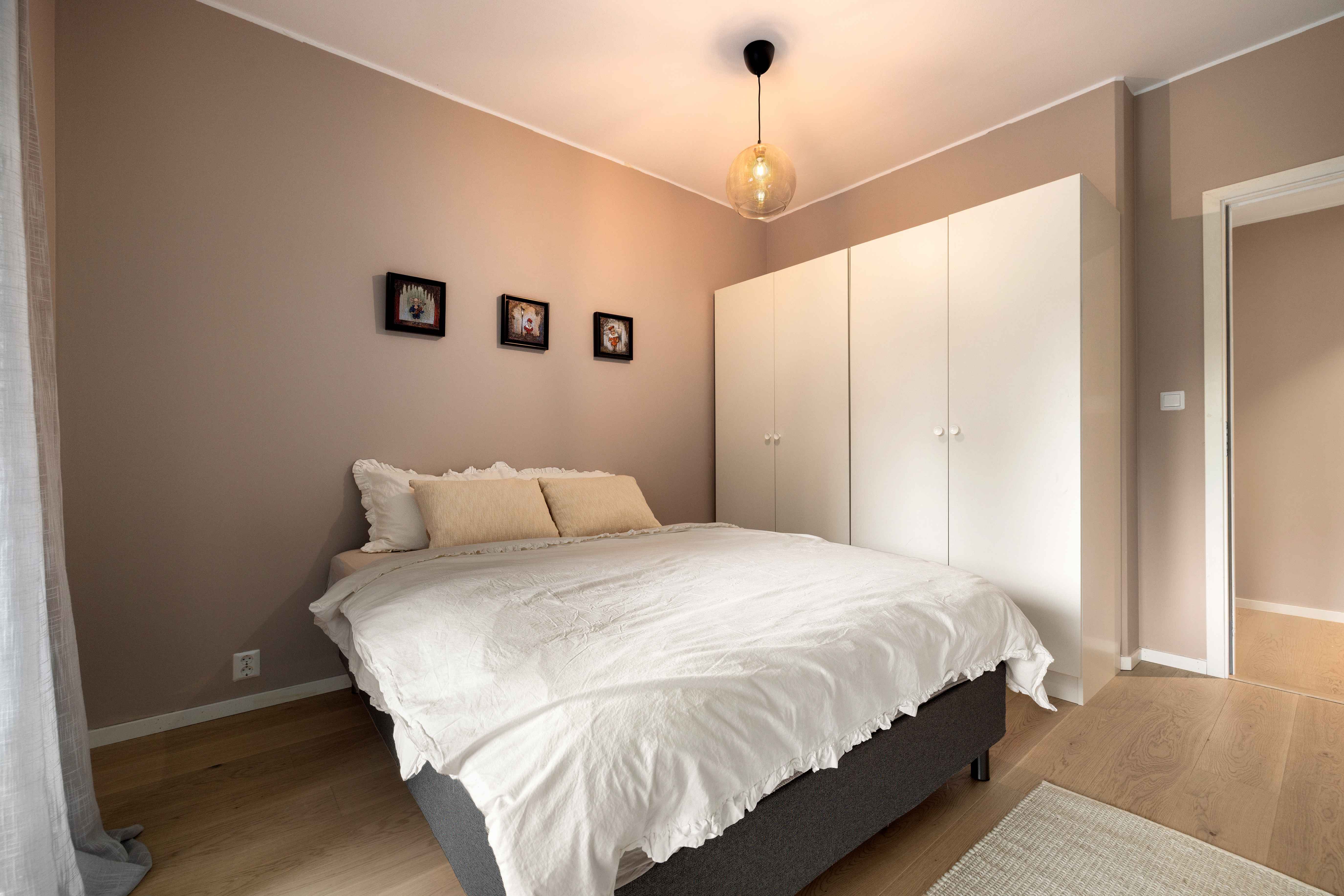 Entré/gang med skyvedørsgarderobe, helfliset bad, 3 soverom hvorav master-soverom med skyvedørsgarderobe og eget baderom, bod/vaskerom og stue/spisestue med åpen kjøkkenløsning.