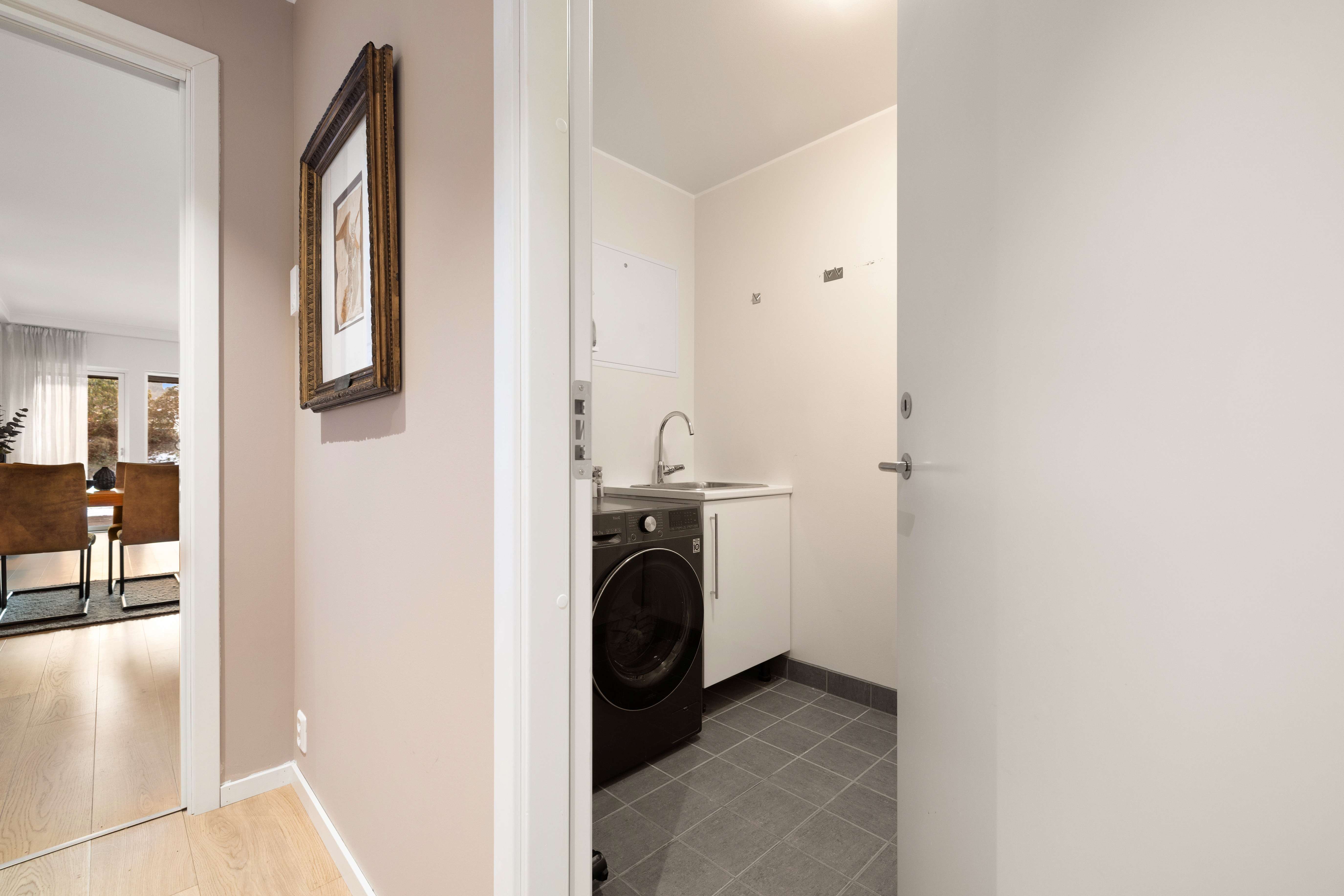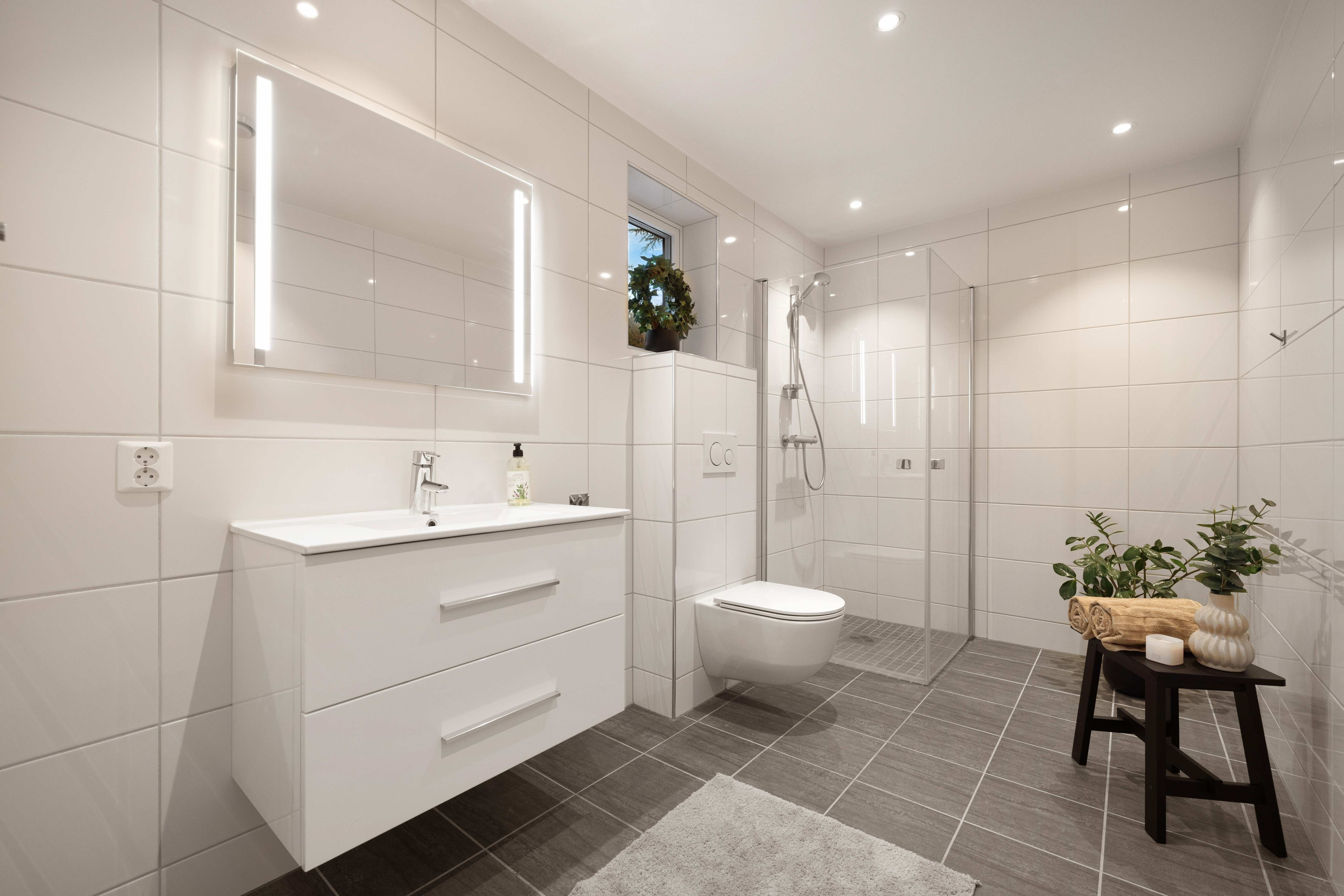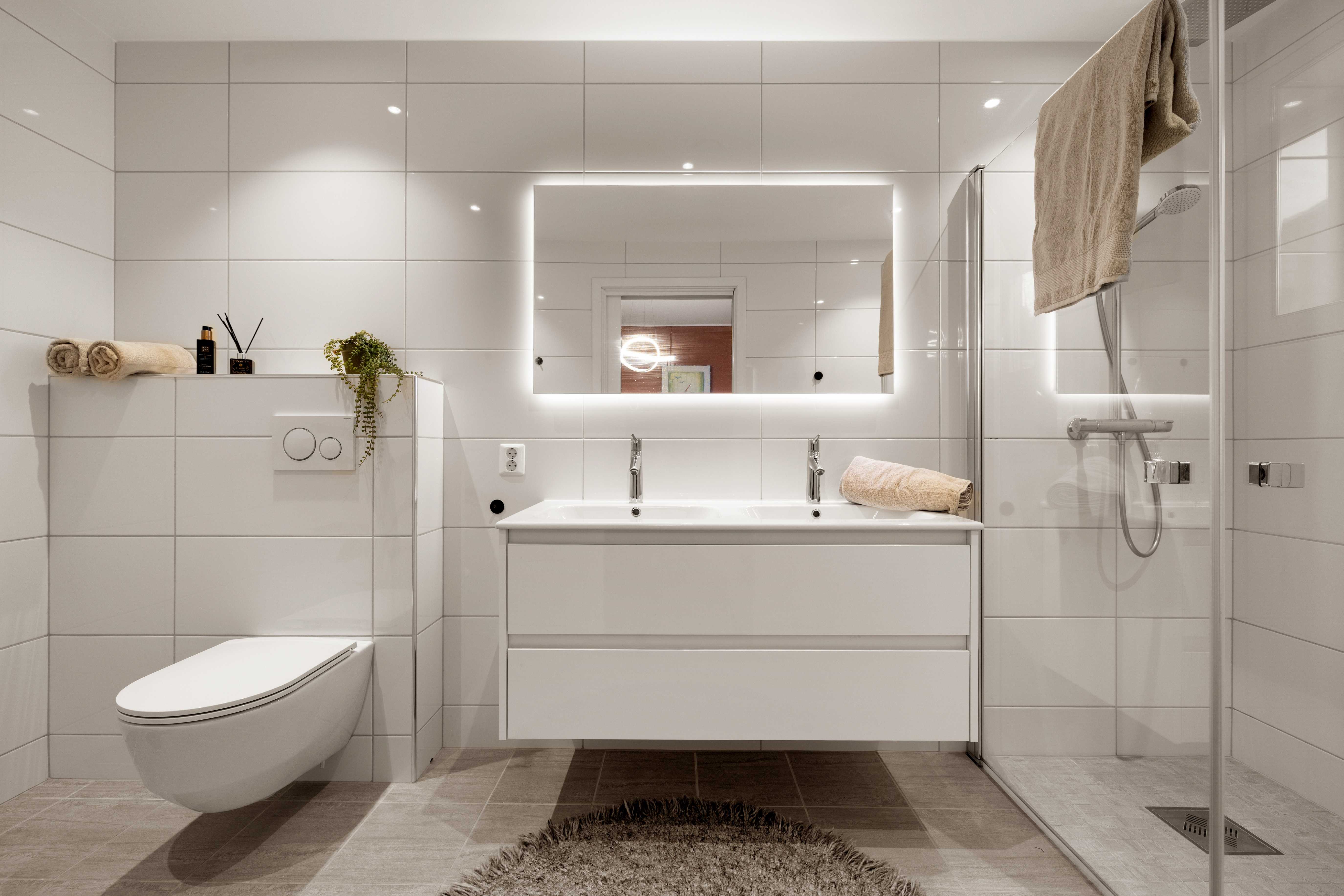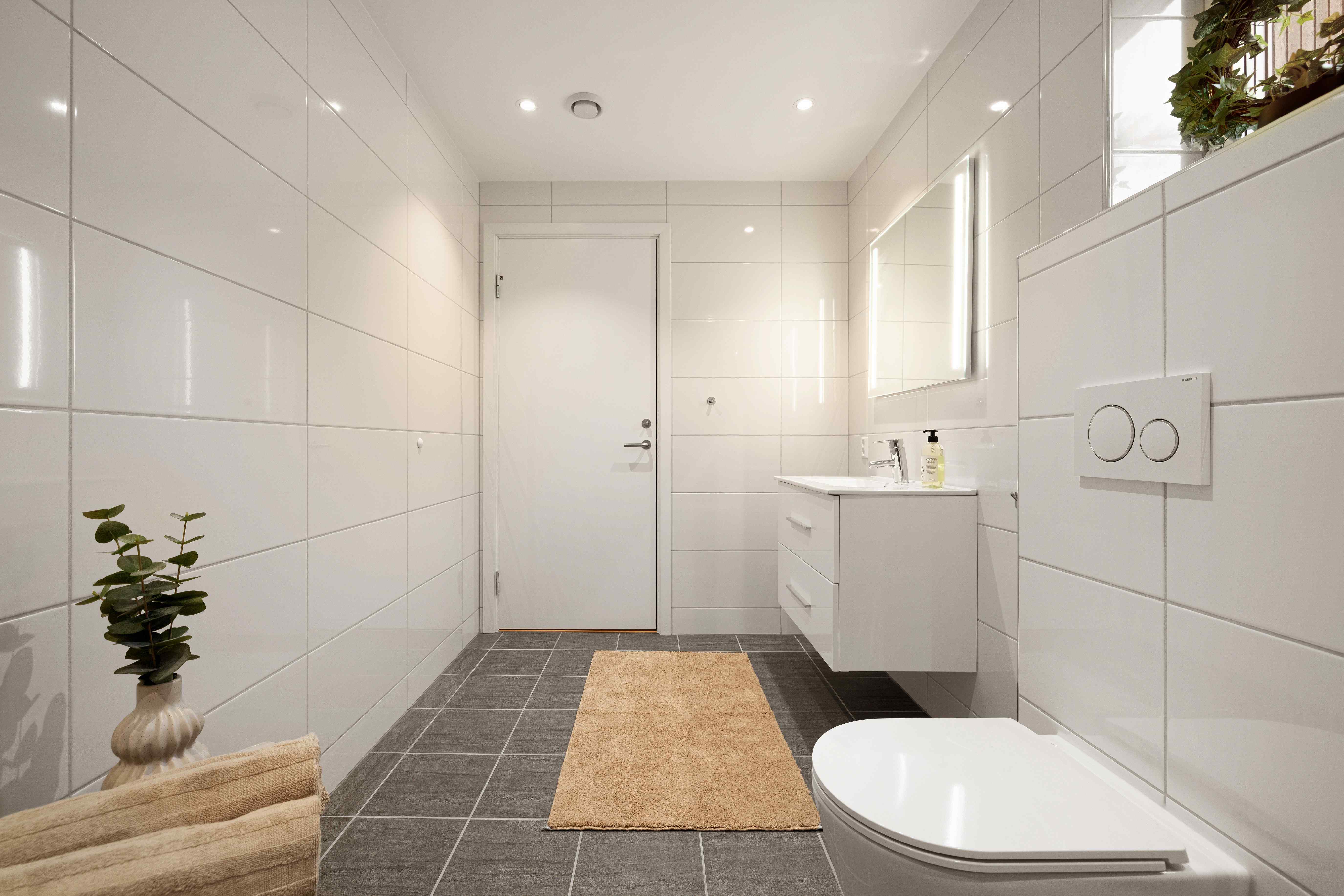 Leilighetens andre baderom har et tidløst og harmonisk uttrykk. Badet er utstyrt med fliser fra Villeroy & Boch, dusj med innfellbare vegger, vegghengt toalett, stilren baderomsinnredning og behagelig gulvvarme. I tillegg er det ett separat vaskerom med flislagt gulv, utslagsvask og opplegg for vaskemaskin og tørketrommel - som bidrar til en praktisk og ryddig hverdag.