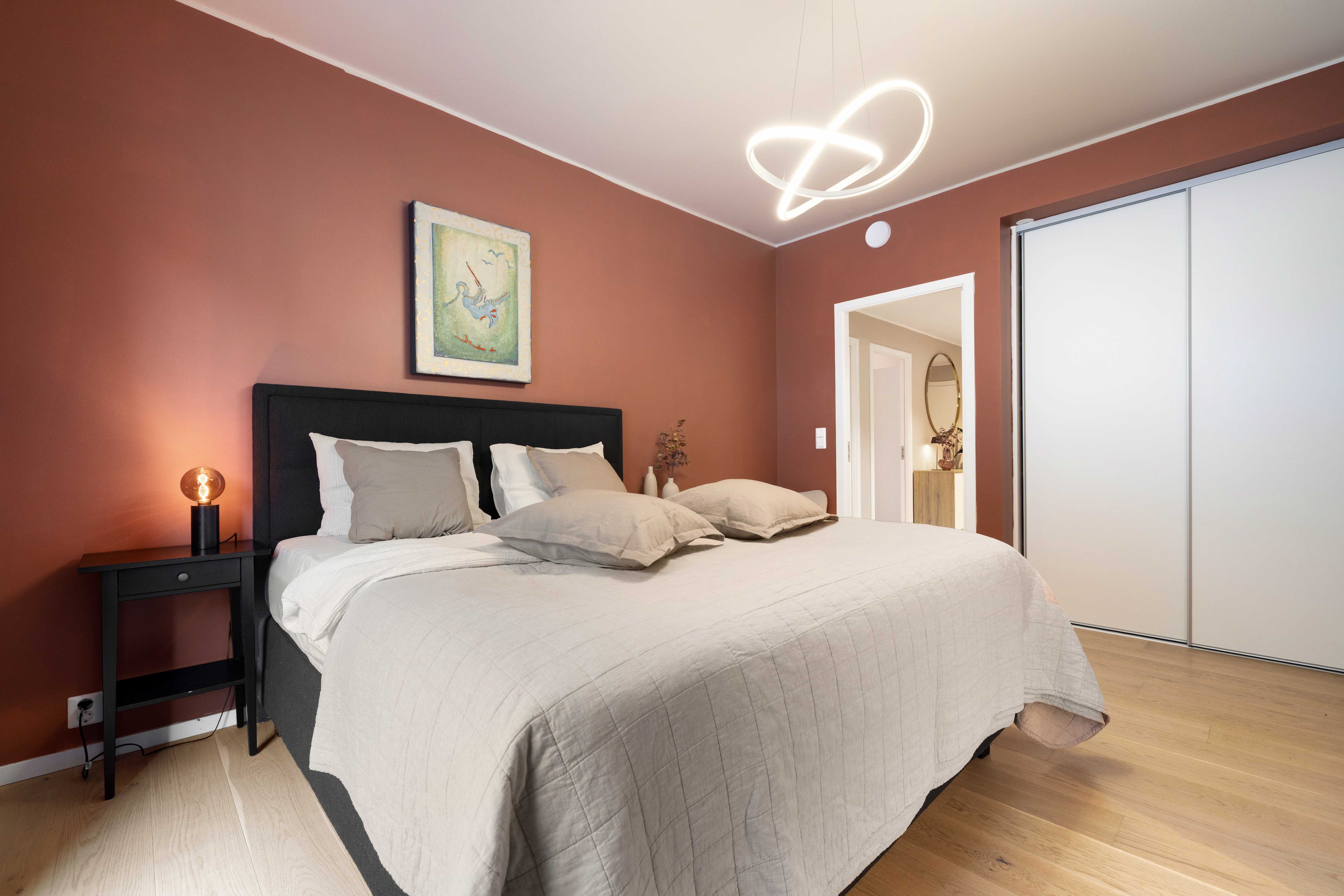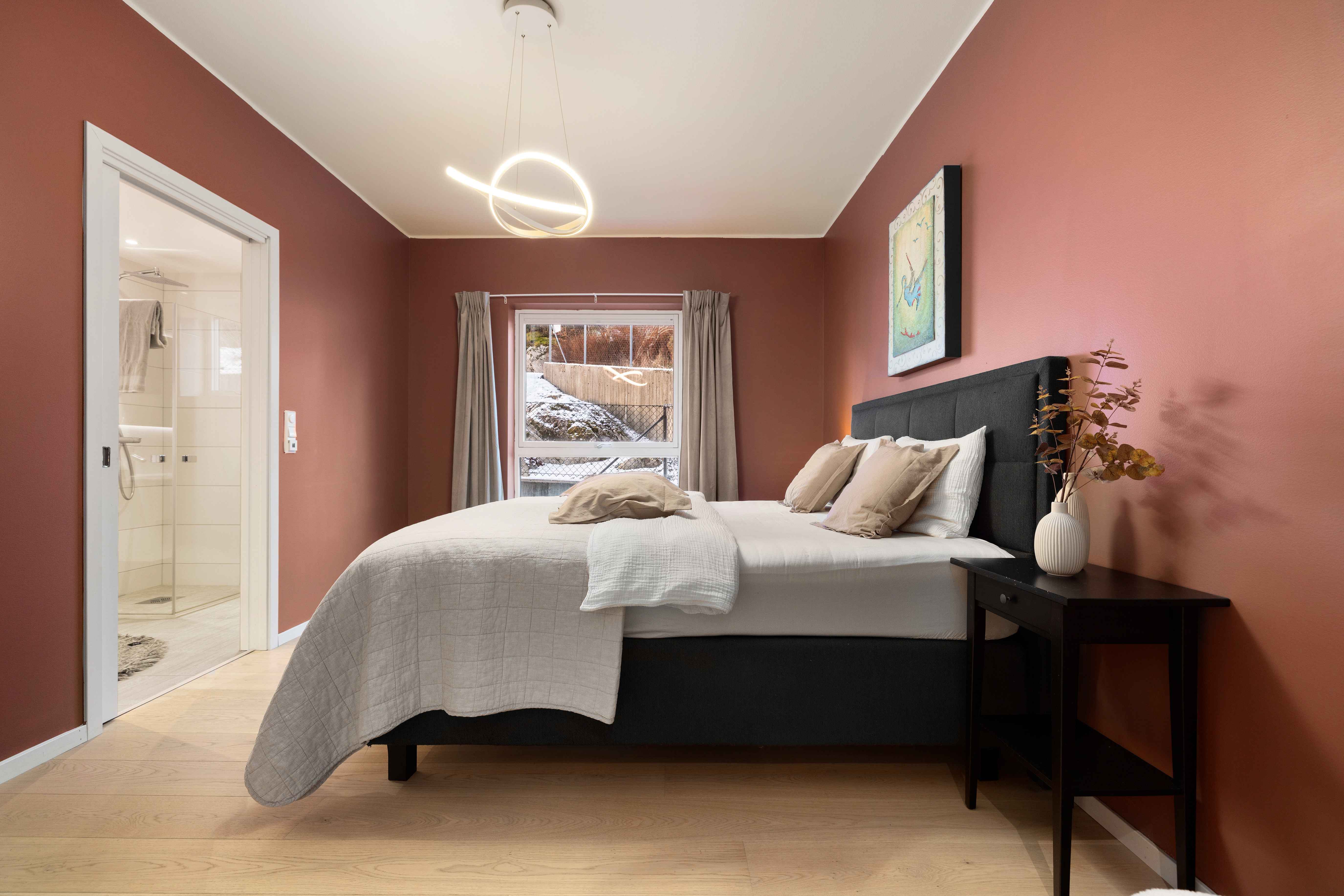 Master-soverom er tilbaketrukket i egen fløy, som en privat suite med eget baderom. Rommet har god plass til dobbeltseng og skyvedørsgarderobe til oppbevaring. Det tilhørende baderommet er helfliset med eksklusive fliser fra Villeroy & Boch og innredet med dusj med foldedører, vegghengt toalett, flott baderomsinnredning og termostatstyrte varmekabler.