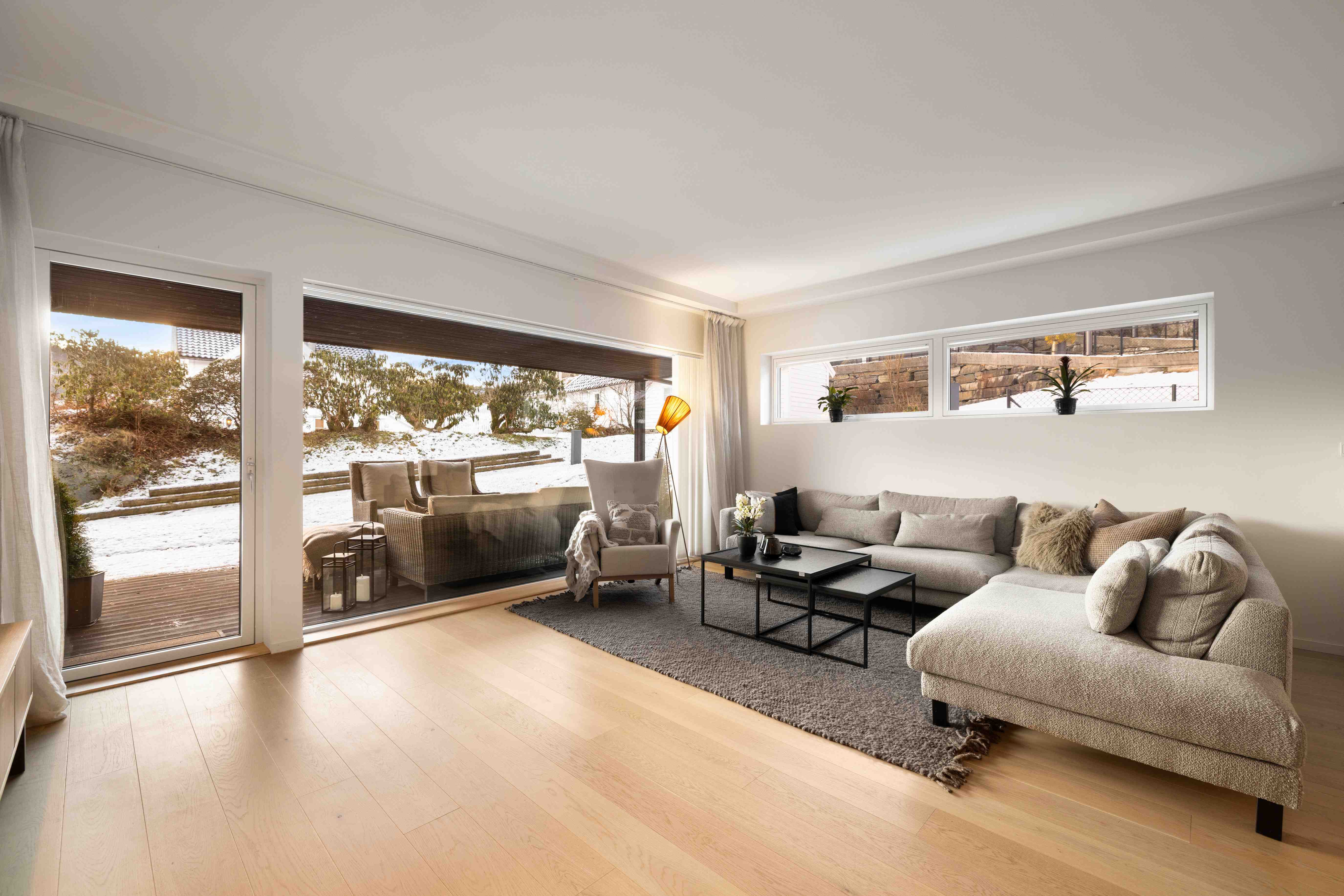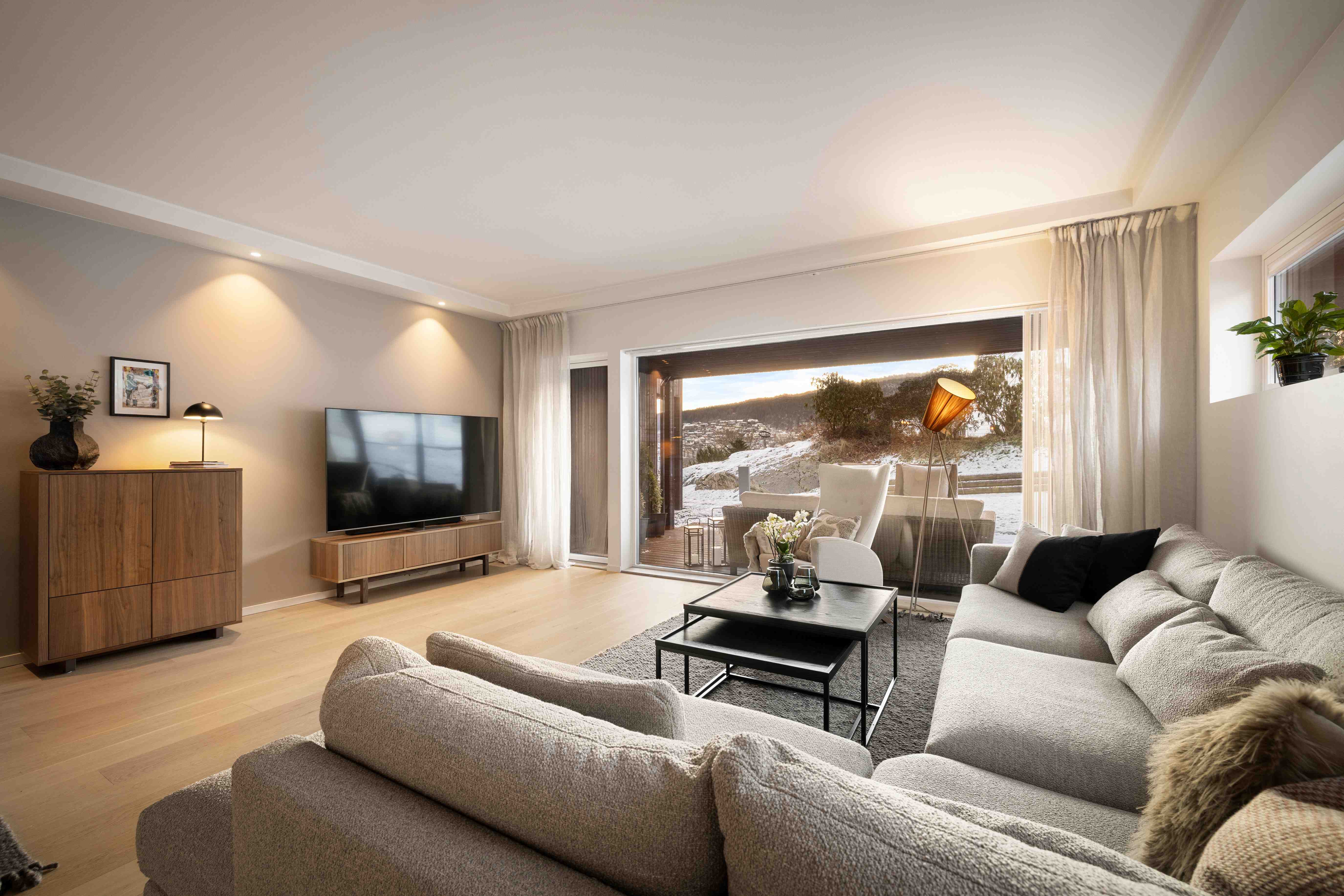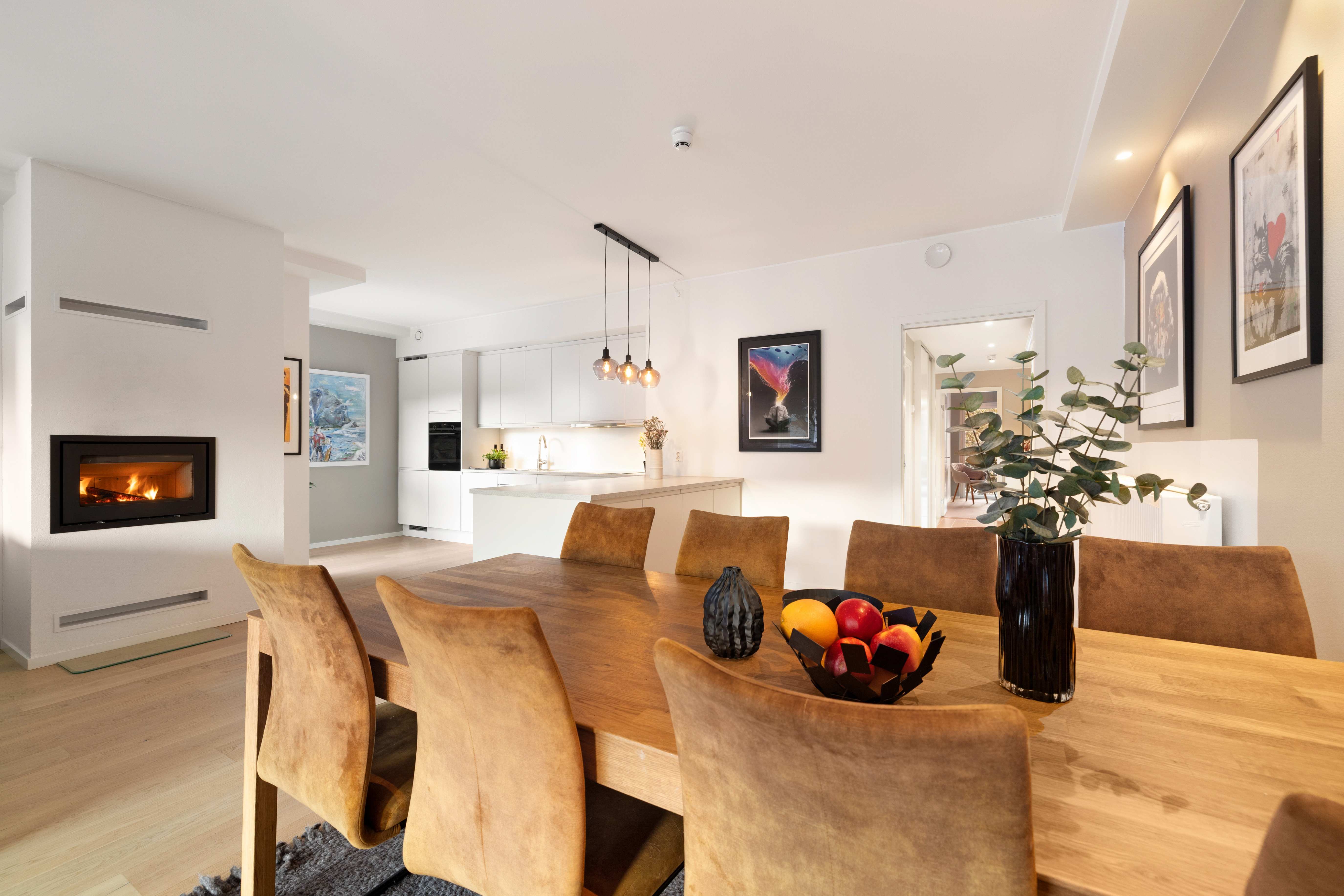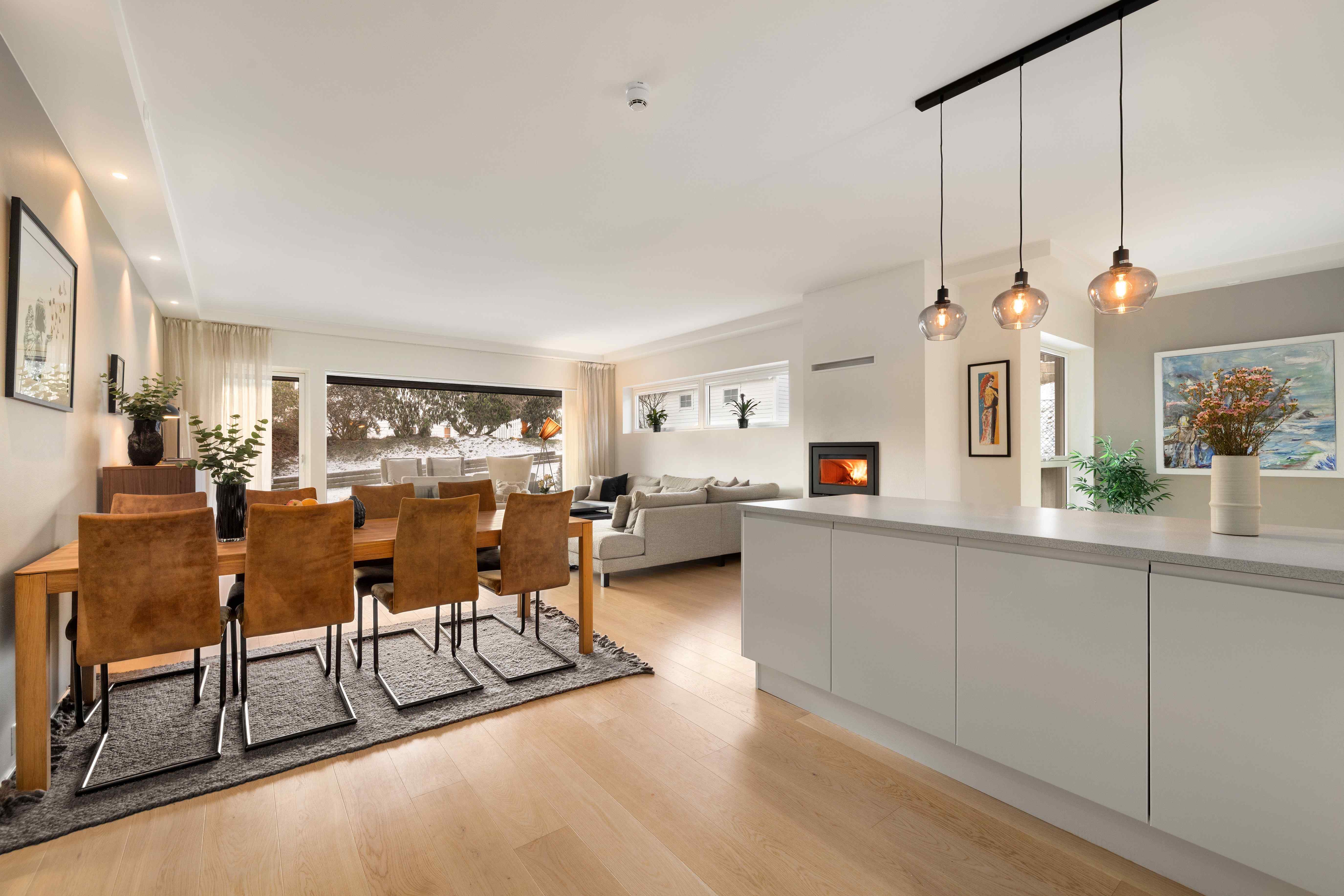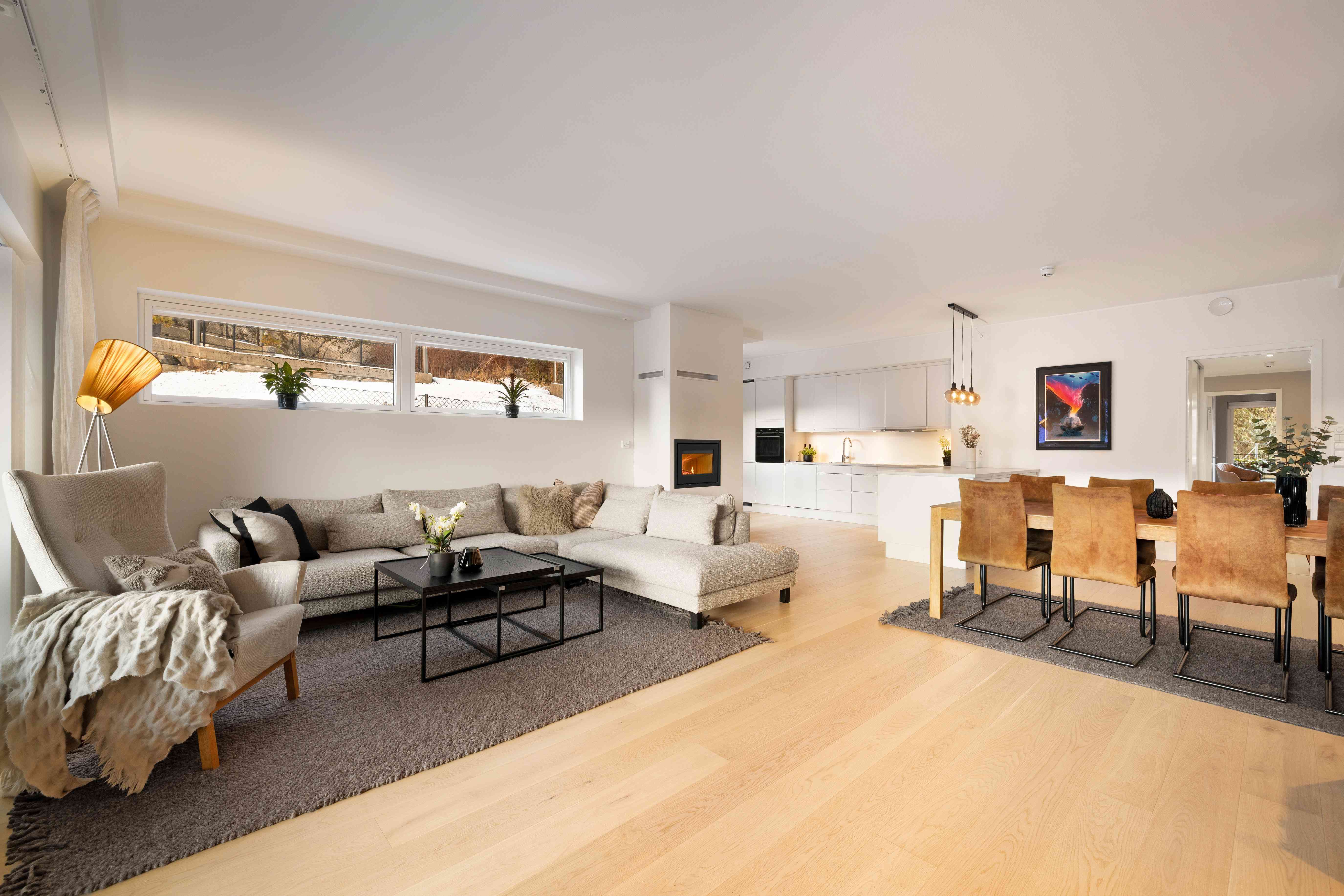 Stuen med åpen kjøkkenløsning fremstår som både romslig og meget innbydende, med en tydelig følelse av lys og luft. Store vindusflater fra gulv til tak gir et vakkert samspill mellom inne- og uterom og slipper omgivelsene helt inn. Den plassbygde peisovnen danner et elegant midtpunkt i rommet og tilfører både varme og stemning på kjøligere dager. Planløsningen gir rikelig plass til både komfortabel sofagruppe og et generøst spisebord. Fra stuen er det direkte utgang til en lun og delvis overbygget markterrasse på 27 m², rigget for avslappende ettermiddager og stemningsfulle kvelder.
