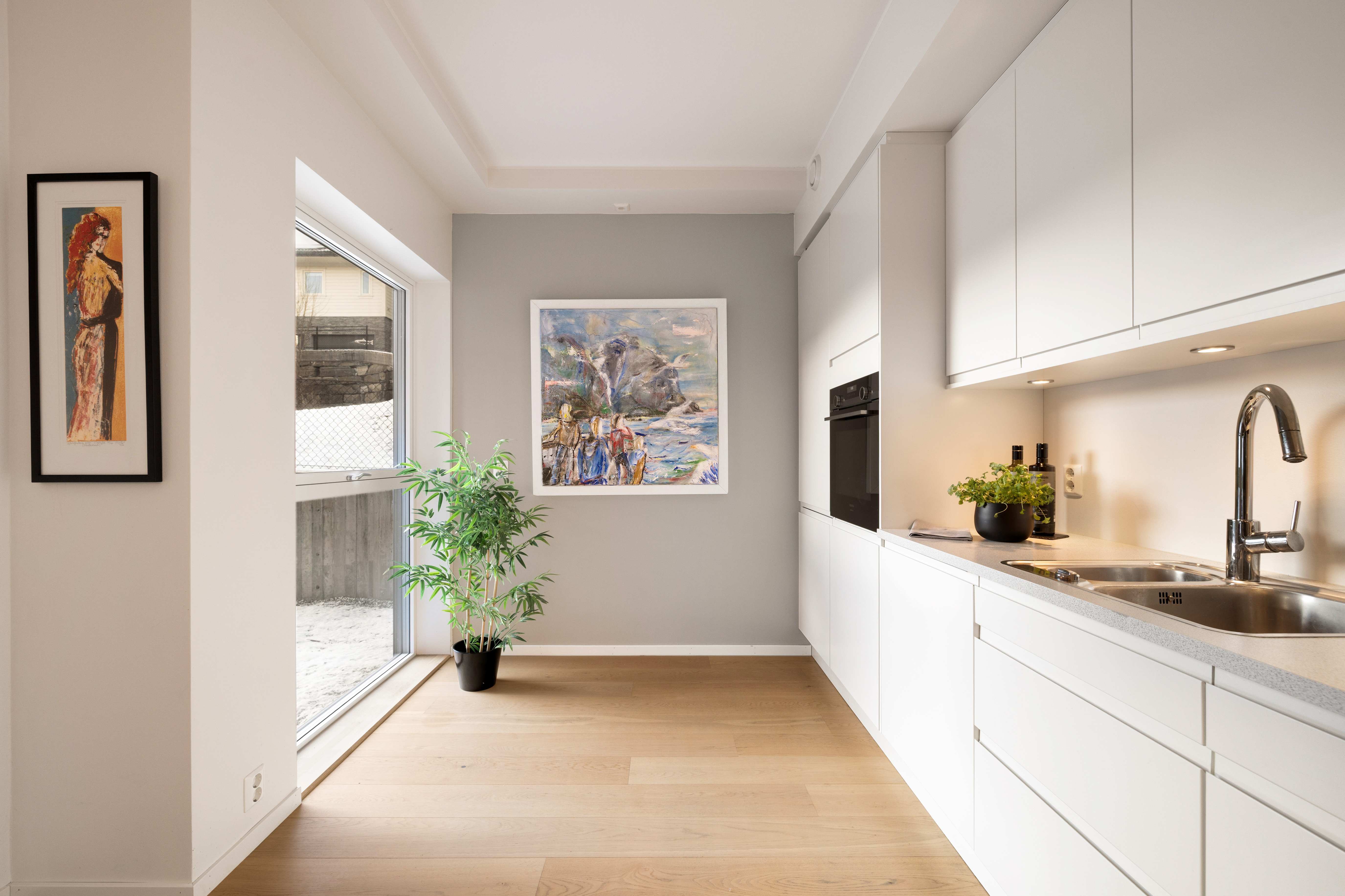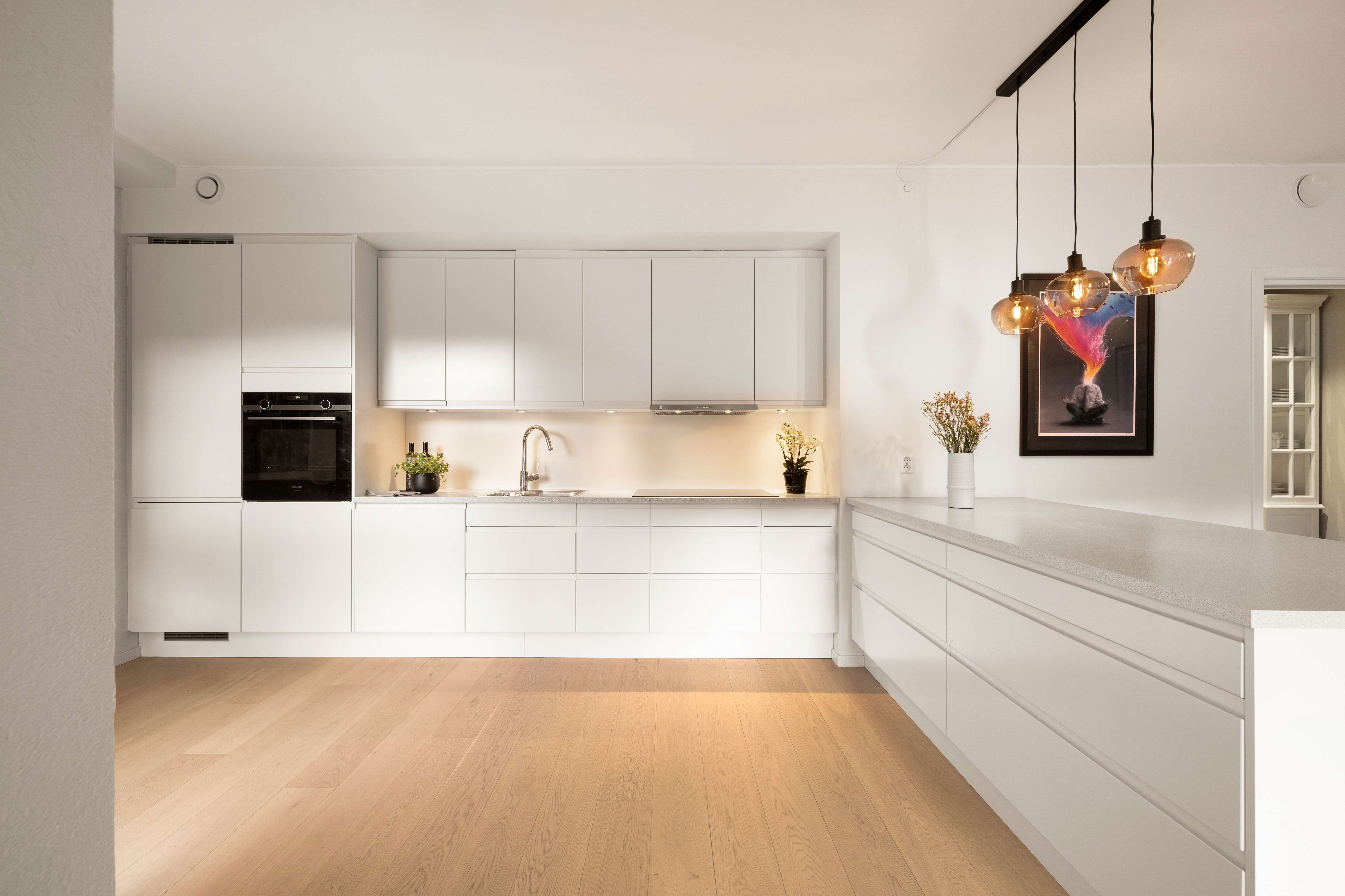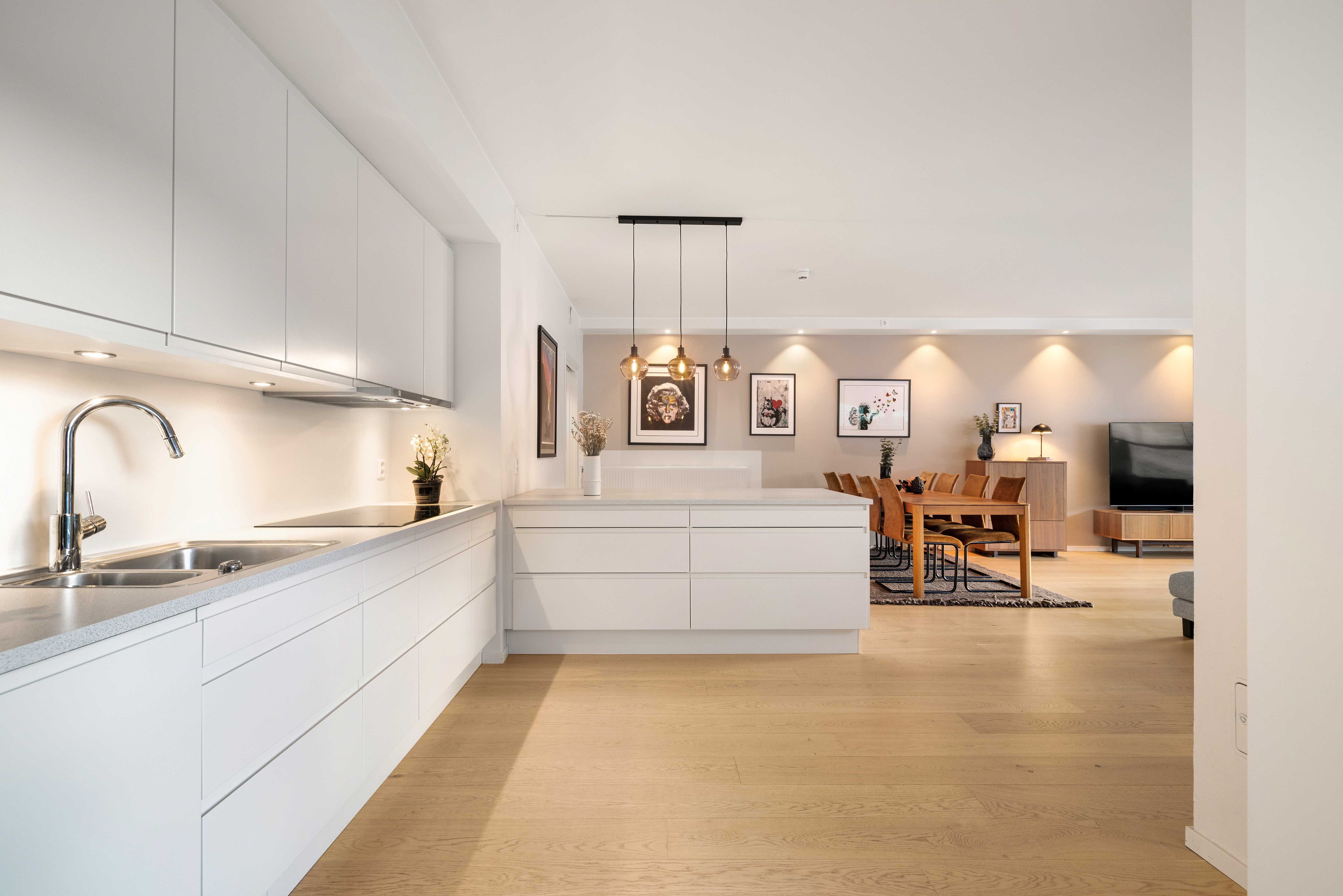 Det elegante kjøkkenet i hvit utførelse med glatte fronter og integrerte hvitevarer er levert av Sigdal. Gode arbeidsflater og rikelig med oppbevaring gjør kjøkkenet både funksjonelt og visuelt tiltalende. Kjøkkenøyen skaper også et naturlig skille og legger til rette for sosial matlaging og uformelle sammenkomster.