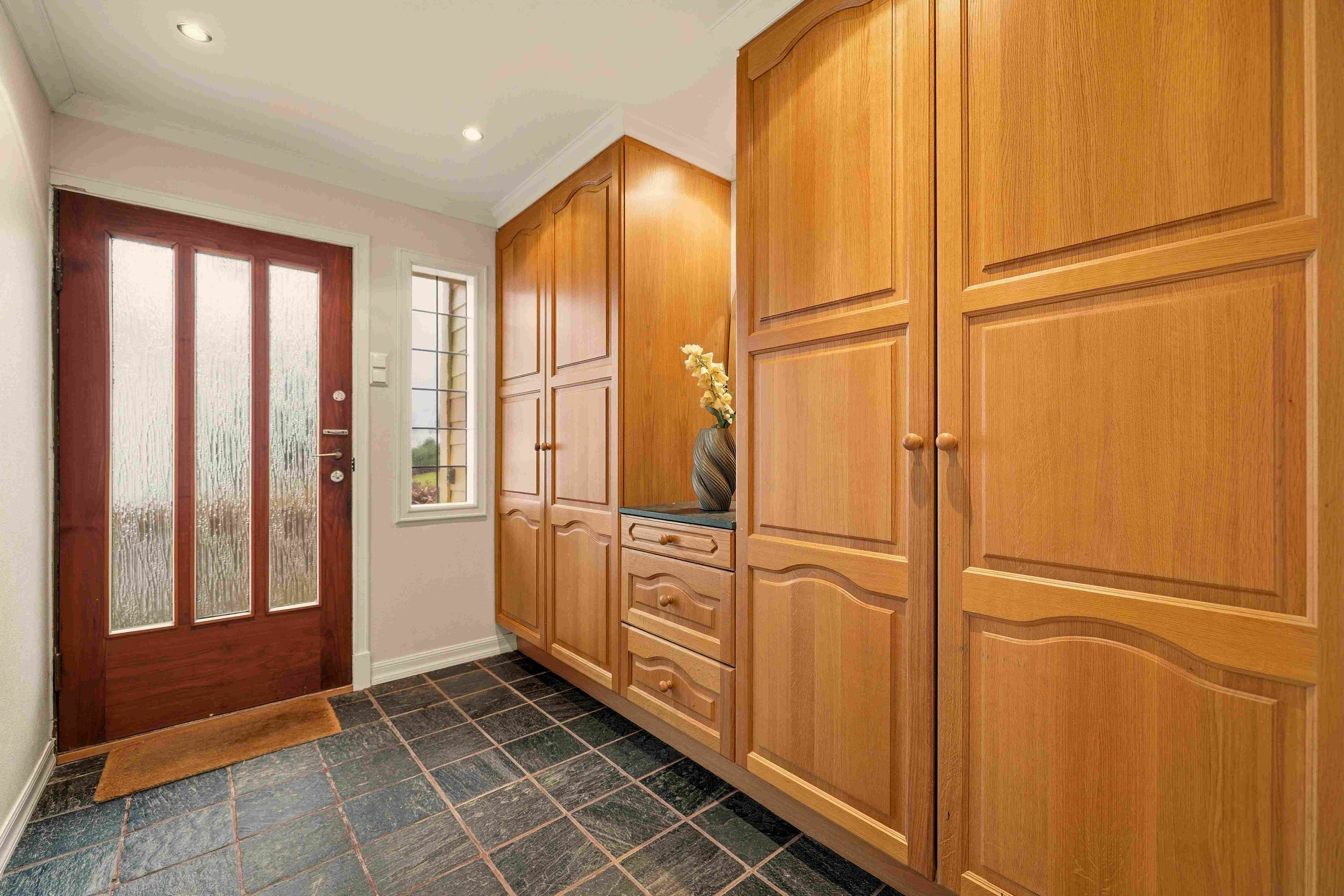 Innvendig møtes du av et romslig inngangsparti med plassbygget innredning som gir rikelig garderobeplass. Her er det også etablert en egen sone for vaskemaskin og tørketrommel. Videre finner du en lys og romslig stue på 25,8 m² med peis, store vindusflater og utgang til terrassen. Stuen har en fin og delvis åpen løsning mot spisestuen på 16,3 m², hvor det er god plass til et stort spisebord. Ved behov kan spisebordet enkelt trekkes nærmere dagligstuen. Fra spisestuen er det også fin utsikt som kan nytes fra spiseplassen. Det er installert Toshiba varmepumpe i spisestuen.