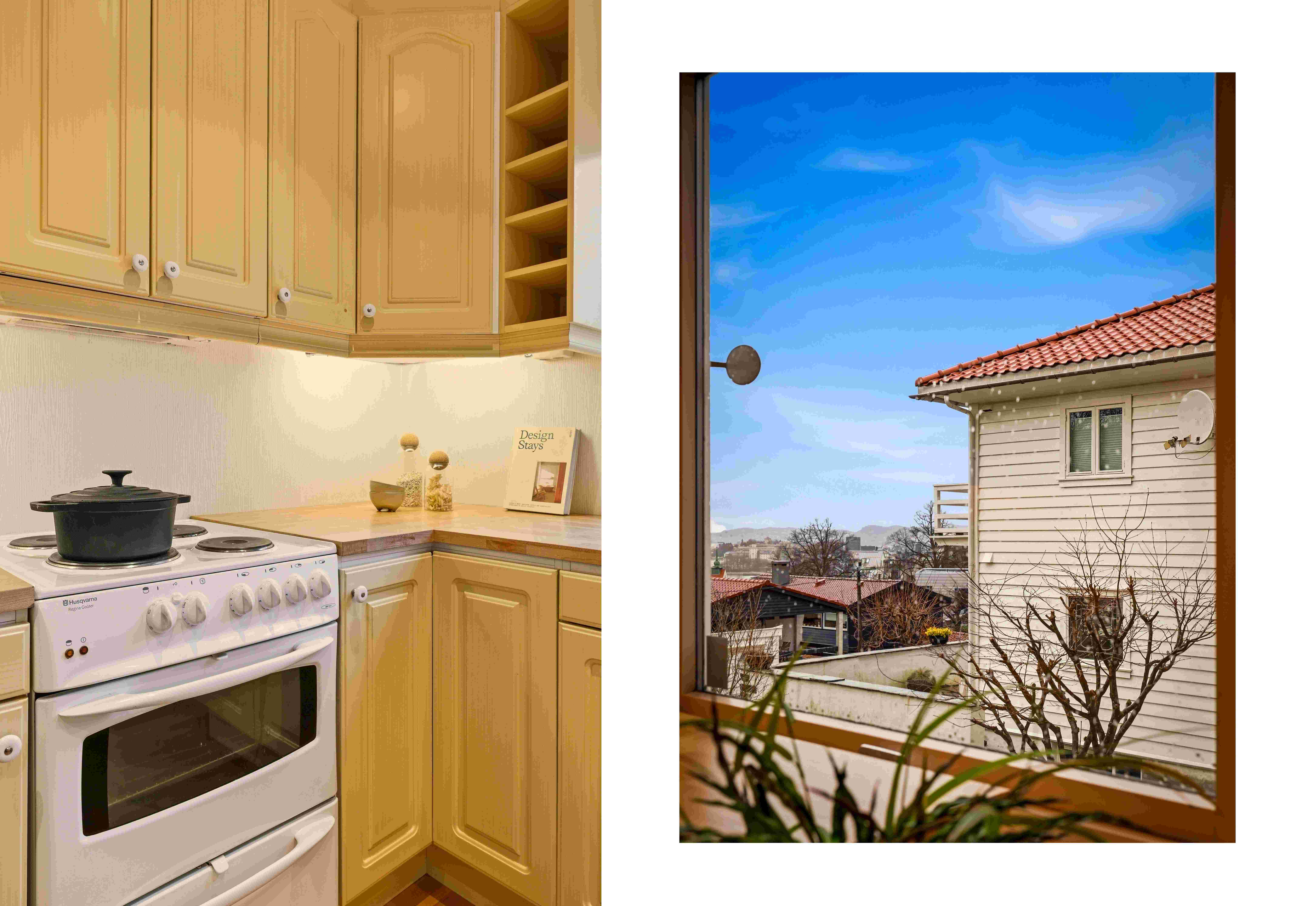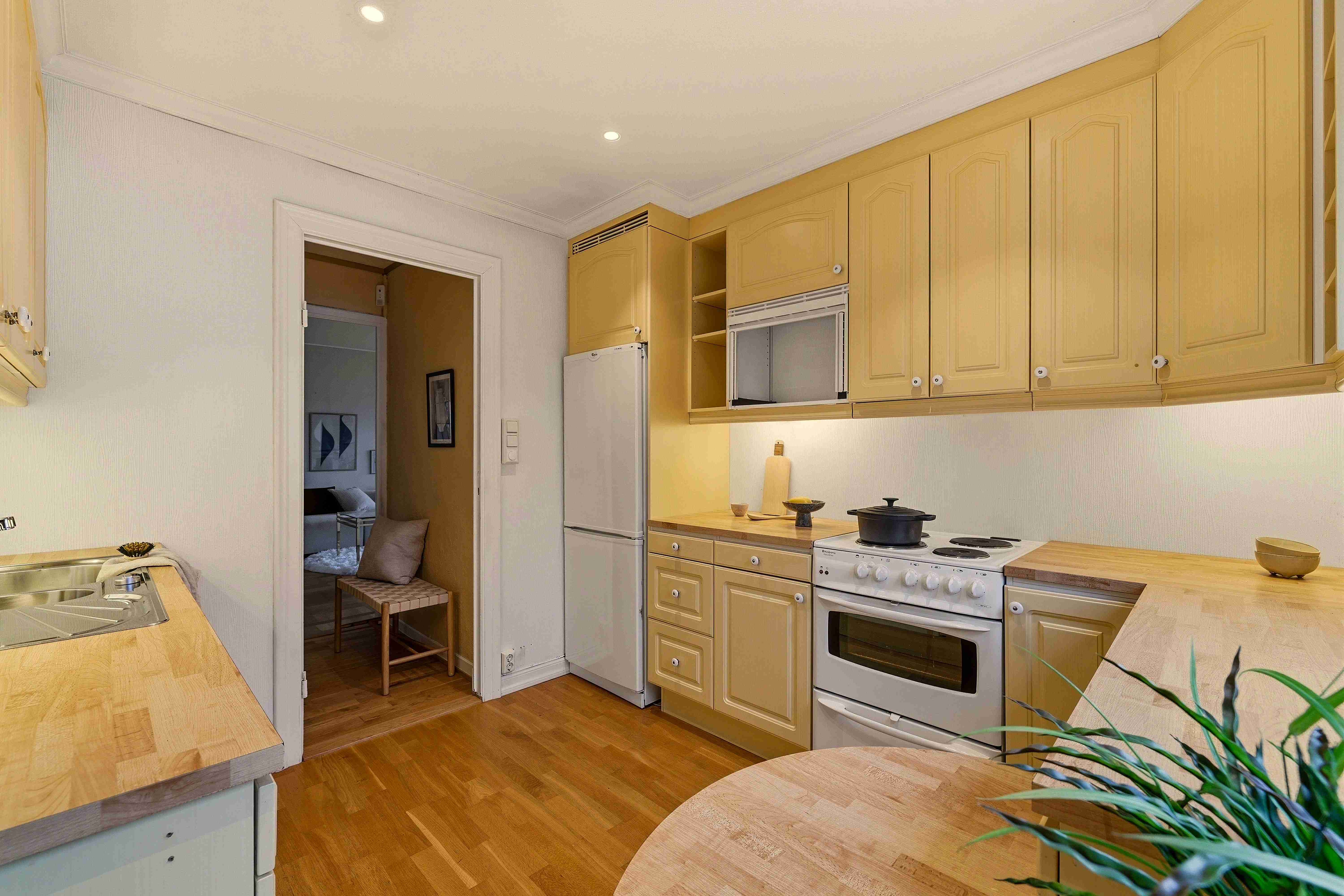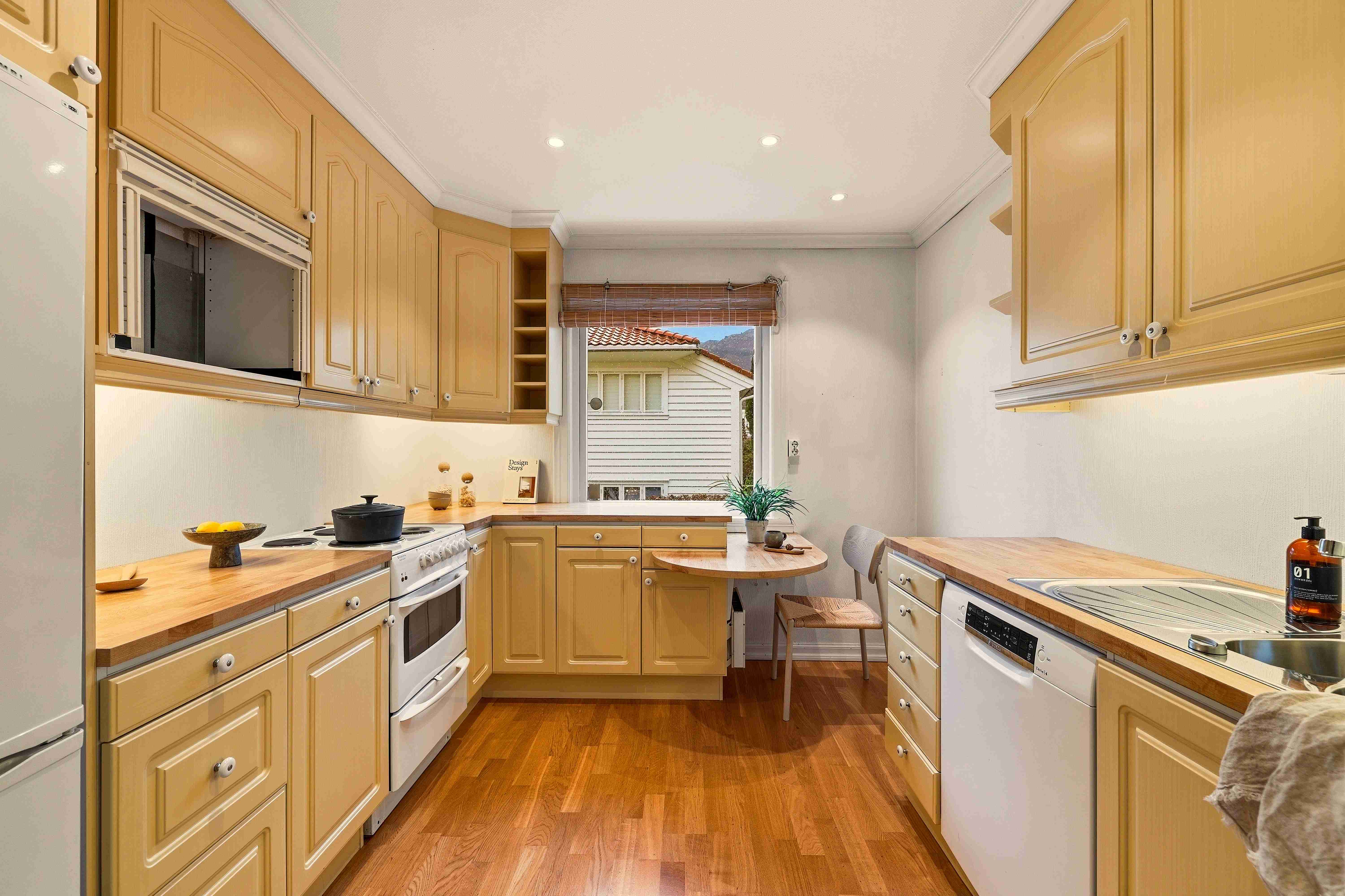 Kjøkkenet har en praktisk utforming med innredning fra 1997 og gode arbeidsflater samt rikelig med skapplass. Ved kjøkkenvinduet er det en liten bardiskløsning med sitteplass til én person.