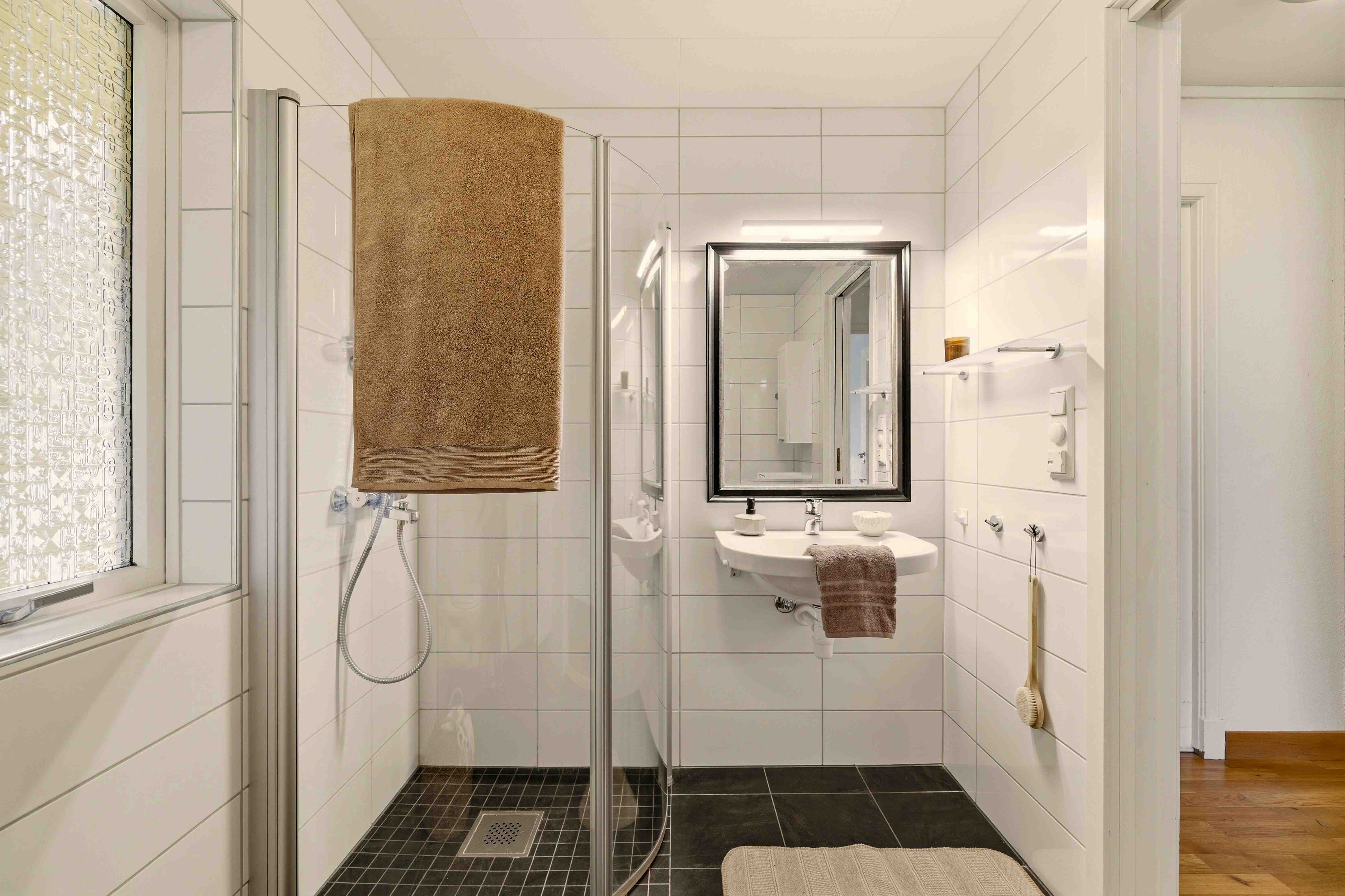 Baderommet ble oppusset i 2012 og har flislagte gulv og vegger, varmekabler og dusjløsning med innfellbare dusjvegger.