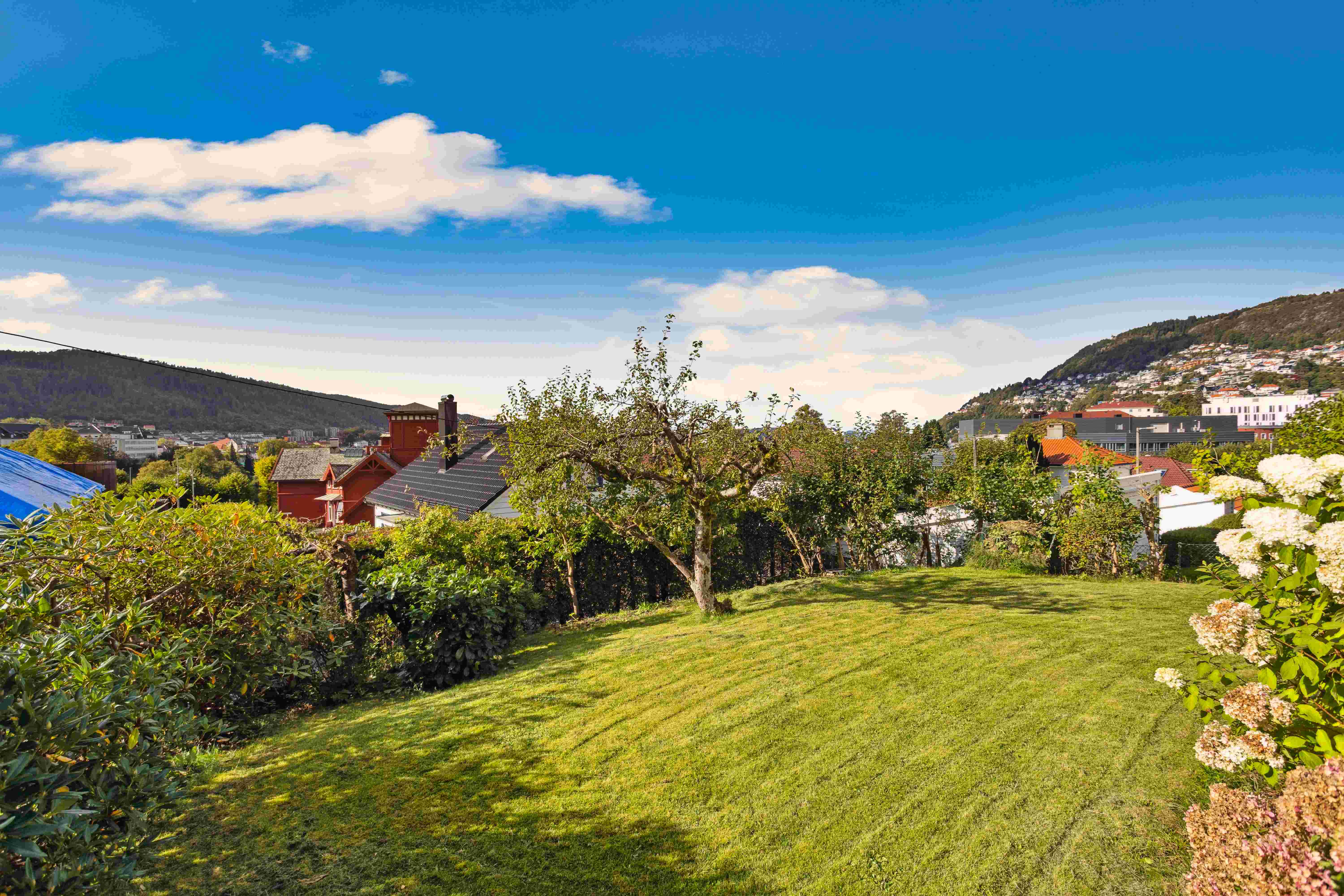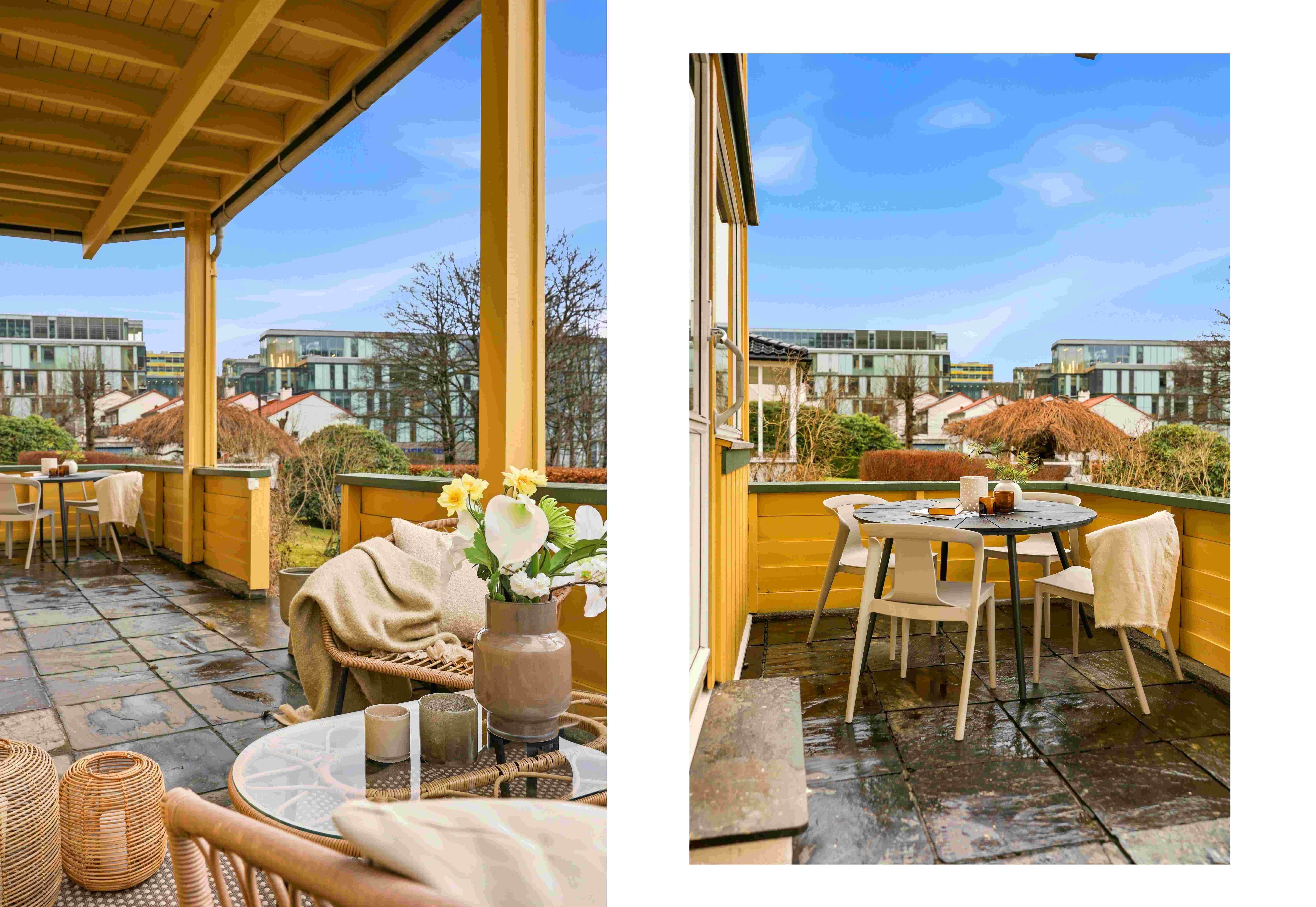 Med et bruksareal på hele 110 m² fordelt på ett plan, får du en praktisk og funksjonell planløsning. Fra stuen er det direkte utgang til en solvendt terrasse på ca. 18 m² med overbygg. Terrassen har gode solforhold og en fin utsikt, og gir en naturlig overgang til den pent opparbeidede hagen. Hagen er delt inn slik at de to boenhetene i stor grad disponerer hver sin sone, noe som gir gode muligheter for privat uteplass.