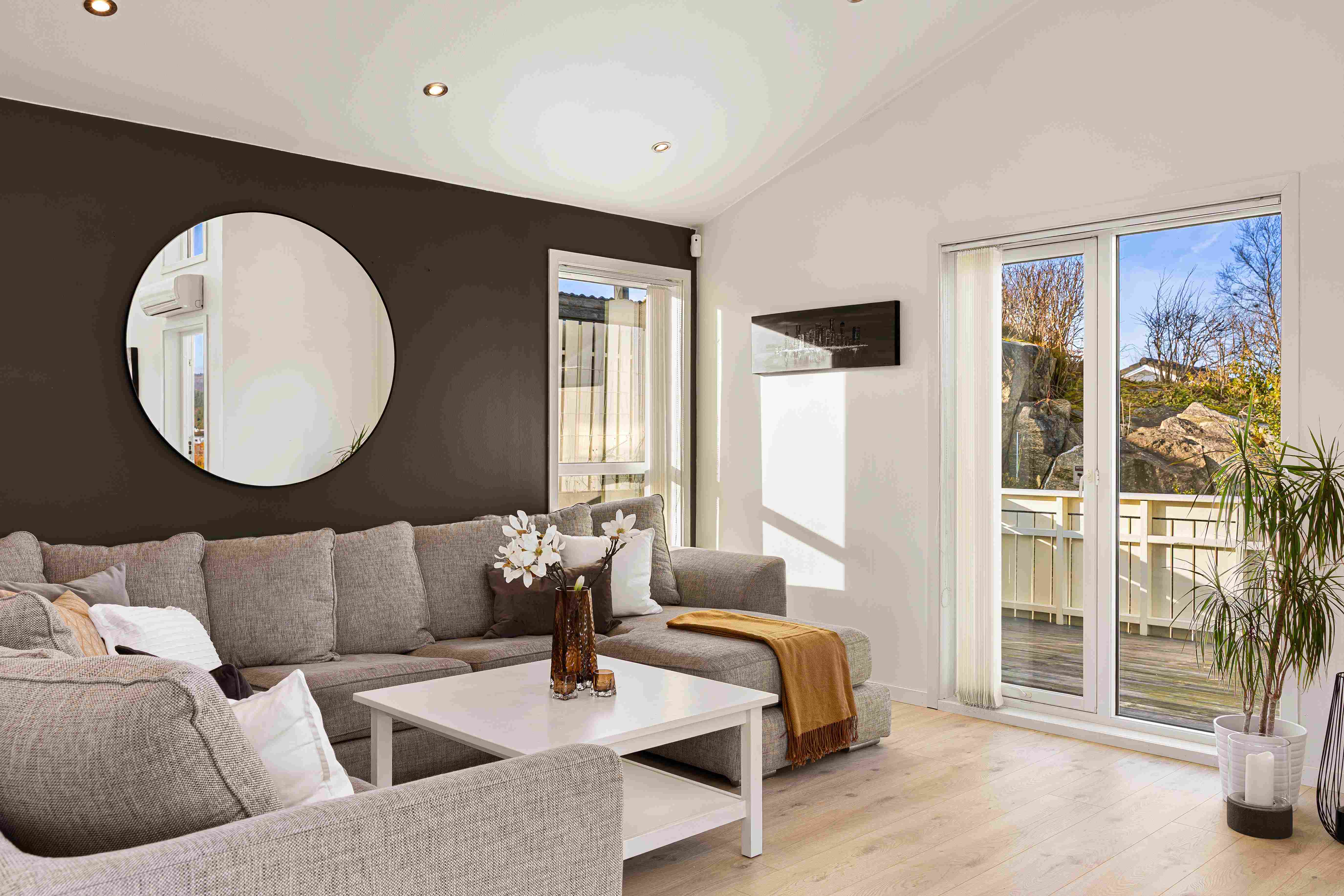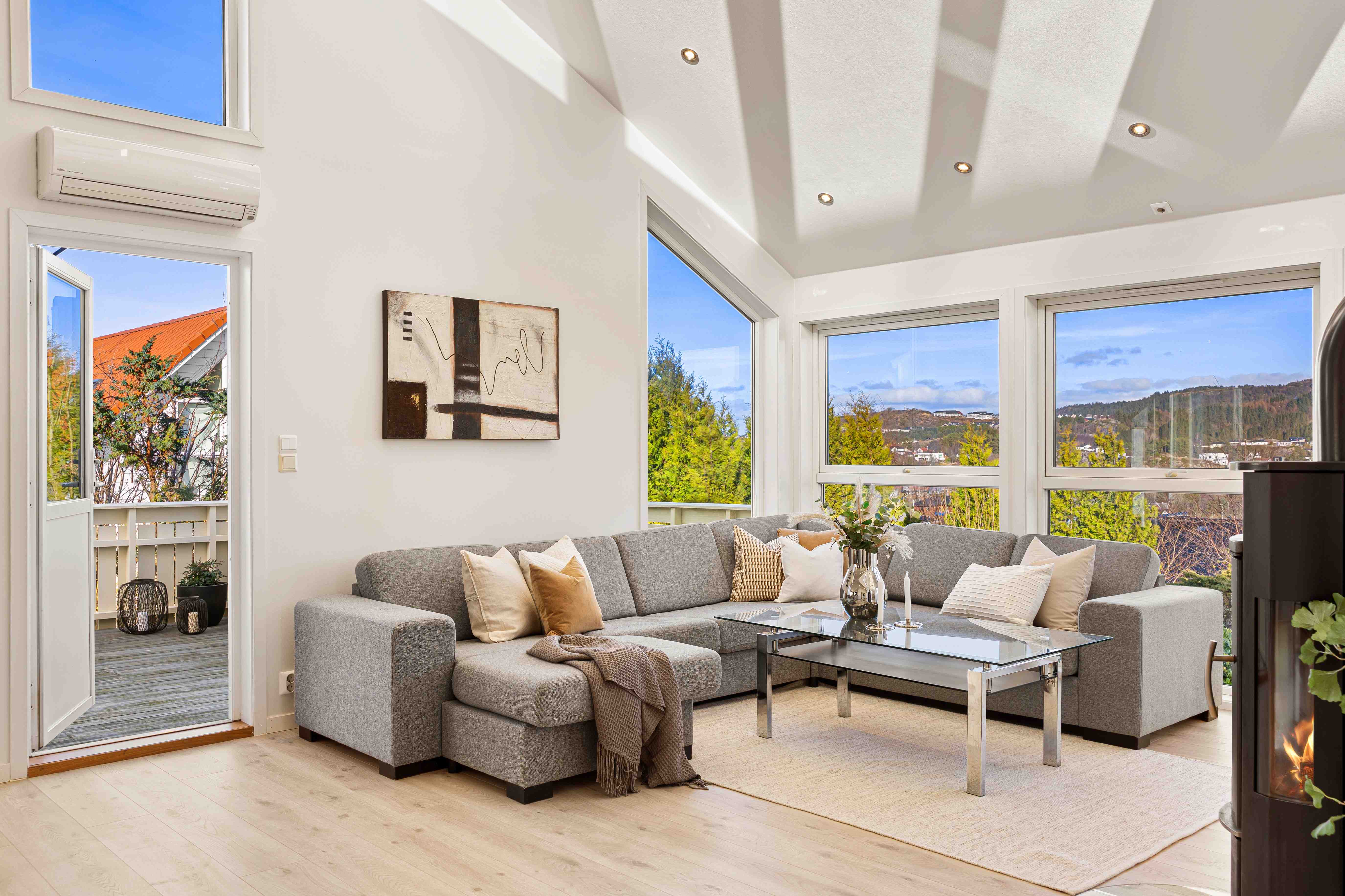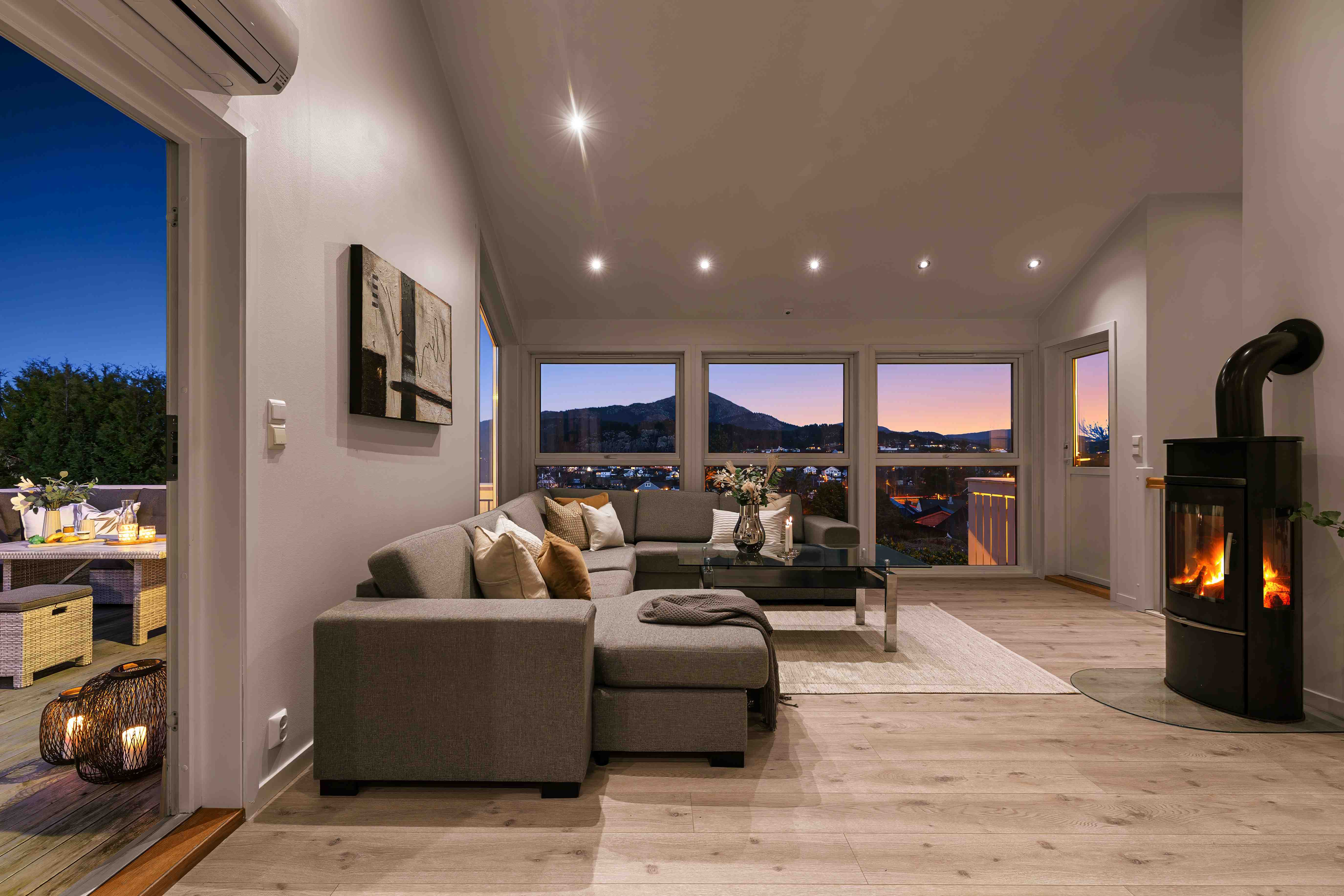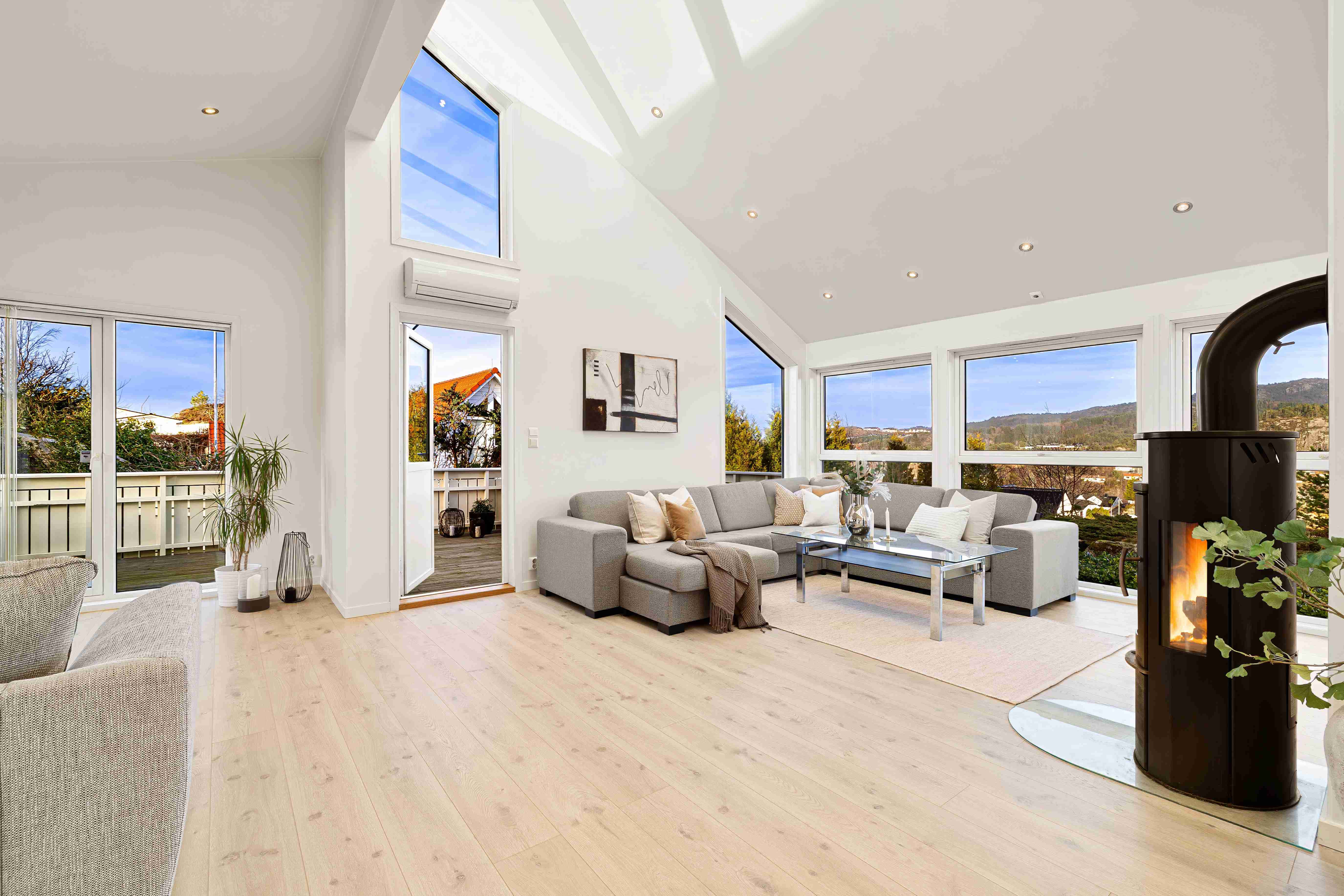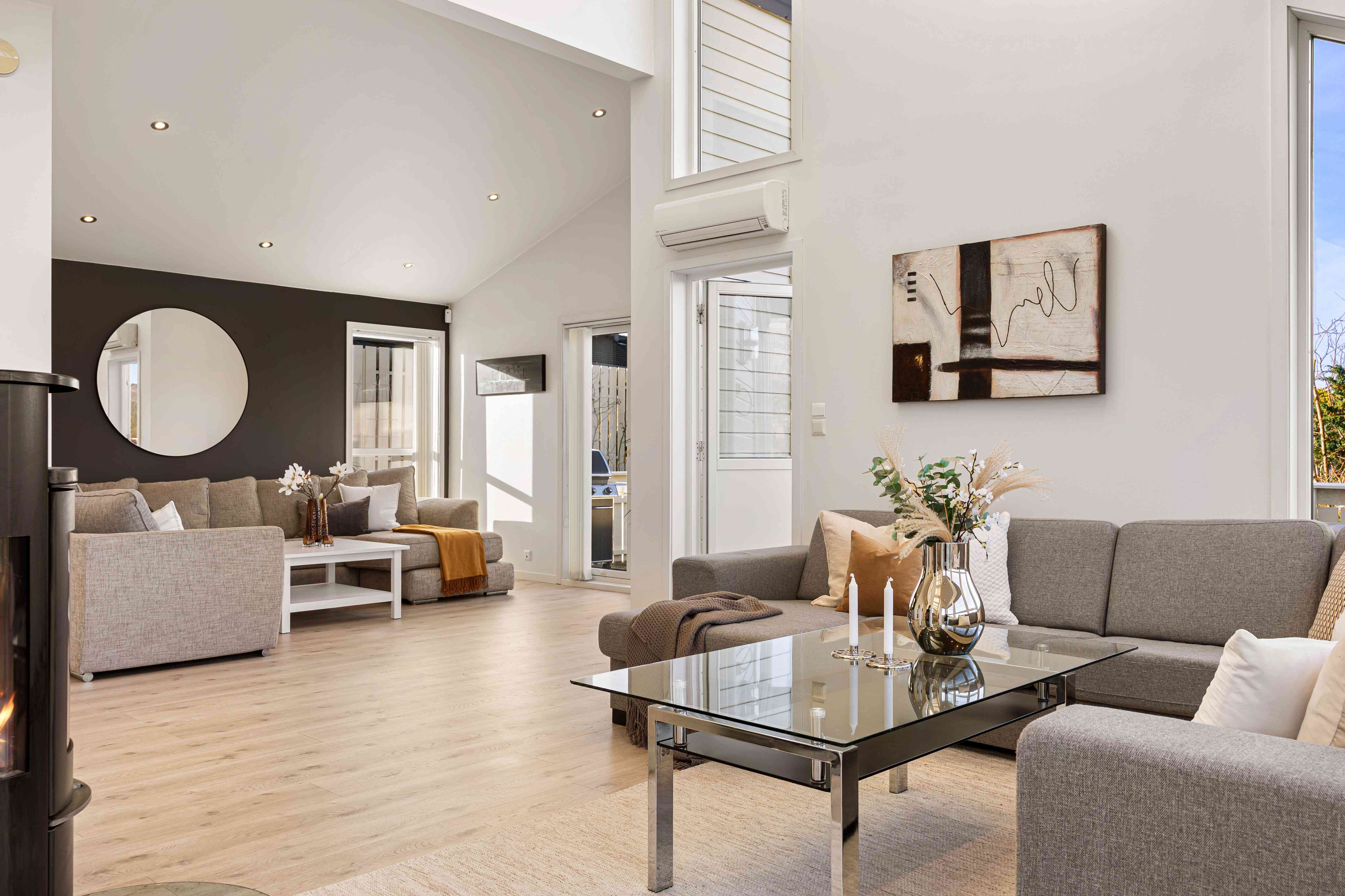 Fra stuen er det utgang til to terrasser med samlet areal på 61 m²