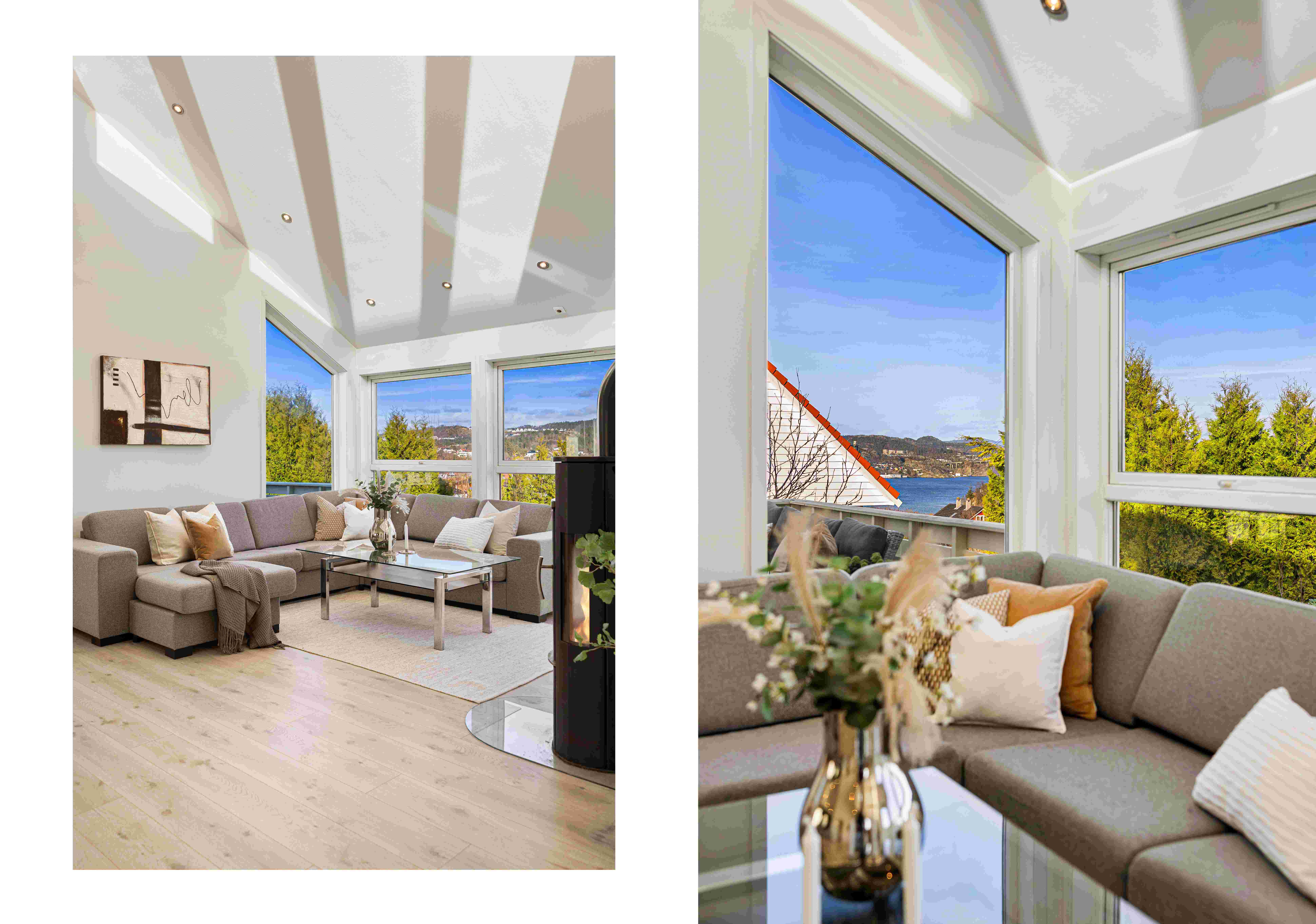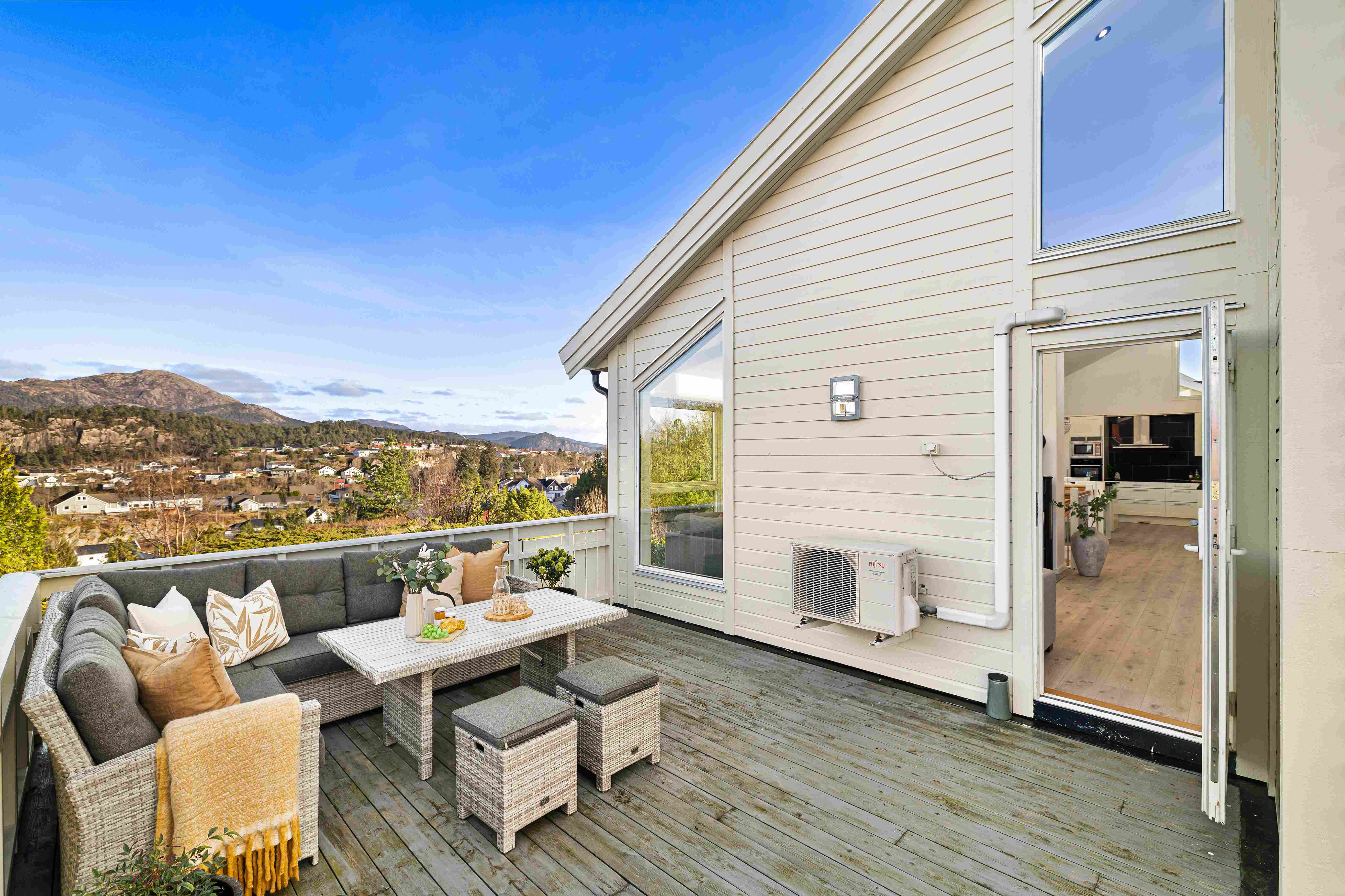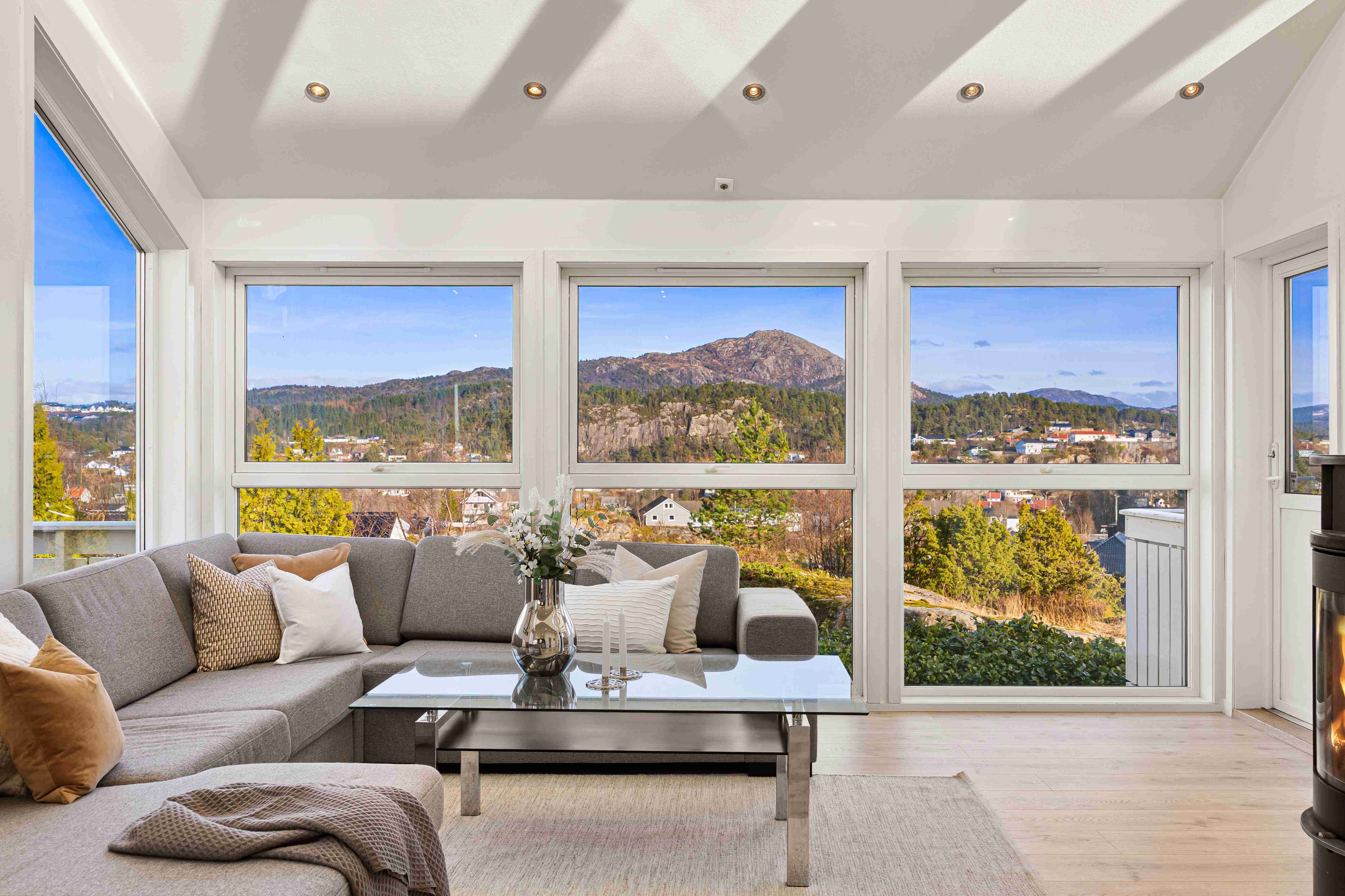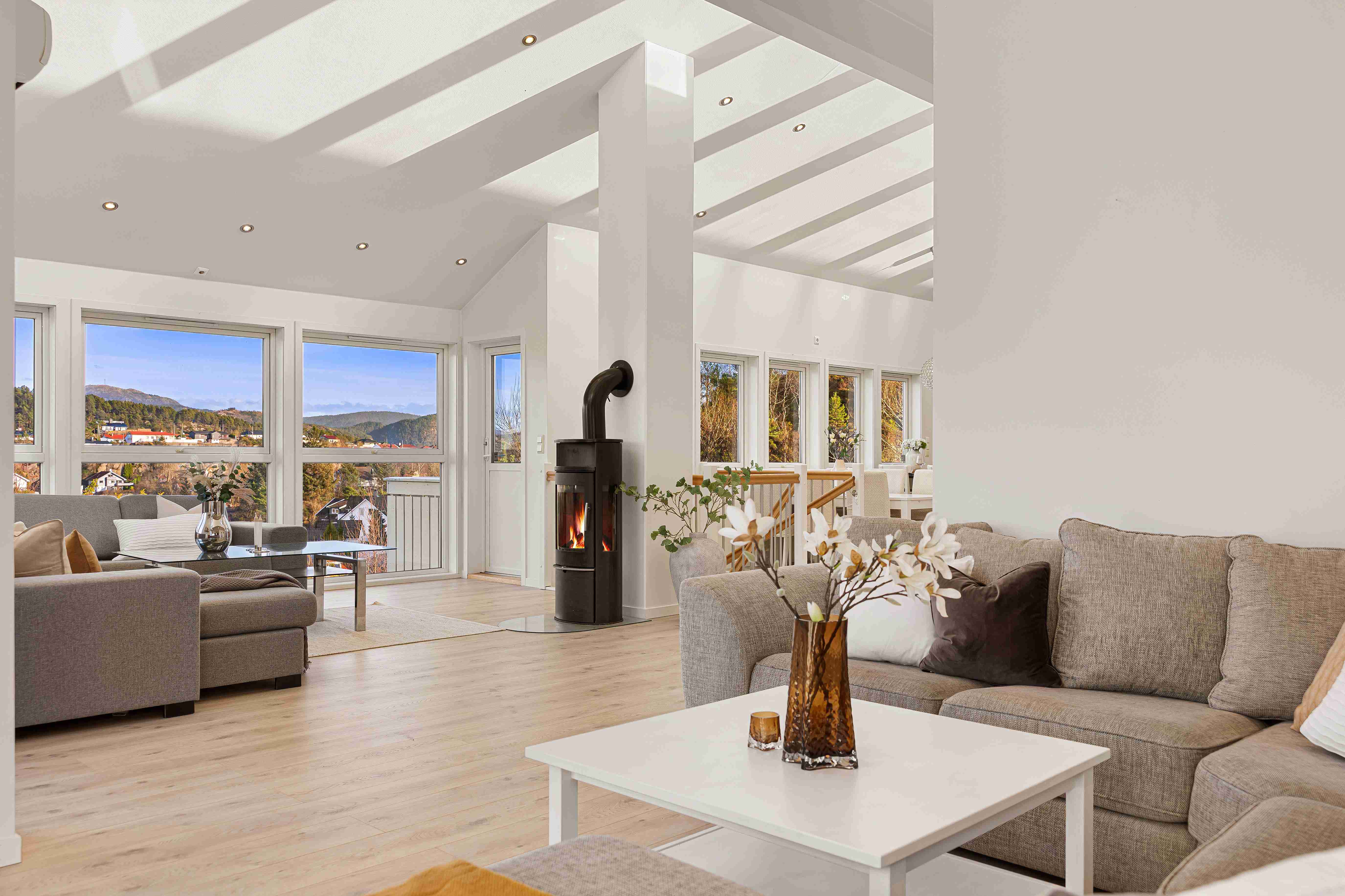 Fra stuen er det utgang til to terrasser med samlet areal på 61 m²