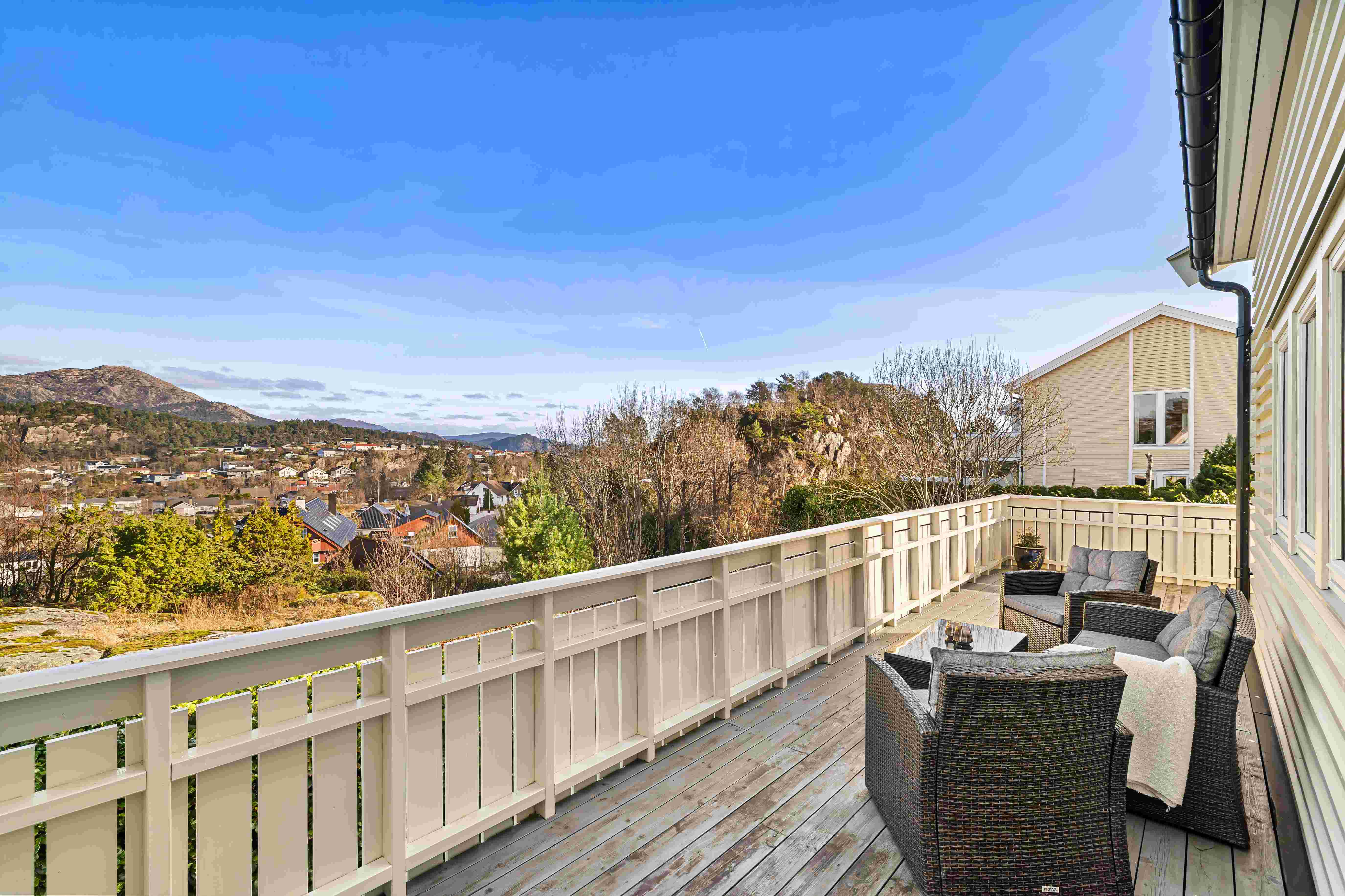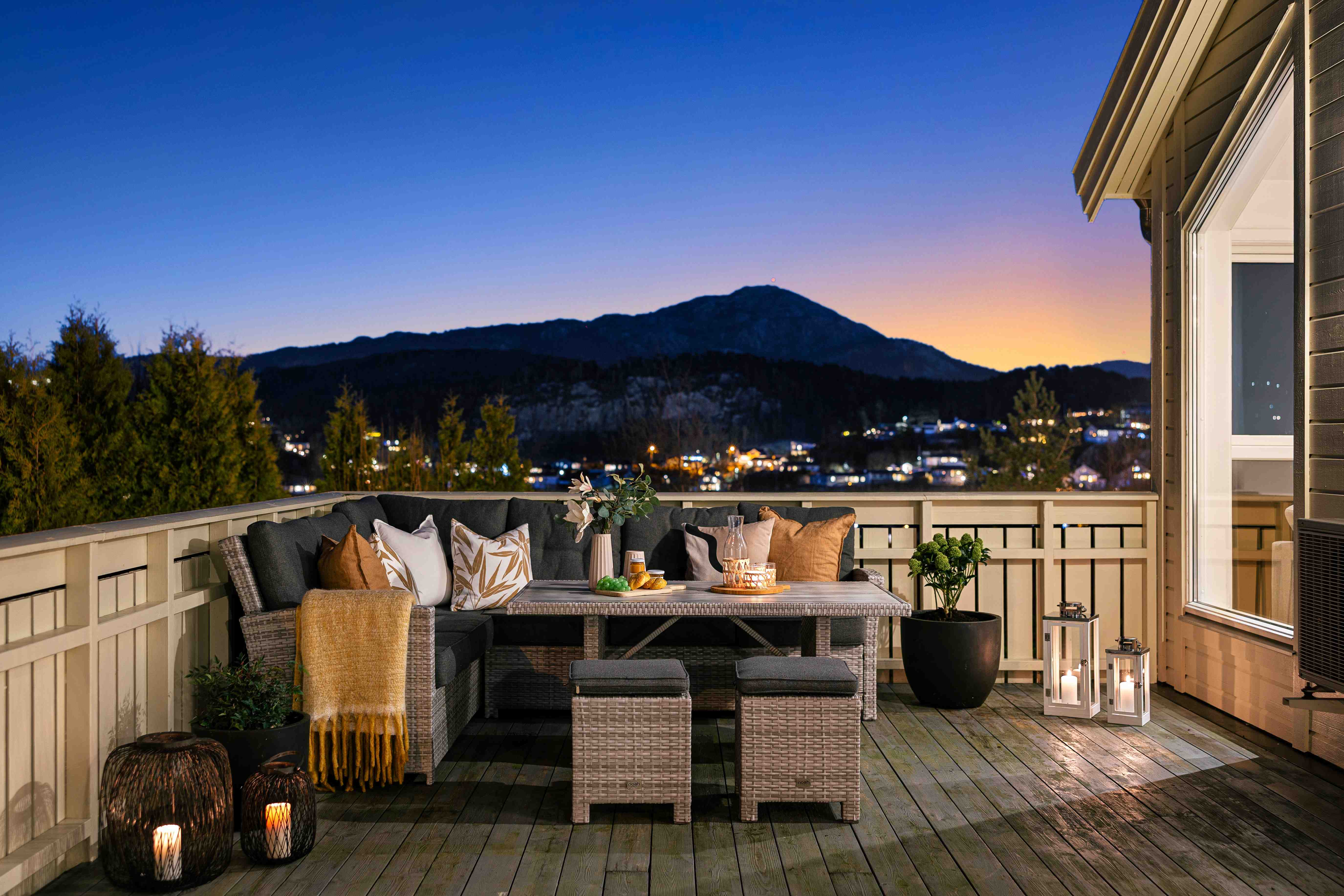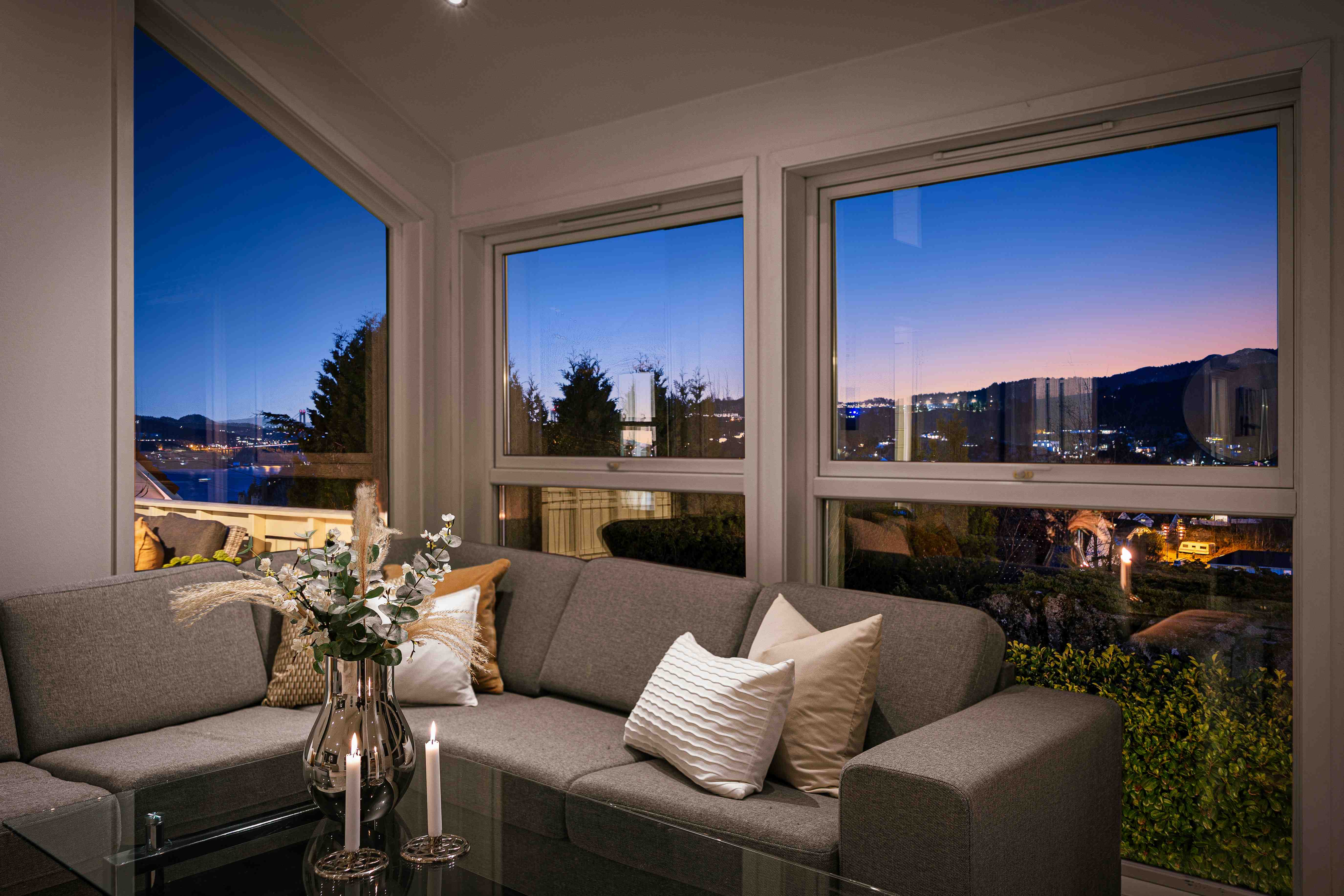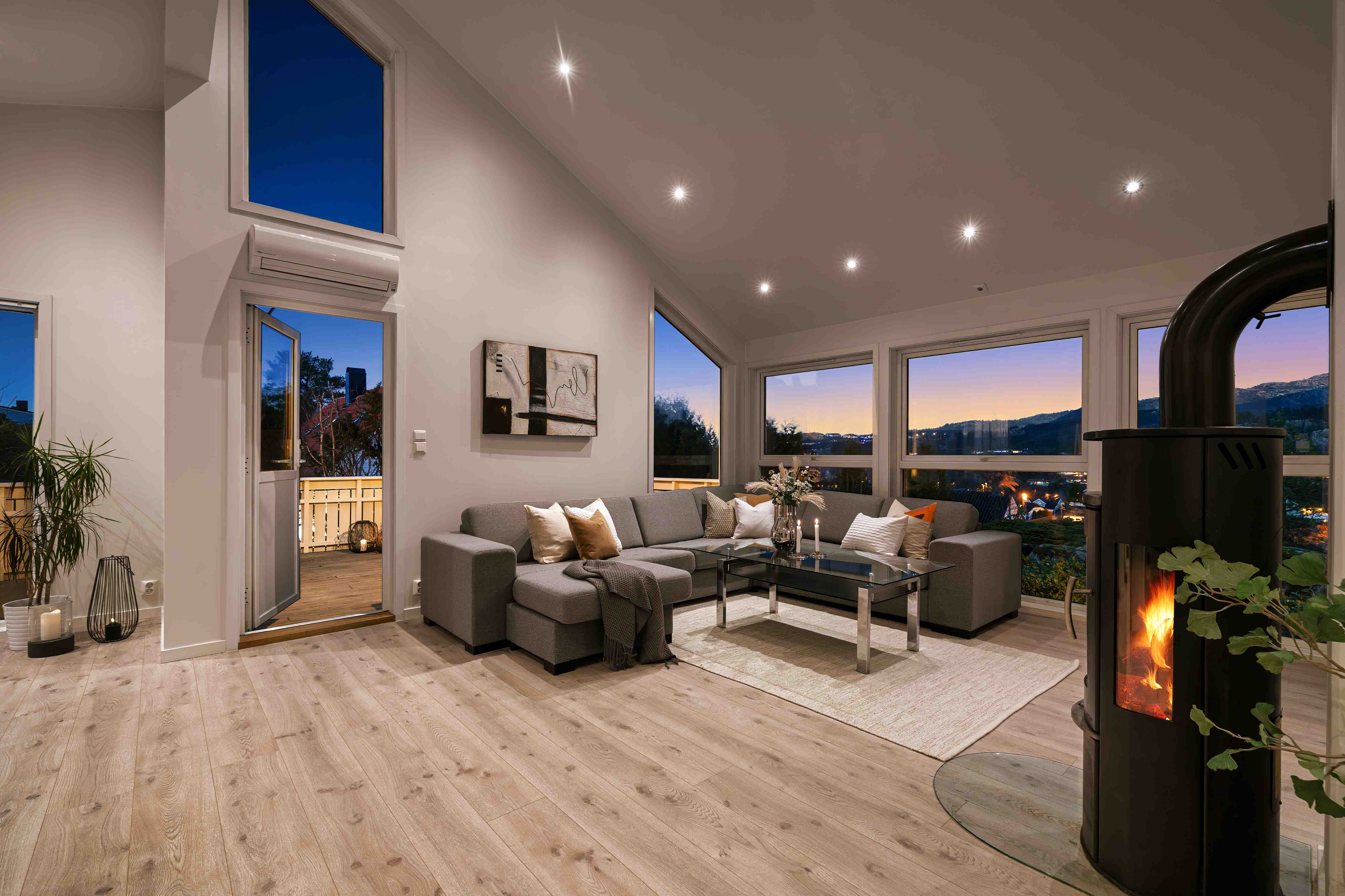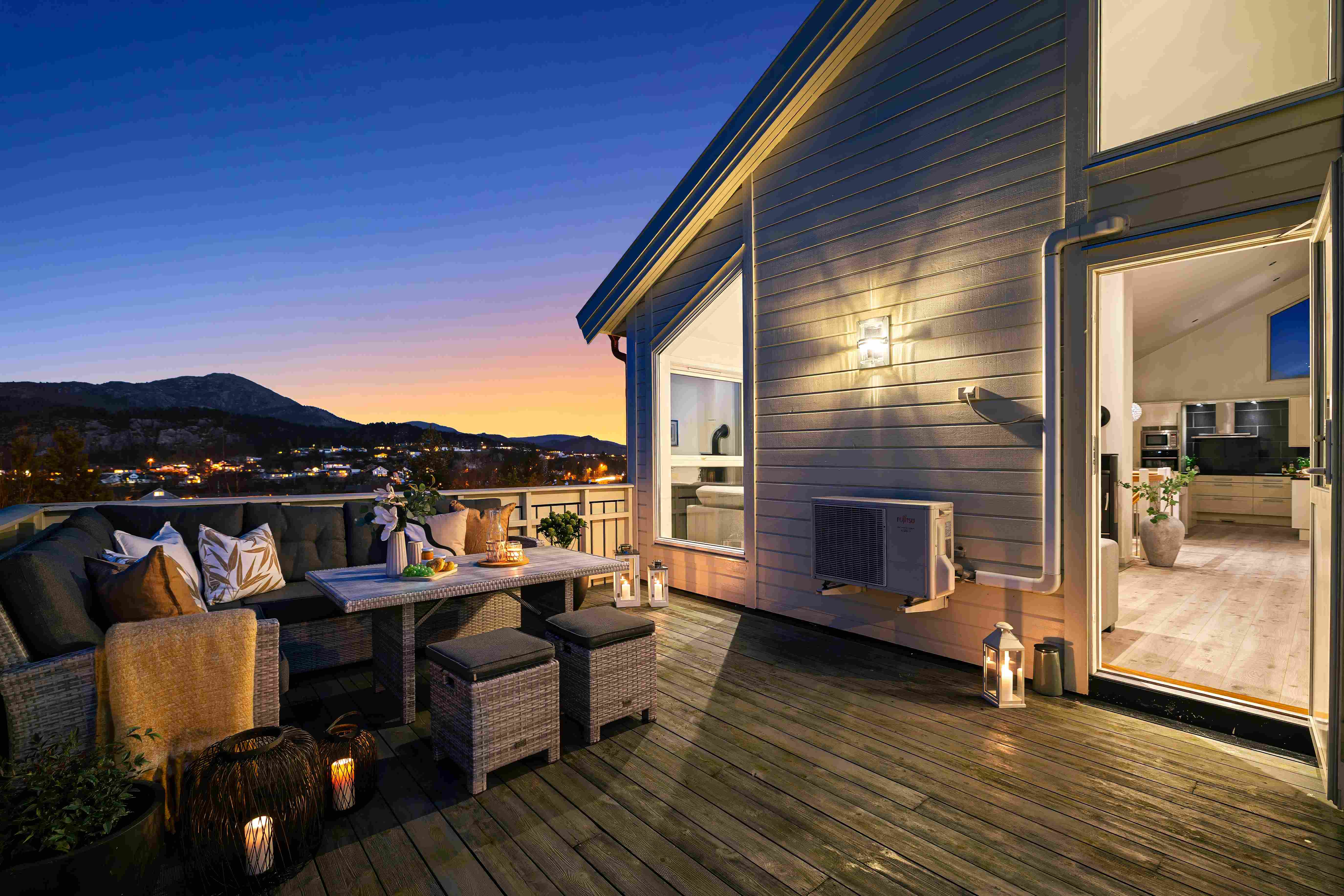 Fra stuen er det utgang til to terrasser med samlet areal på 61 m²