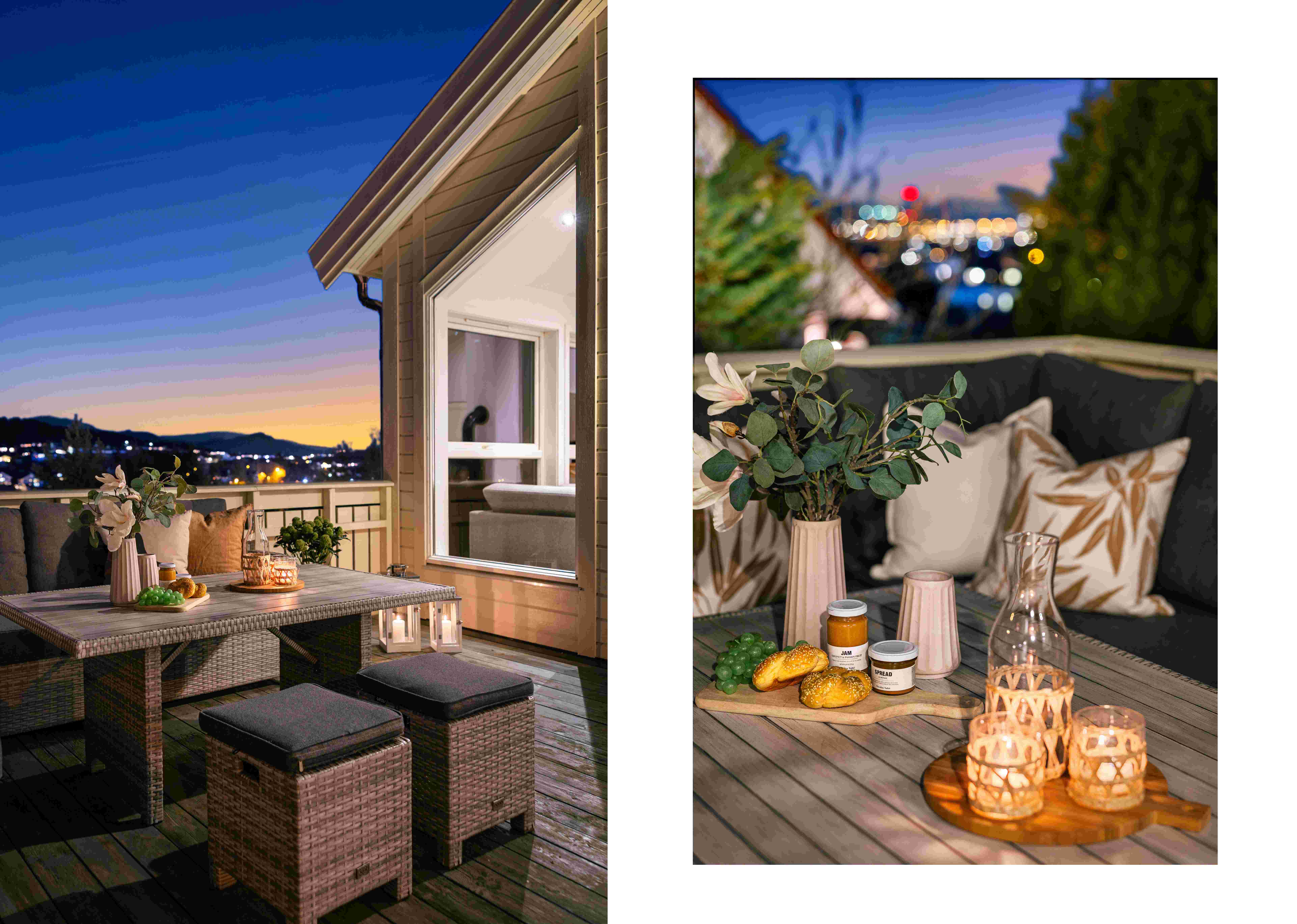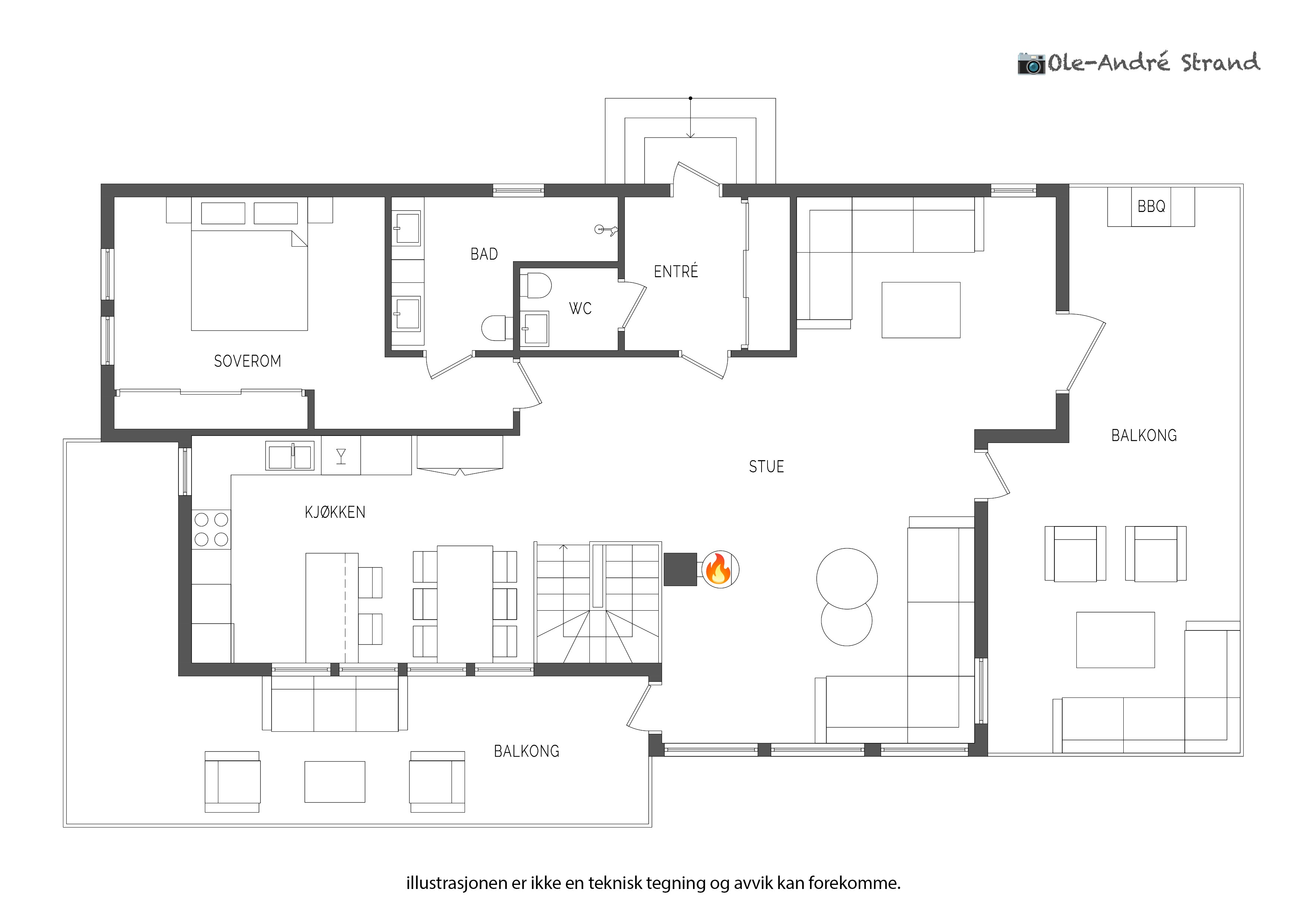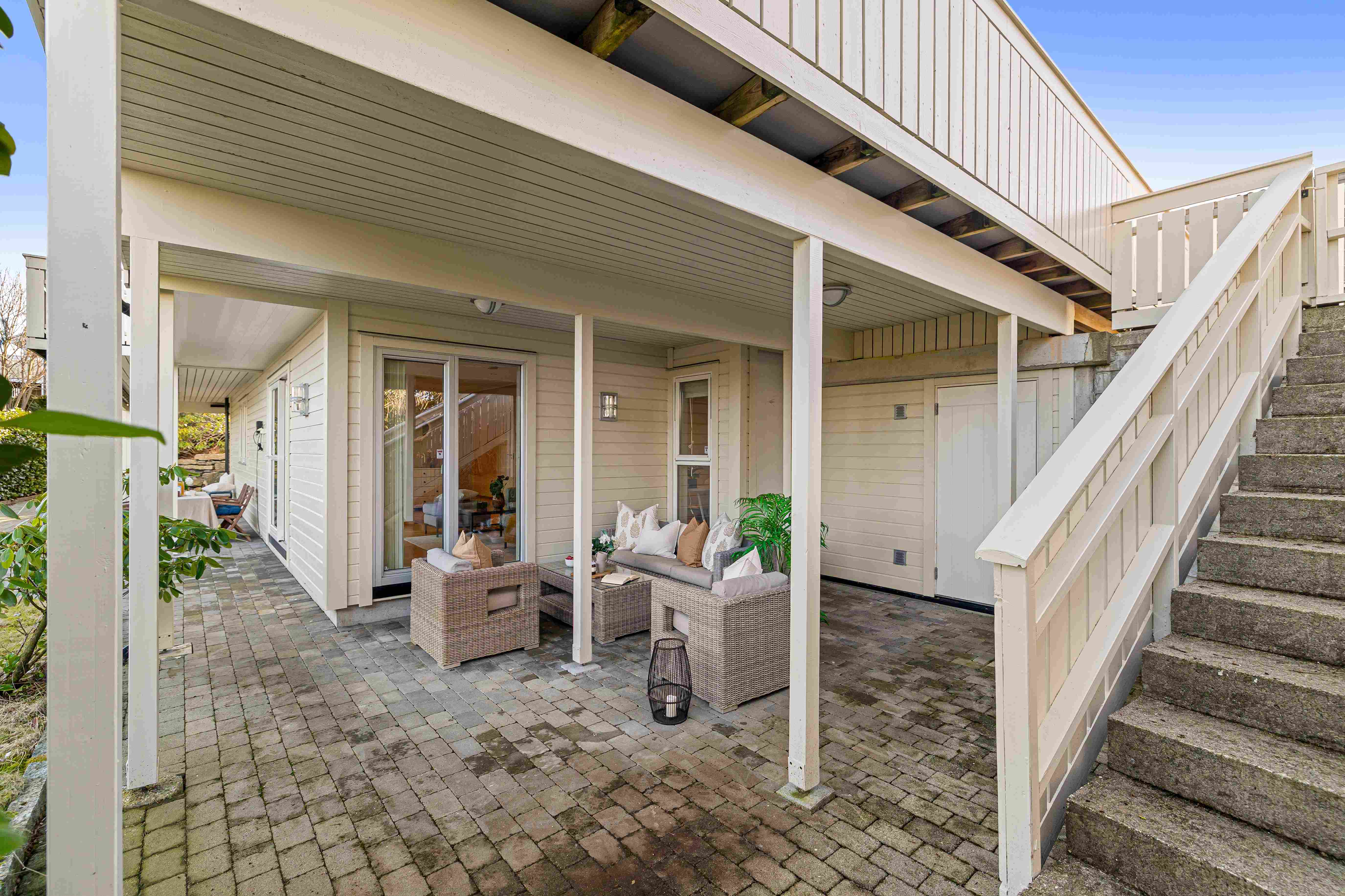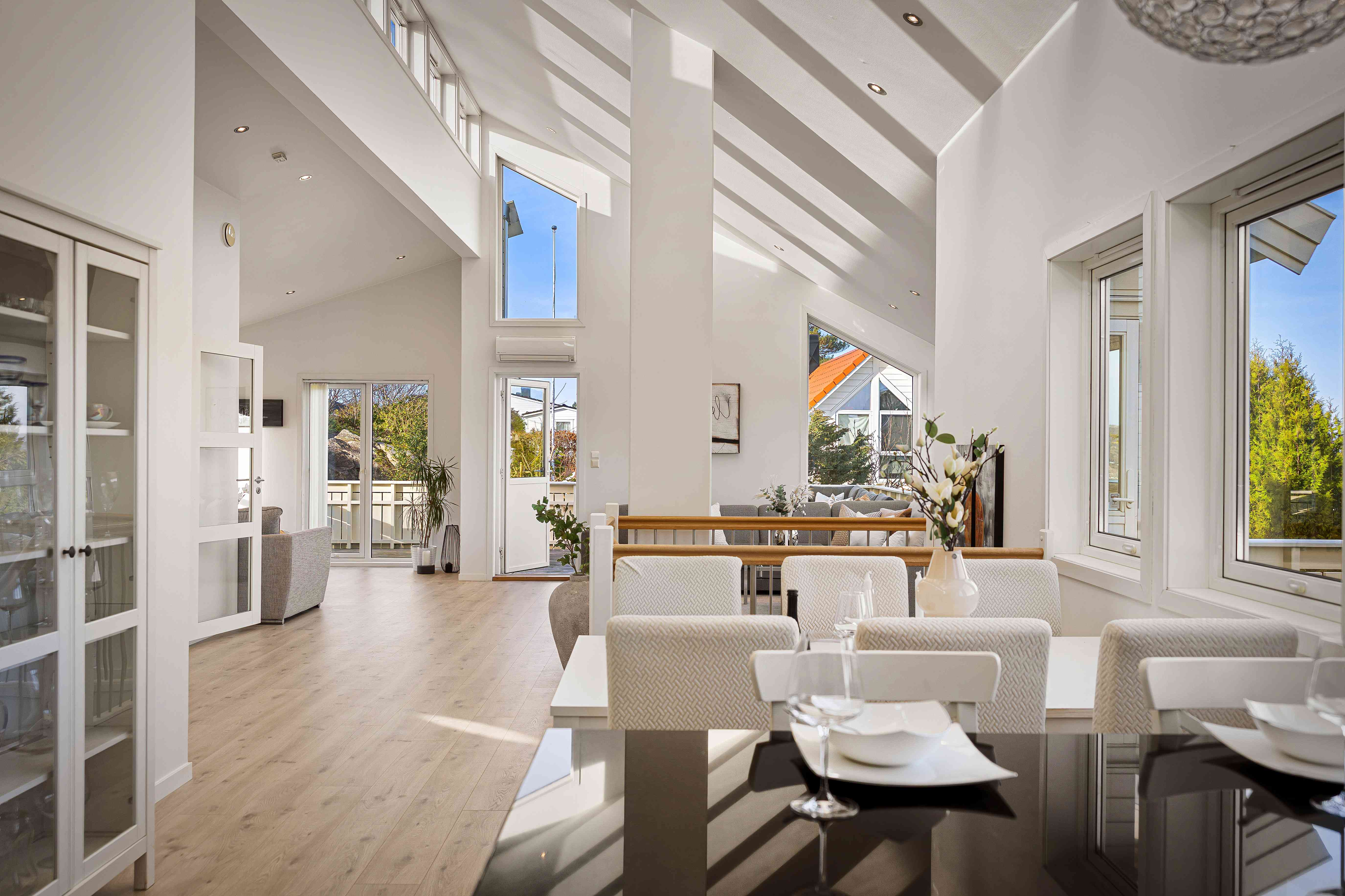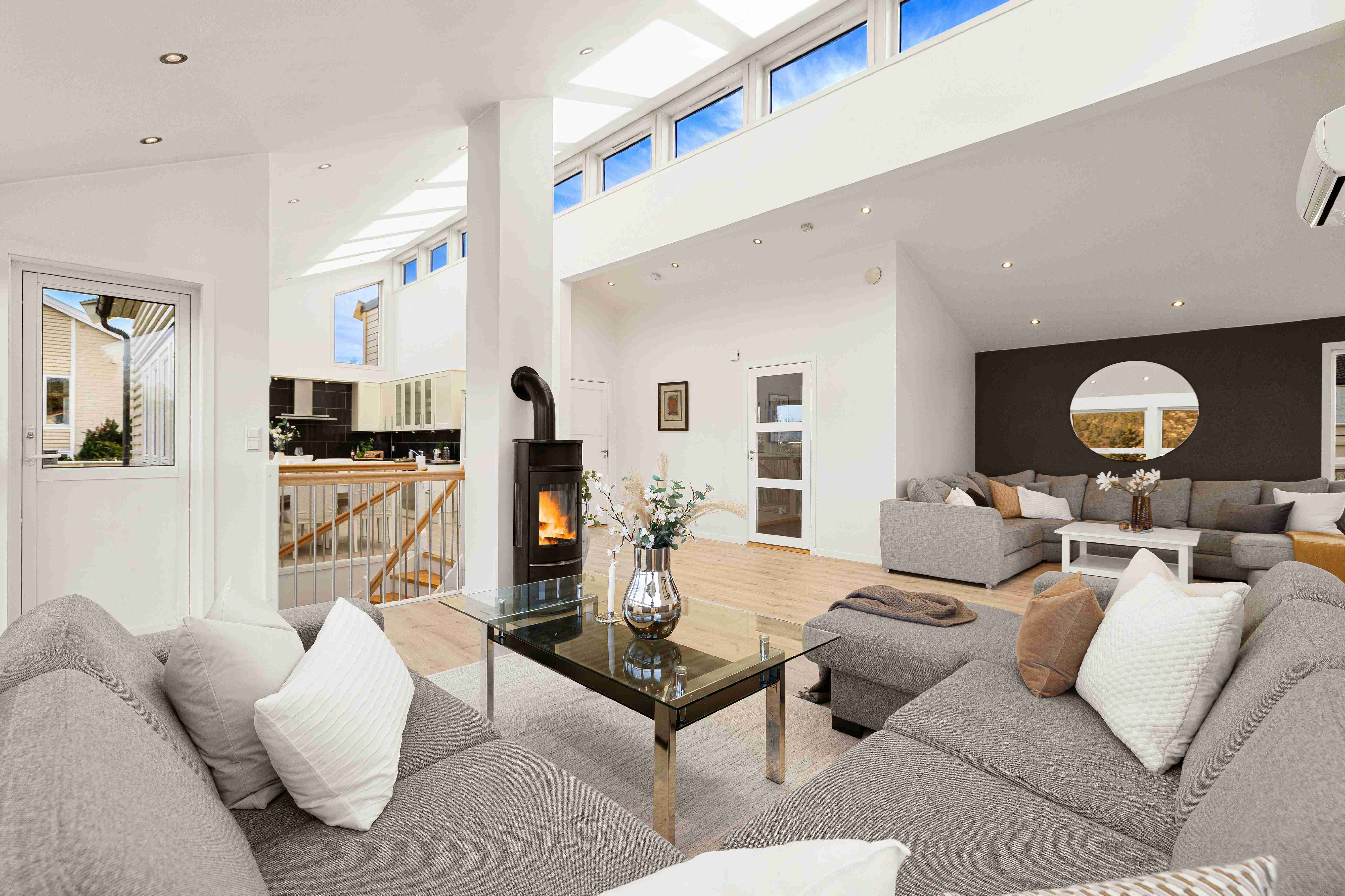 Fra stuen er det utgang til to terrasser med samlet areal på 61 m²
