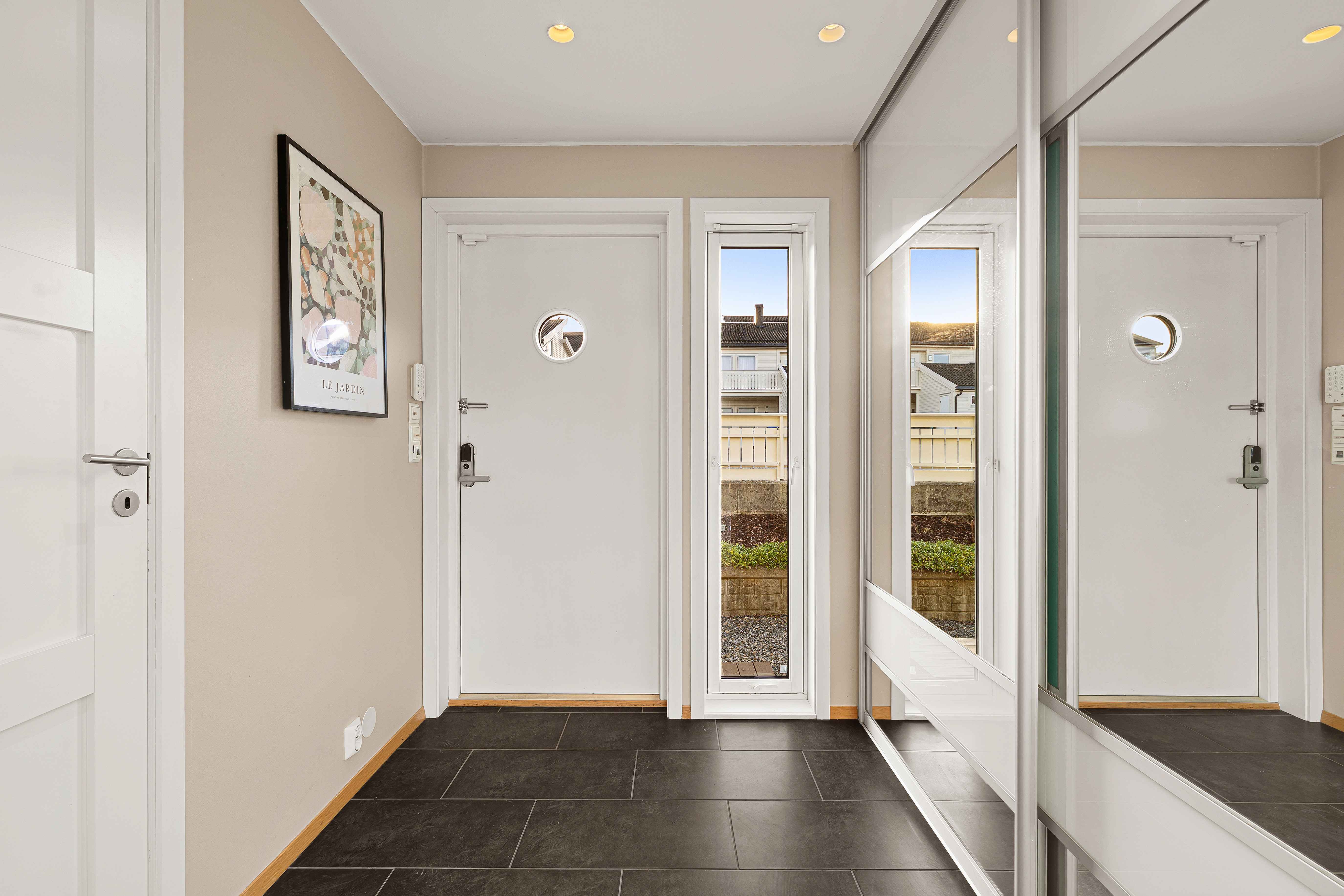 Inngangspartiet har en romslig entré med flislagt gulv, varmekabler og skyvedørsgarderobe med god oppbevaringsplass.