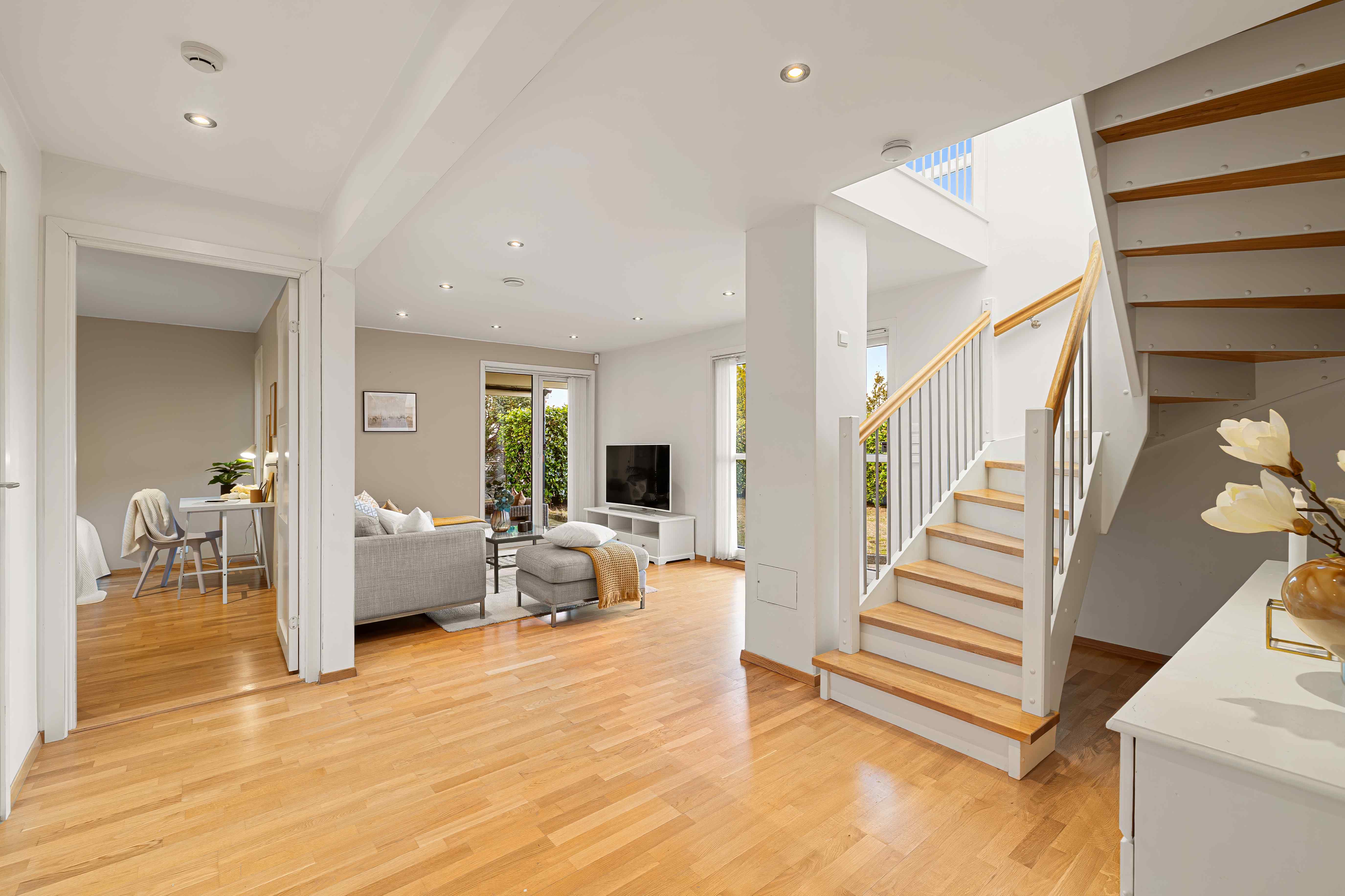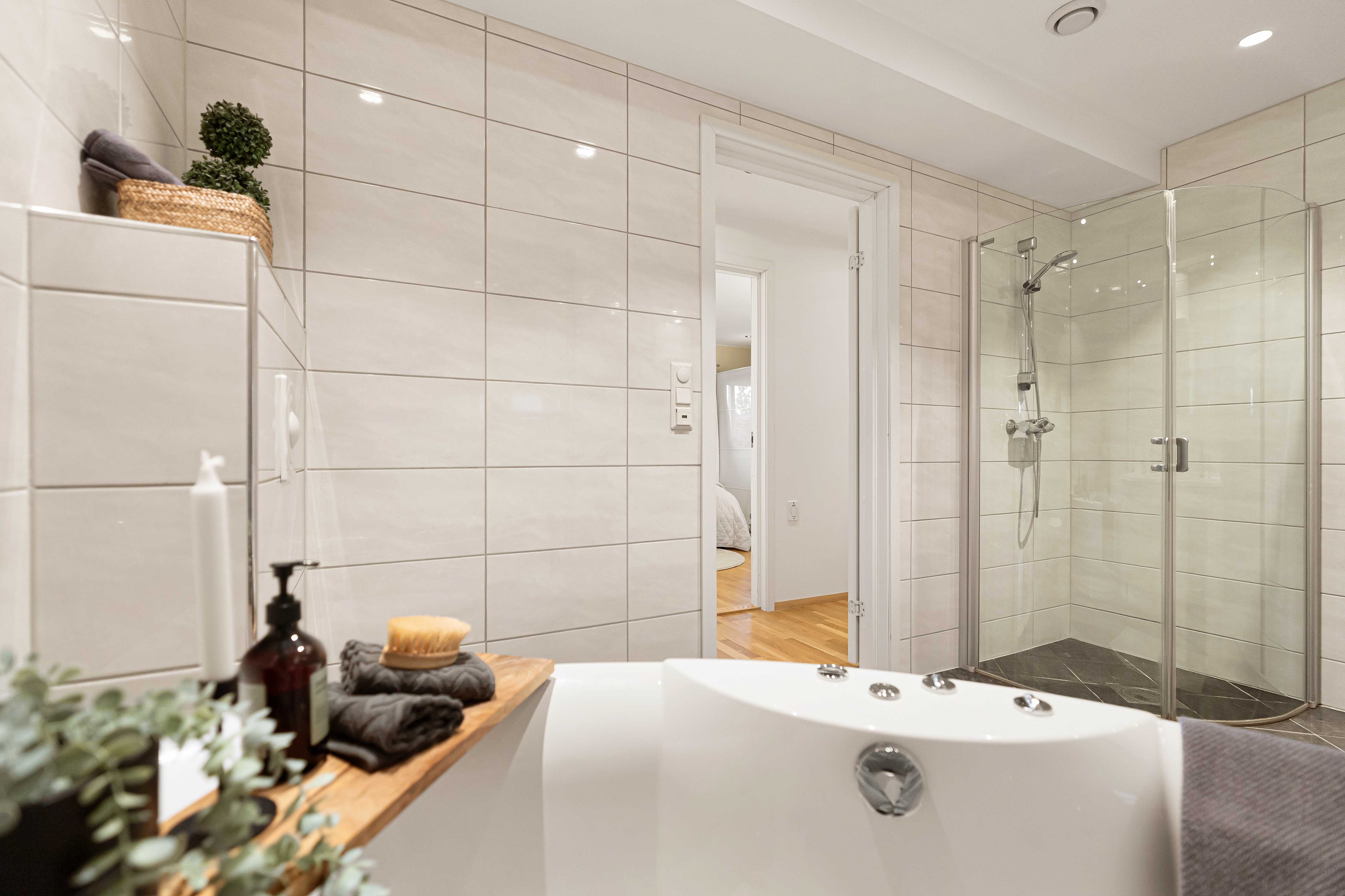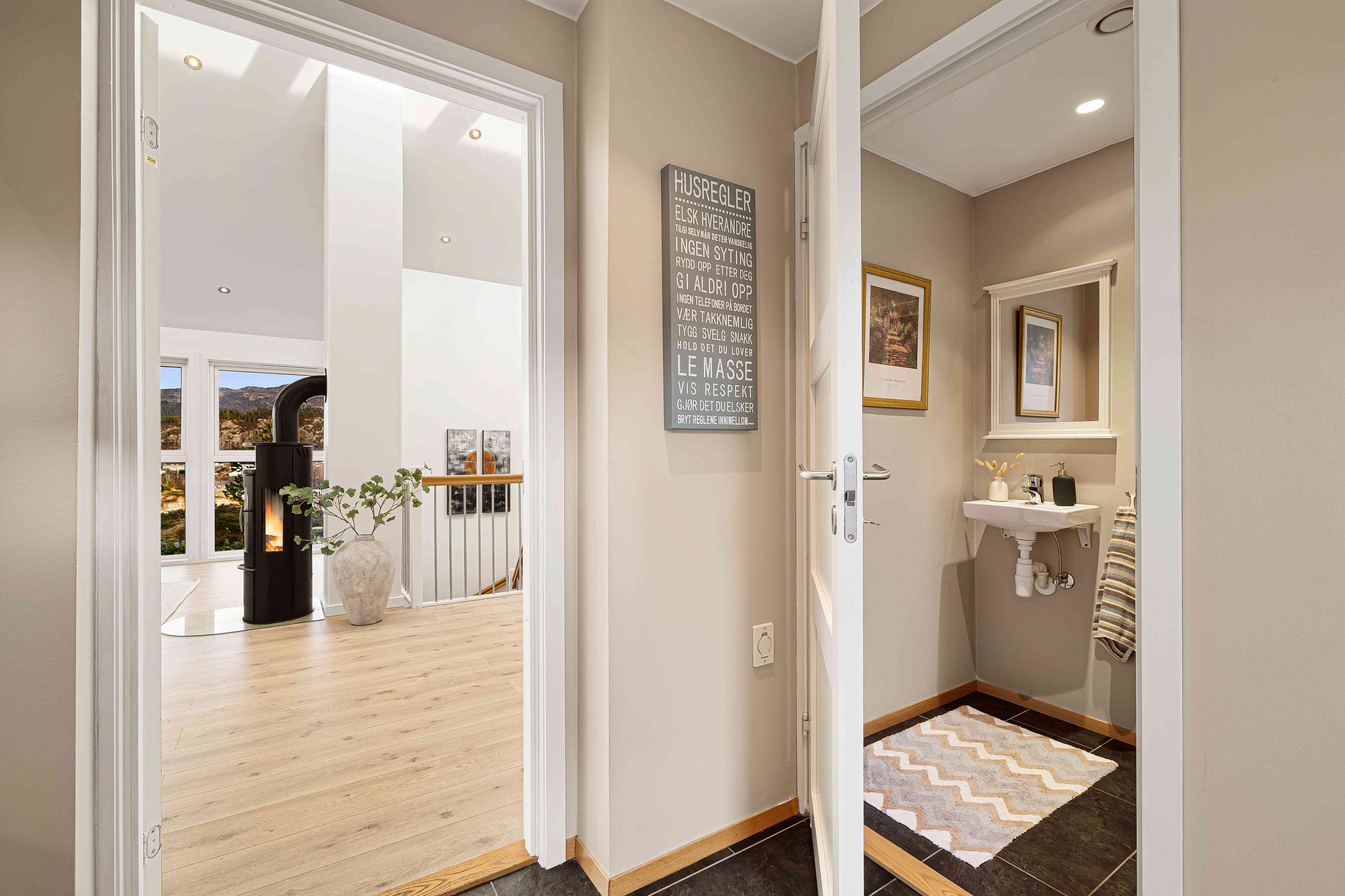 Boligen har en praktisk romfordeling med store, fullverdige baderom i begge etasjer, separat vaskerom i underetasjen samt eget toalettrom i hovedetasjen. I tillegg til den store stuen i hovedetasjen finnes det en egen TV-stue i underetasjen med direkte utgang til en skjermet hage på nedsiden av huset.