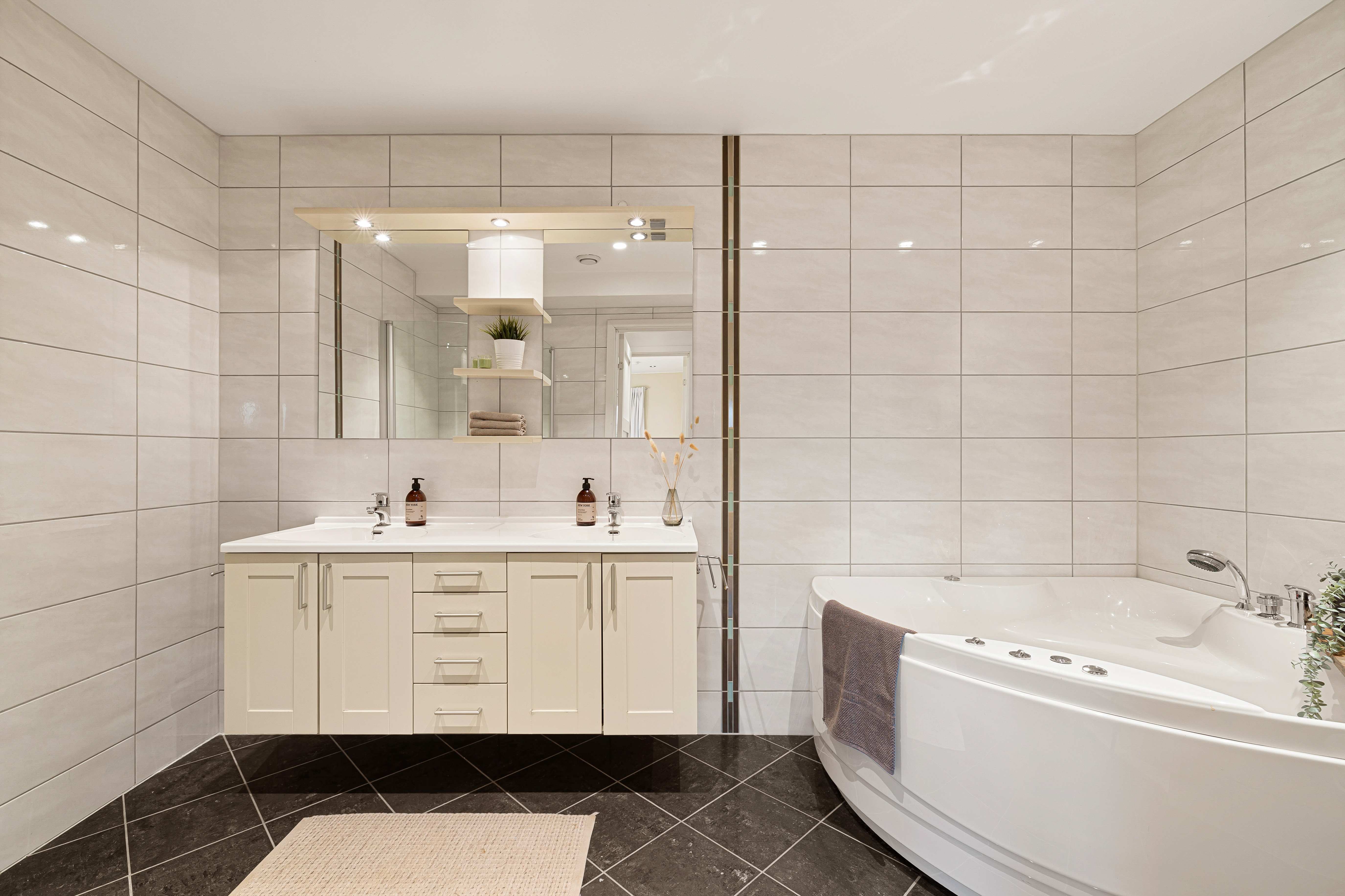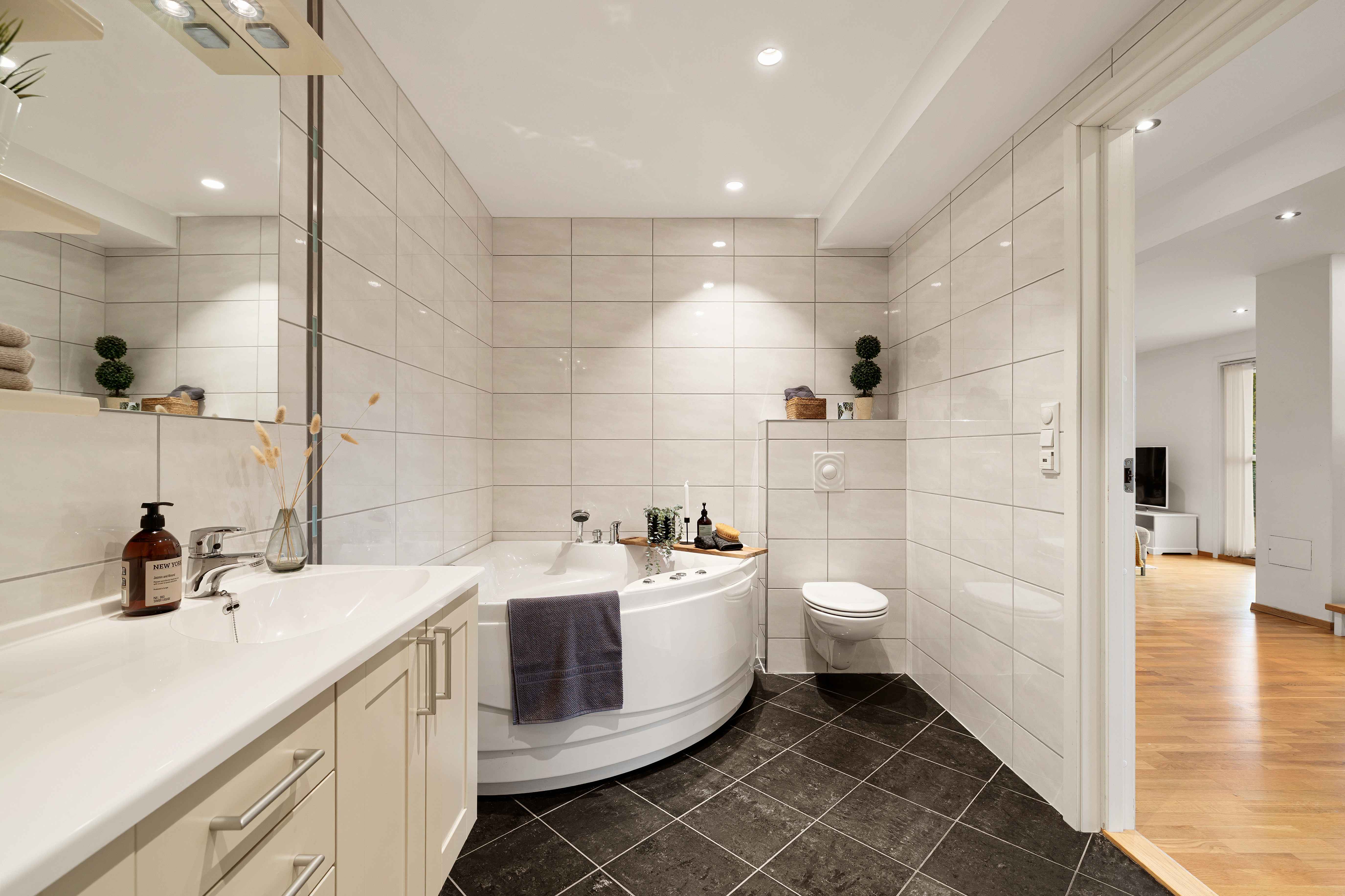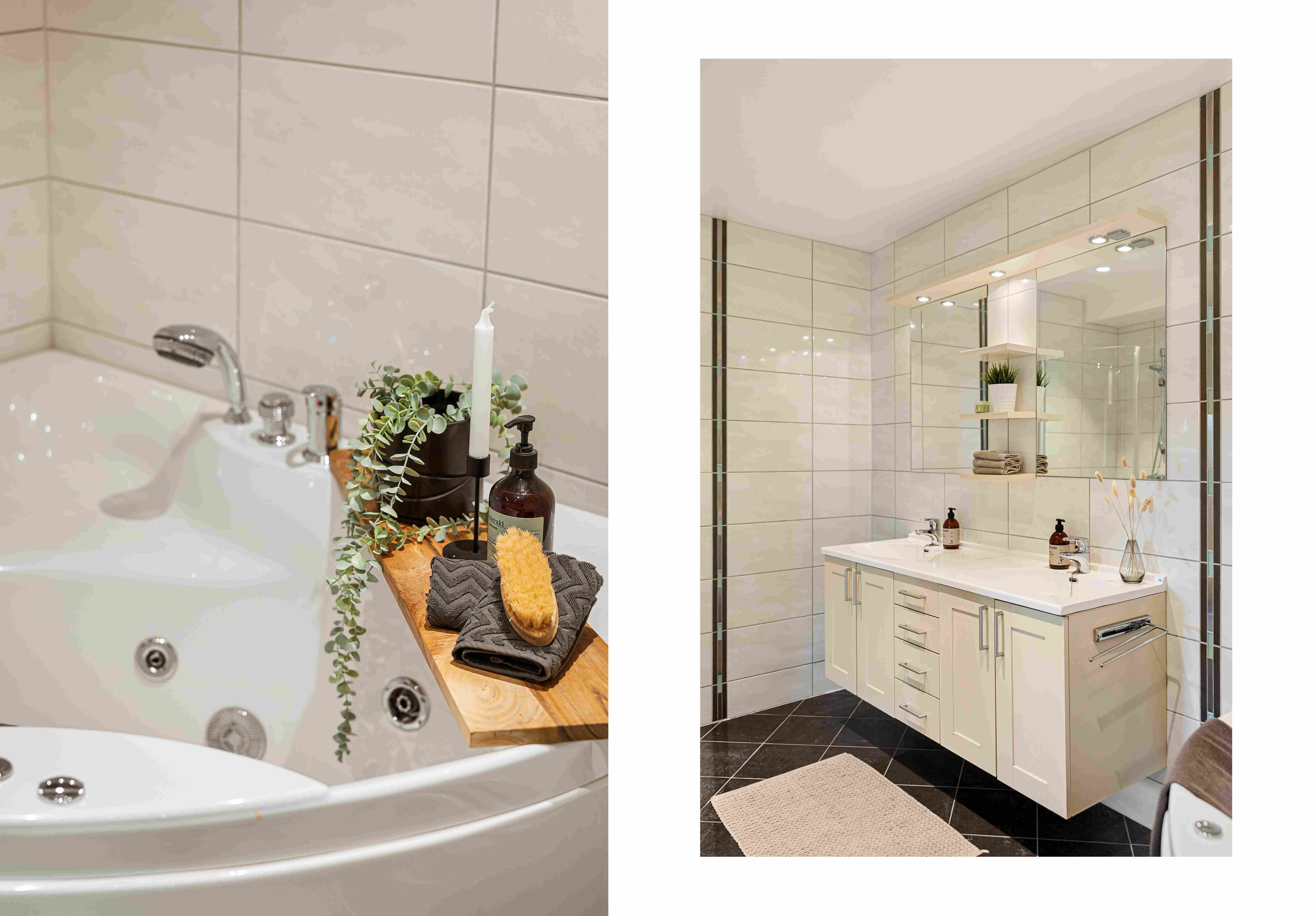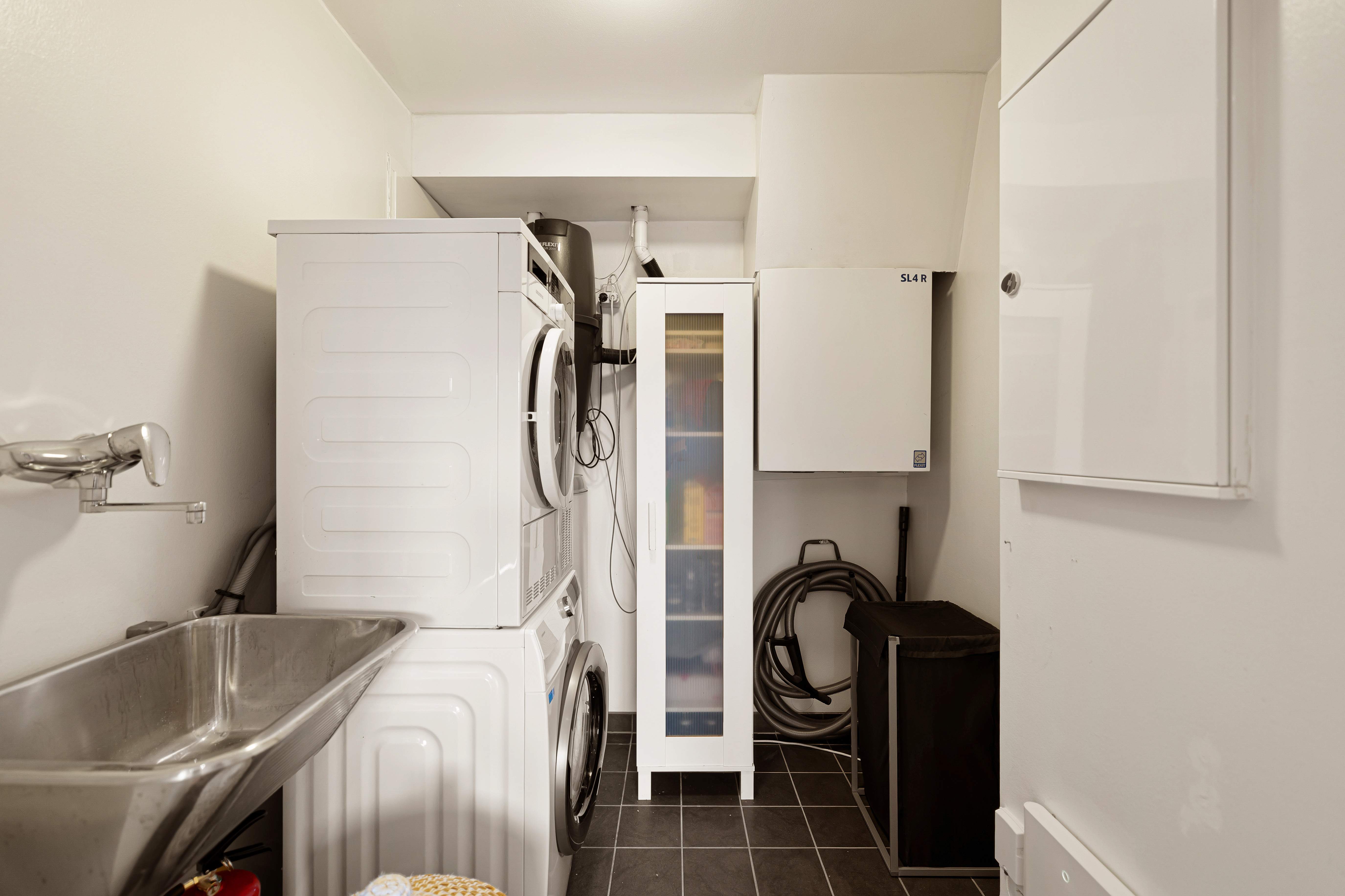 Boligen har en praktisk romfordeling med store, fullverdige baderom i begge etasjer, separat vaskerom i underetasjen samt eget toalettrom i hovedetasjen. I tillegg til den store stuen i hovedetasjen finnes det en egen TV-stue i underetasjen med direkte utgang til en skjermet hage på nedsiden av huset.