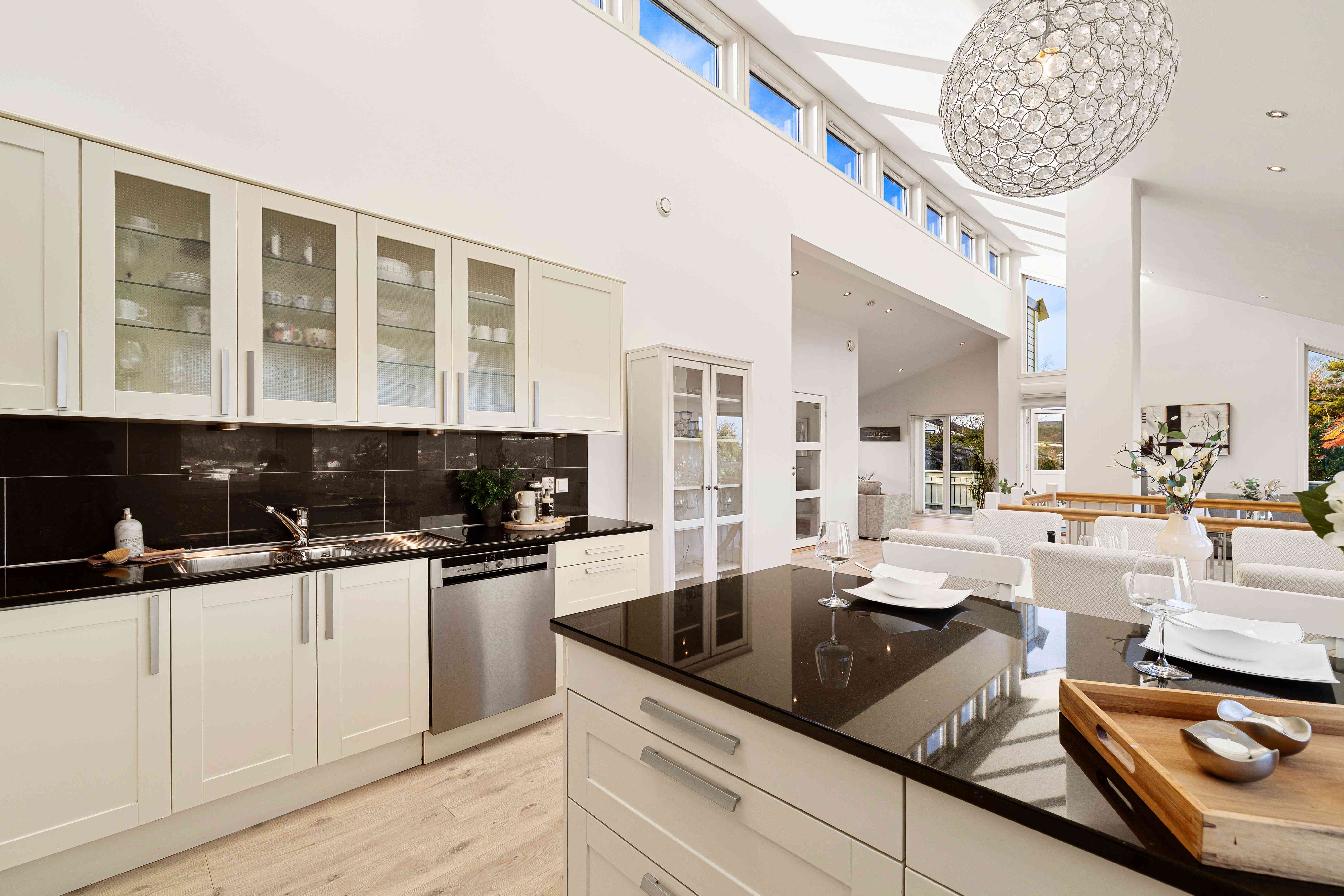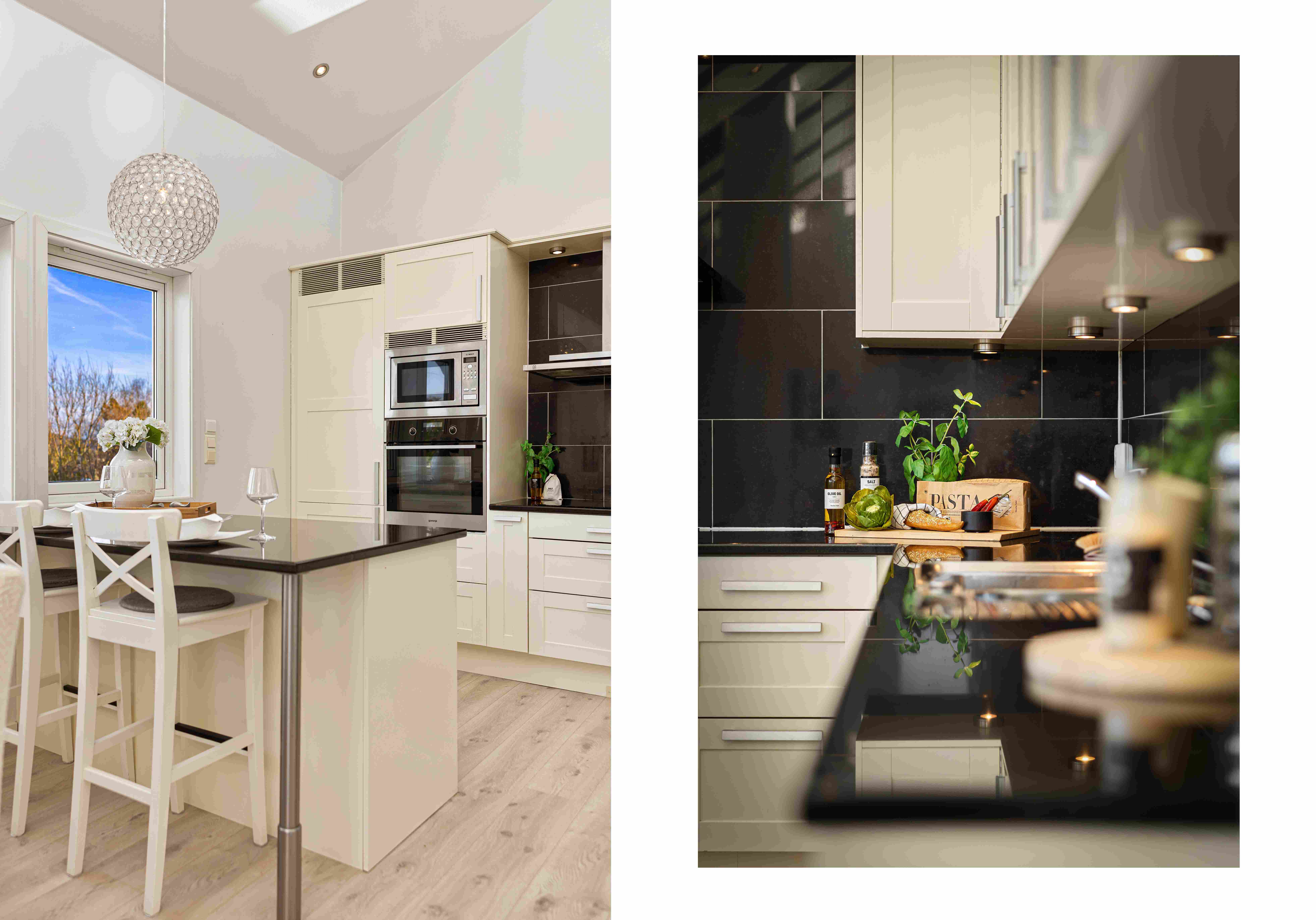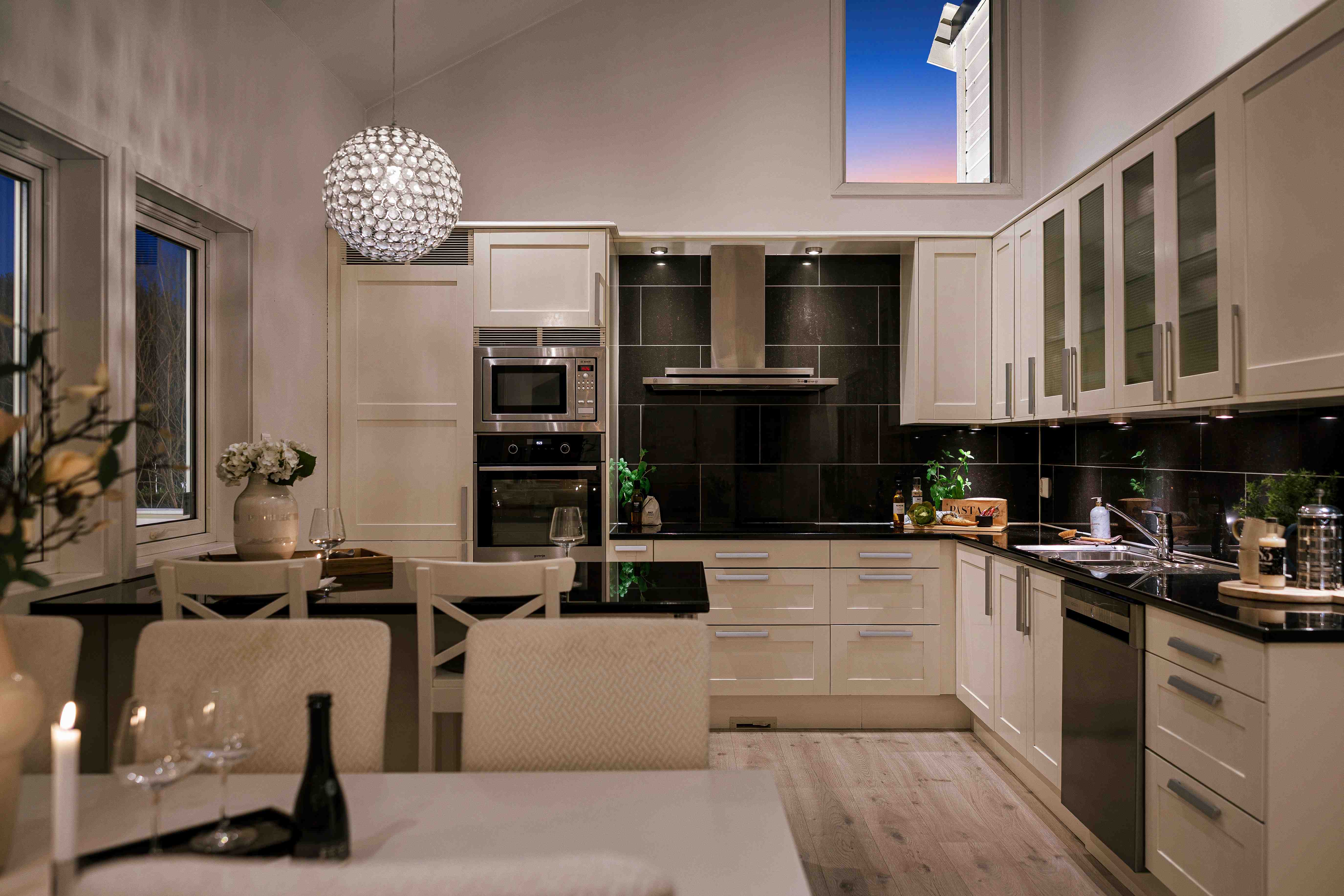 Kjøkkenet har tidløs og elegant innredning fra Sigdal med rikelig skap- og benkeplass. Benkeplaten er i granitt og det er fliser på vegg mellom overskap og benk. Kjøkkenet er utstyrt med integrerte hvitevarer, herunder 80 cm bred induksjonstopp, stekeovn, mikrobølgeovn samt kjøleskap med frysesone. Kjøkkenøya gir både ekstra arbeidsflate og naturlig plass til spiseområde.