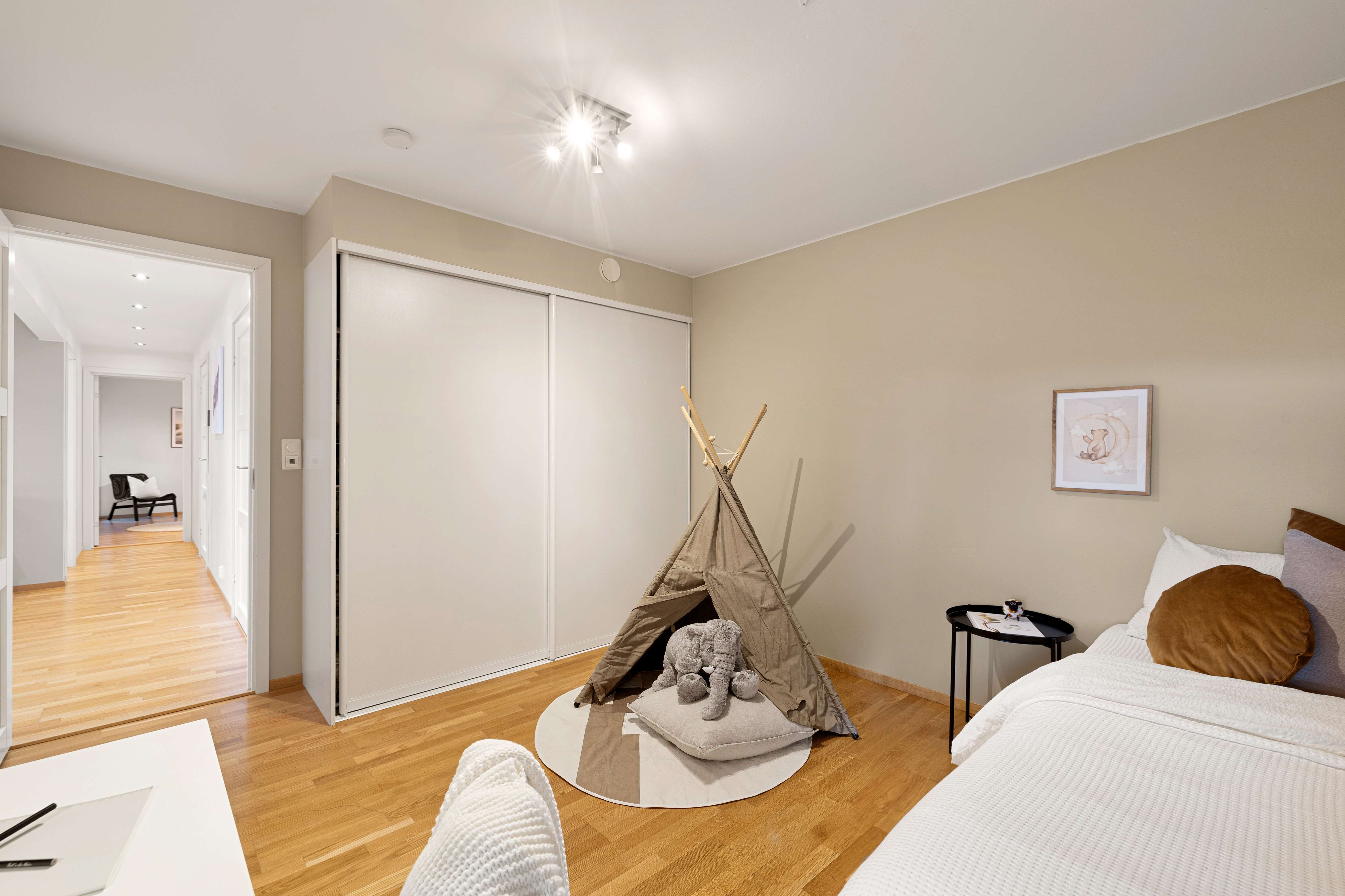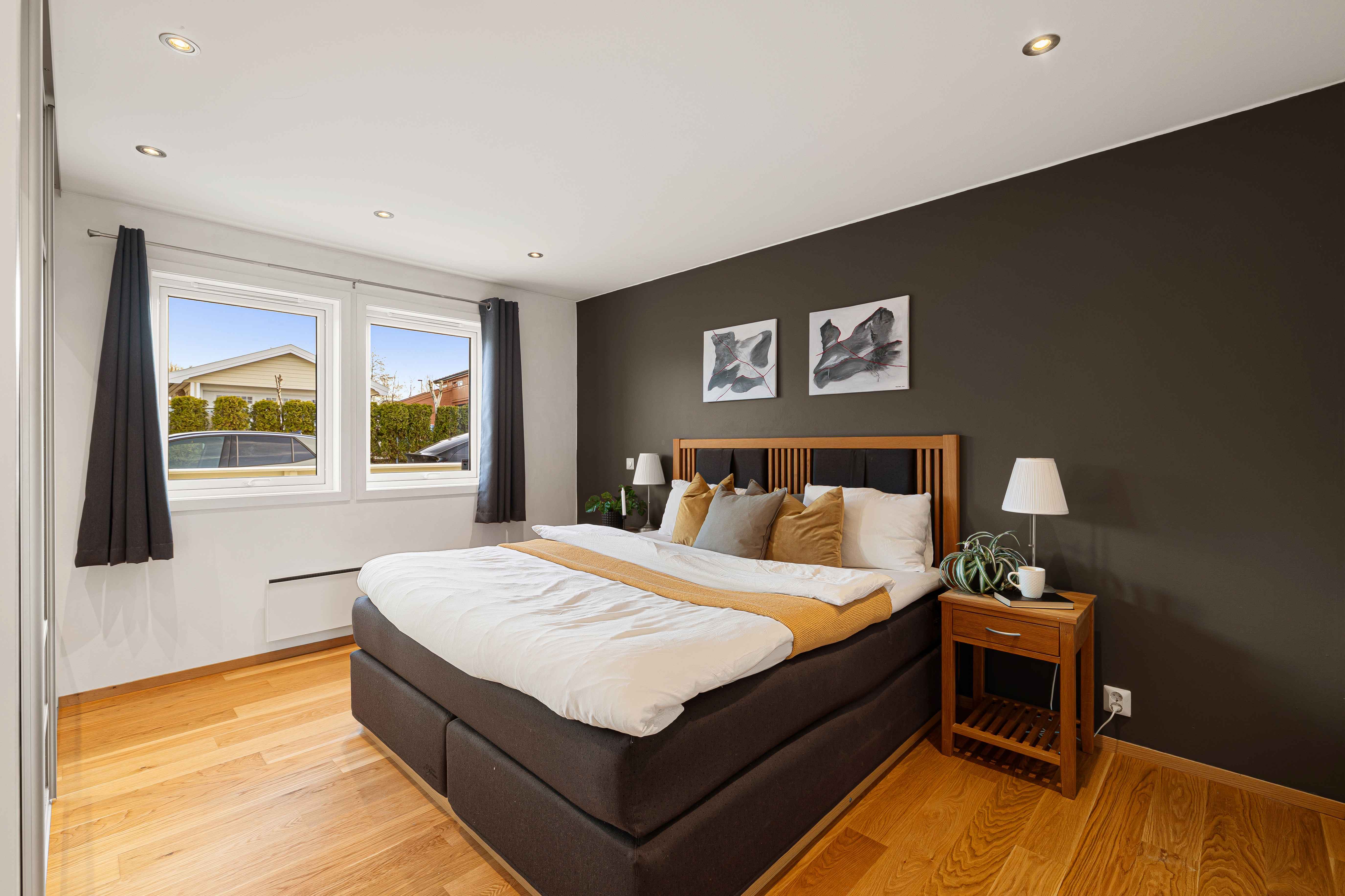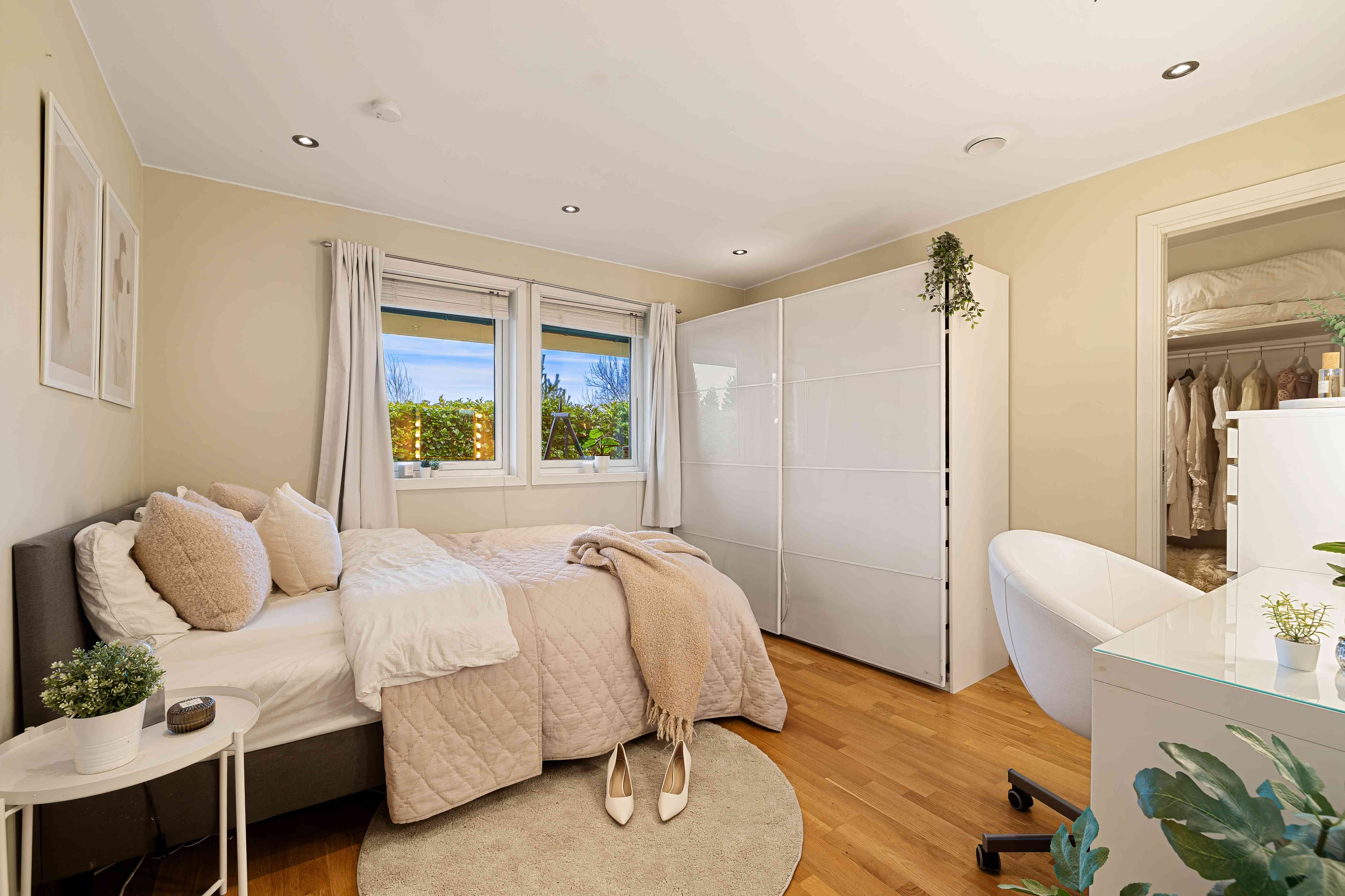 Boligen har totalt fire soverom, hvorav tre er plassert i underetasjen og ett i hovedetasjen. Foreldresoverommet i hovedetasjen måler hele 17,3 m² og har stor speilskyvedørsgarderobe samt direkte tilknytning til eget baderom. Ett av soverommene i underetasjen har eget garderoberom på 5,2 m².