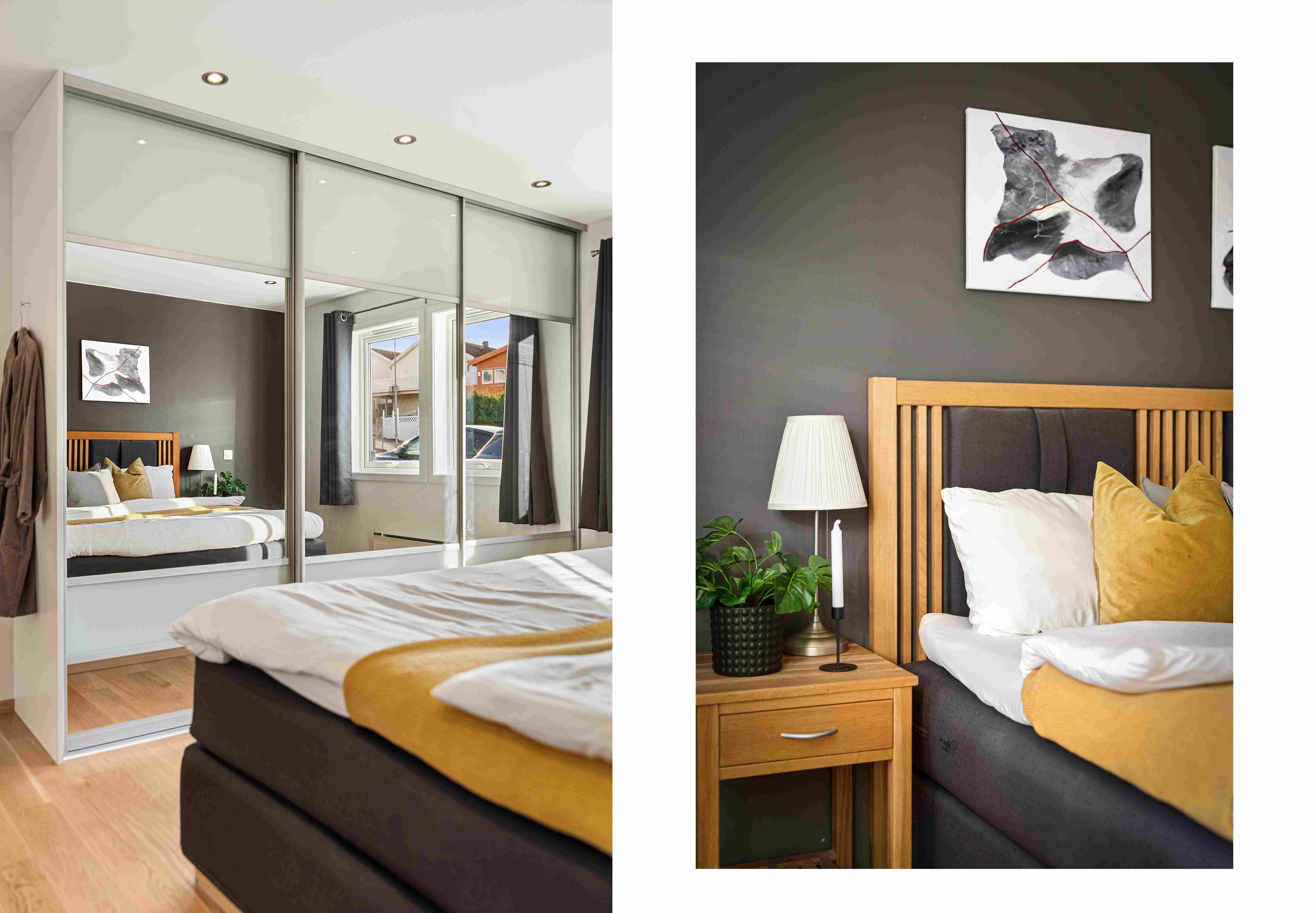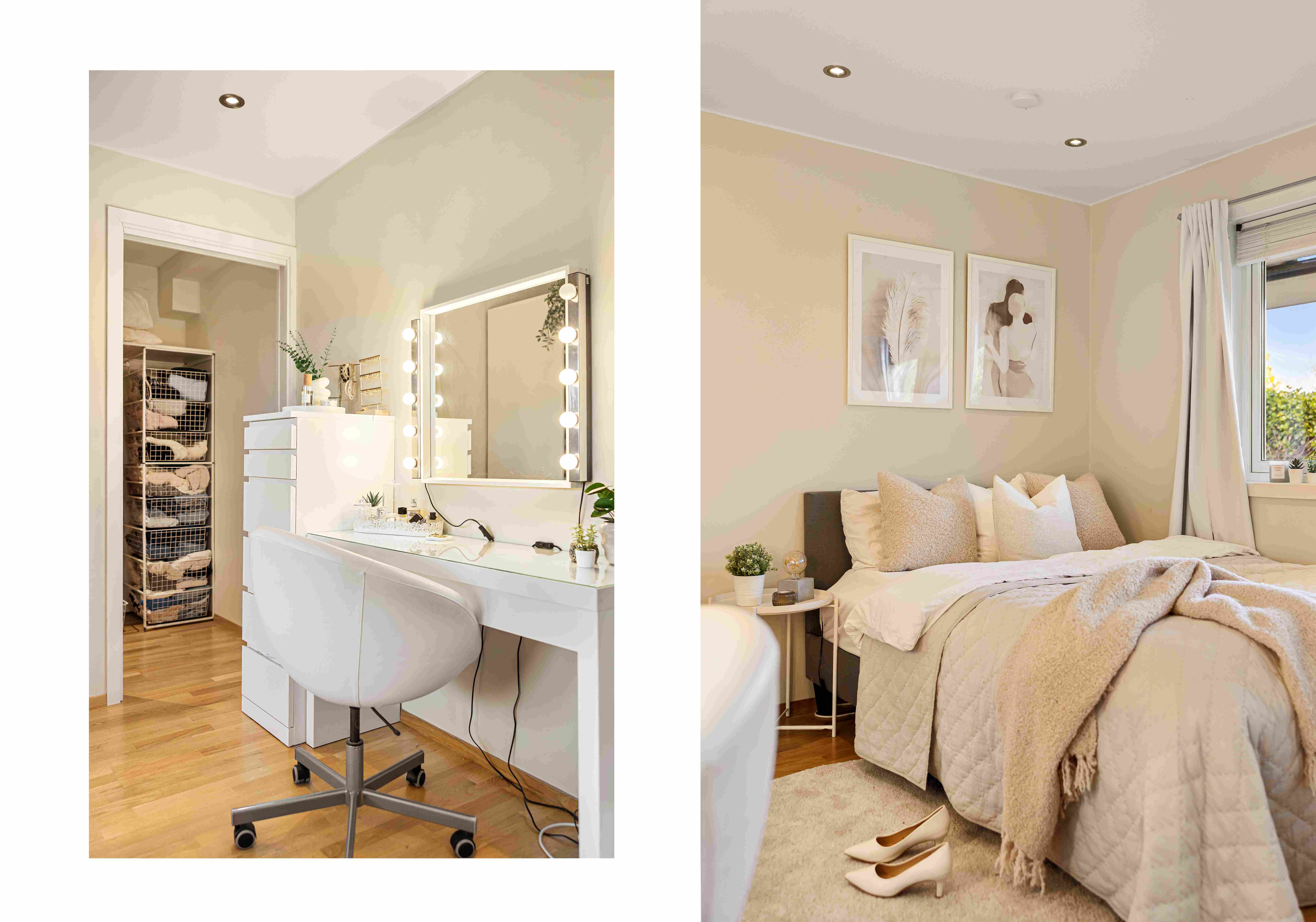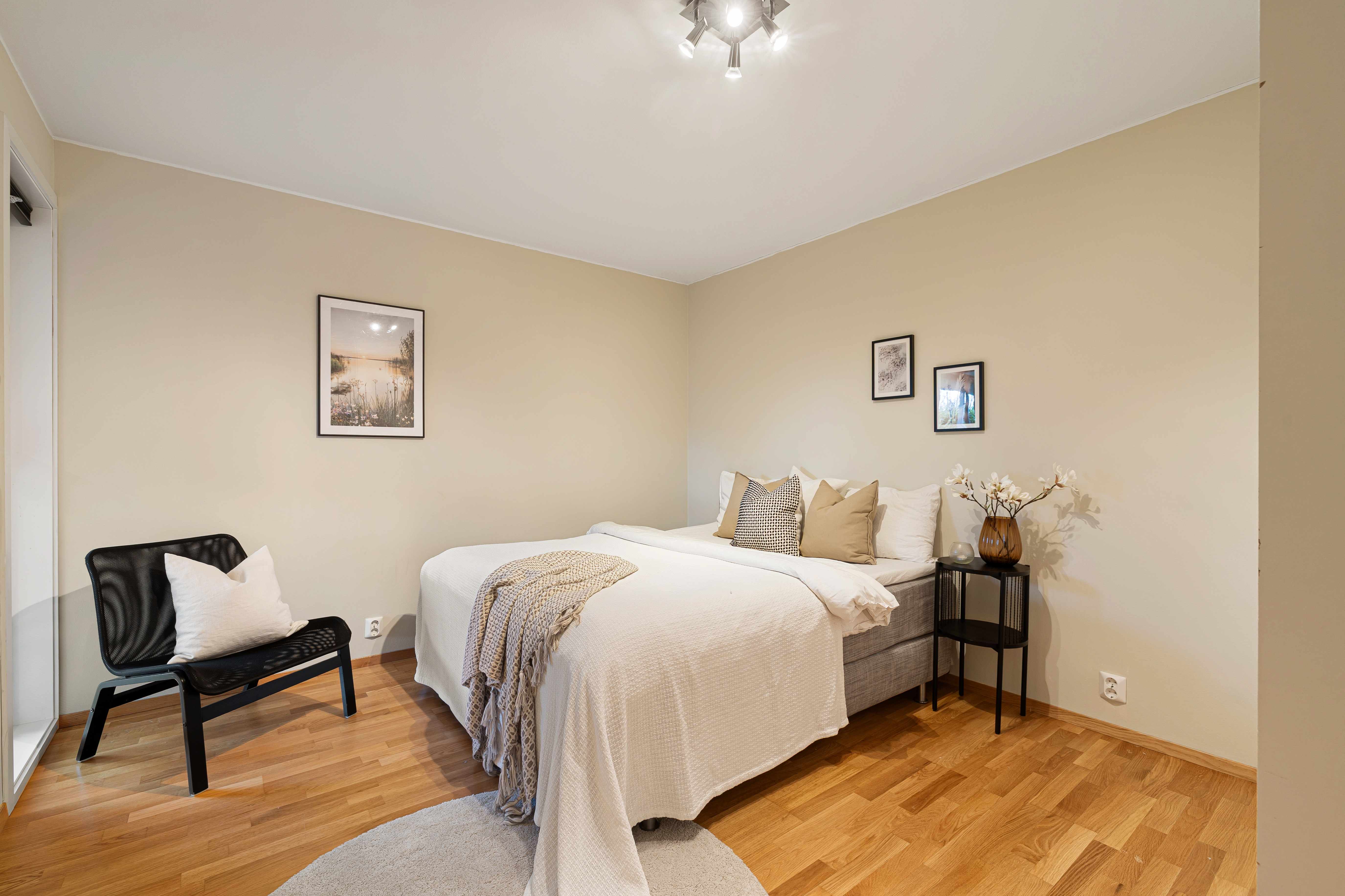 Boligen har totalt fire soverom, hvorav tre er plassert i underetasjen og ett i hovedetasjen. Foreldresoverommet i hovedetasjen måler hele 17,3 m² og har stor speilskyvedørsgarderobe samt direkte tilknytning til eget baderom. Ett av soverommene i underetasjen har eget garderoberom på 5,2 m².