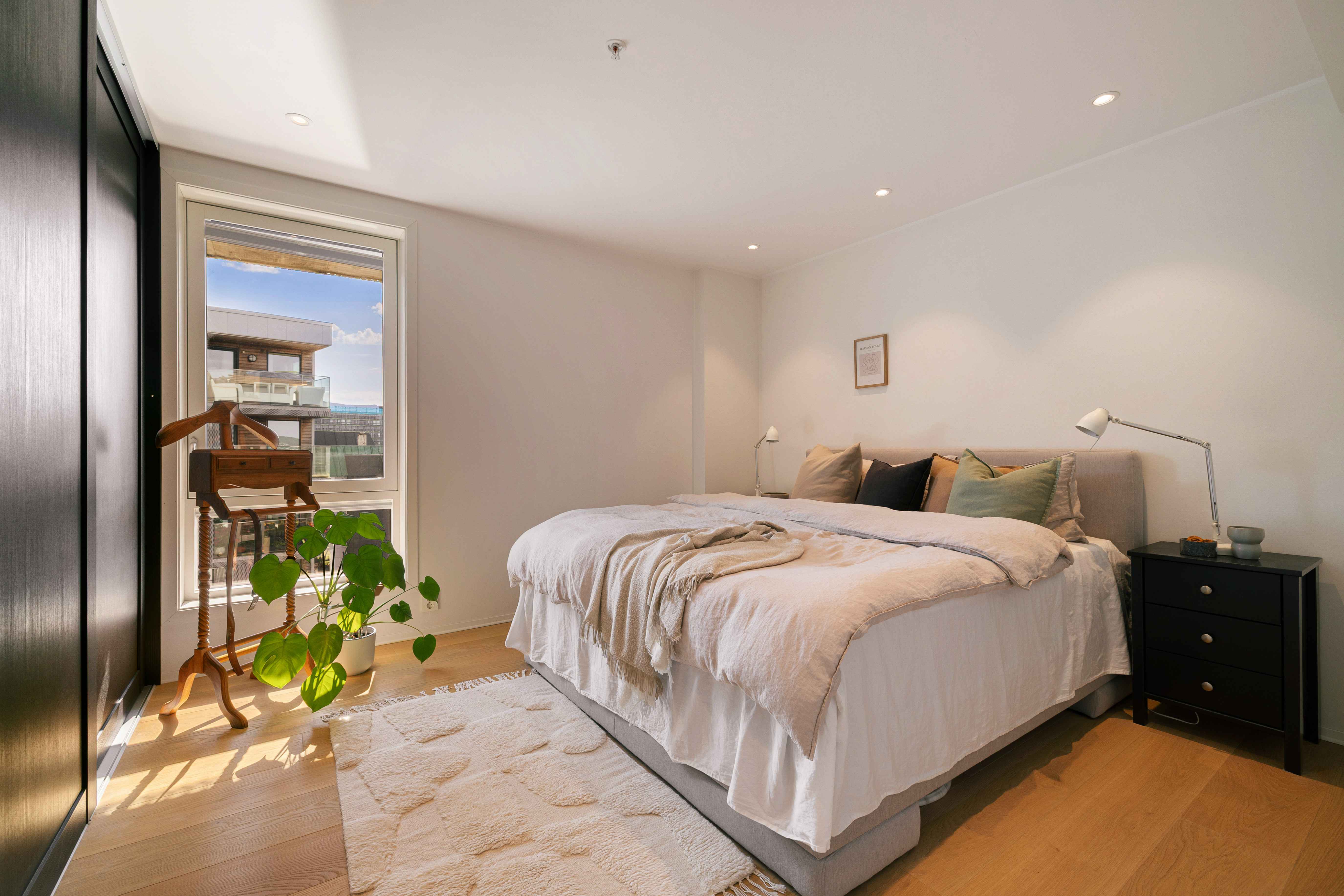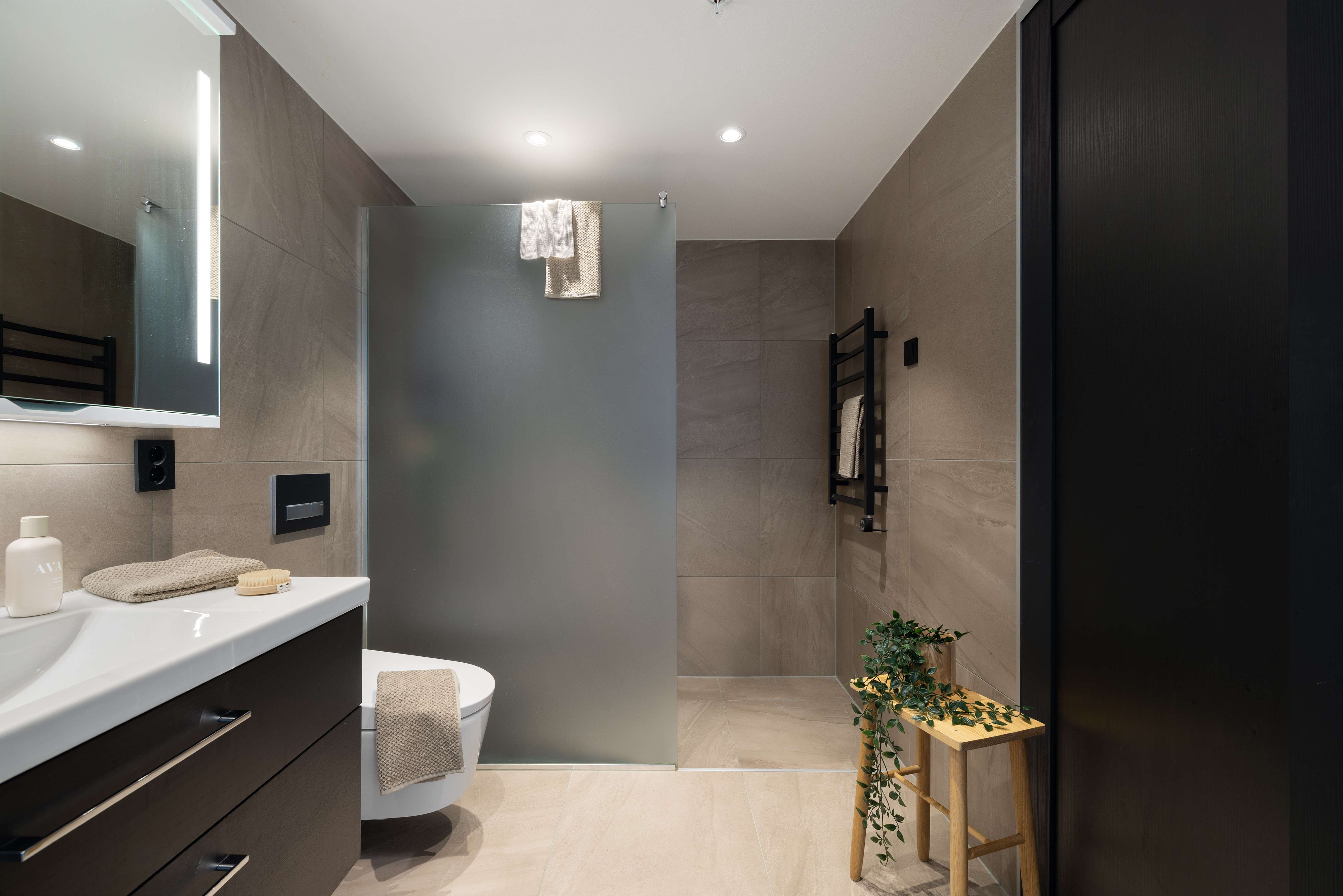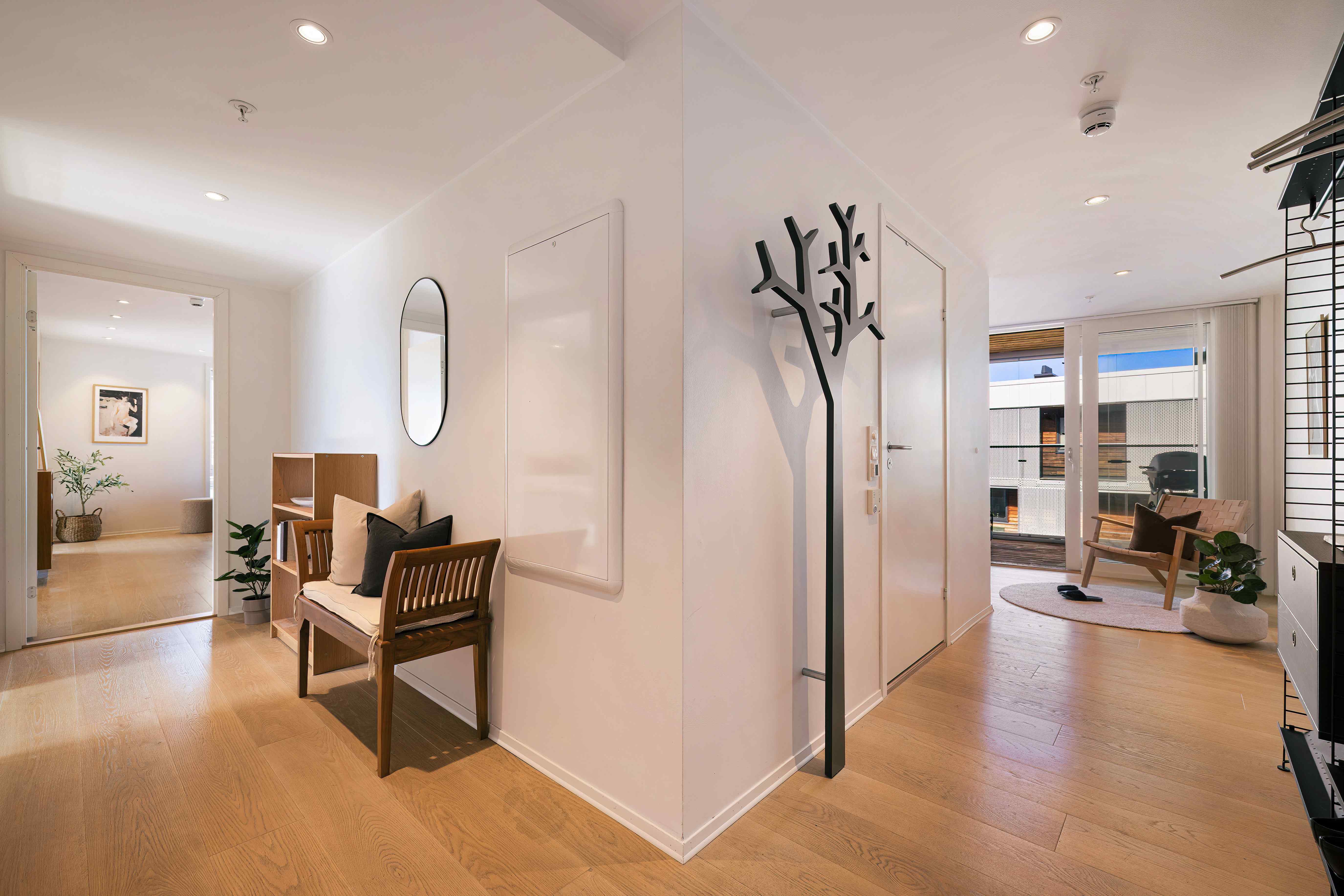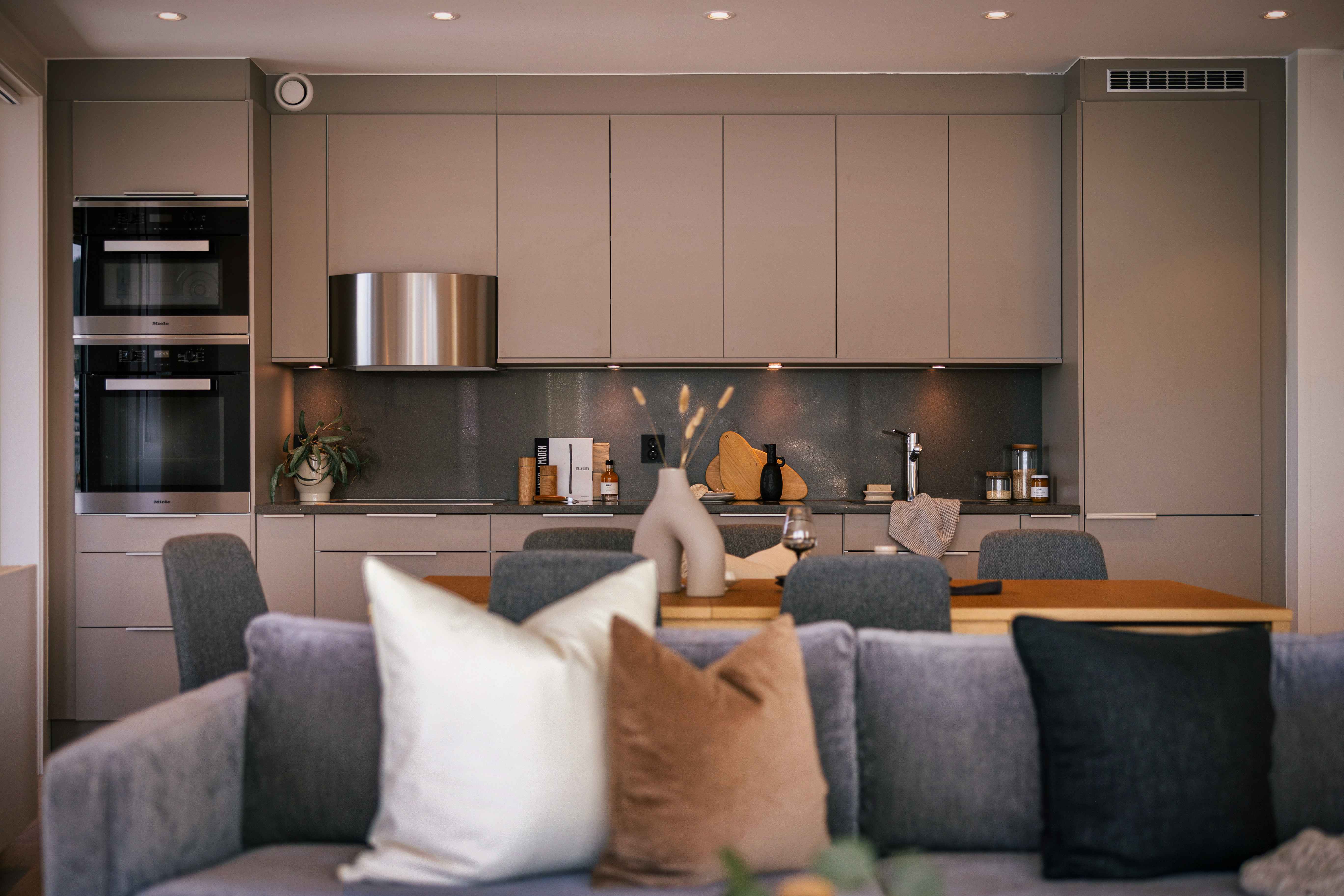 Boligen holder et gjennomgående høyt nivå i materialvalg og tekniske løsninger. Det er en-stavs parkett i alle oppholdsrom, vannbåren gulvvarme på bad og separat toalett, balansert ventilasjon med varmegjenvinning samt energieffektiv oppvarming via luftkonvektor. Kjøkkenet fra Sigdal har et presist og helhetlig uttrykk, med Silestone benkeplate og integrerte hvitevarer fra Siemens. Store vindusflater mot vest gir rikelig lysinnslipp og forsterker romfølelsen og kontakten med omgivelsene.