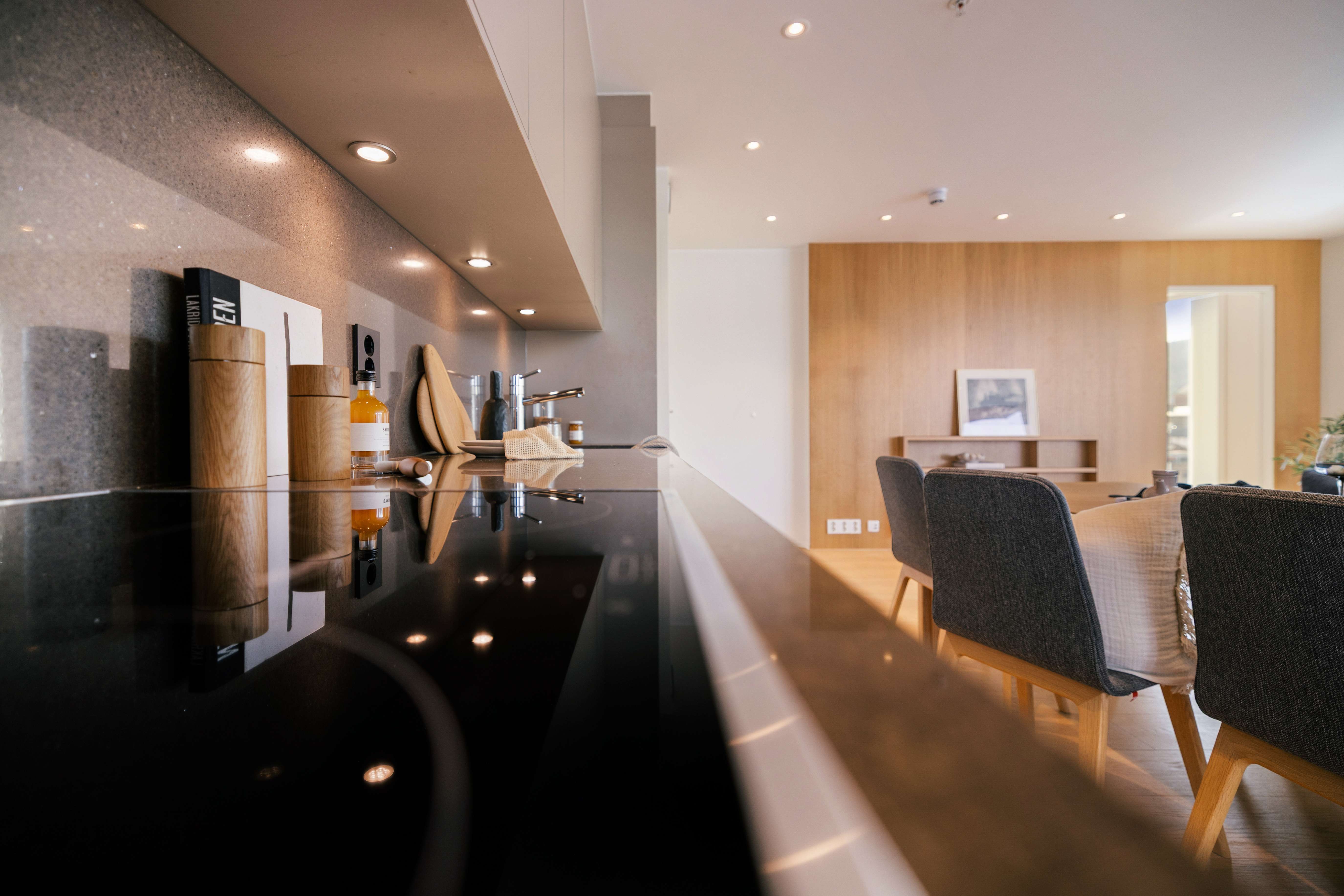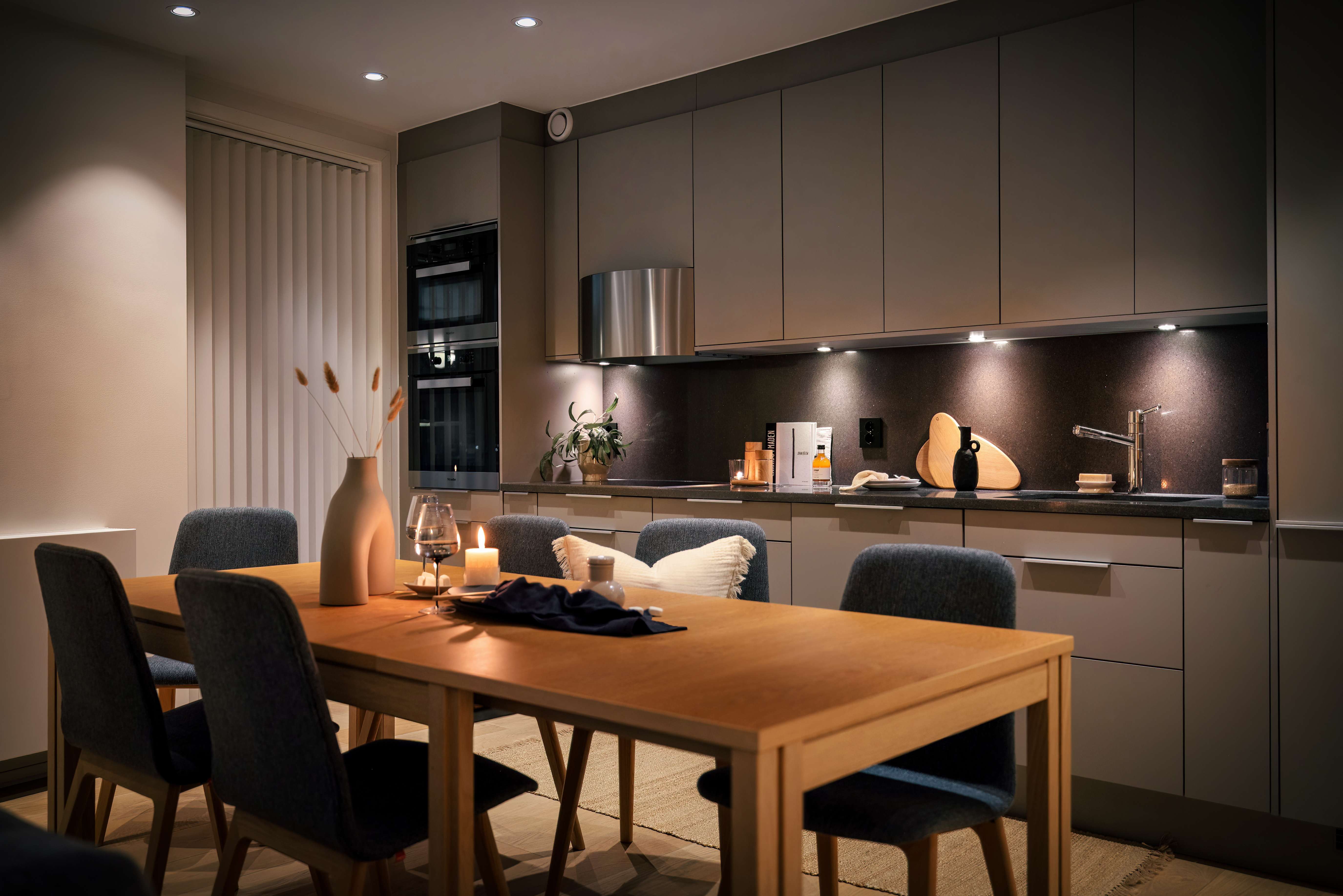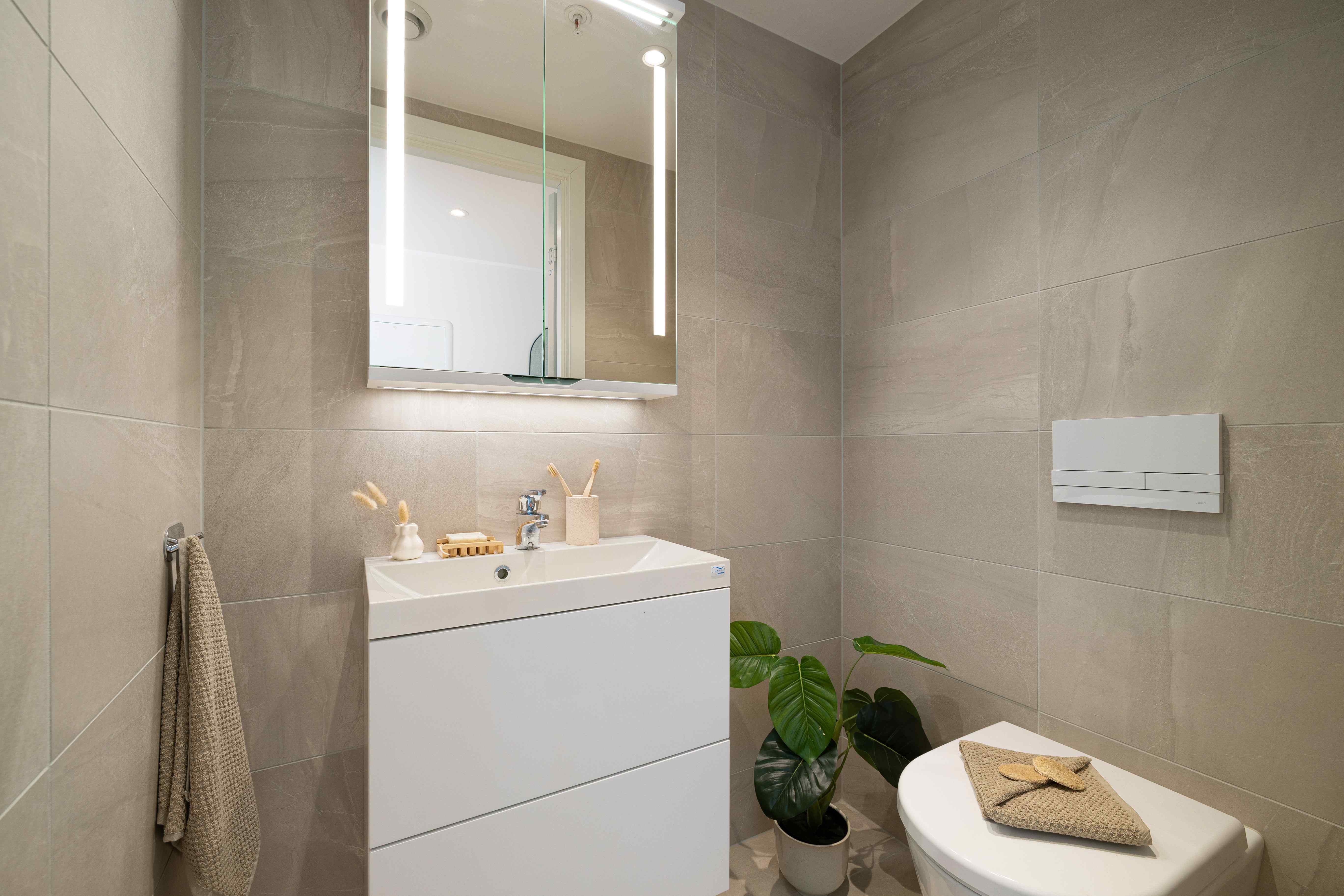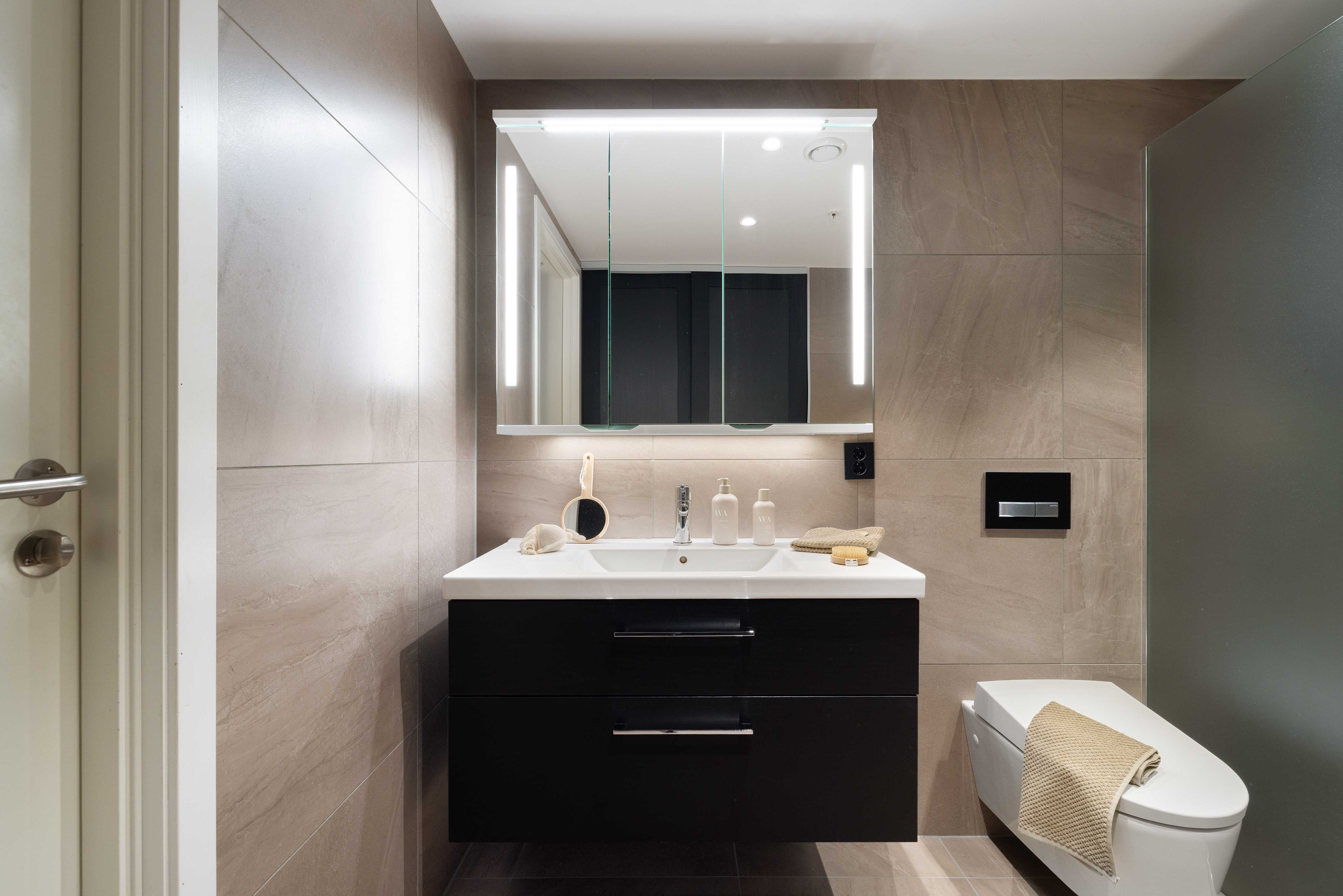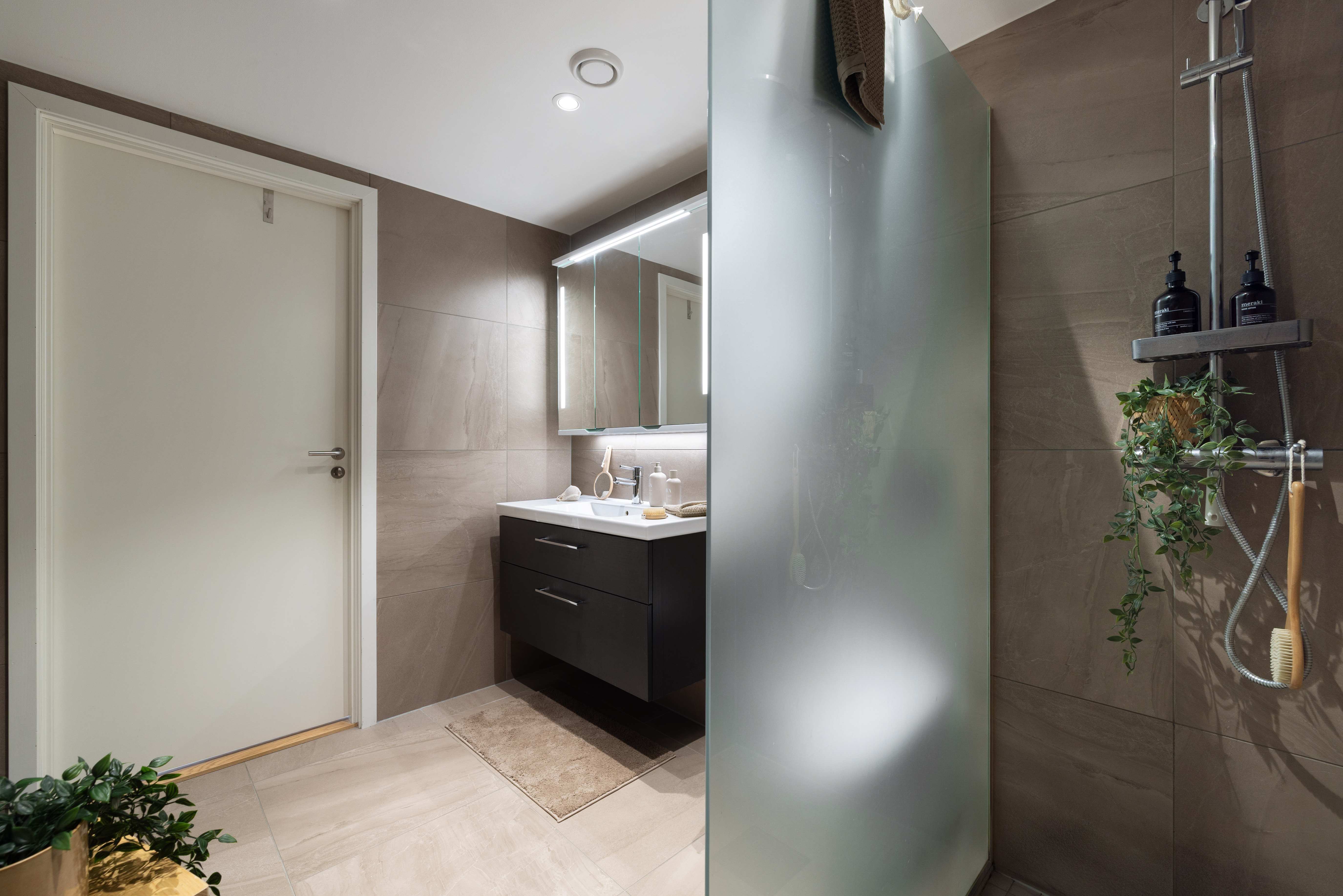 Boligen holder et gjennomgående høyt nivå i materialvalg og tekniske løsninger. Det er en-stavs parkett i alle oppholdsrom, vannbåren gulvvarme på bad og separat toalett, balansert ventilasjon med varmegjenvinning samt energieffektiv oppvarming via luftkonvektor. Kjøkkenet fra Sigdal har et presist og helhetlig uttrykk, med Silestone benkeplate og integrerte hvitevarer fra Siemens. Store vindusflater mot vest gir rikelig lysinnslipp og forsterker romfølelsen og kontakten med omgivelsene.
