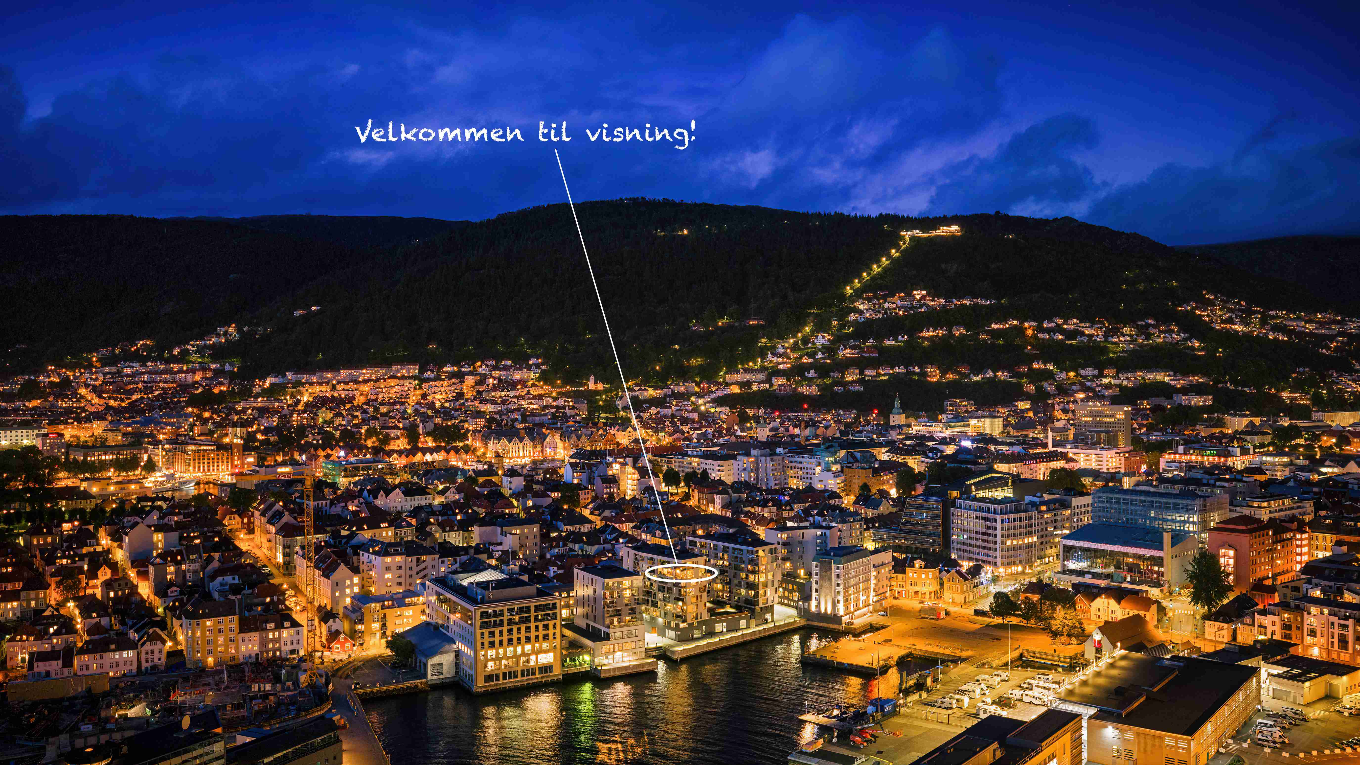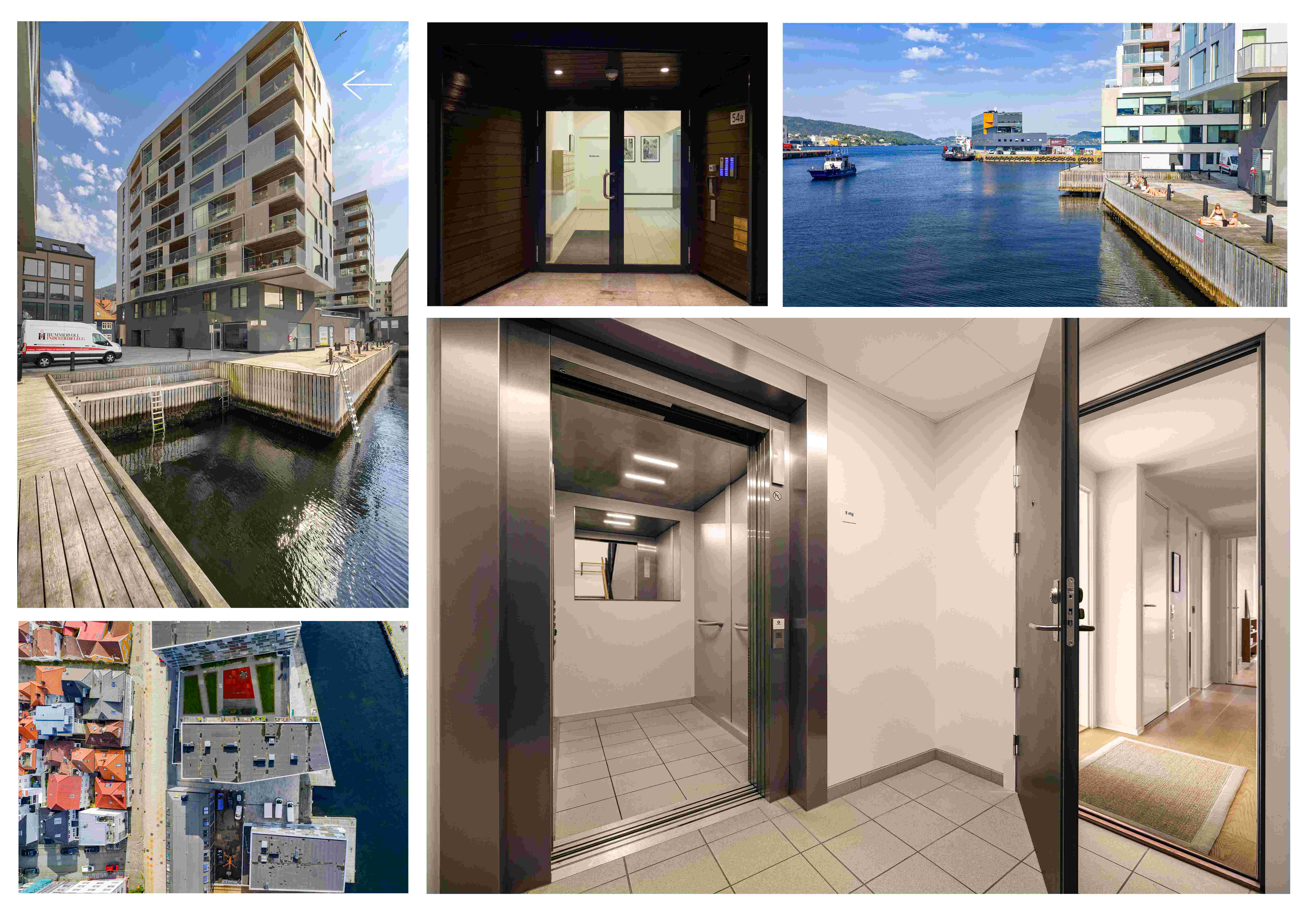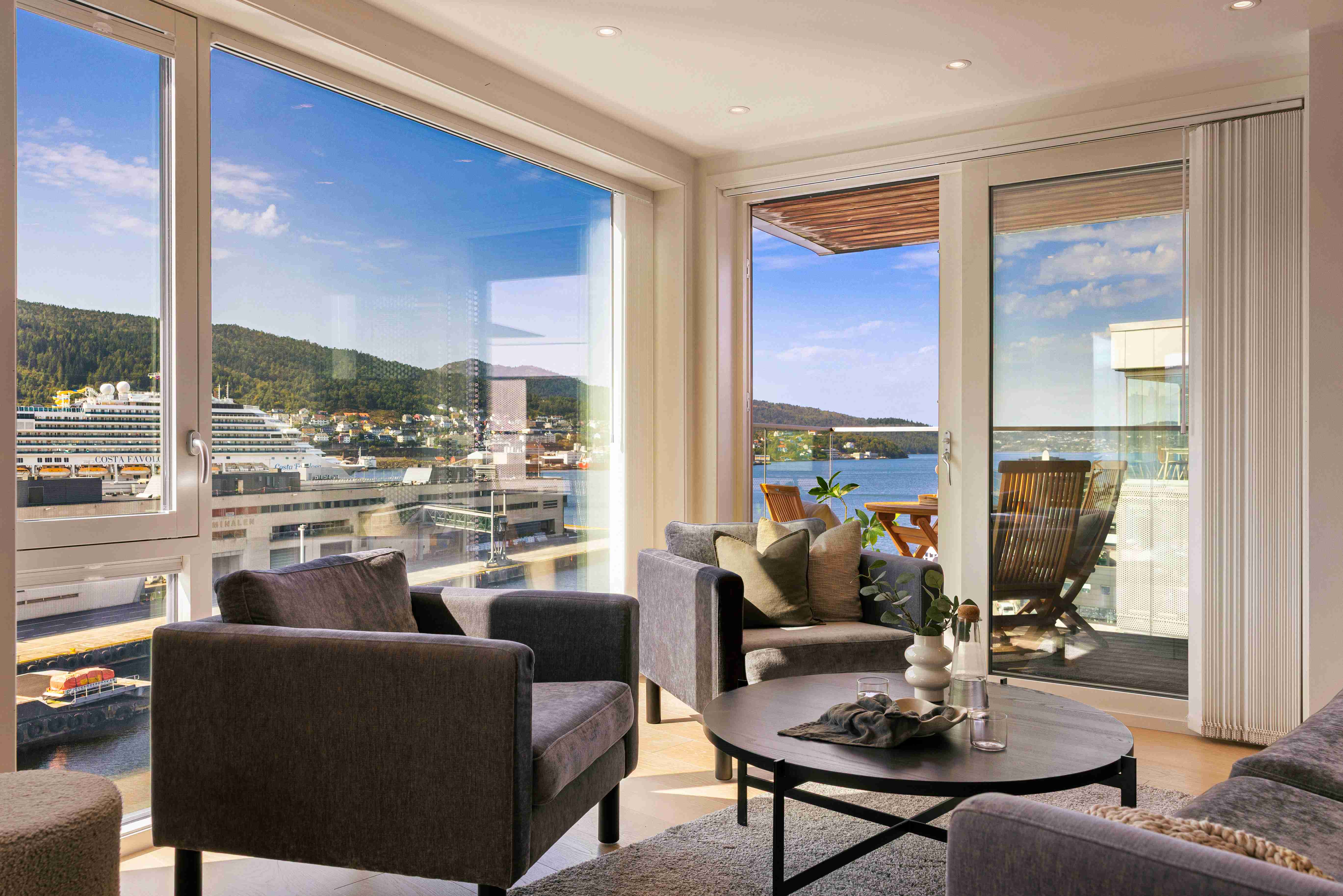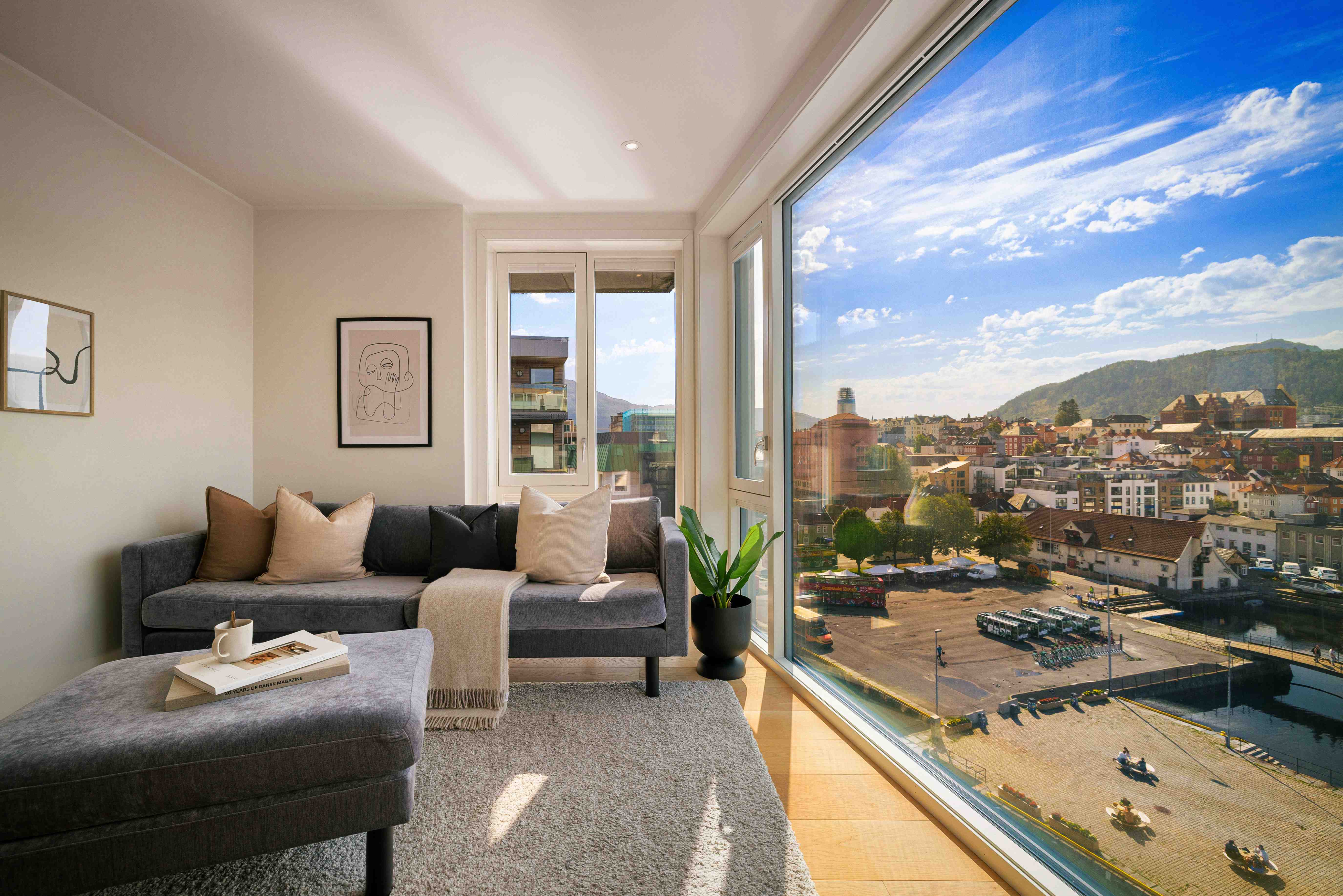 Leiligheten i Nøstegaten 54B ligger høyt og fritt i byggets 8. etasje med direkte heisadkomst fra garasjeanlegget. Den vestvendte plasseringen gir utsyn mot innseilingen til Bergen og solforhold fra morgen til sene kveldstimer. Kombinasjonen av høy etasje, åpen himmel og flere uteplasser gir kvaliteter som sjelden oppnås i sentrumsnære leiligheter.