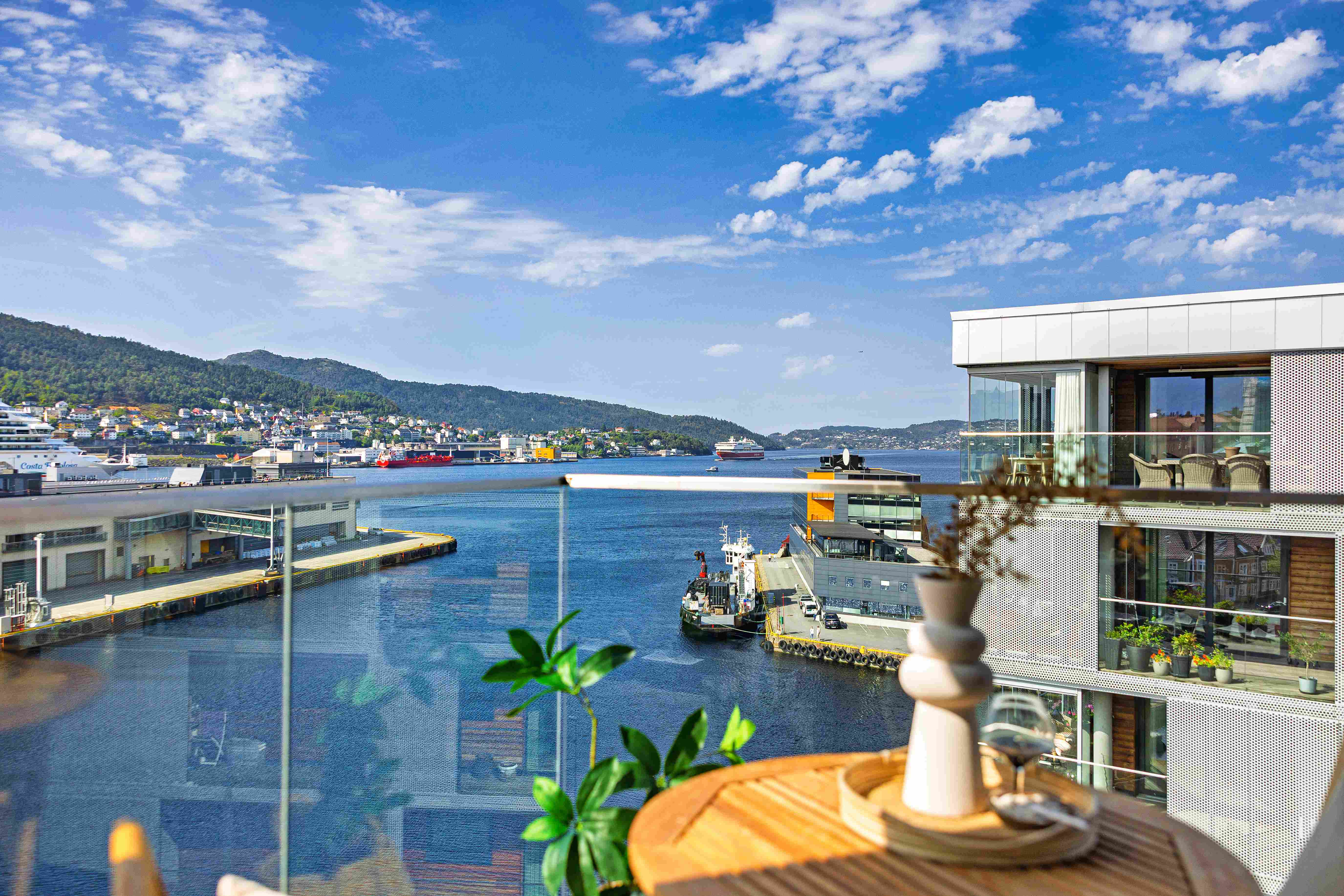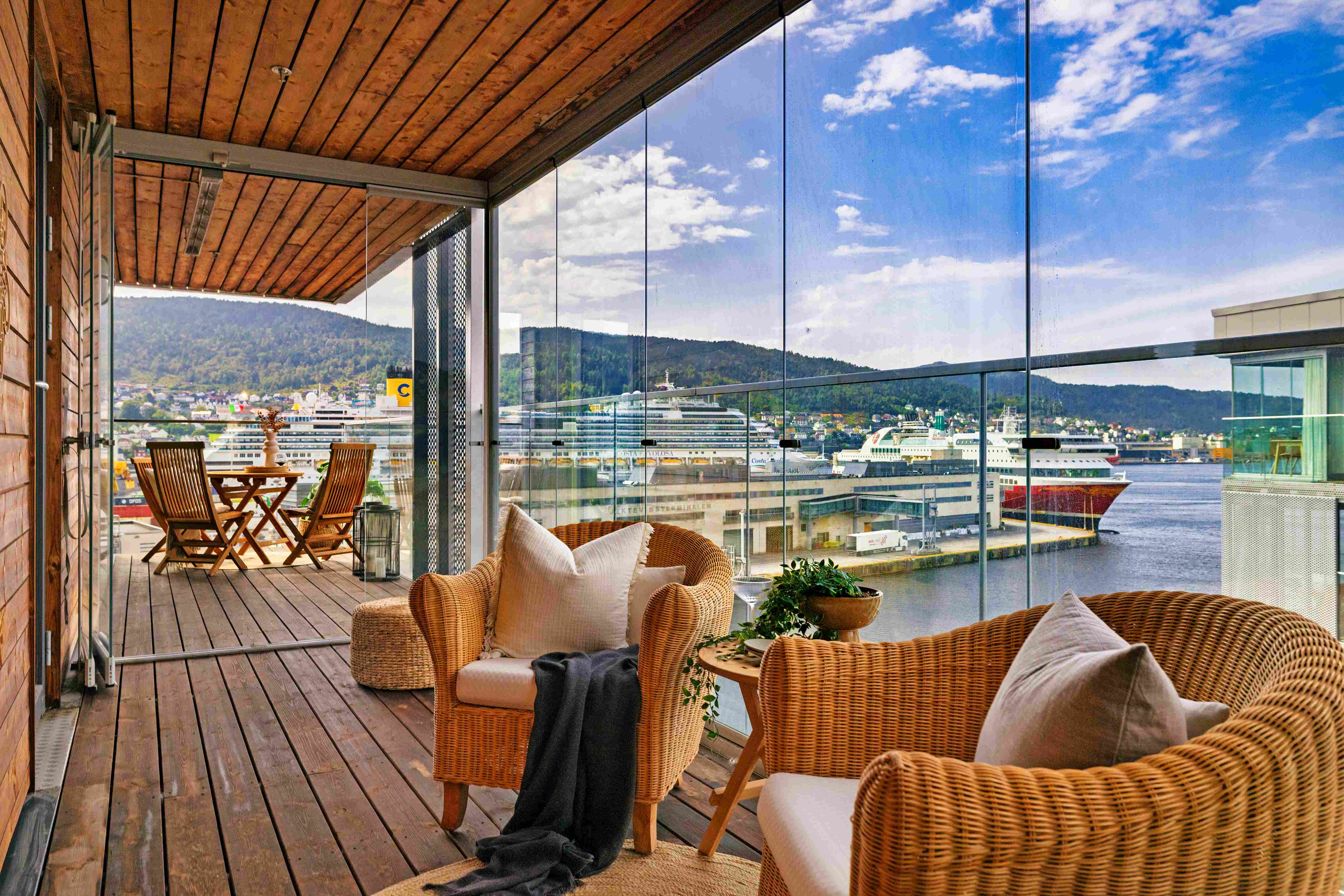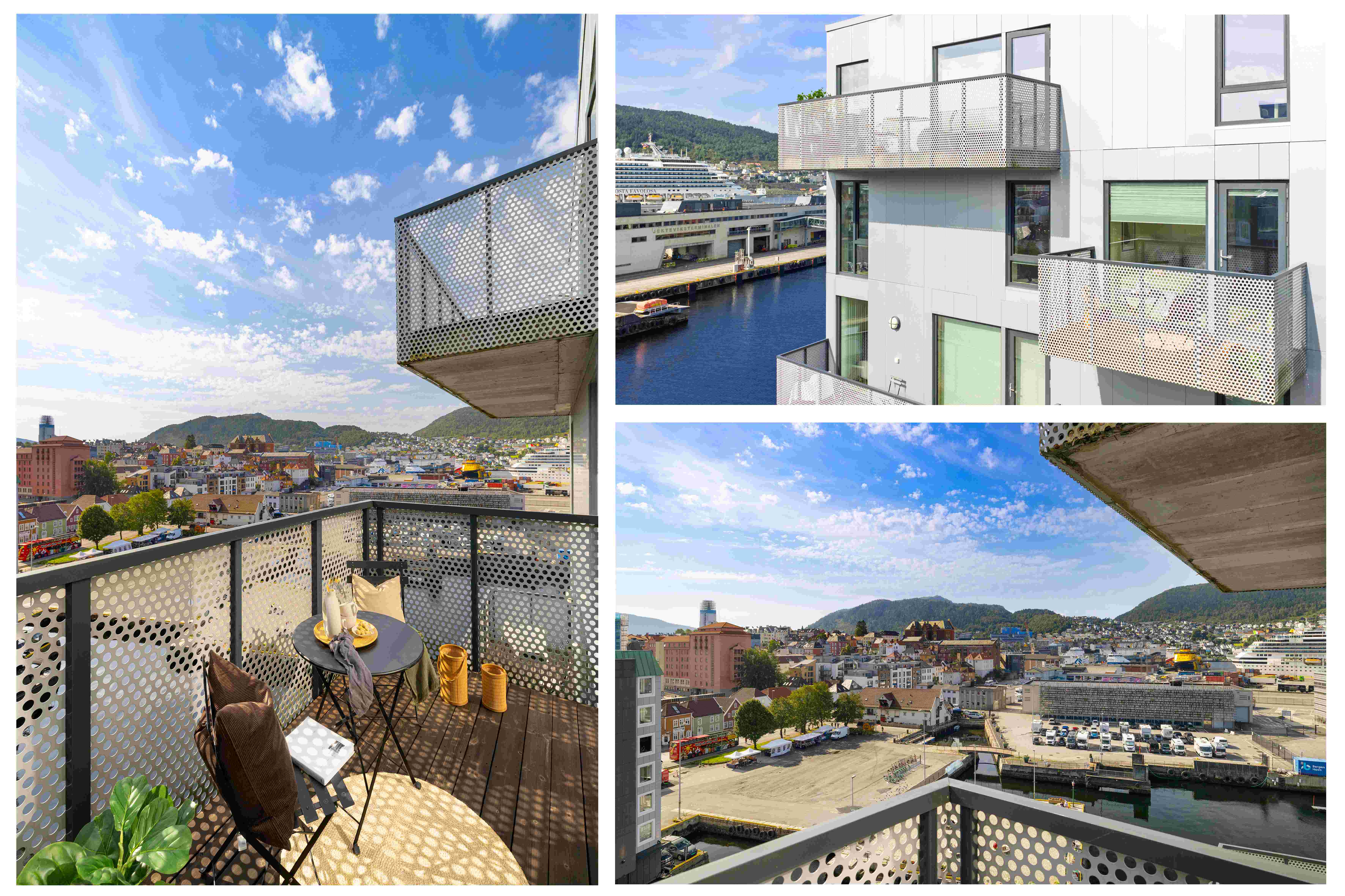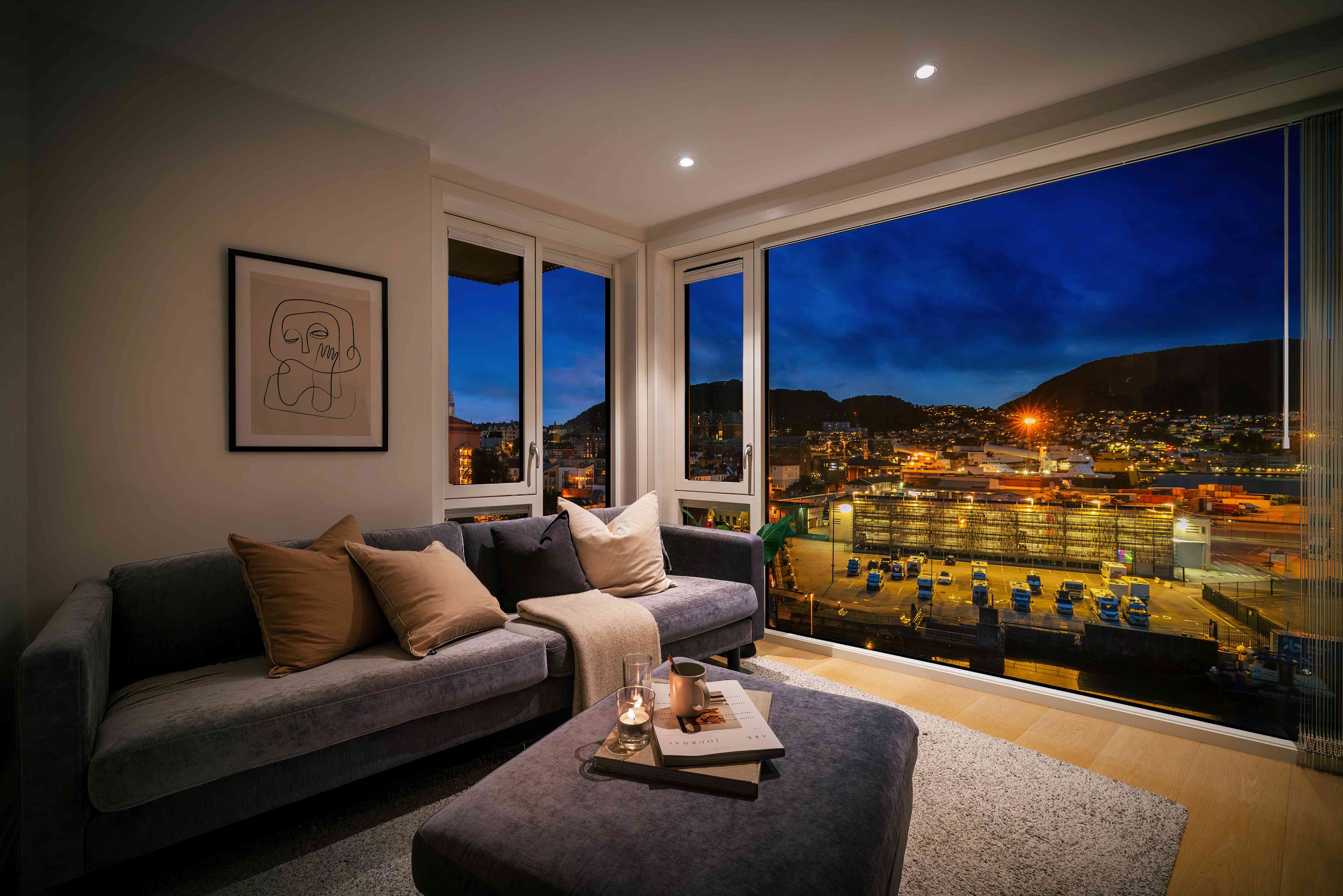 Leiligheten i Nøstegaten 54B ligger høyt og fritt i byggets 8. etasje med direkte heisadkomst fra garasjeanlegget. Den vestvendte plasseringen gir utsyn mot innseilingen til Bergen og solforhold fra morgen til sene kveldstimer. Kombinasjonen av høy etasje, åpen himmel og flere uteplasser gir kvaliteter som sjelden oppnås i sentrumsnære leiligheter.
