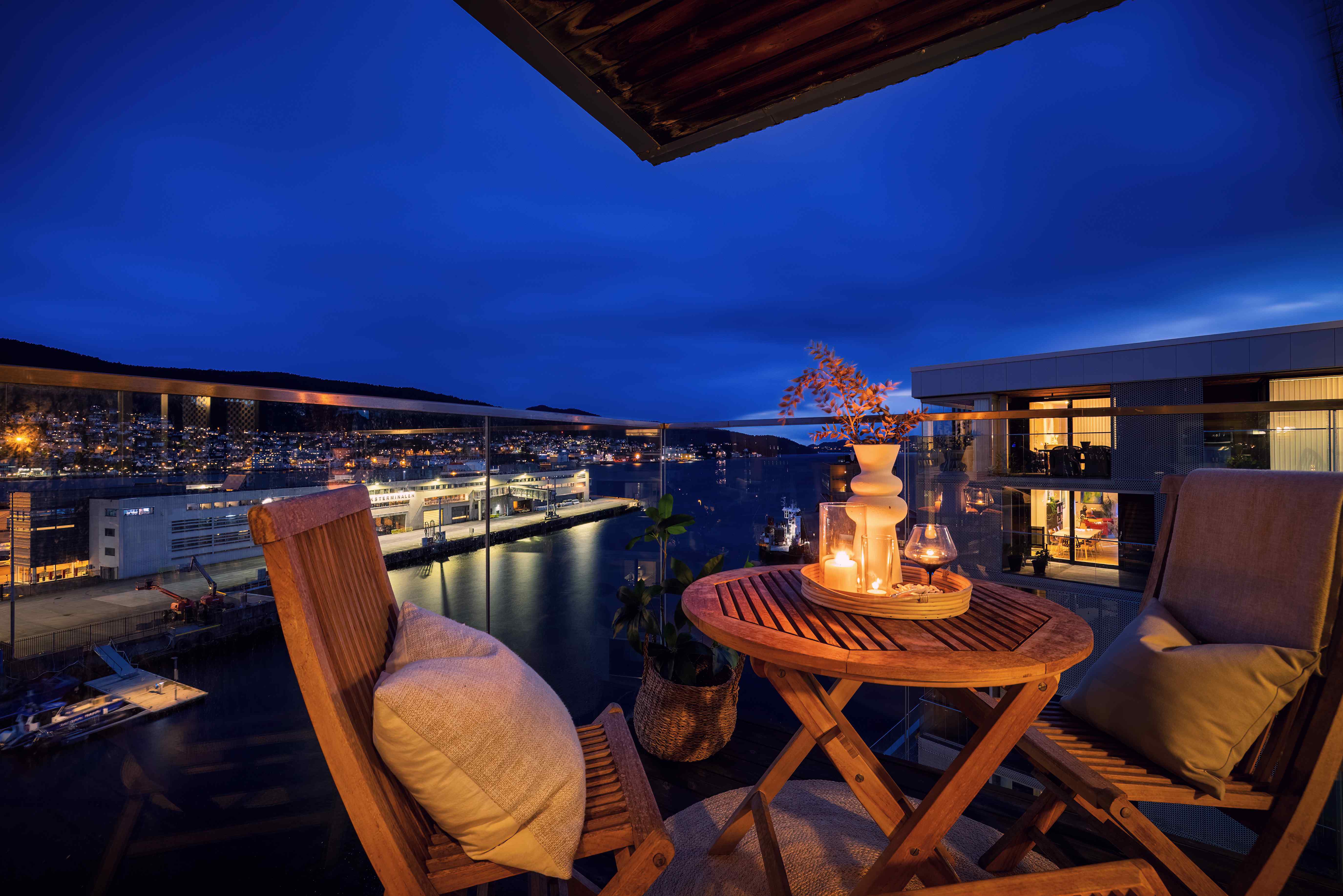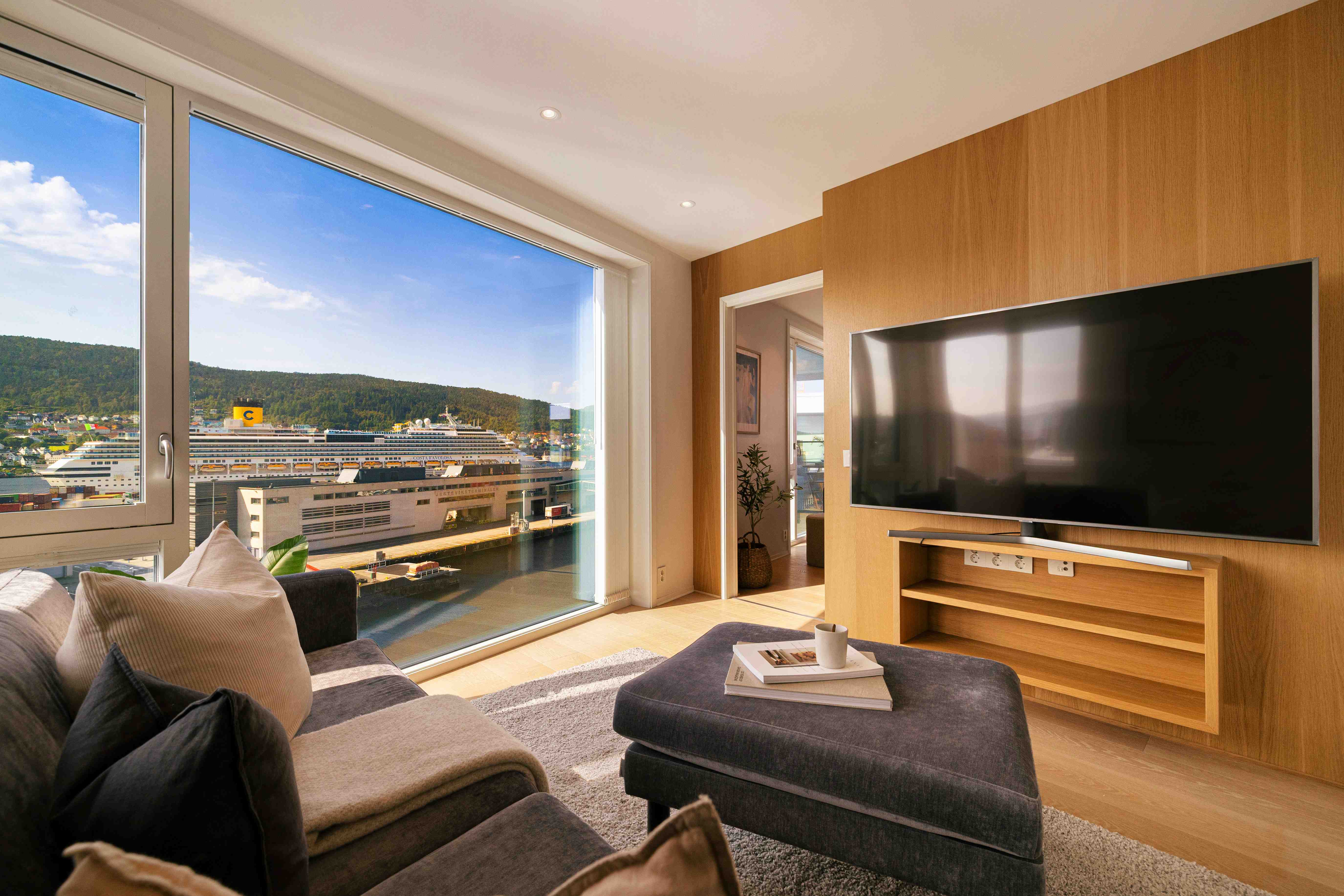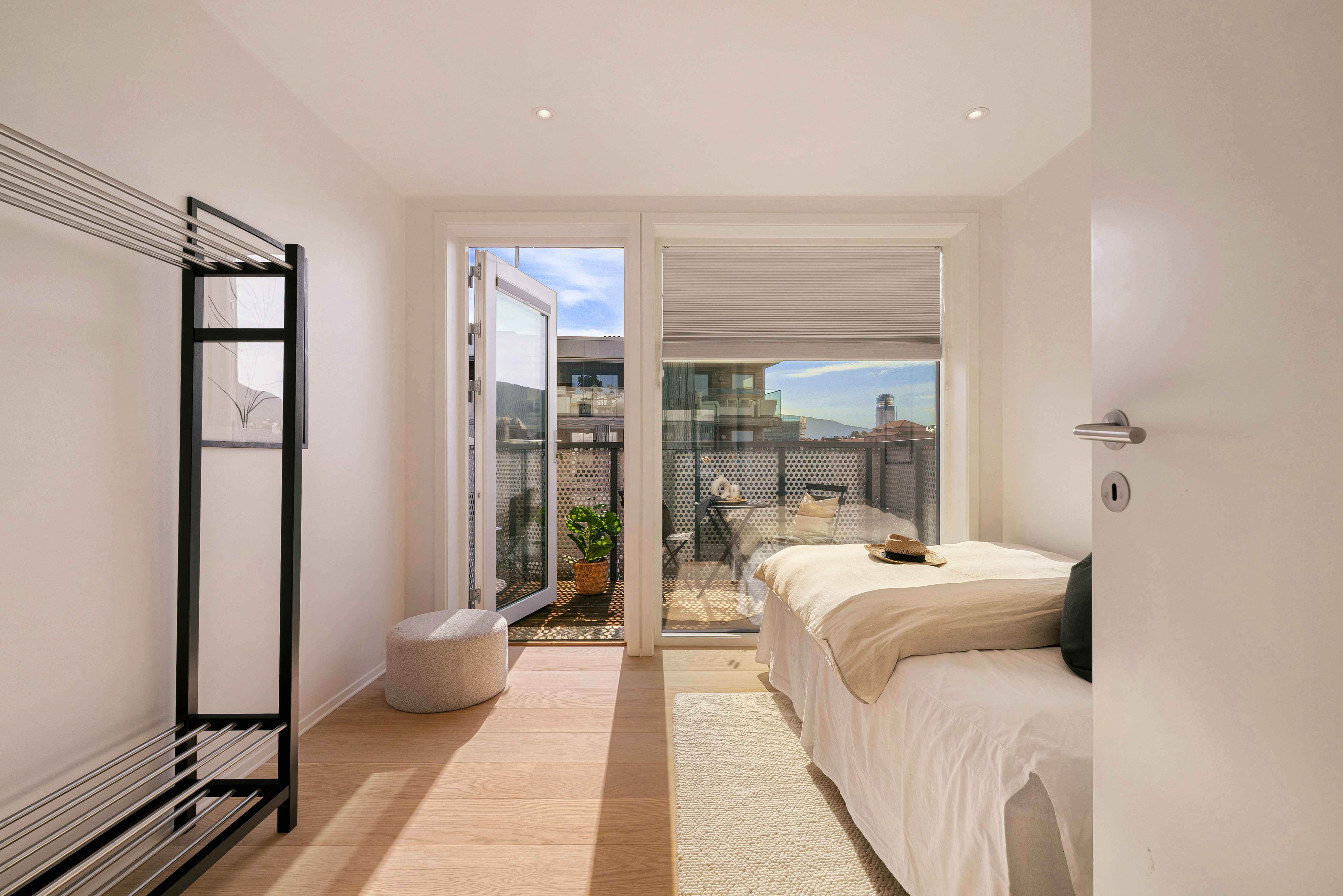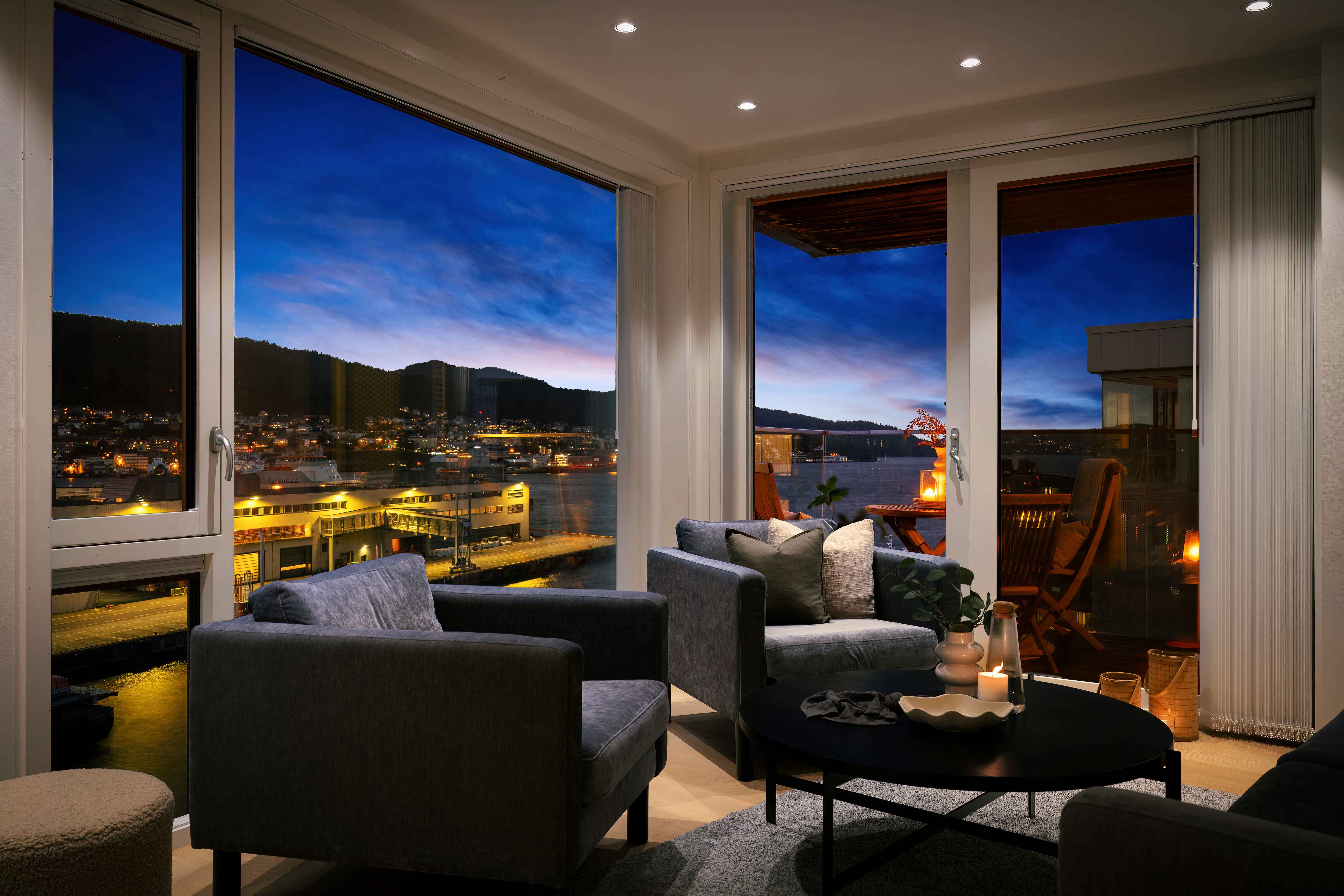Leiligheten i Nøstegaten 54B ligger høyt og fritt i byggets 8. etasje med direkte heisadkomst fra garasjeanlegget. Den vestvendte plasseringen gir utsyn mot innseilingen til Bergen og solforhold fra morgen til sene kveldstimer. Kombinasjonen av høy etasje, åpen himmel og flere uteplasser gir kvaliteter som sjelden oppnås i sentrumsnære leiligheter.