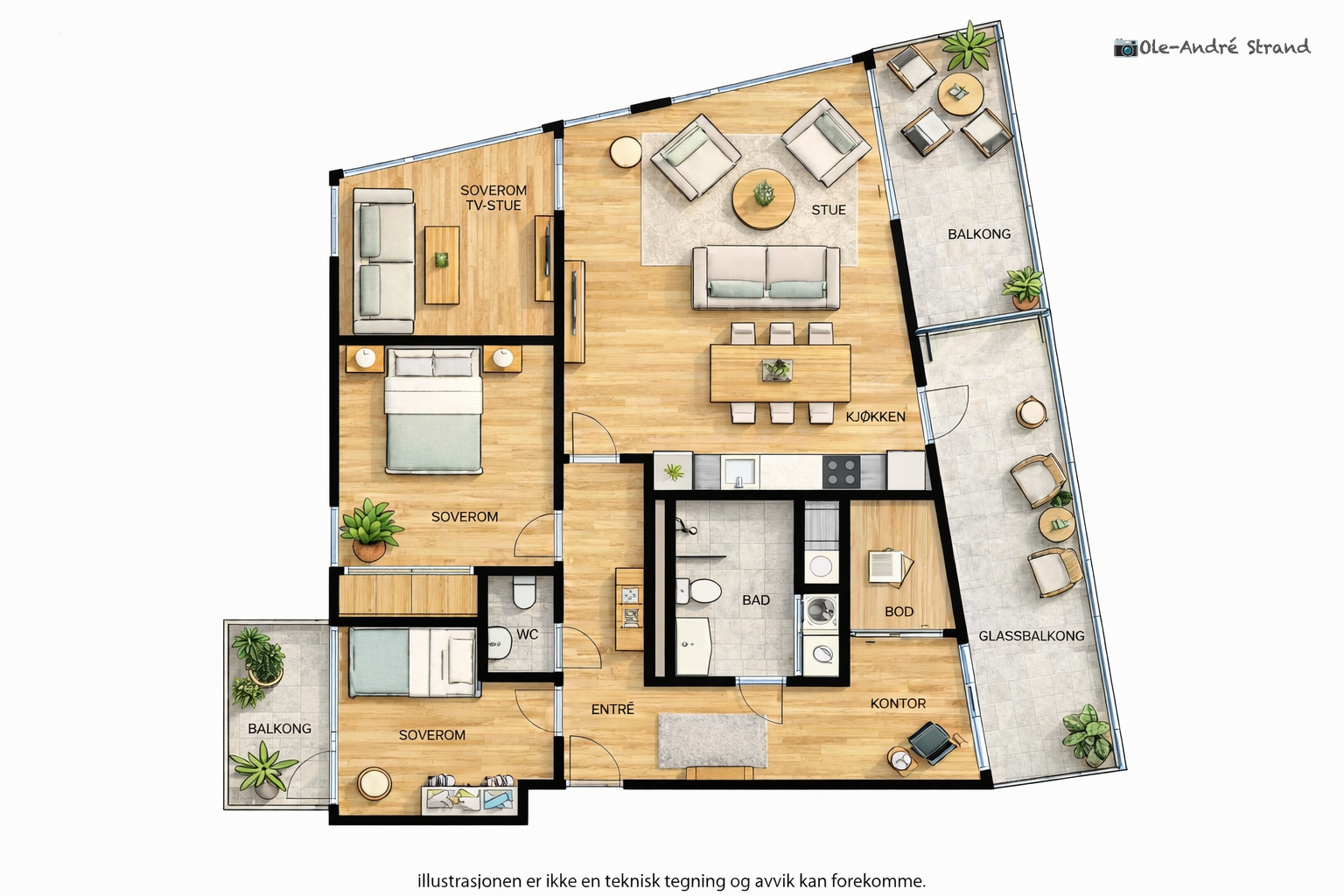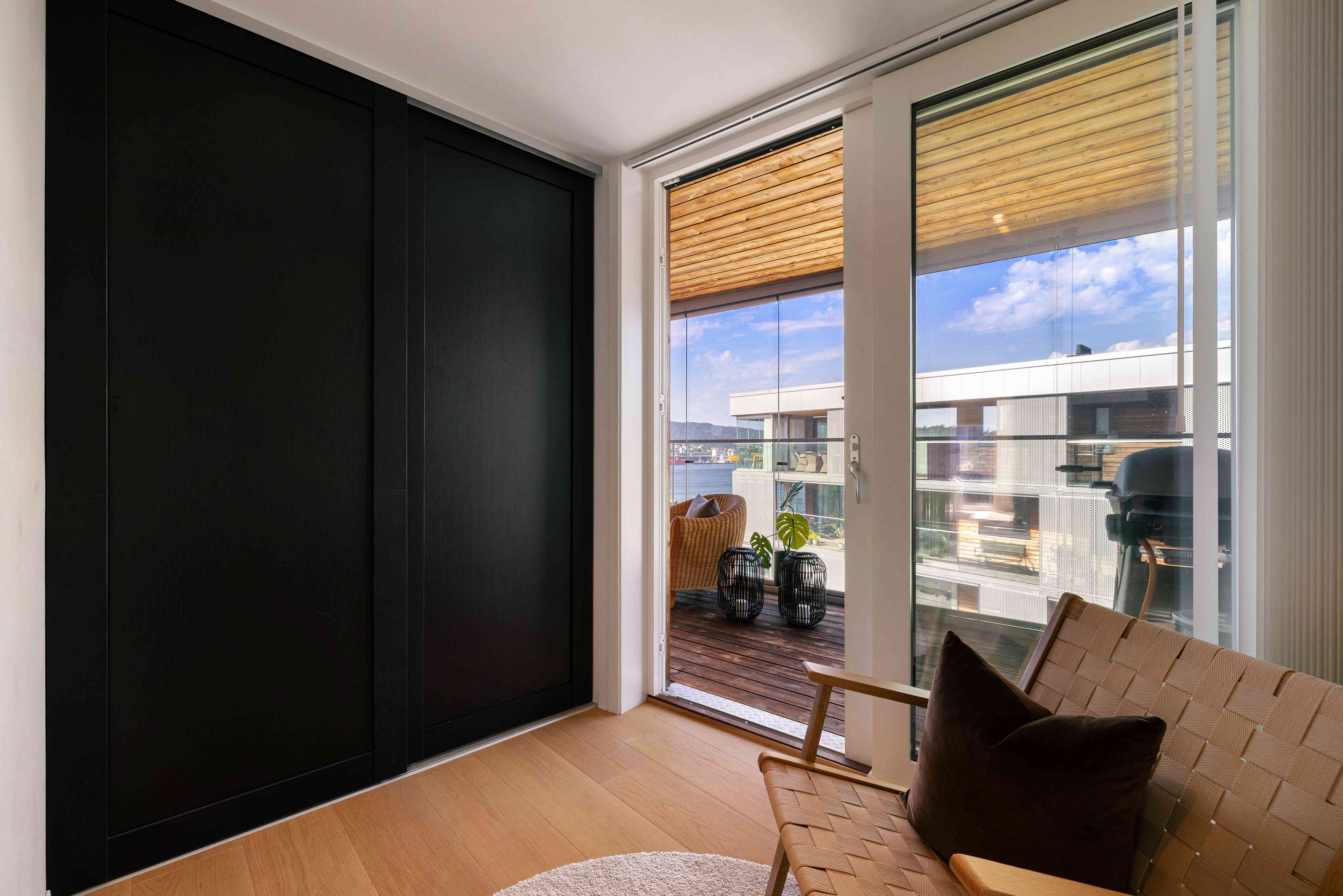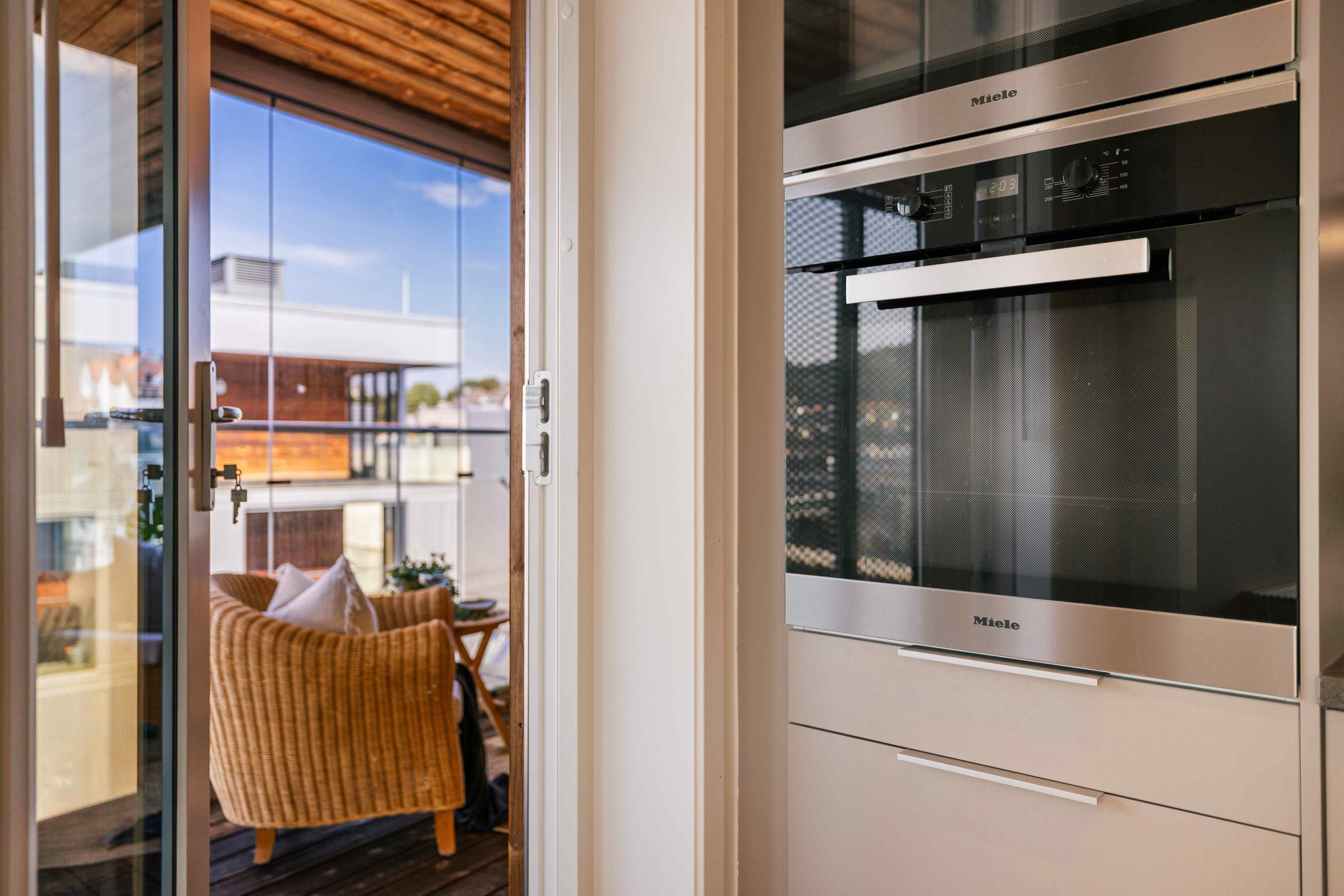 Oppholdsrommet har en naturlig flyt mellom kjøkken og stue, samtidig som rommenes utforming gir tydelige og funksjonelle soner. Det er god plass til både spisebord og hovedsittegruppe, samt mer skjermede sitteplasser. Fra stuen er det direkte utgang til vestvendt balkong med innglasset forlengelse som kan åpnes helt opp ved behov. Terrassevarmere gir forlenget bruk gjennom store deler av året.