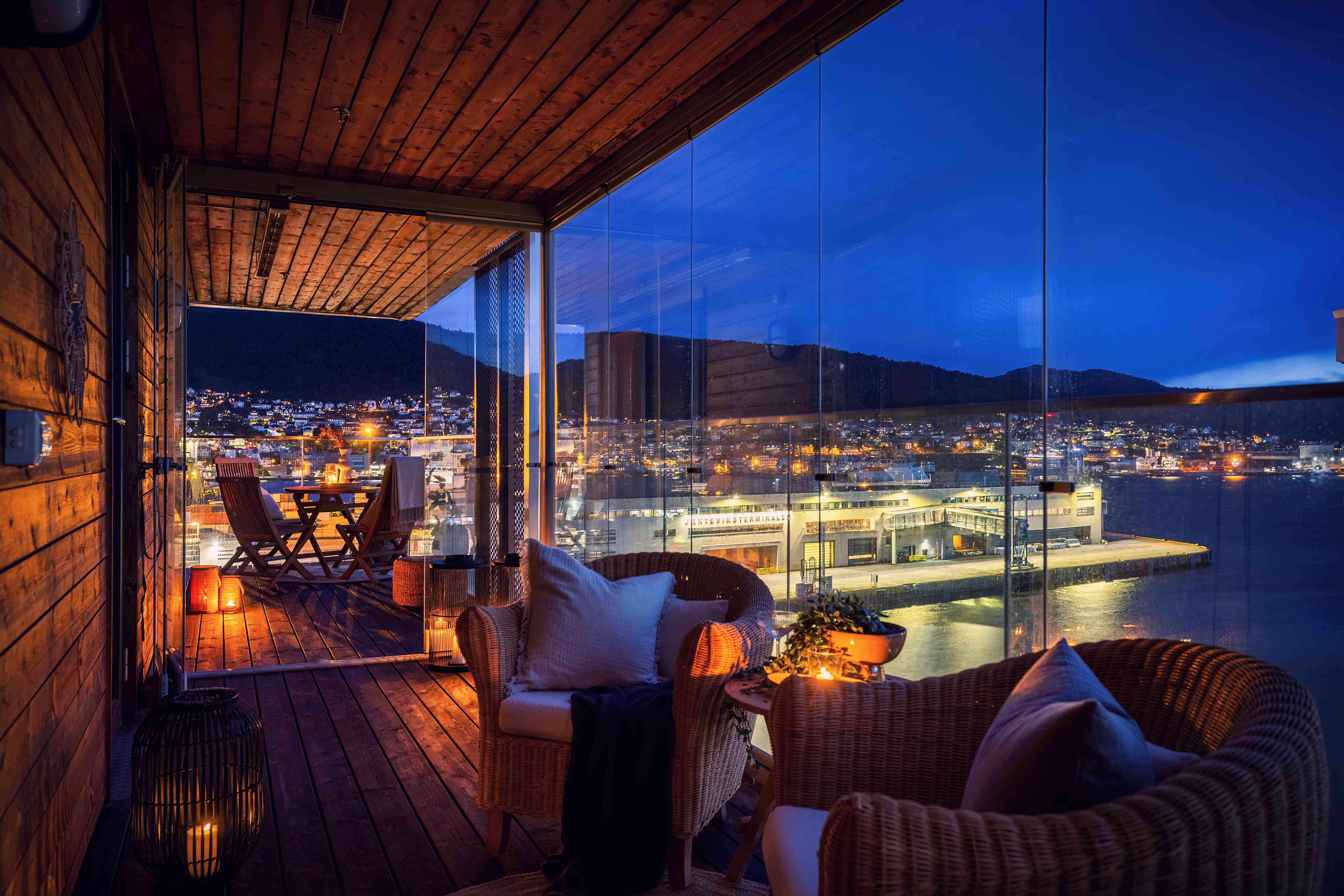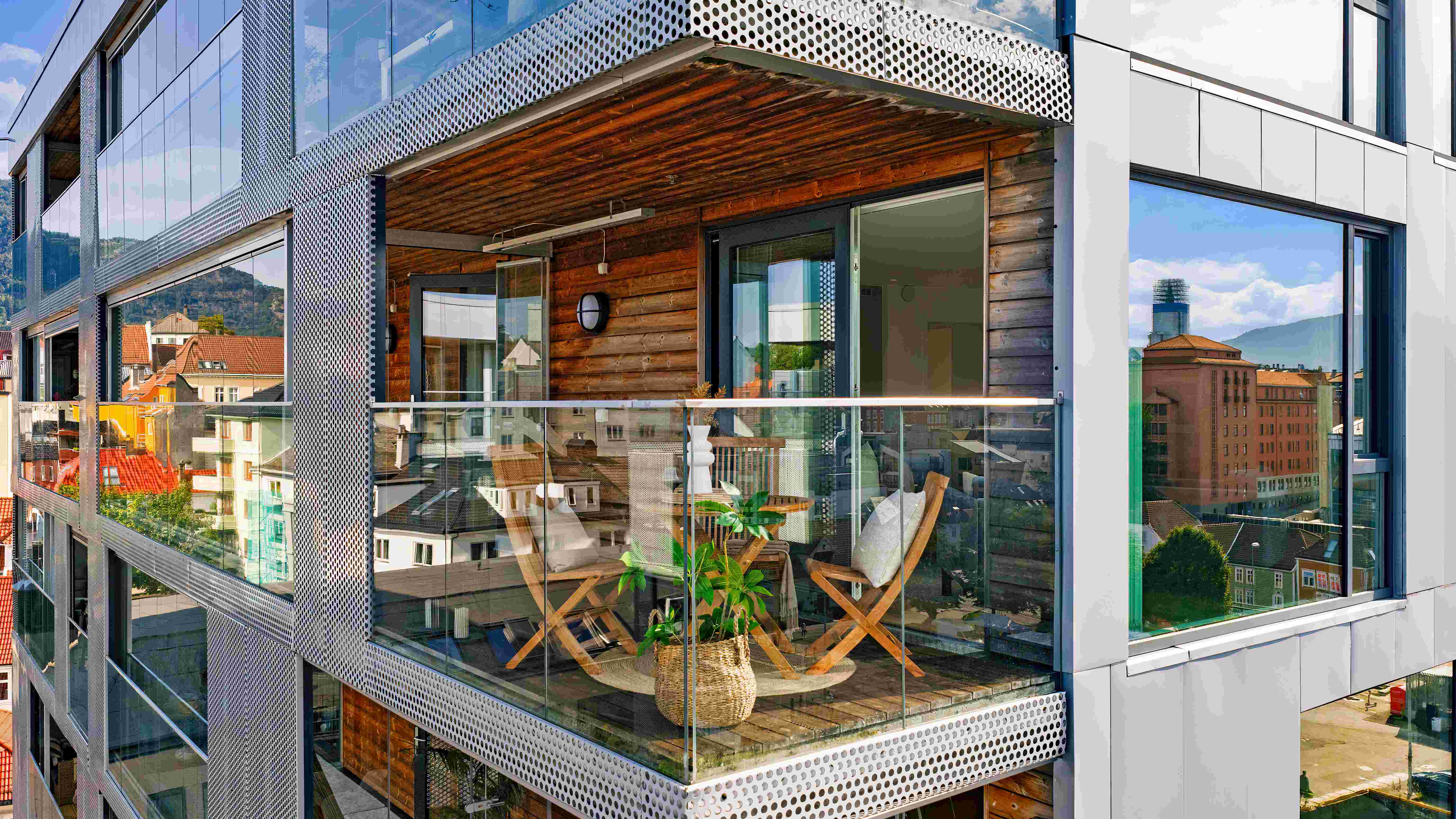 Balkong på 14 kvm med foldbar innglassing og vest- og nordvendt beliggenhet, i direkte tilknytning til åpen balkongdel på ytterligere 9 kvm.