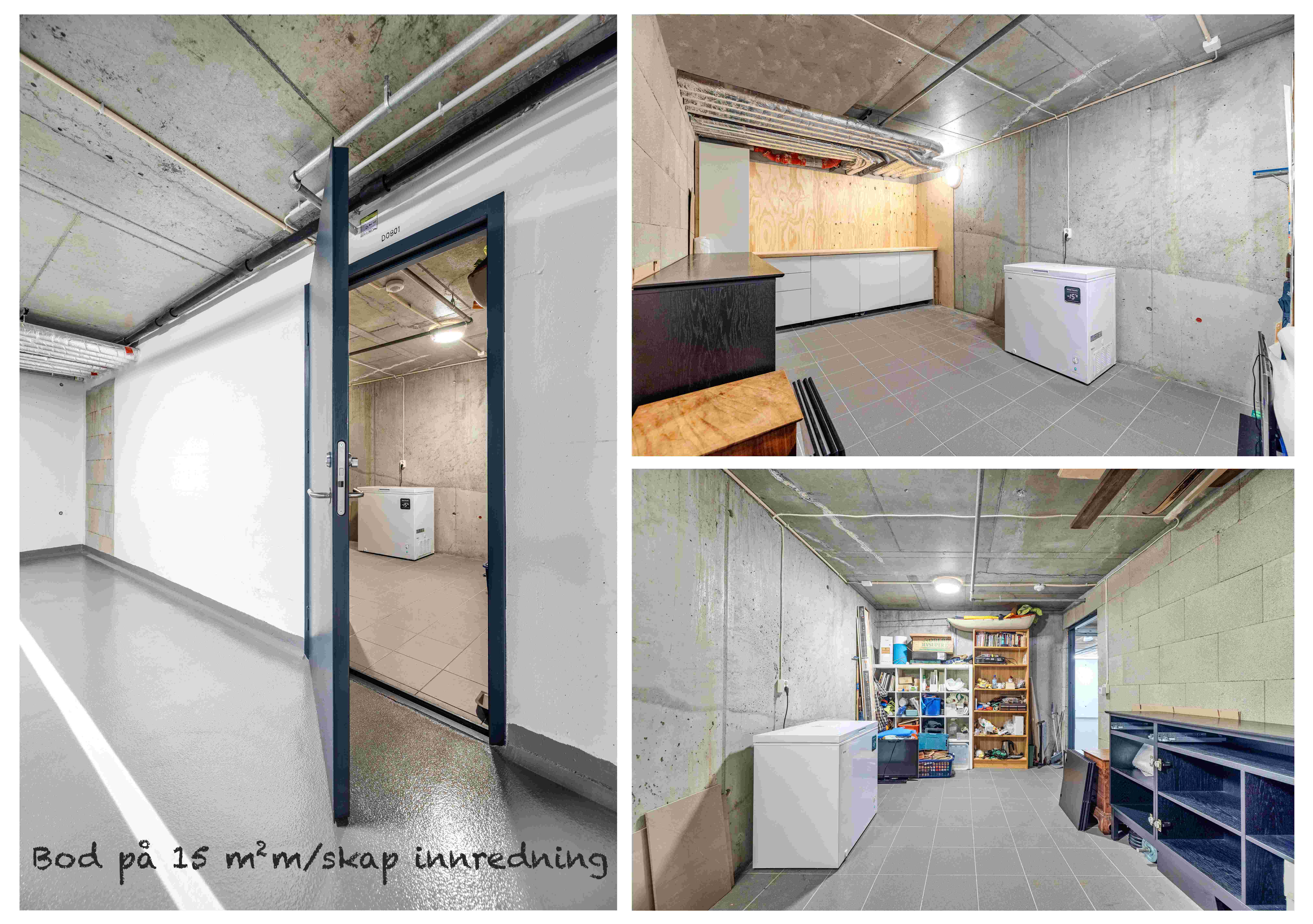 Leiligheten disponerer en svært romslig innredet bod på ca. 15 m², beliggende i kjeller/garasjeanlegg.